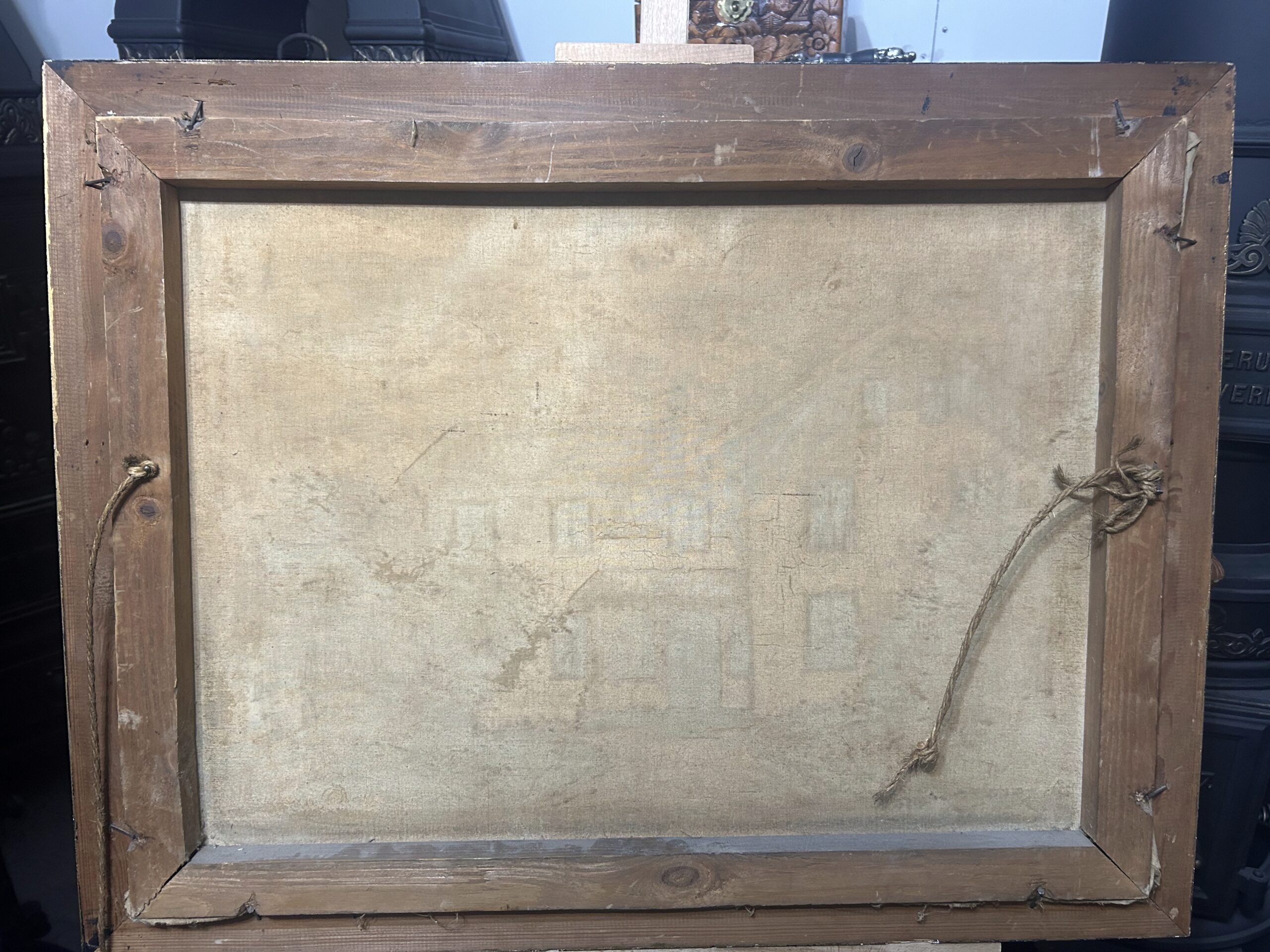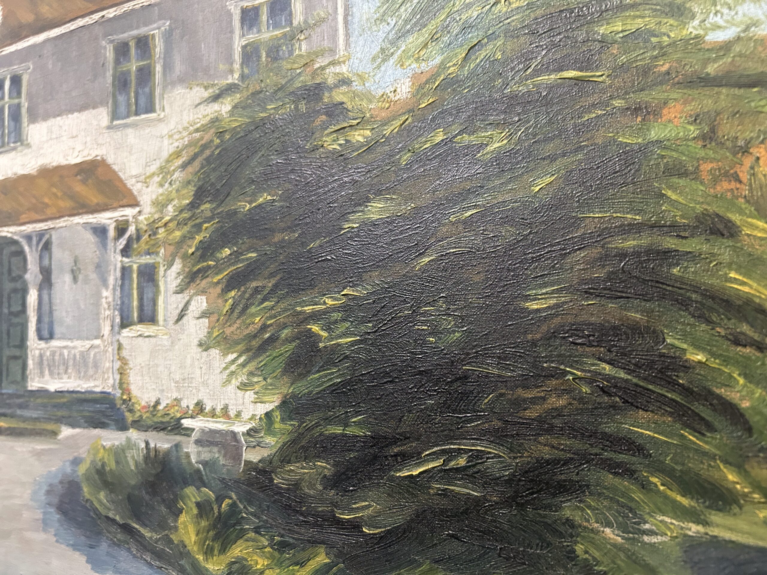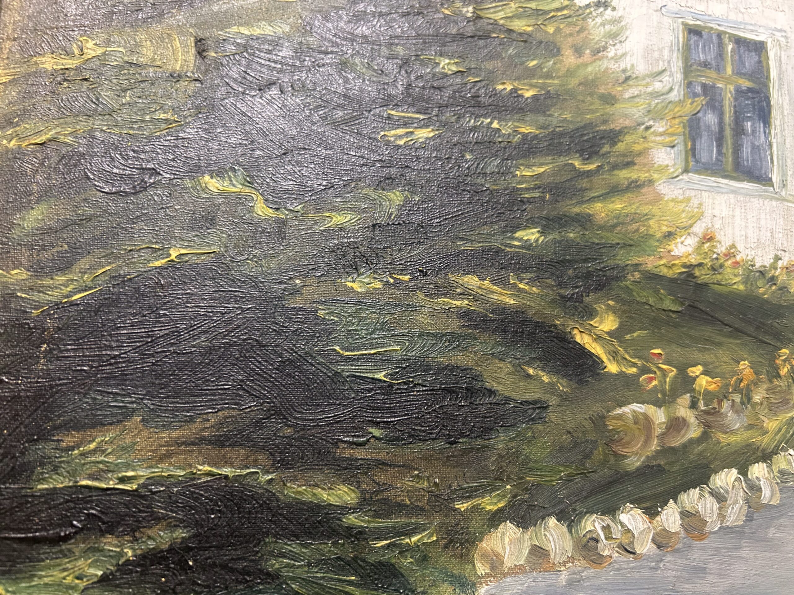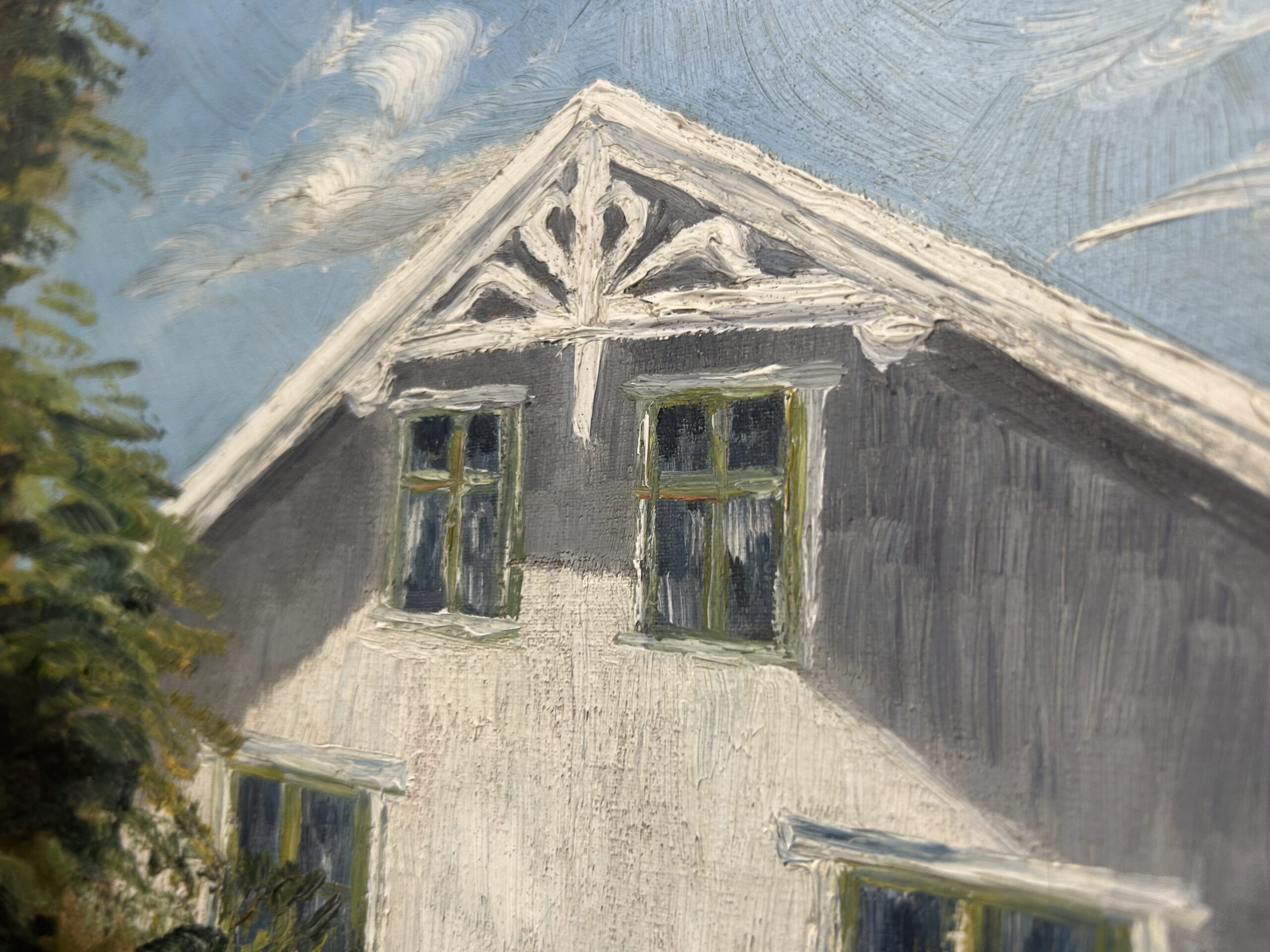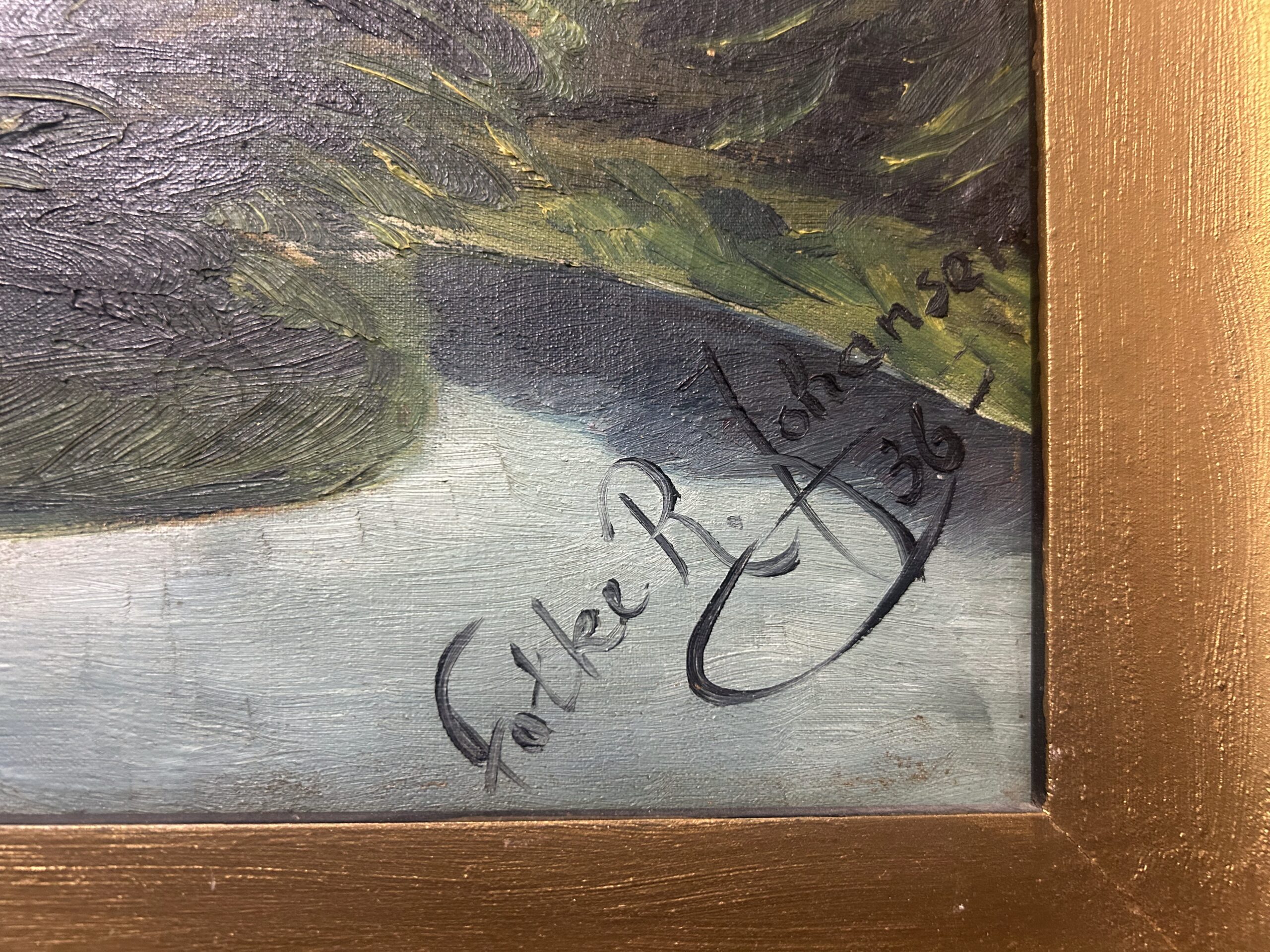 Piękny, stary obraz olejny na płótnie, przedstawiający urokliwy biały dworek otoczony malowniczym krajobrazem. Płótno zostało tradycyjnie przybite do ramy gwoździami, co świadczy o jego wiekowej autentyczności i historycznej wartości. Dzieło sygnowane podpisem autora Fotka R. Johansan, datowane na 1936 rok.