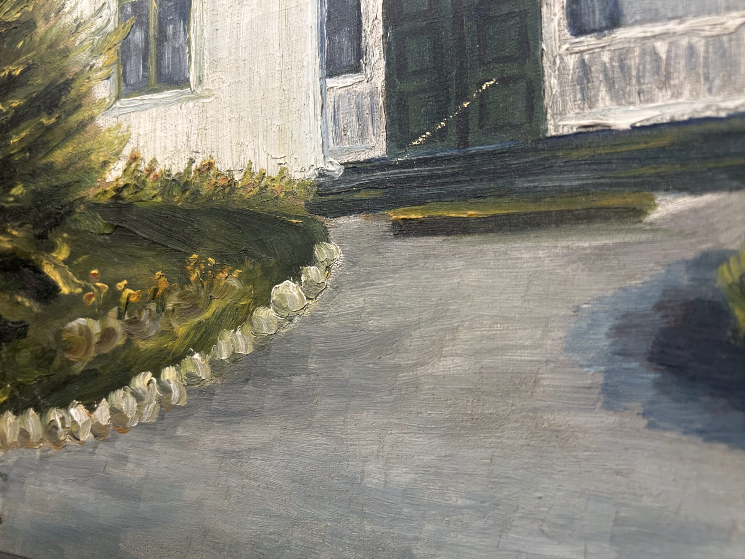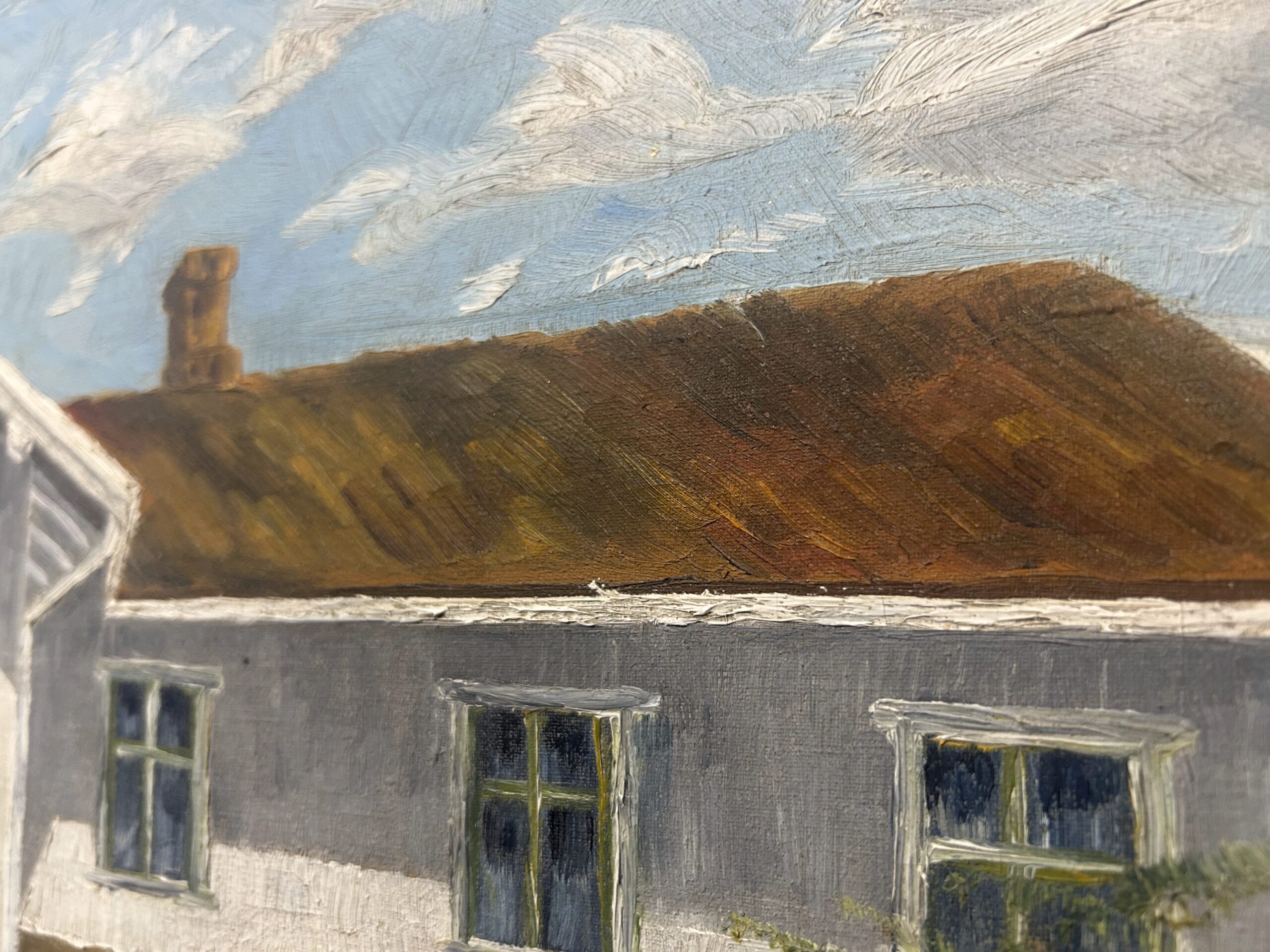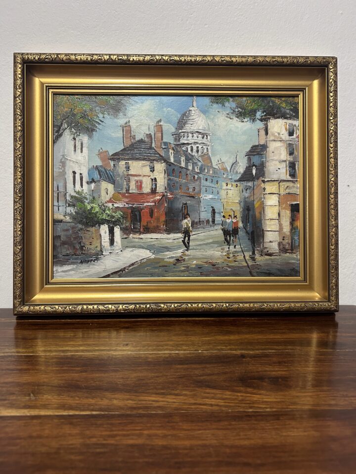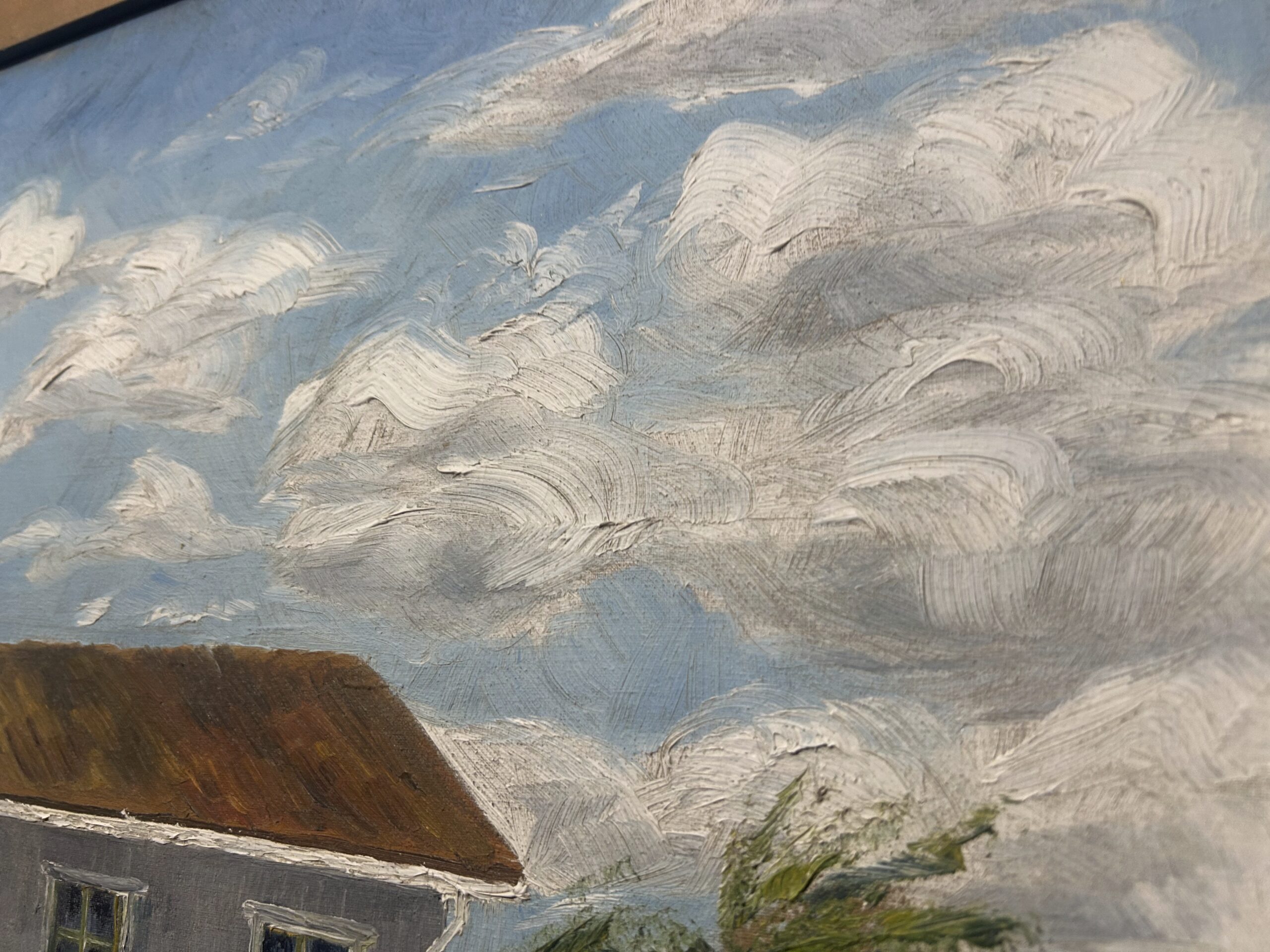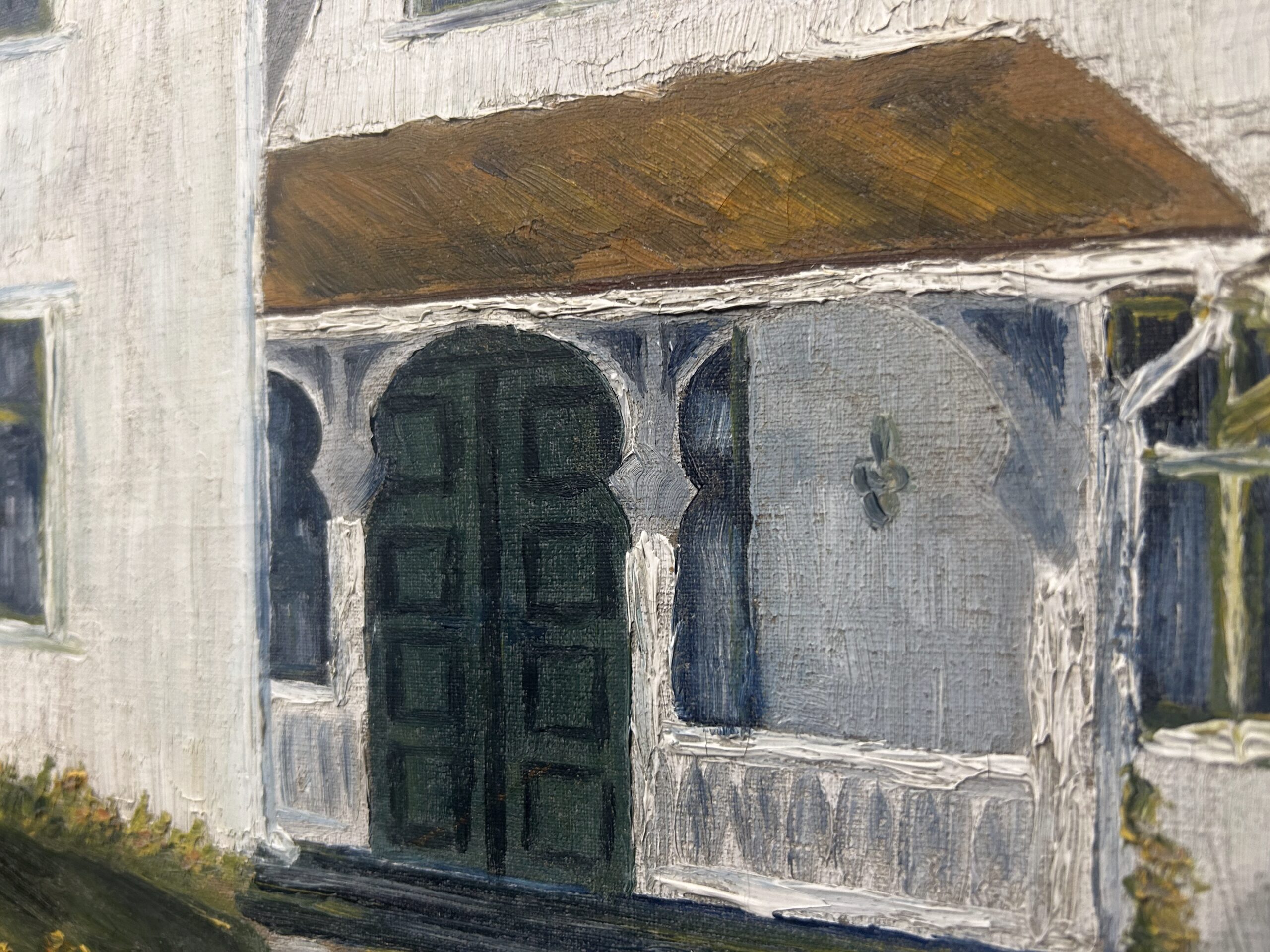 Piękny, stary obraz olejny na płótnie, przedstawiający urokliwy biały dworek otoczony malowniczym krajobrazem. Płótno zostało tradycyjnie przybite do ramy gwoździami, co świadczy o jego wiekowej autentyczności i historycznej wartości. Dzieło sygnowane podpisem autora Fotka R. Johansan, datowane na 1936 rok.