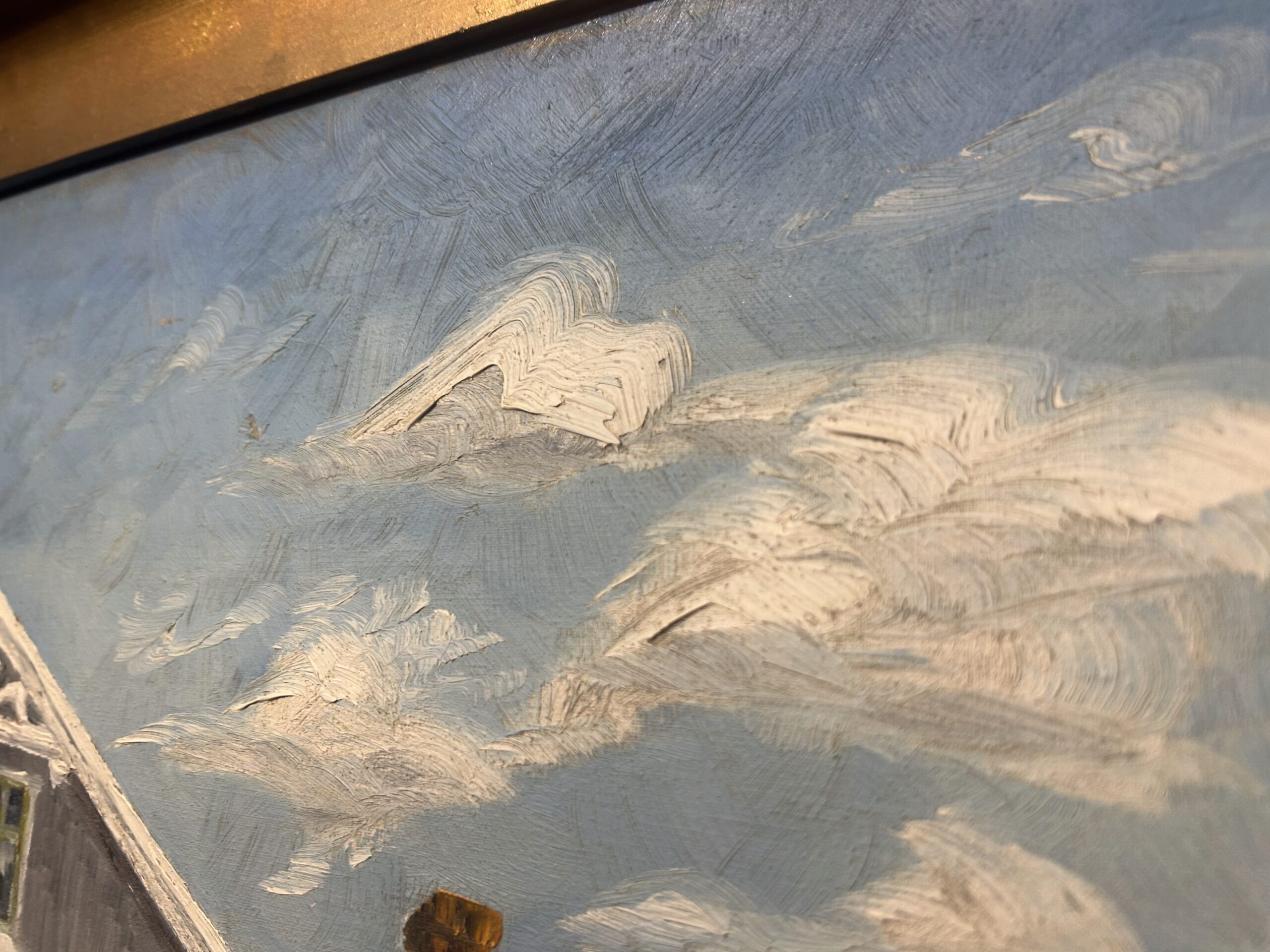 Obraz oprawiony jest w klasyczną drewnianą ramę malowaną na złoto, co nadaje mu elegancji i podkreśla jego wyjątkowy charakter.