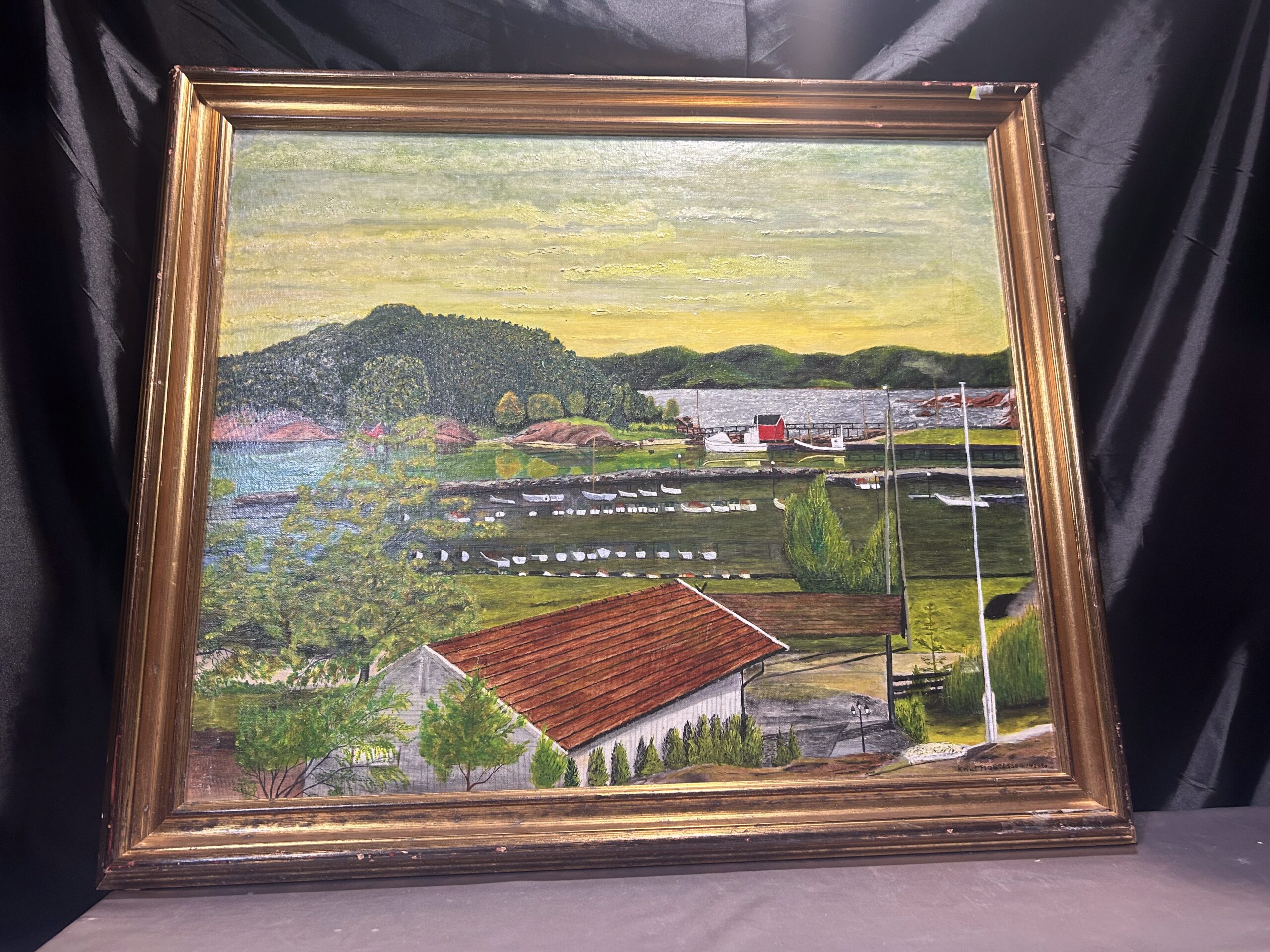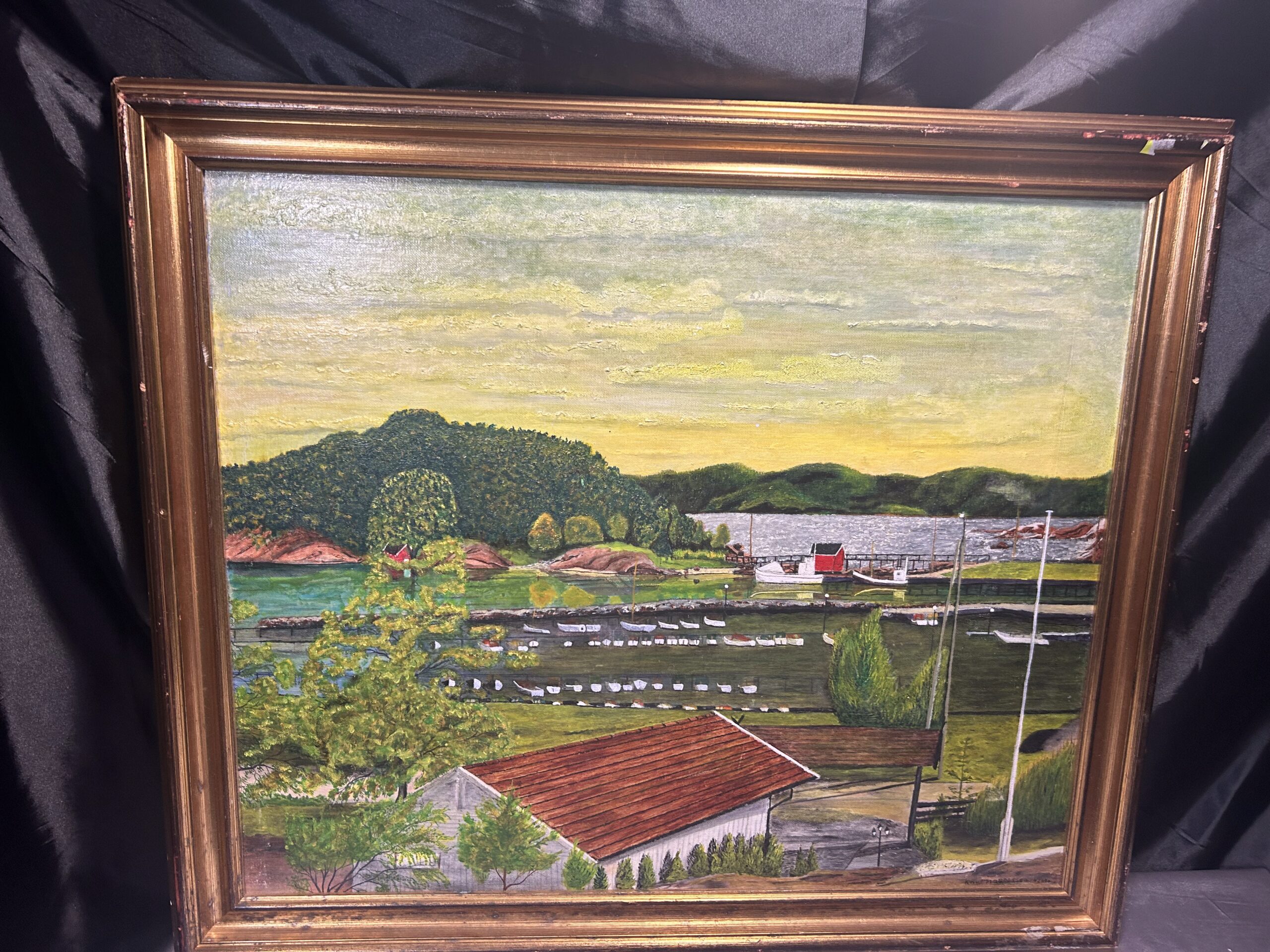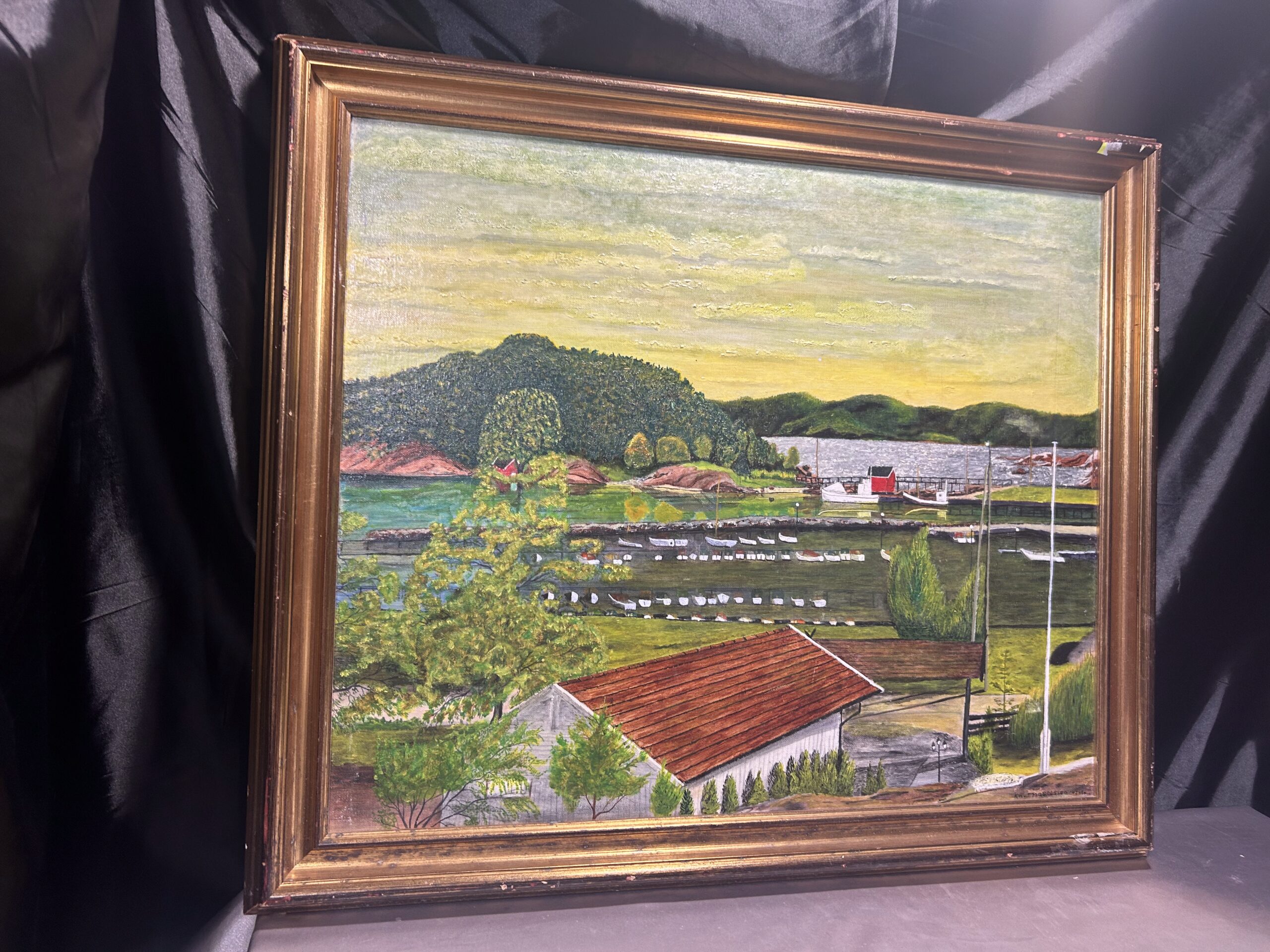 - Obraz „Domek nad zatoką” – olej na desce, złota drewniana rama, autor Knut Magolssen