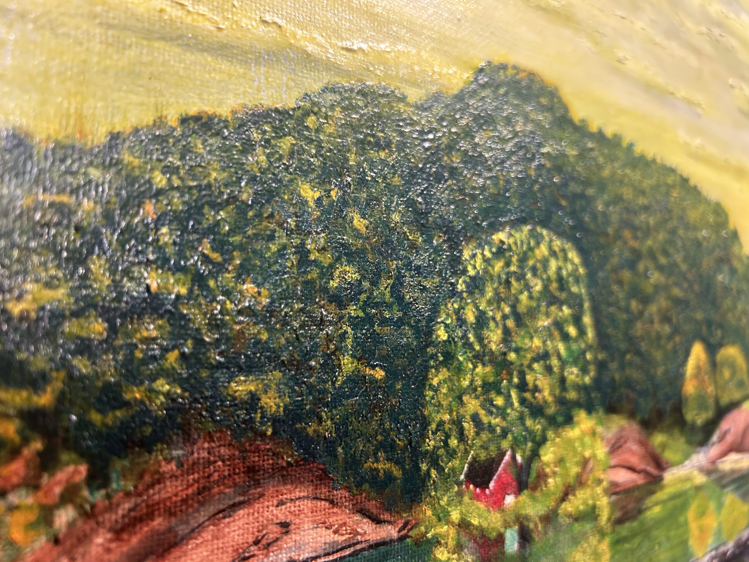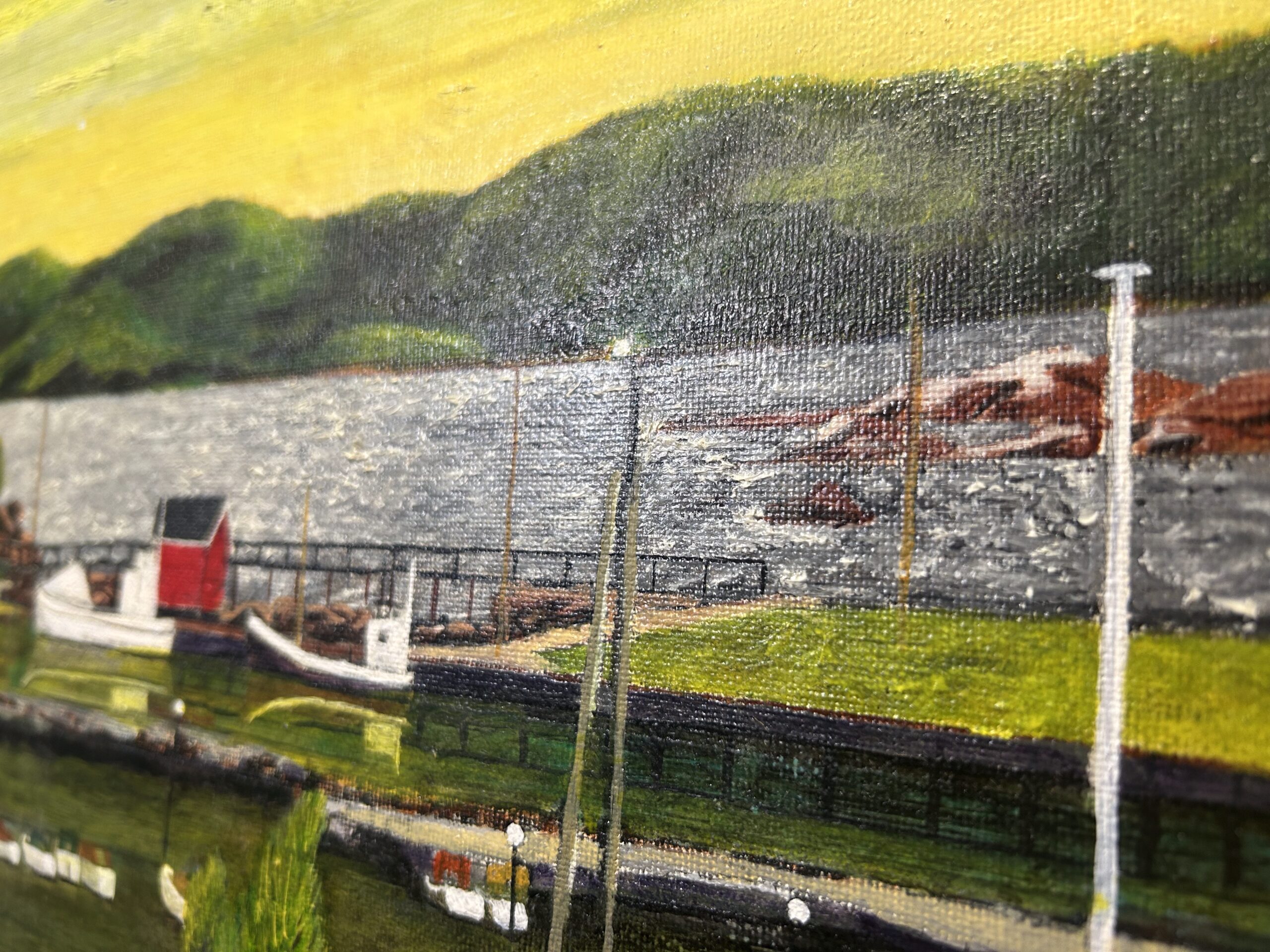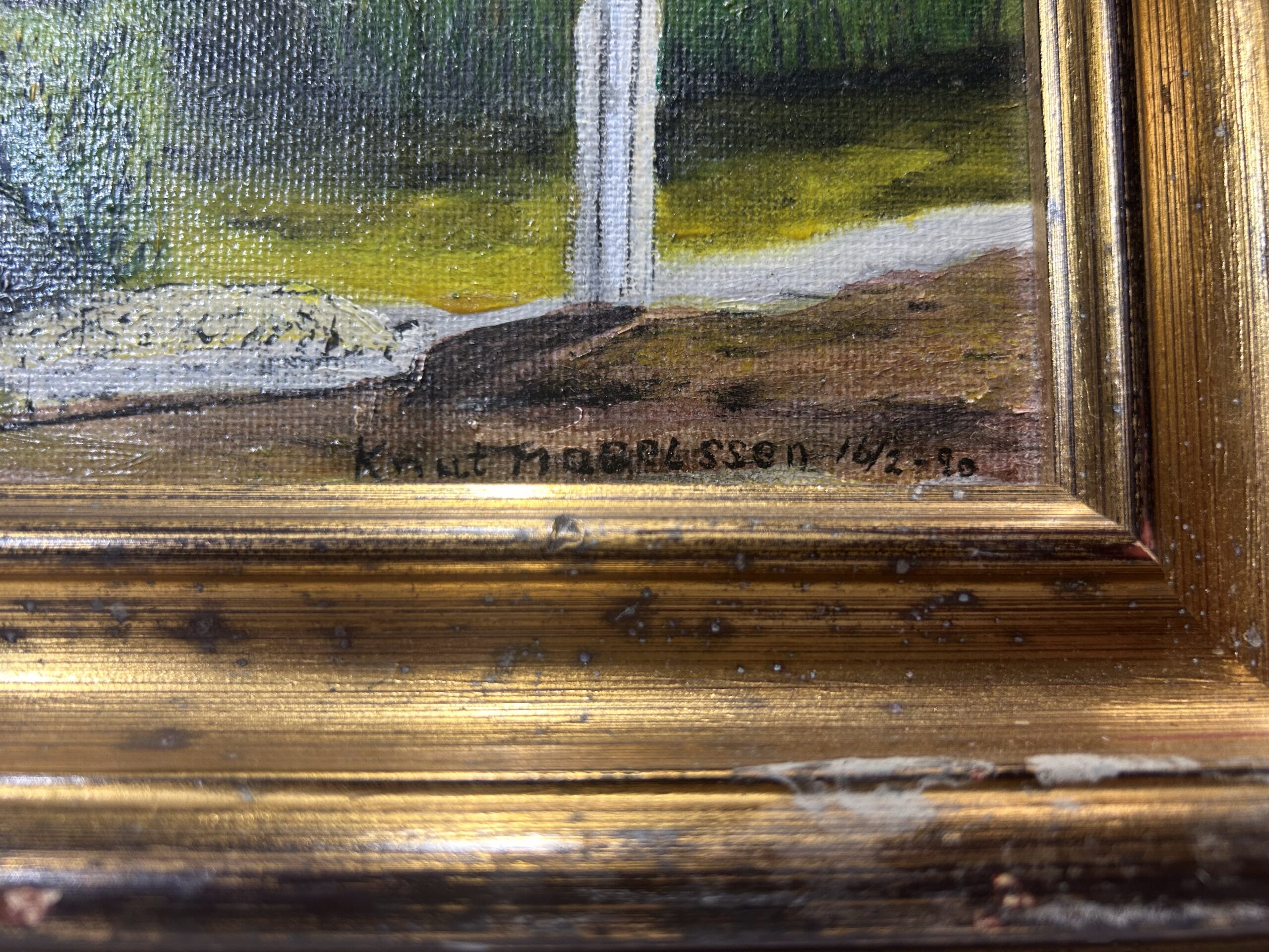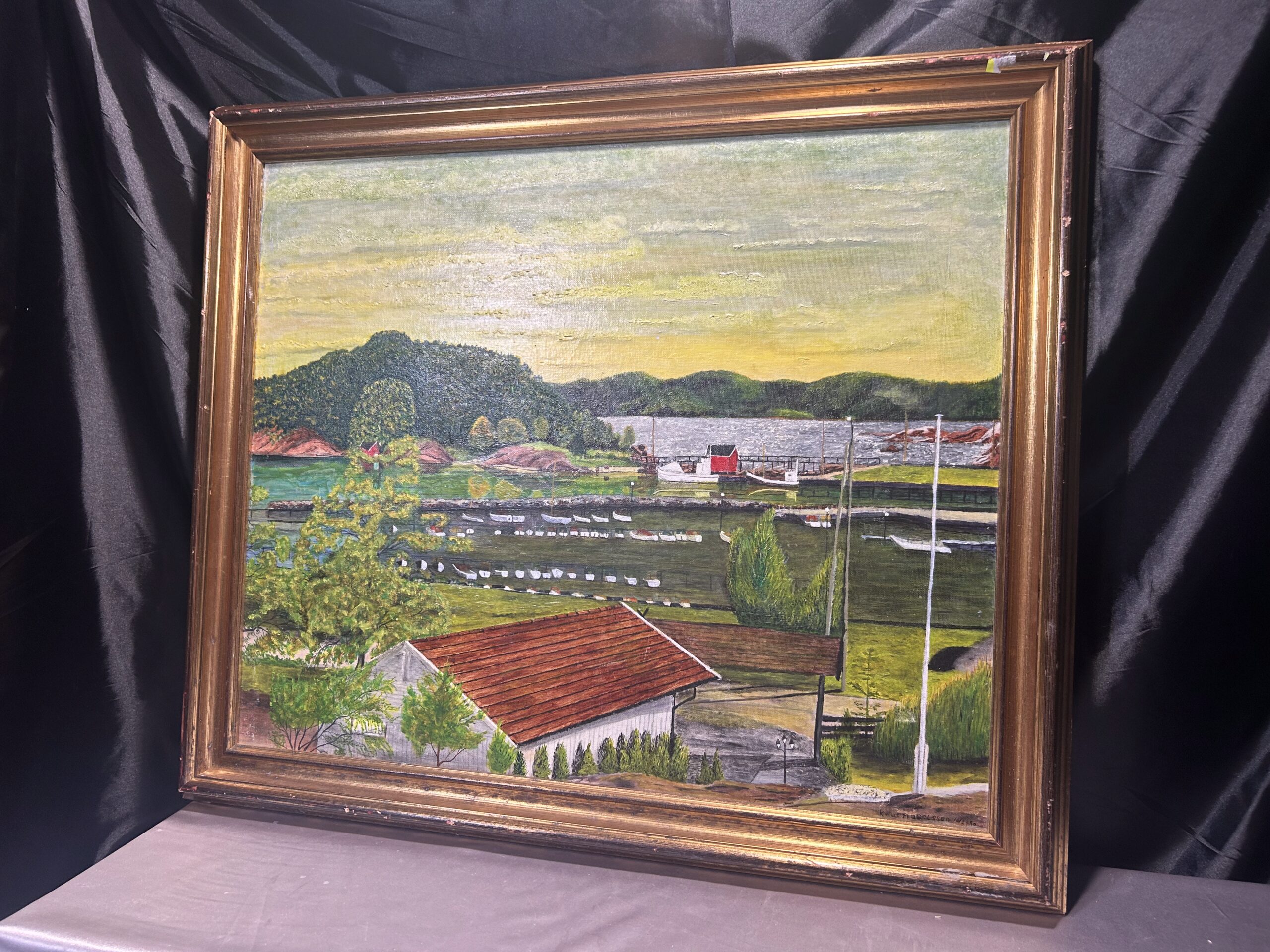 - Obraz „Domek nad zatoką” – olej na desce, złota drewniana rama, autor Knut Magolssen