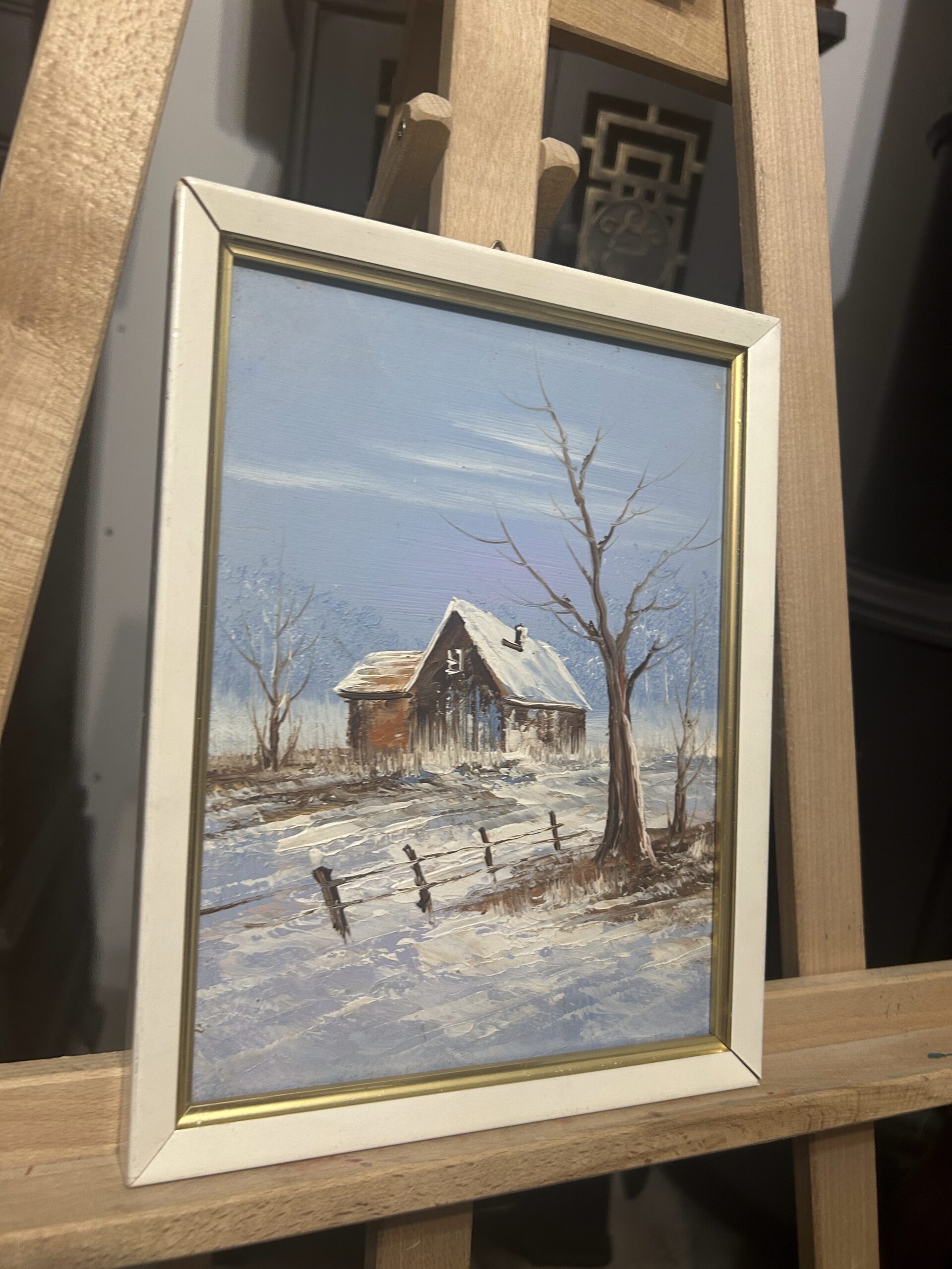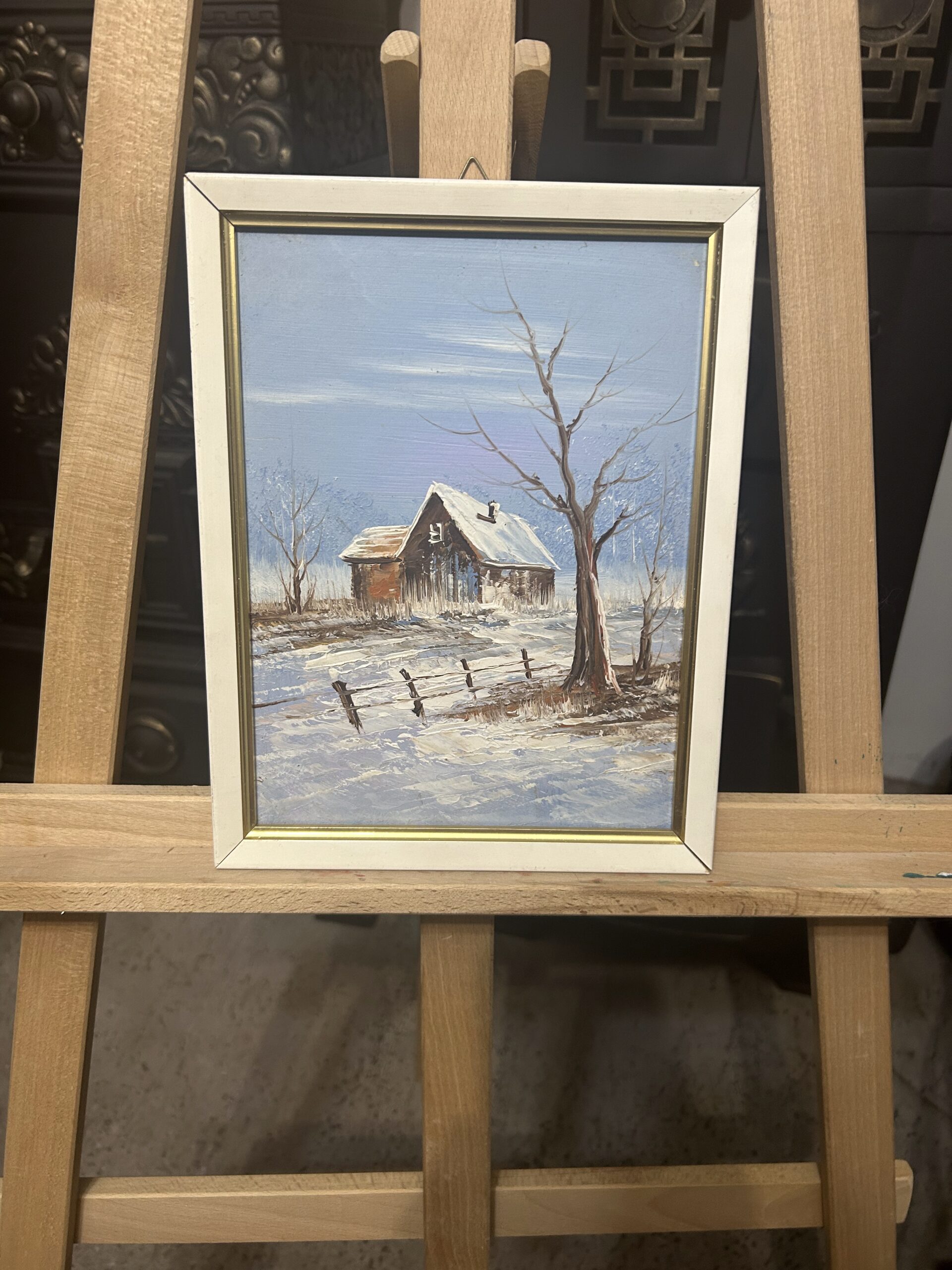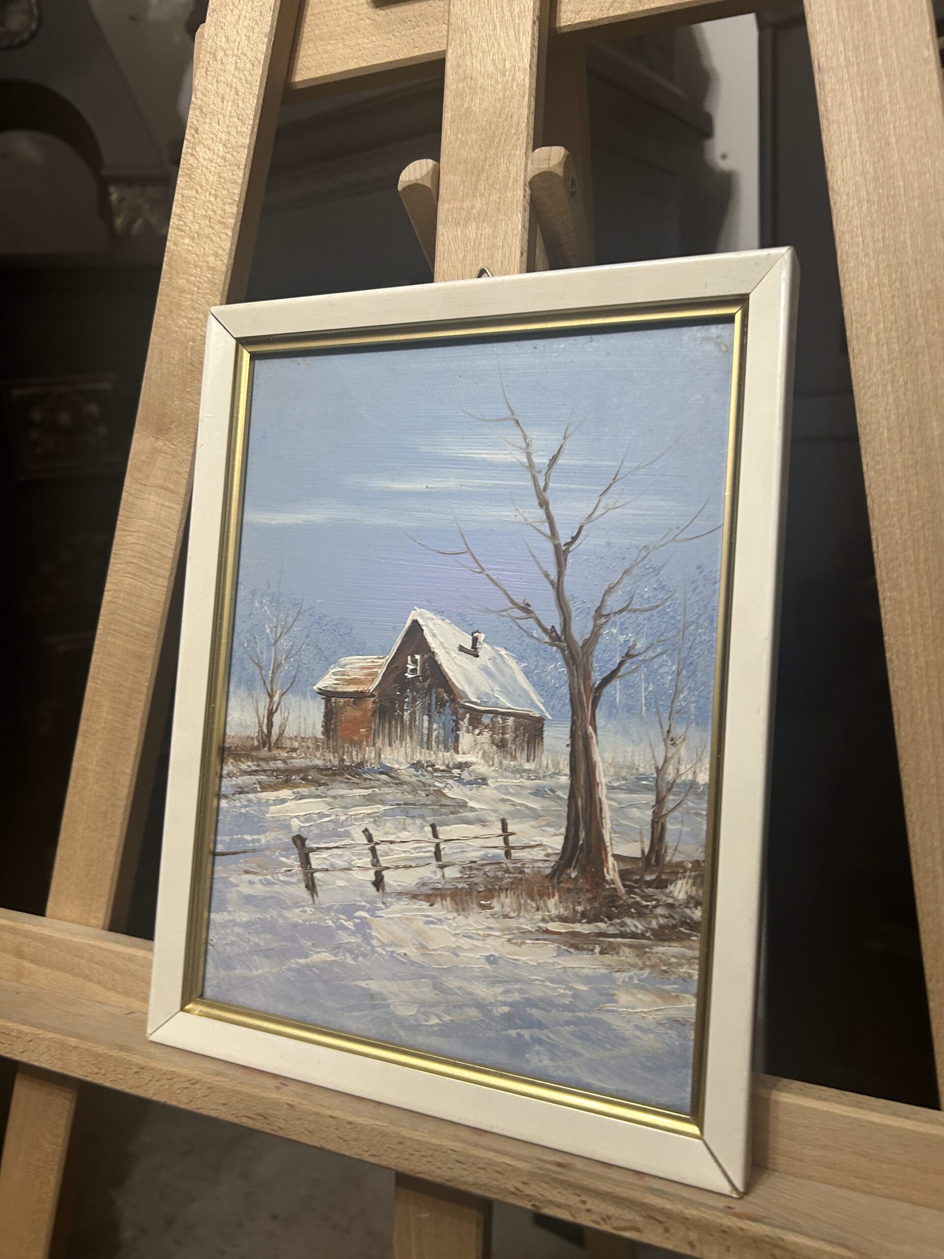Obraz „Domek zimą” – malowany na desce