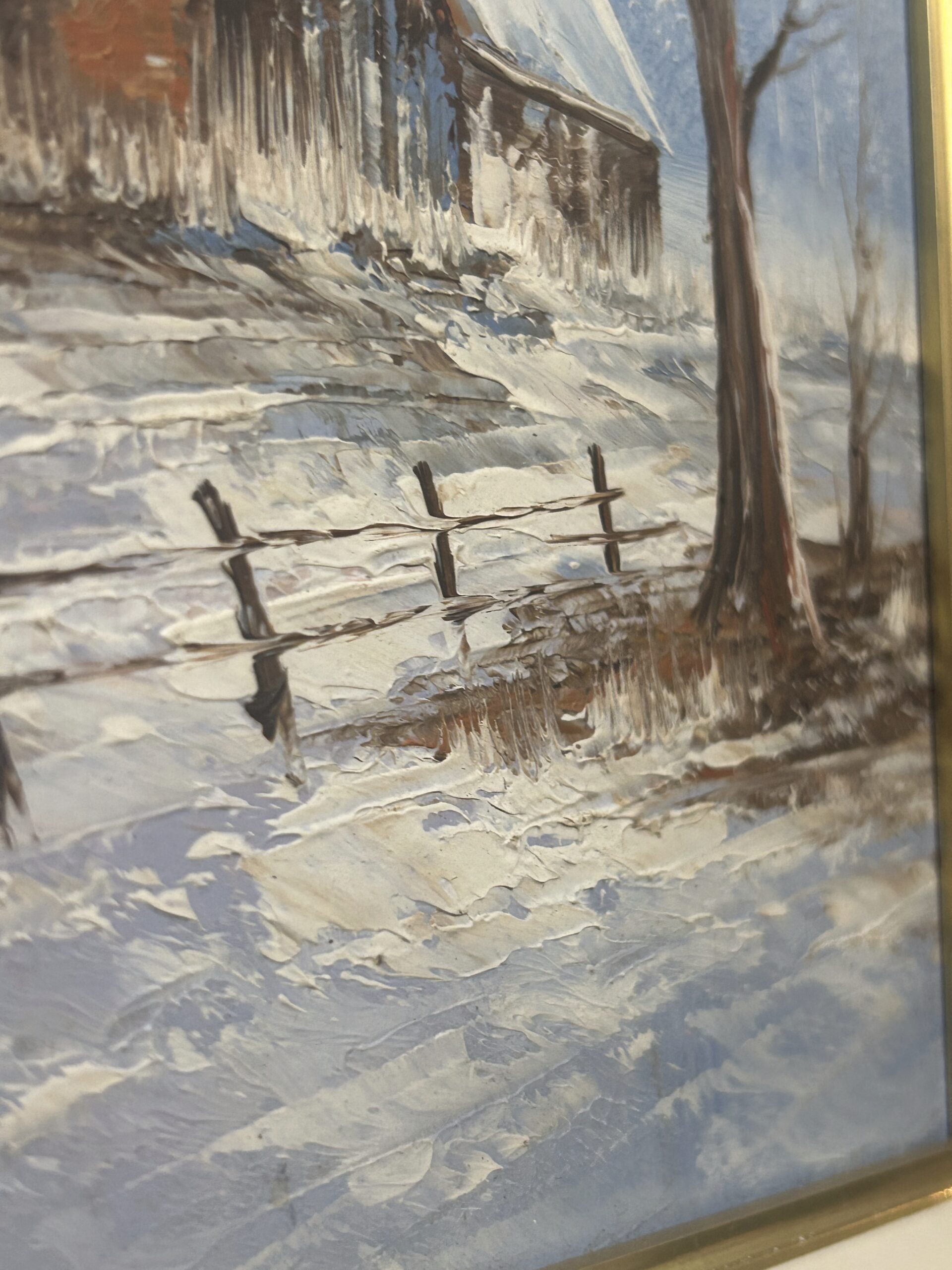 Nastrojowy, zimowy krajobraz przedstawiający drewniany domek w otoczeniu ośnieżonych pól i drzew. Urokliwa kompozycja oddaje spokój zimowej scenerii, gdzie błękitne niebo kontrastuje z białym puchem pokrywającym ziemię. Biało-złota rama elegancko podkreśla delikatność dzieła, tworząc harmonijny efekt wizualny.