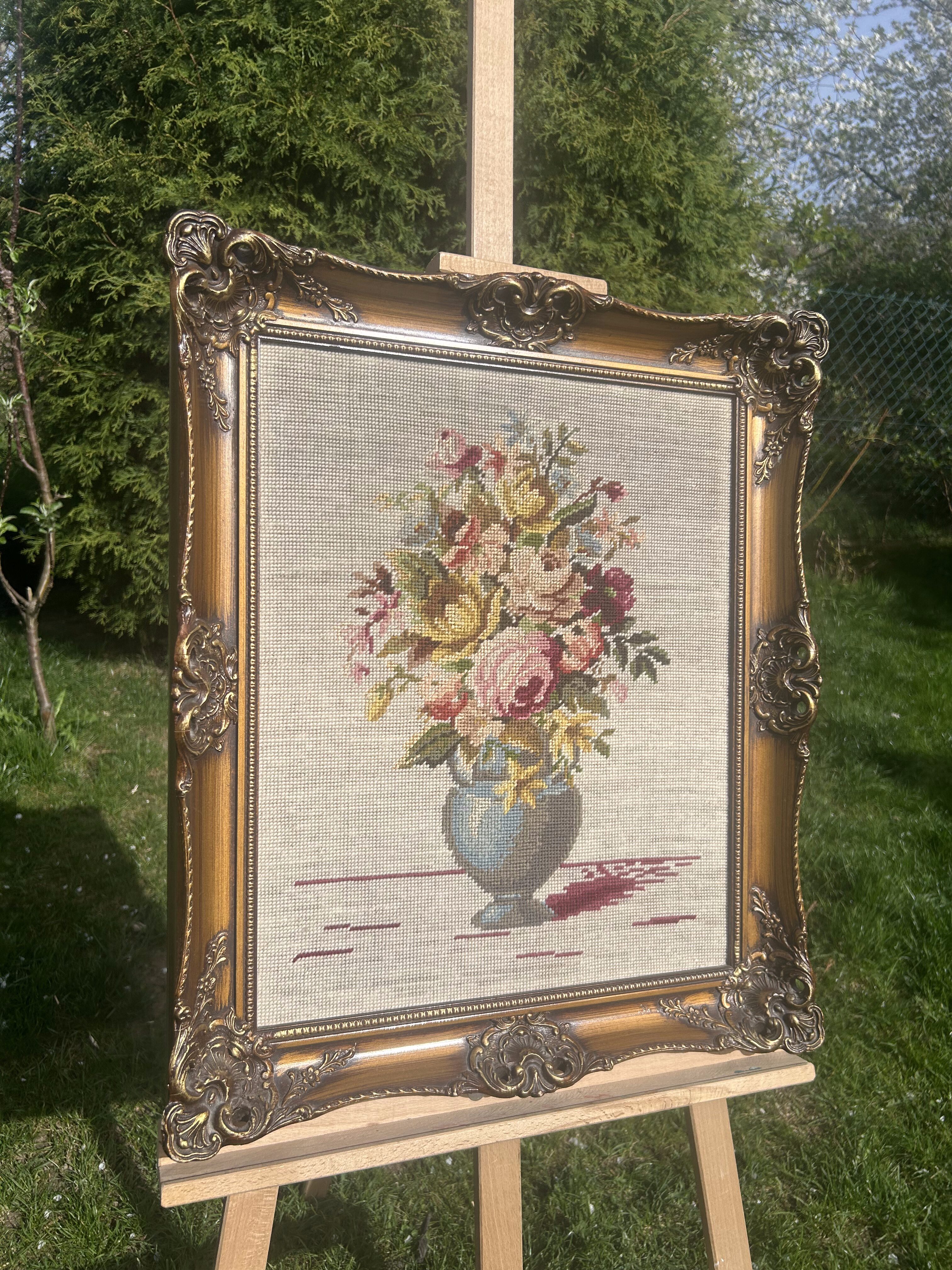 Obraz – Haft z 1978 roku – Martwa natura: kwiaty w wazonie – Drewniana rzeźbiona rama