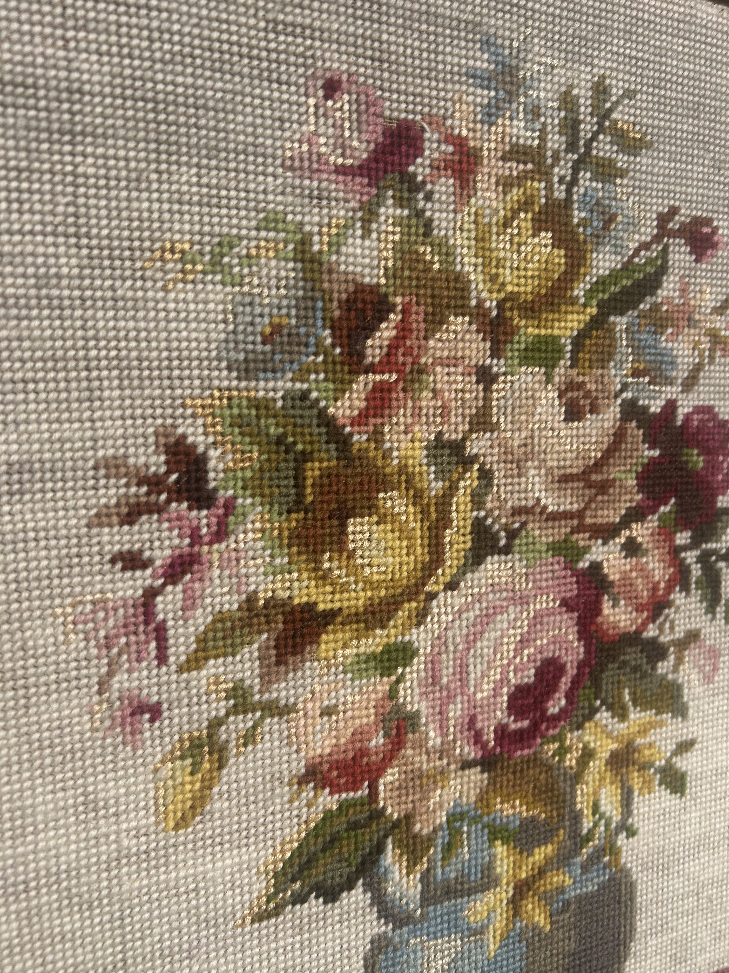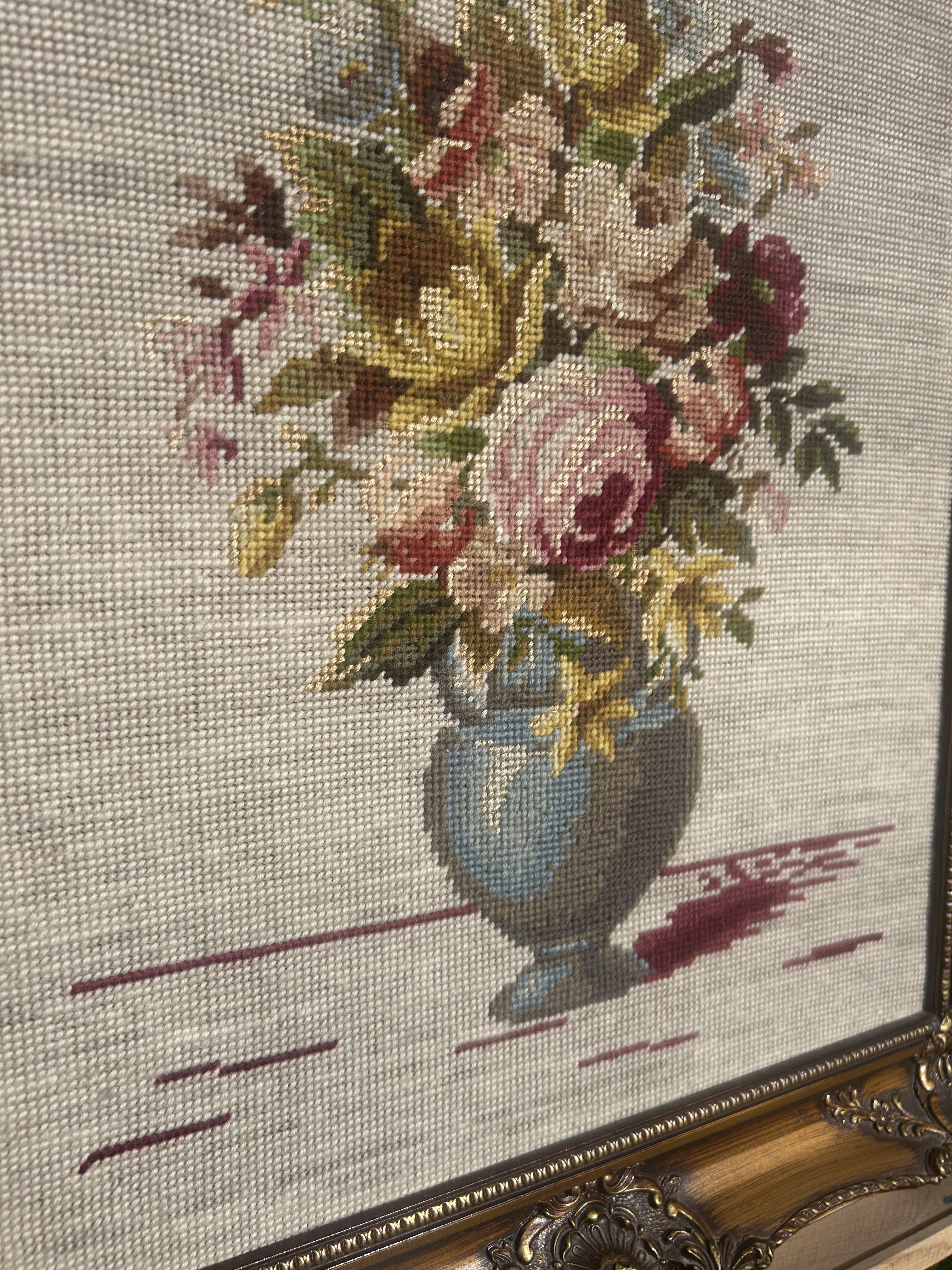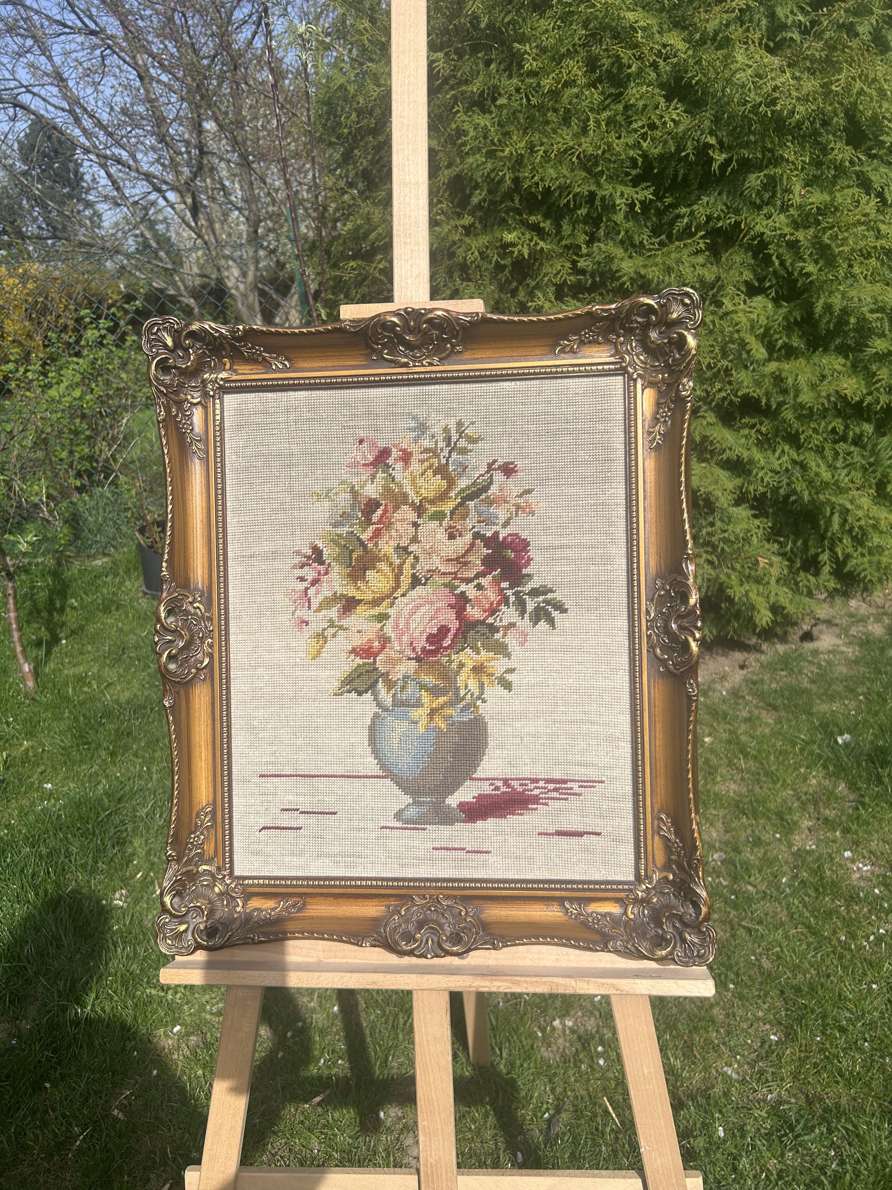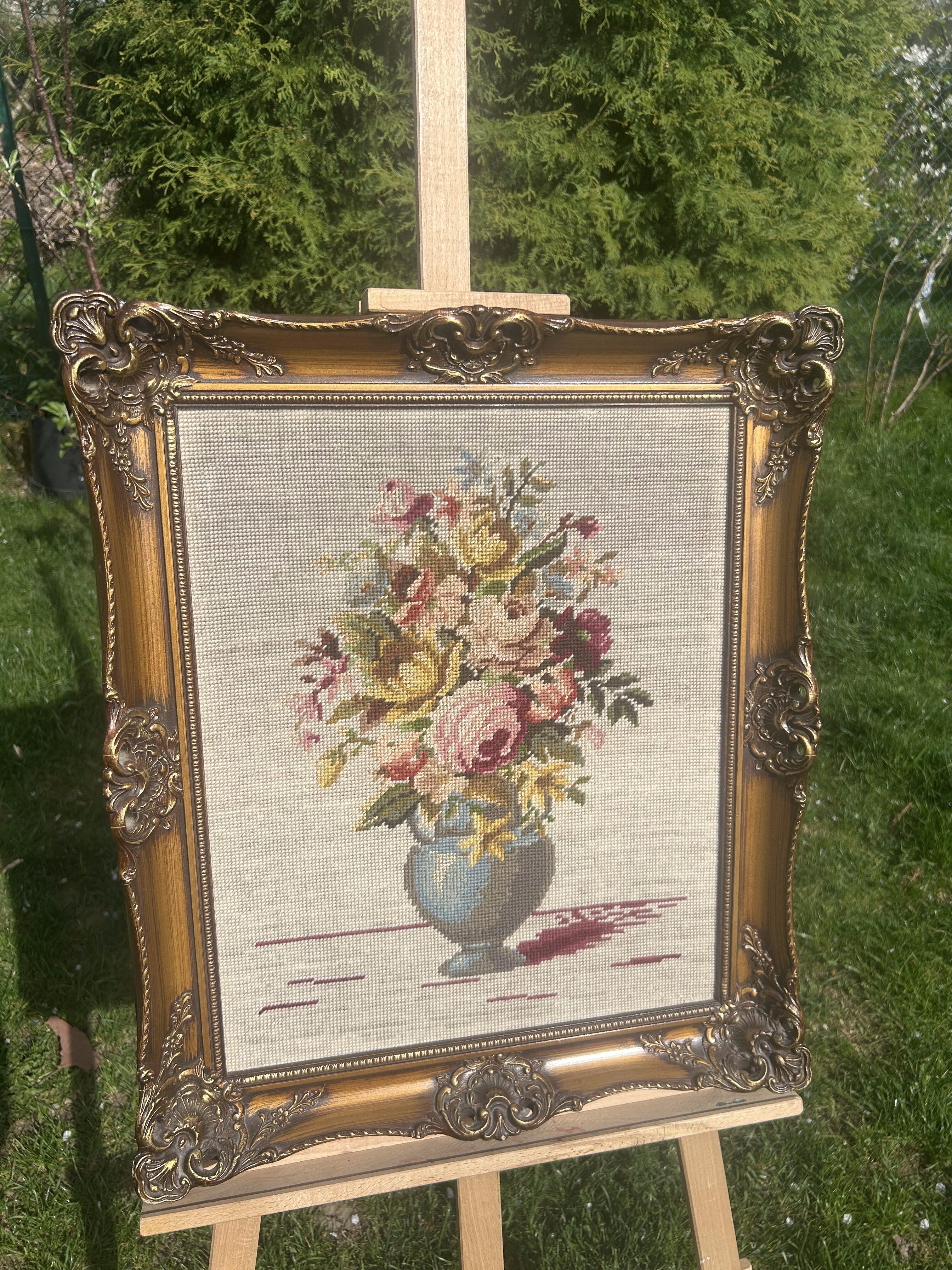 - Obraz – Haft z 1978 roku – Martwa natura: kwiaty w wazonie – Drewniana rzeźbiona rama