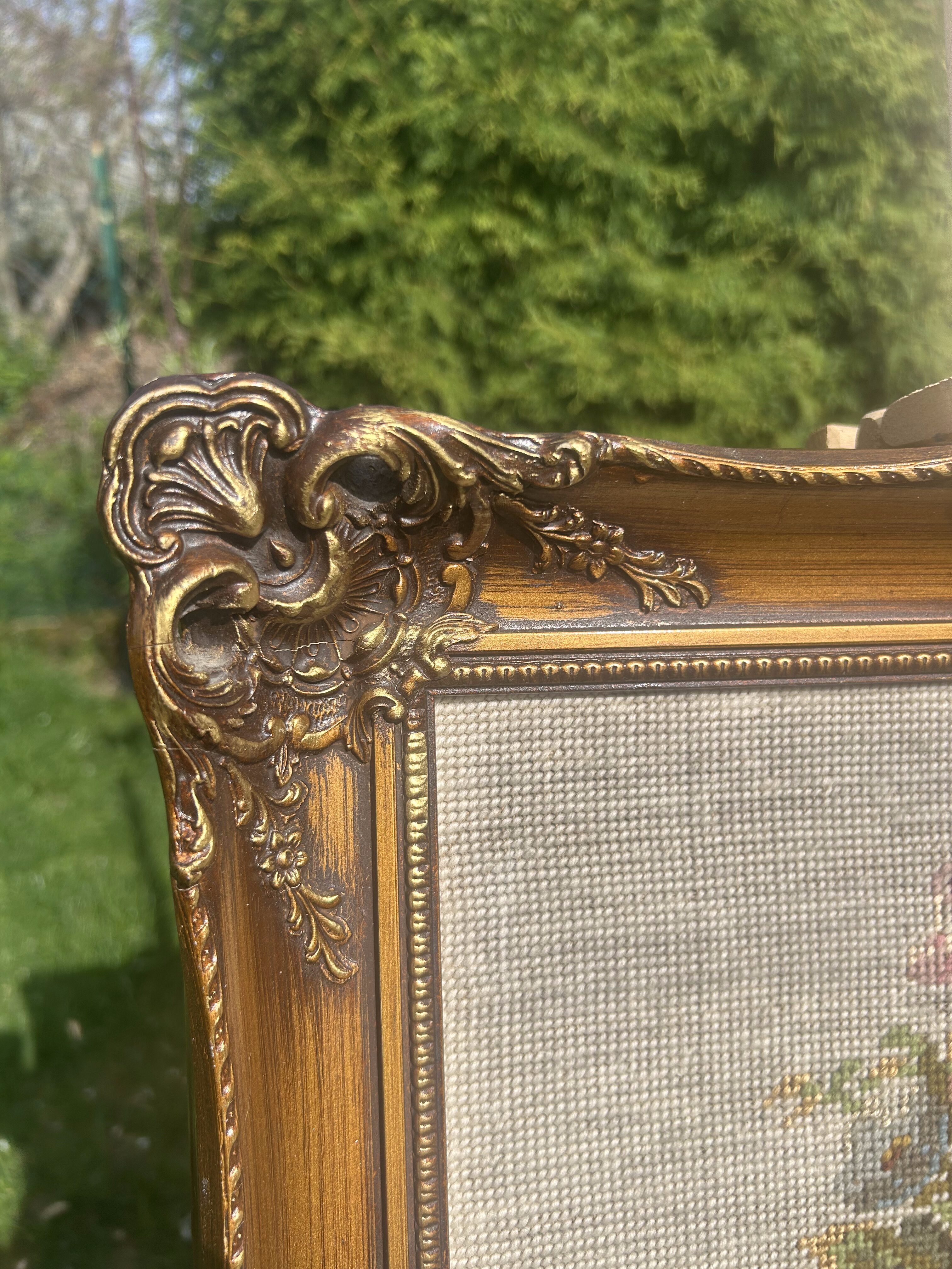 Całość oprawiona w bogato rzeźbioną, drewnianą ramę w złotym kolorze, która nadaje pracy eleganckiego, nieco pałacowego charakteru. Obraz gotowy do zawieszenia – idealny do wnętrz w stylu vintage, klasycznym, prowansalskim lub retro.