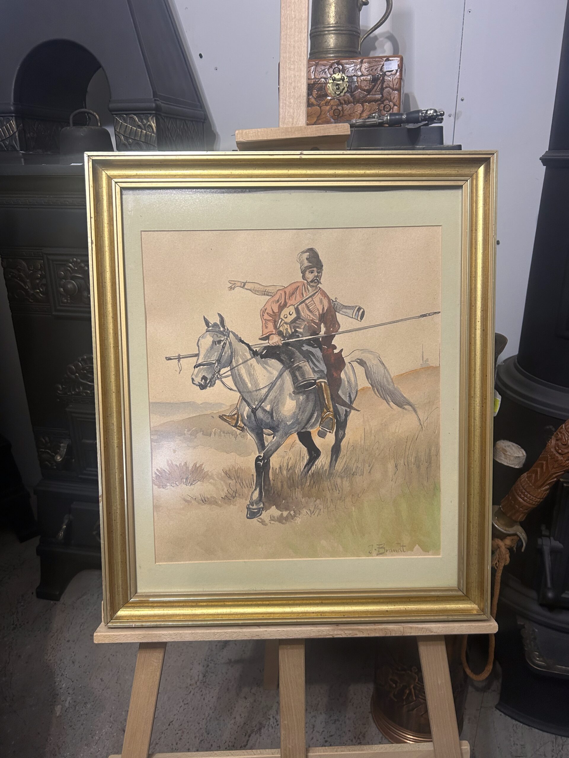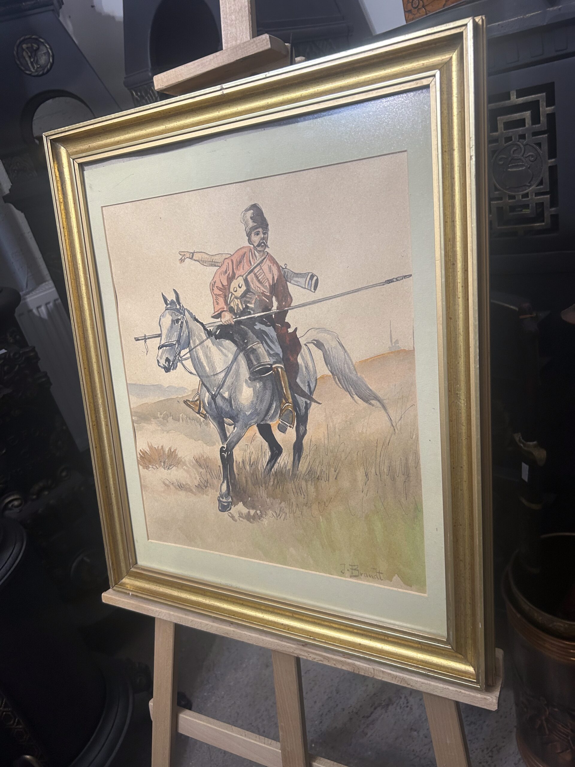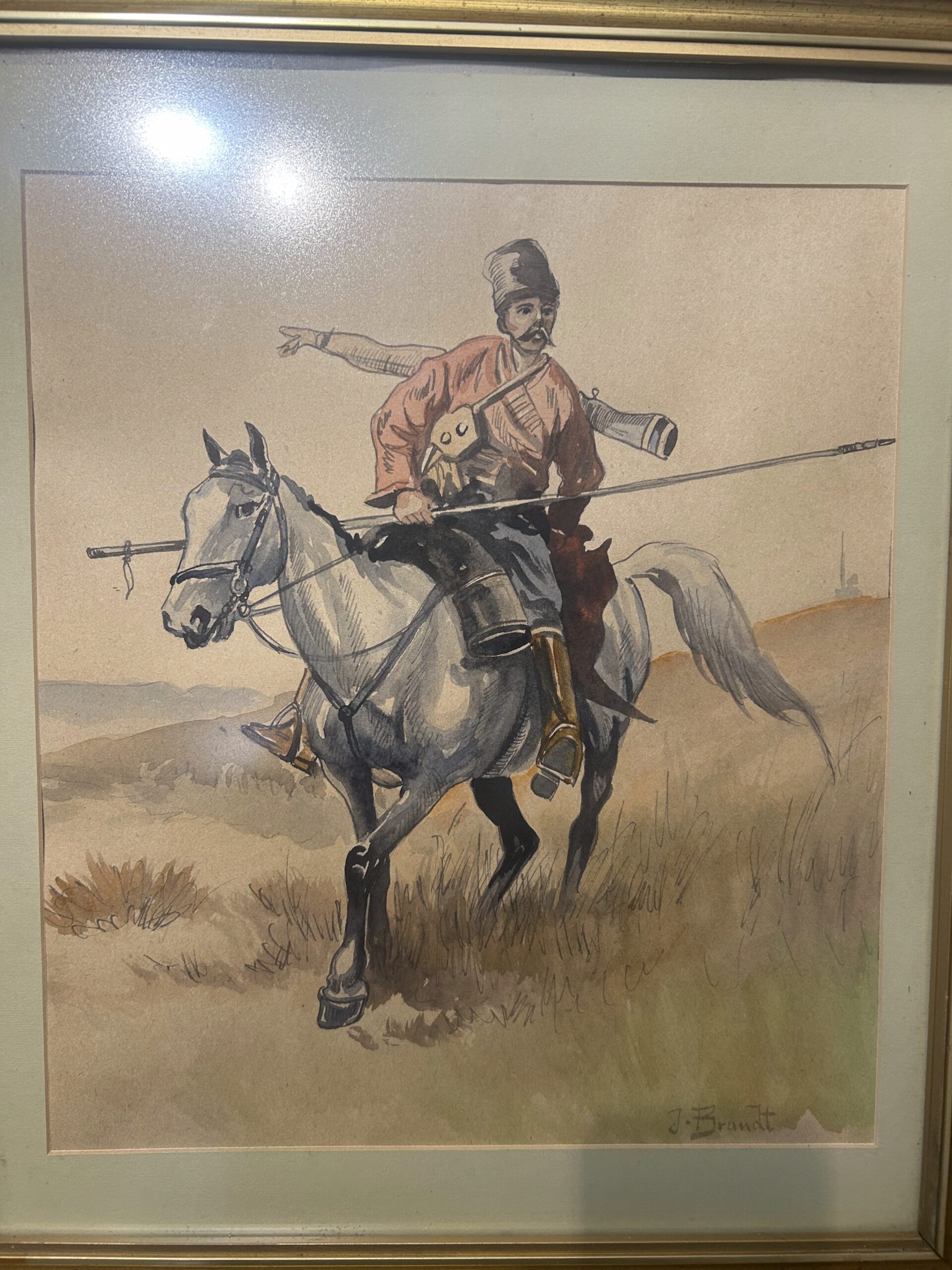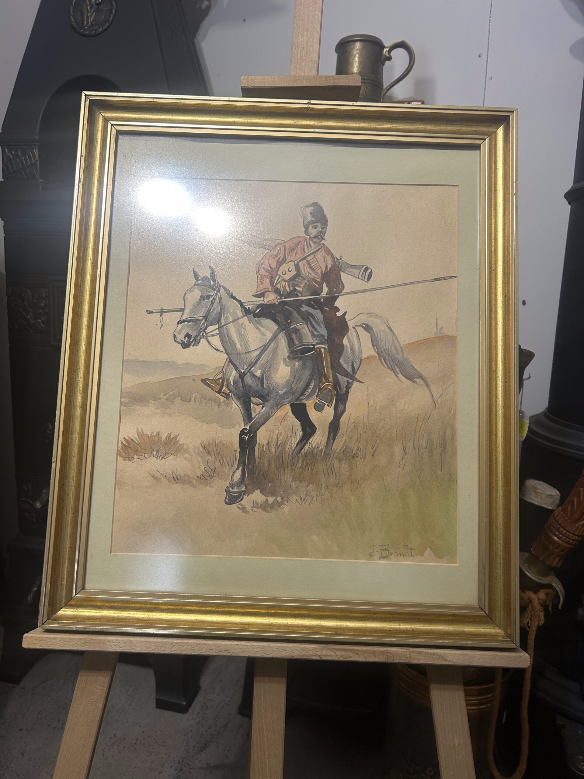 Akwarela autorstwa Józefa Brandta (1841–1915), wybitnego polskiego malarza batalisty, przedstawiająca ułana na koniu. Obraz oprawiony w drewnianą ramę w złotym kolorze, zabezpieczony szybą.