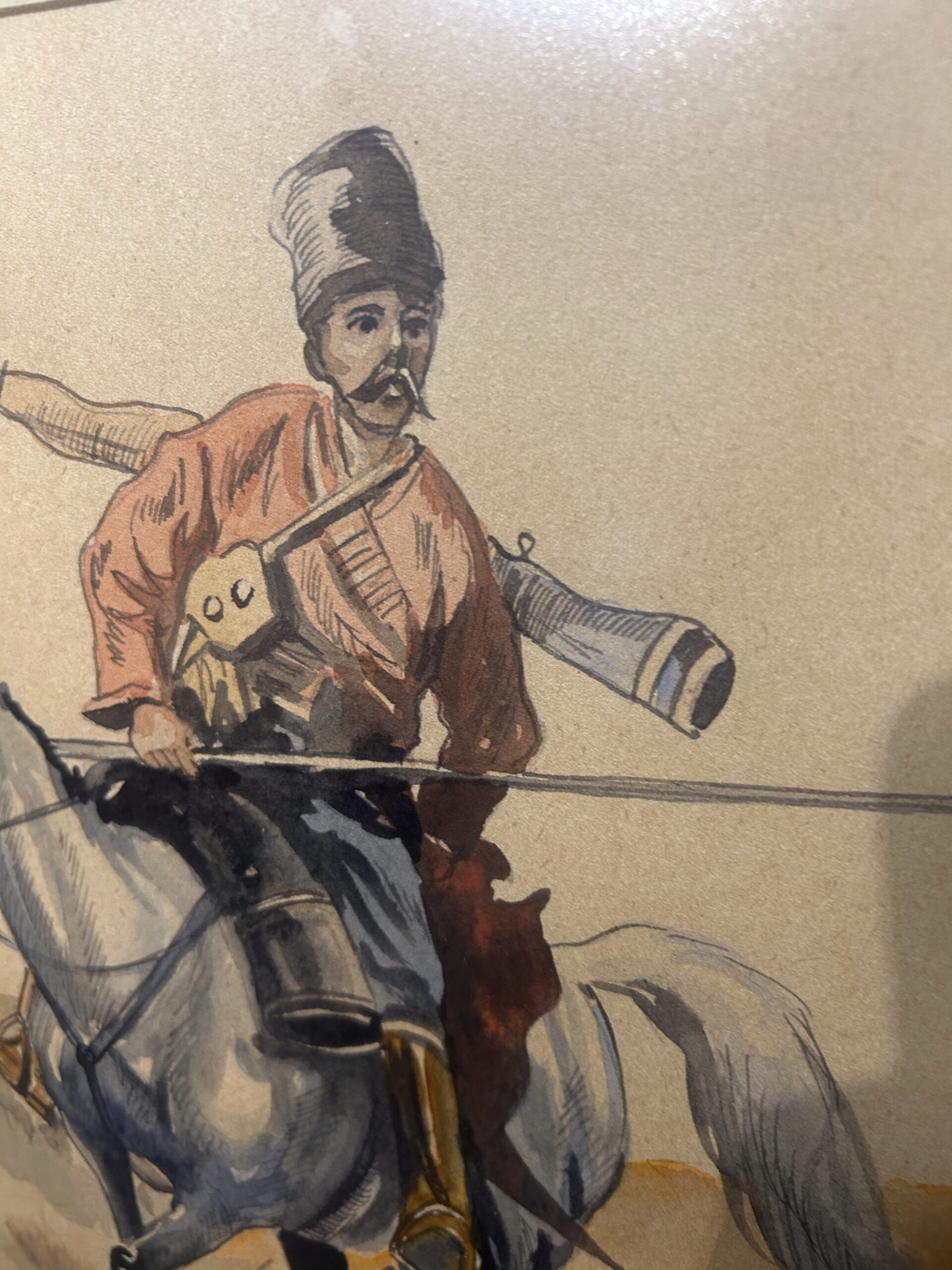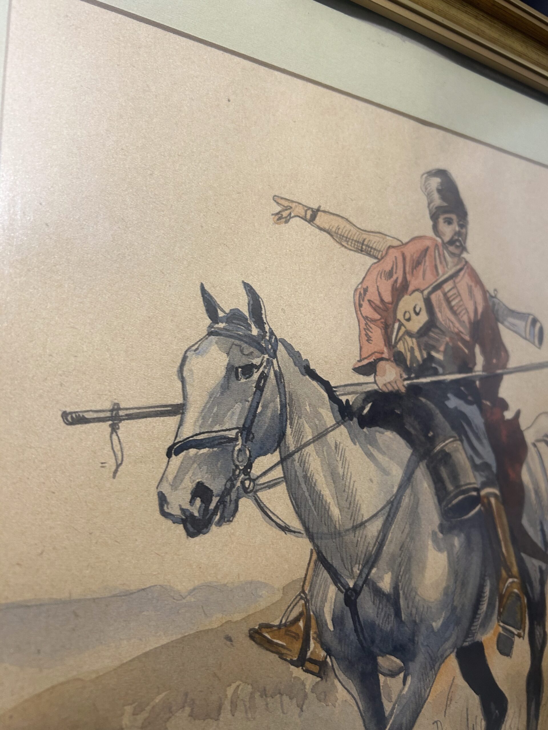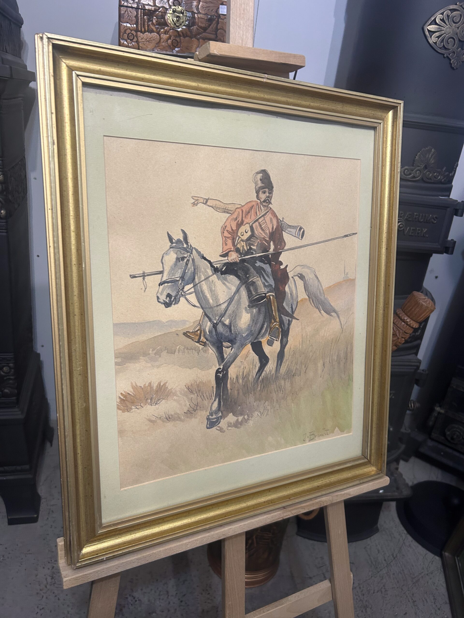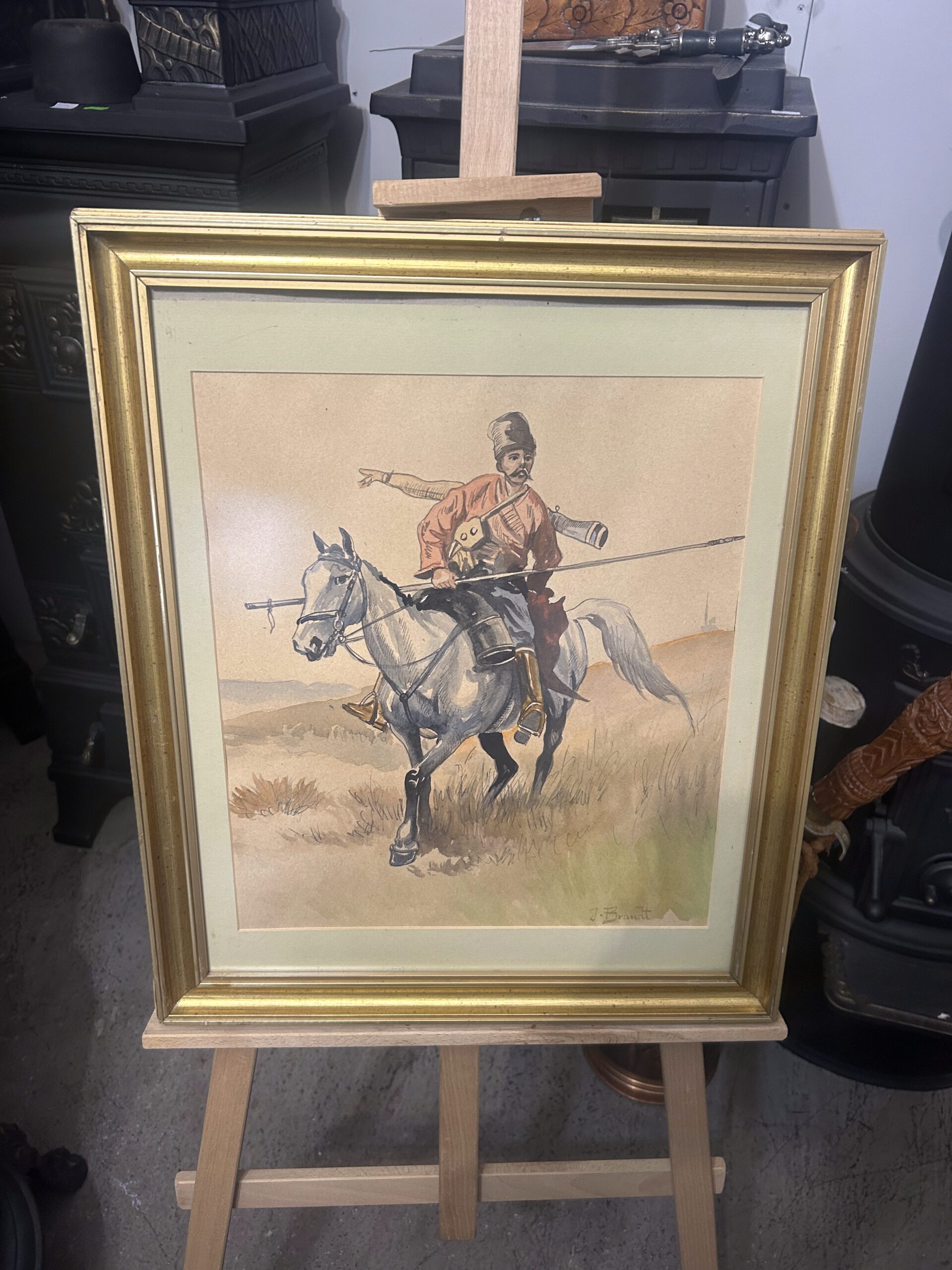 Akwarela autorstwa Józefa Brandta (1841–1915), wybitnego polskiego malarza batalisty, przedstawiająca ułana na koniu. Obraz oprawiony w drewnianą ramę w złotym kolorze, zabezpieczony szybą.