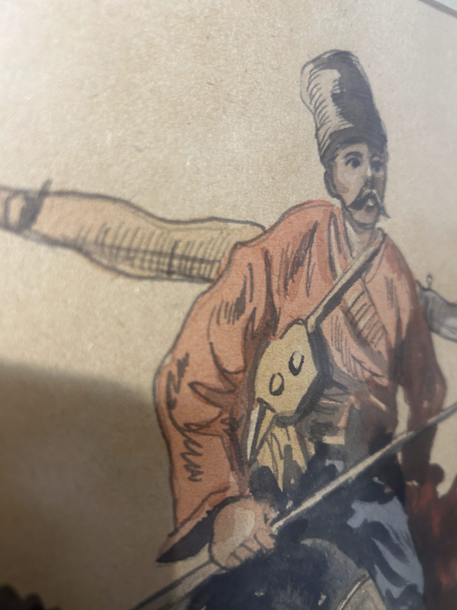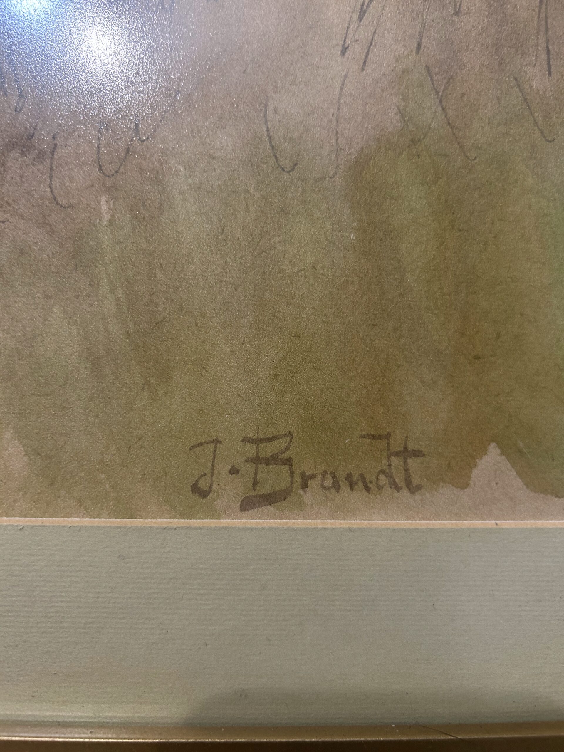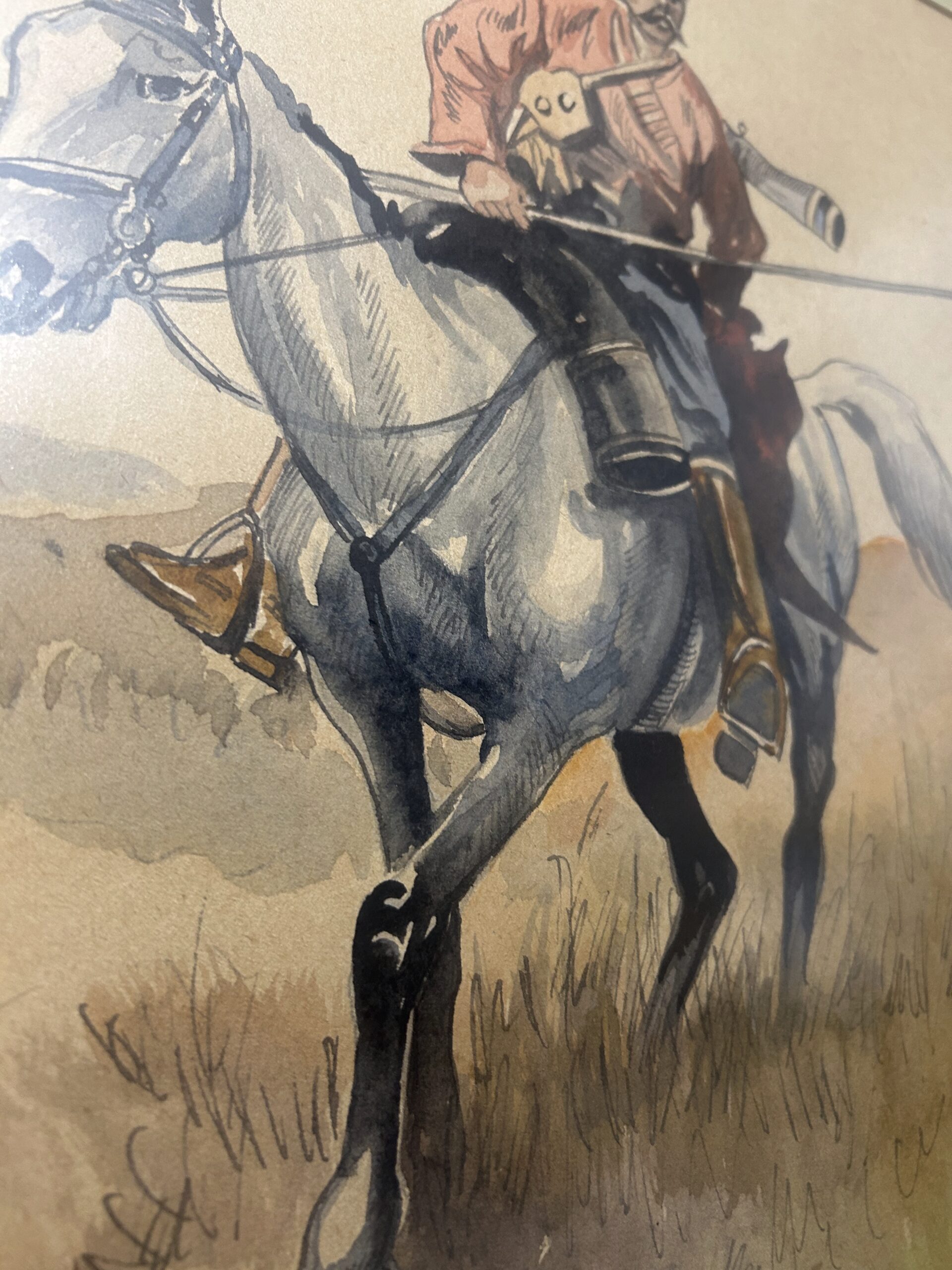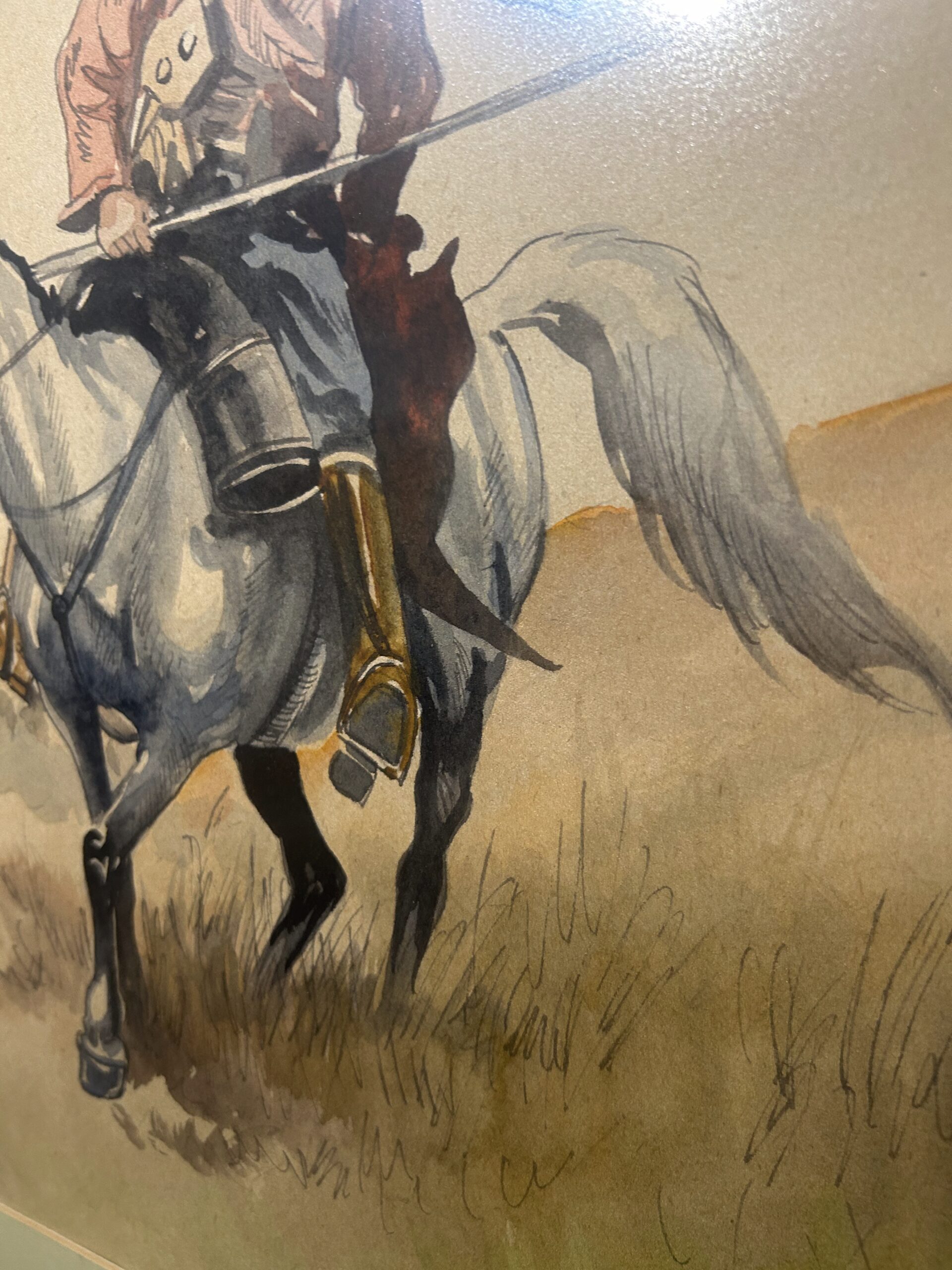 Akwarela autorstwa Józefa Brandta (1841–1915), wybitnego polskiego malarza batalisty, przedstawiająca ułana na koniu. Obraz oprawiony w drewnianą ramę w złotym kolorze, zabezpieczony szybą.