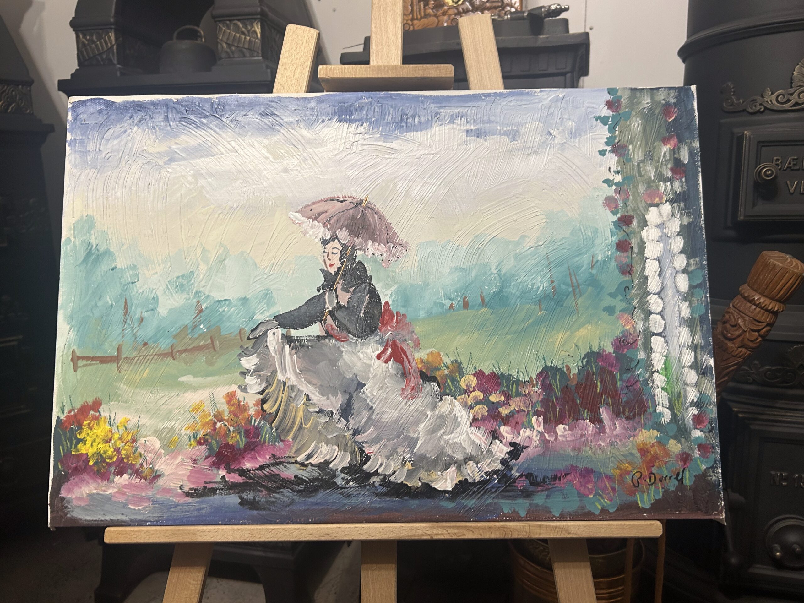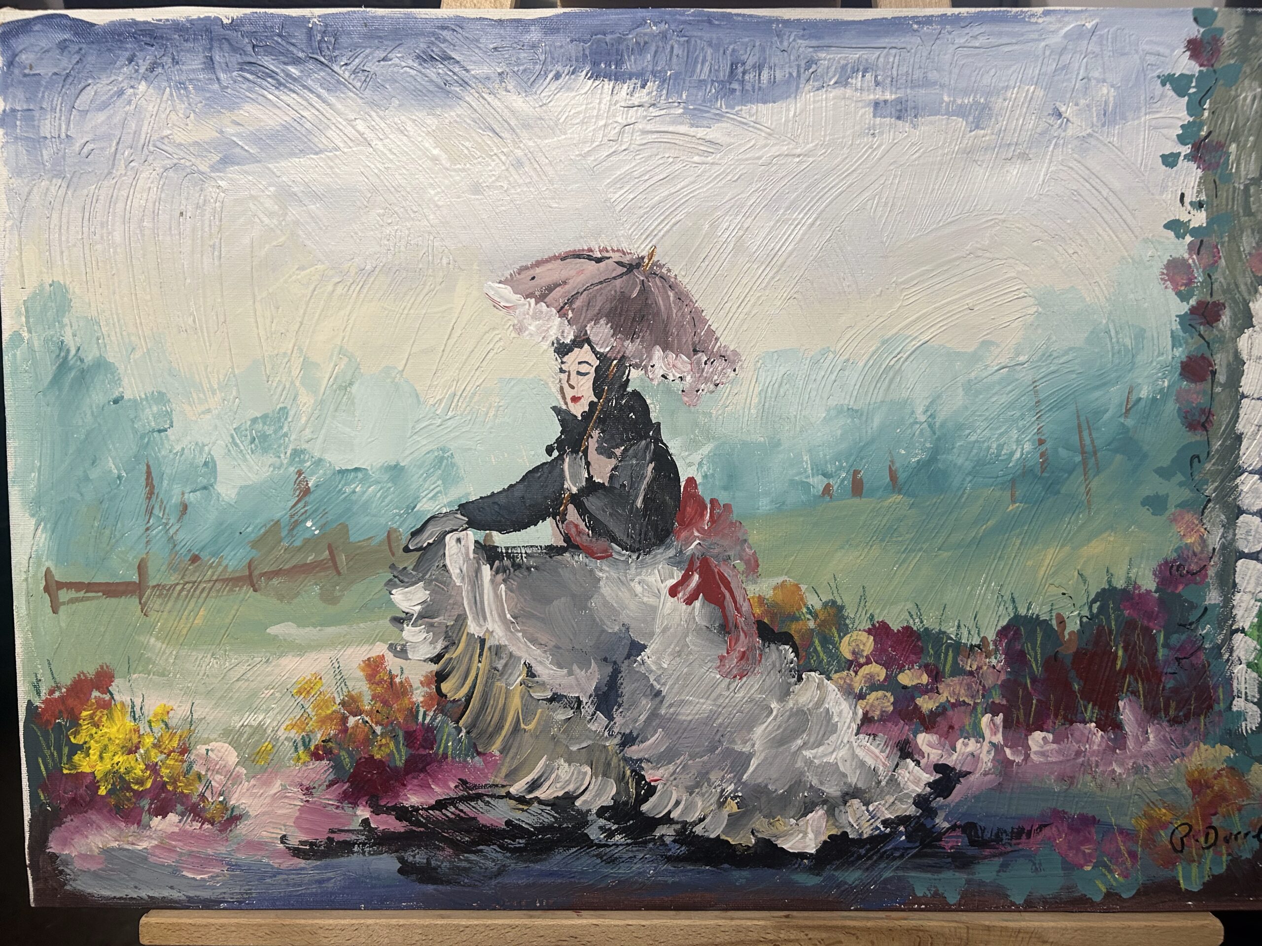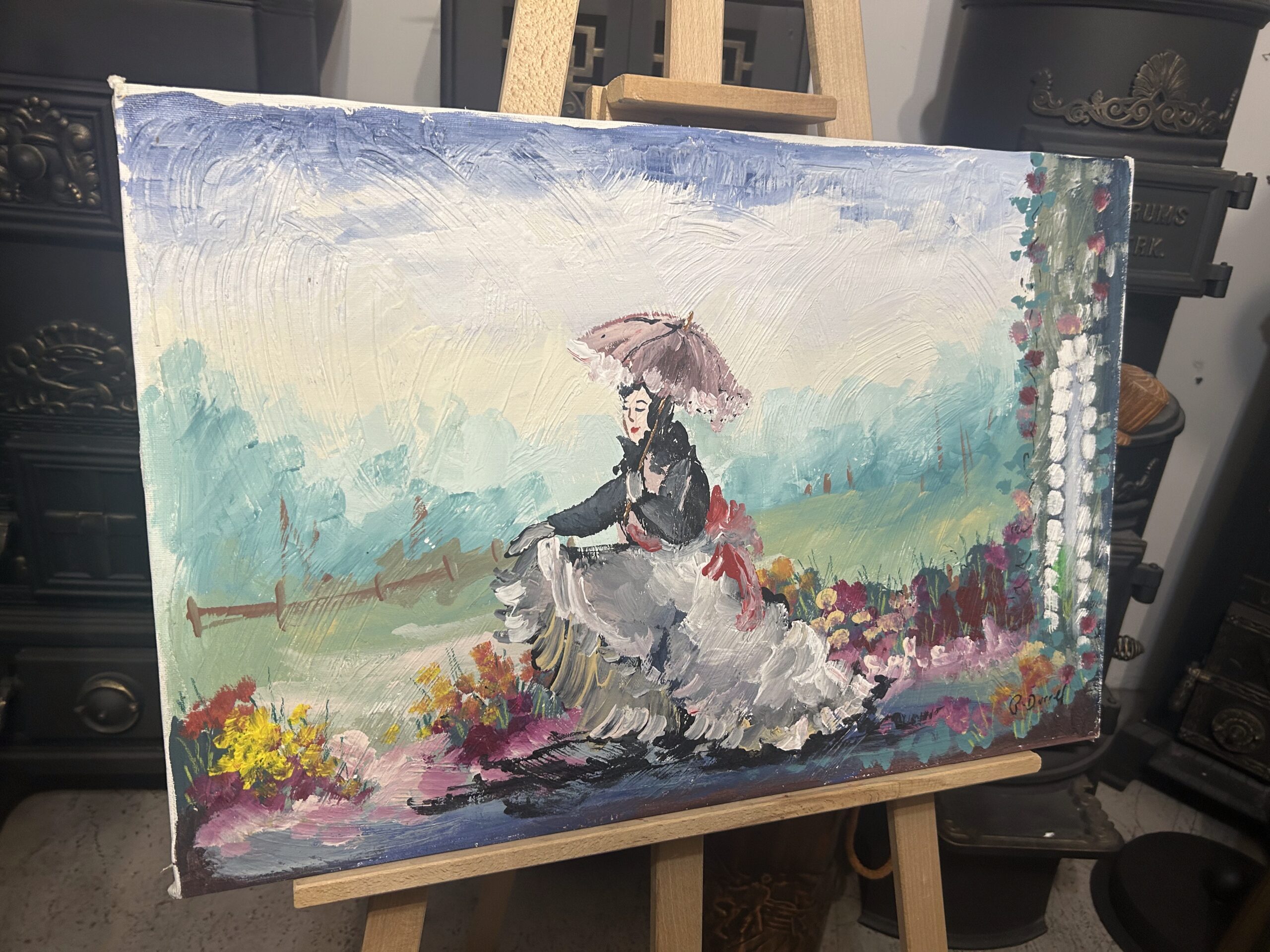 Elegancki obraz olejny na płótnie autorstwa P. Durrela, przedstawiający postać kobiety z parasolką, uchwyconą w subtelnej i wyrafinowanej kompozycji. Dzieło emanuje delikatnością i klasycznym urokiem, oddając charakterystyczny styl autora.