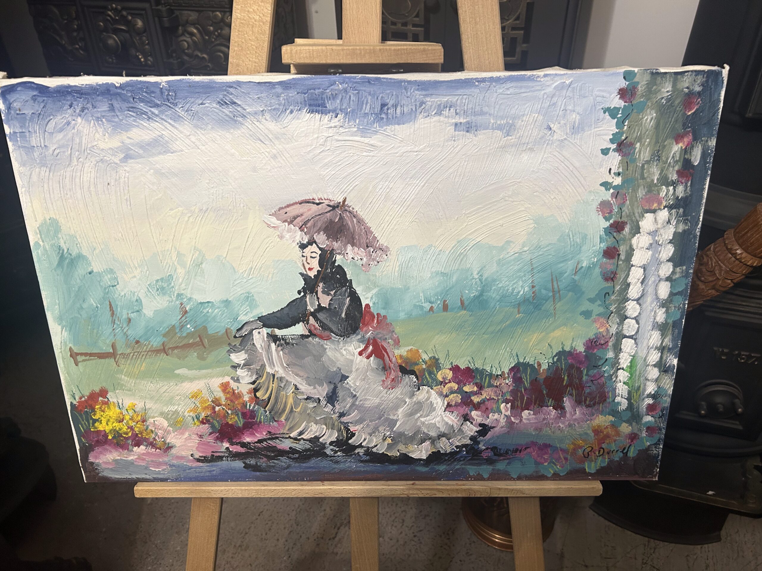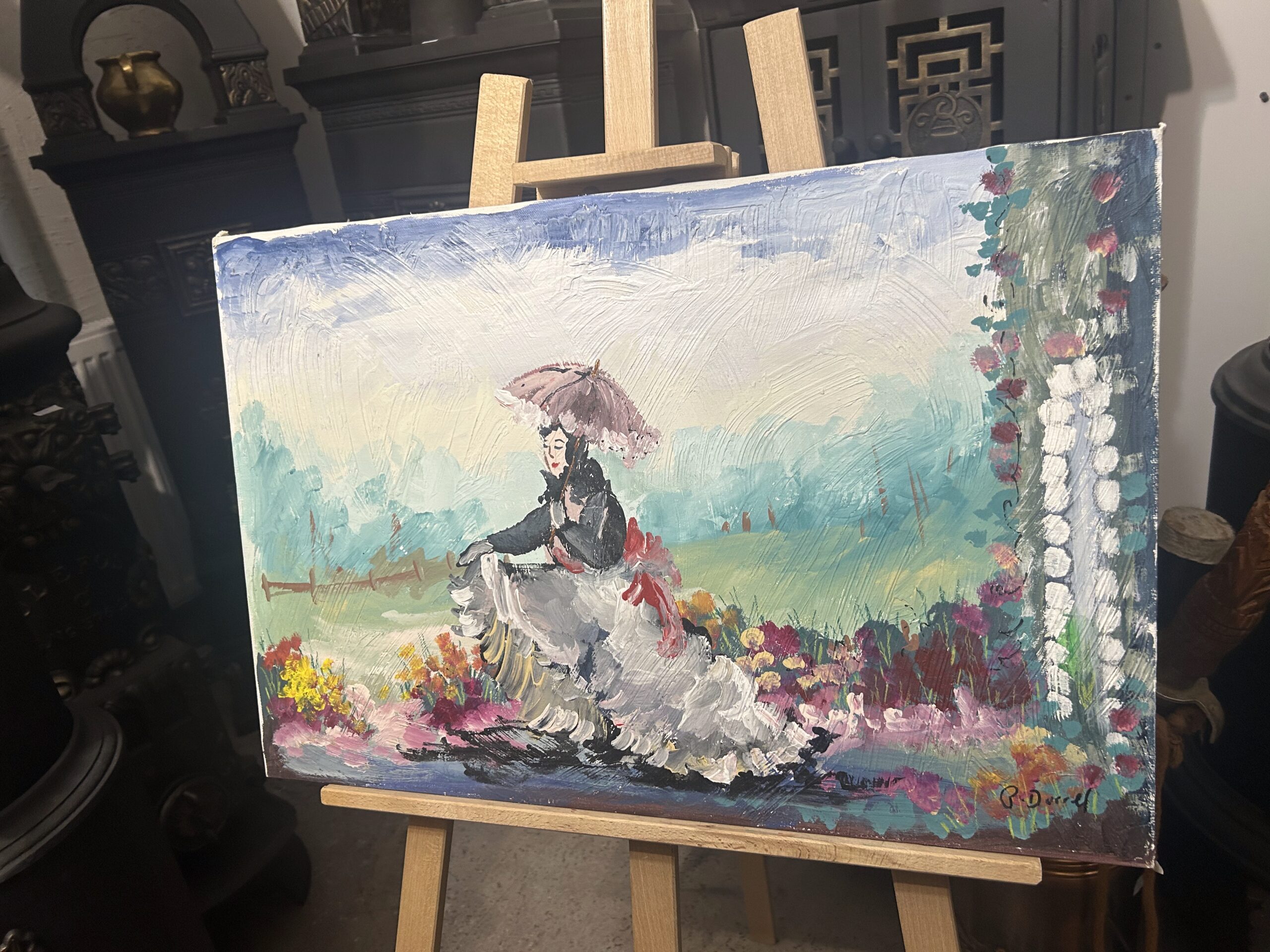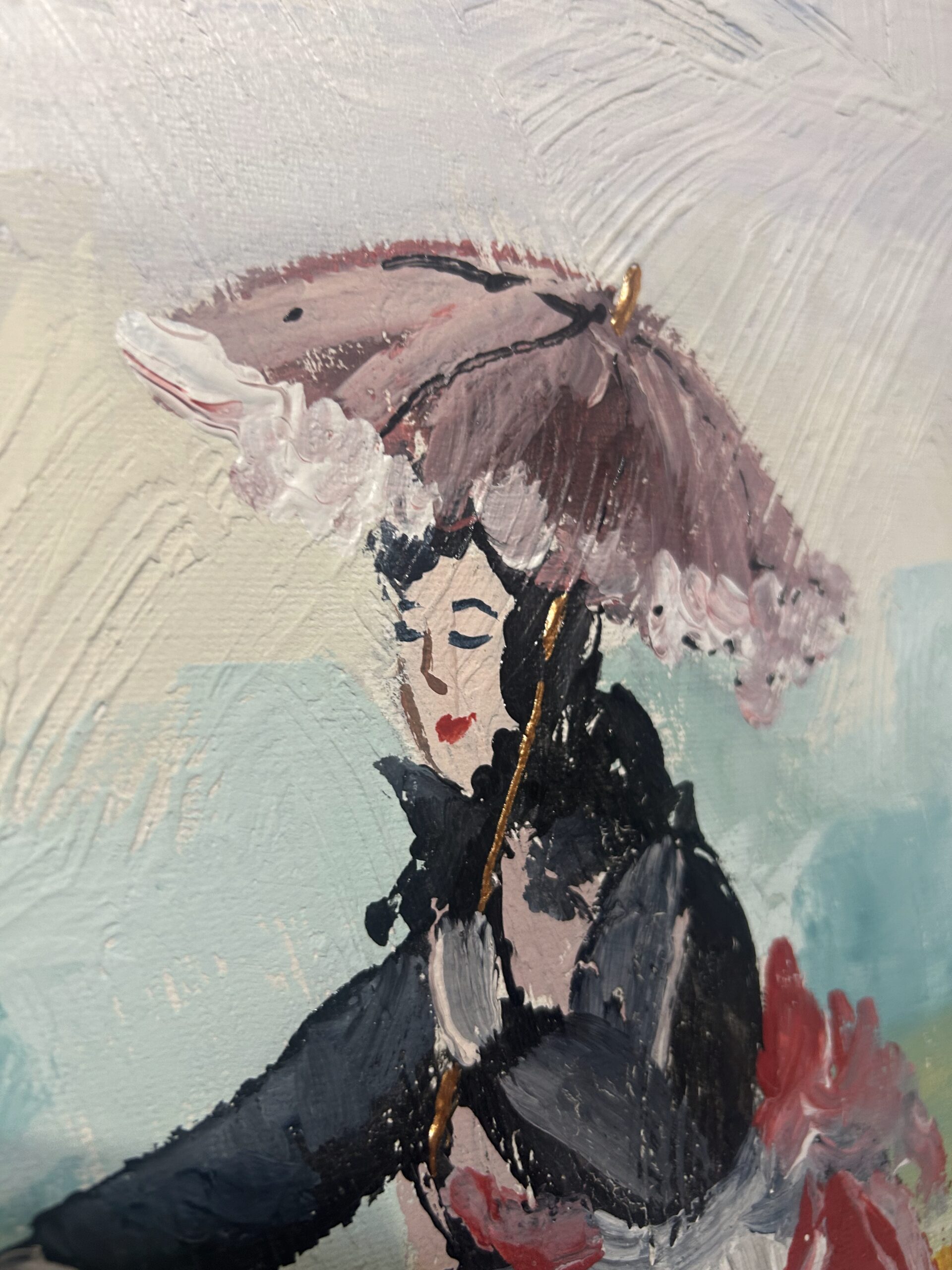 Elegancki obraz olejny na płótnie autorstwa P. Durrela, przedstawiający postać kobiety z parasolką, uchwyconą w subtelnej i wyrafinowanej kompozycji. Dzieło emanuje delikatnością i klasycznym urokiem, oddając charakterystyczny styl autora.