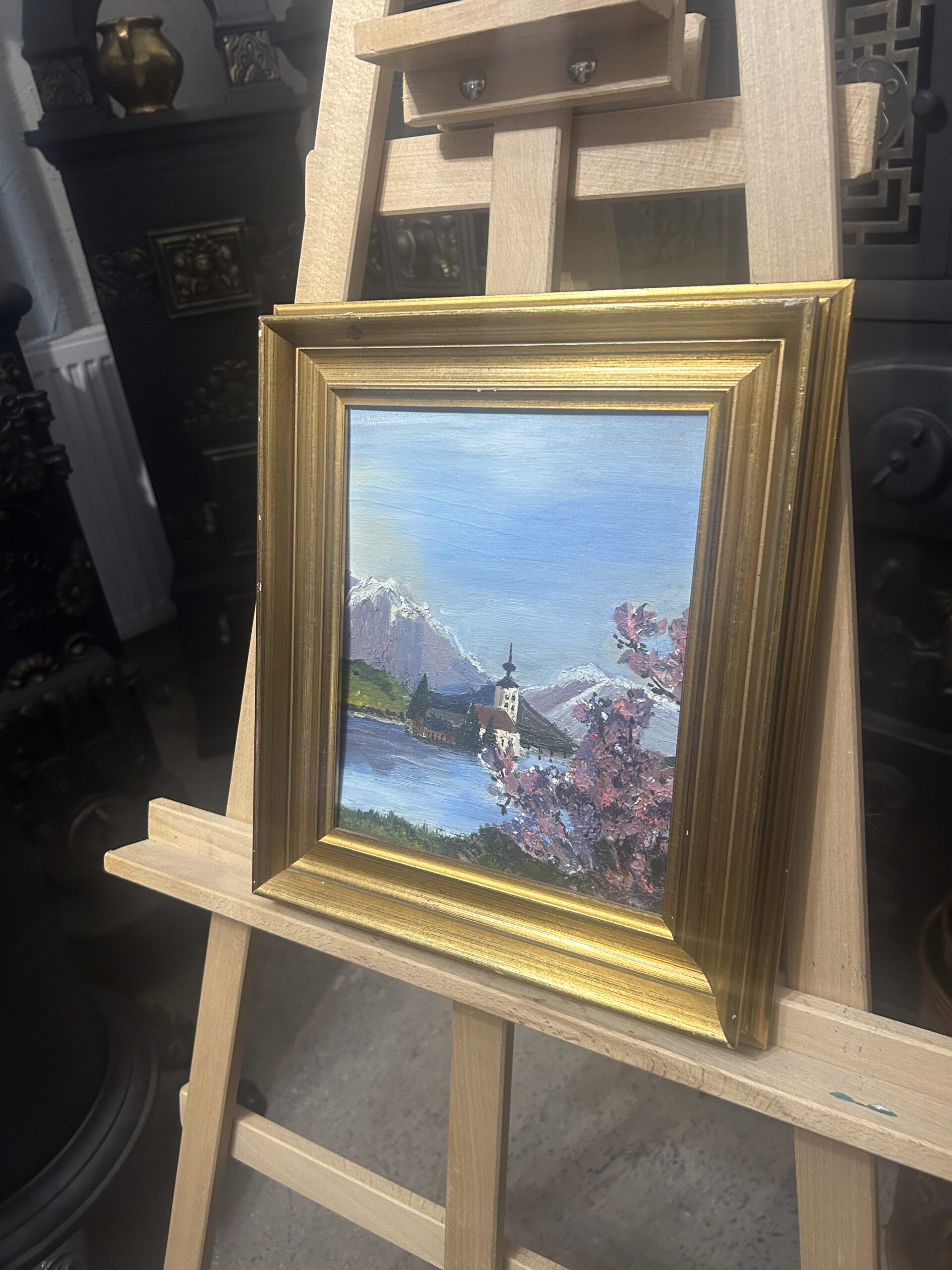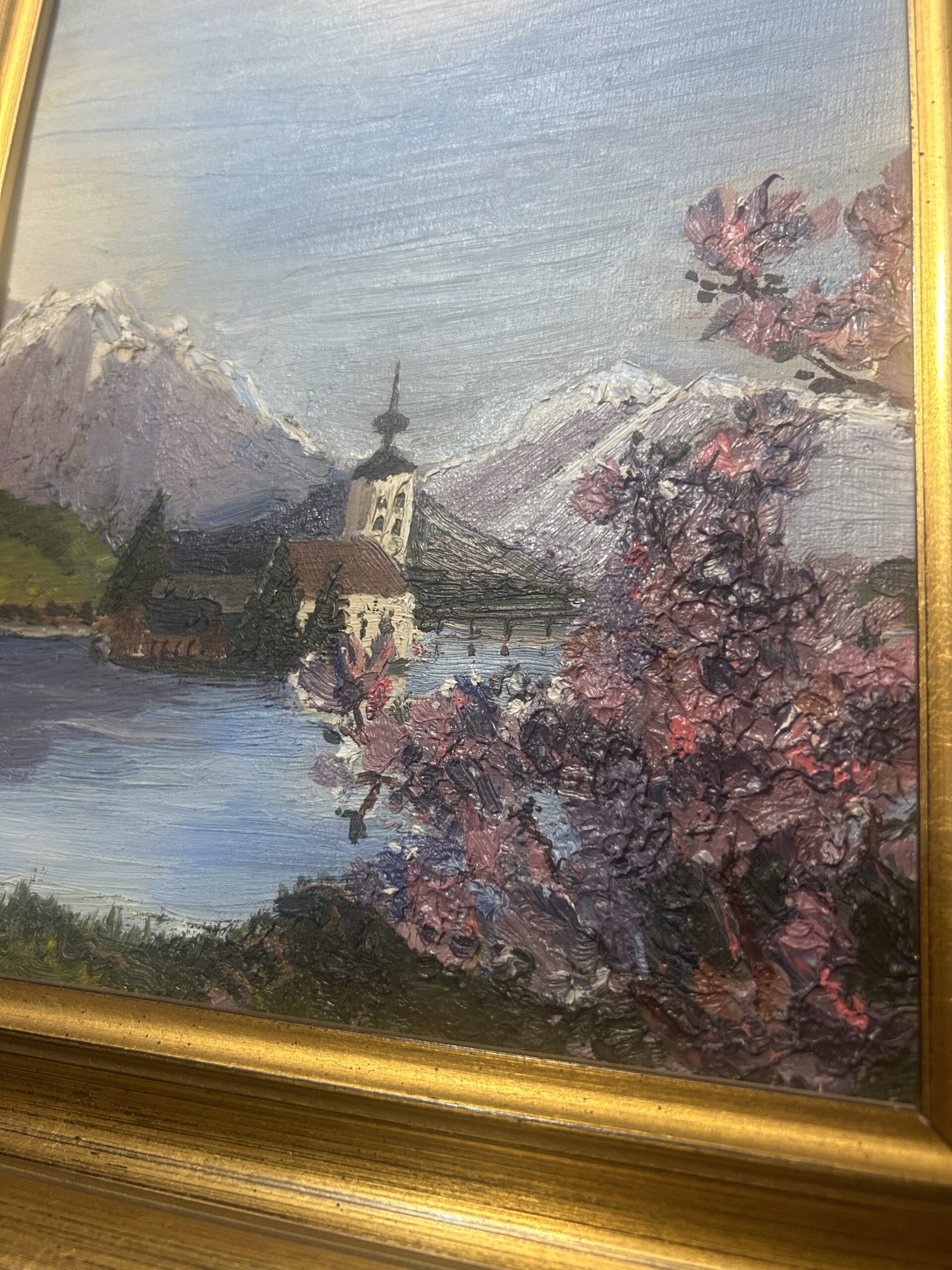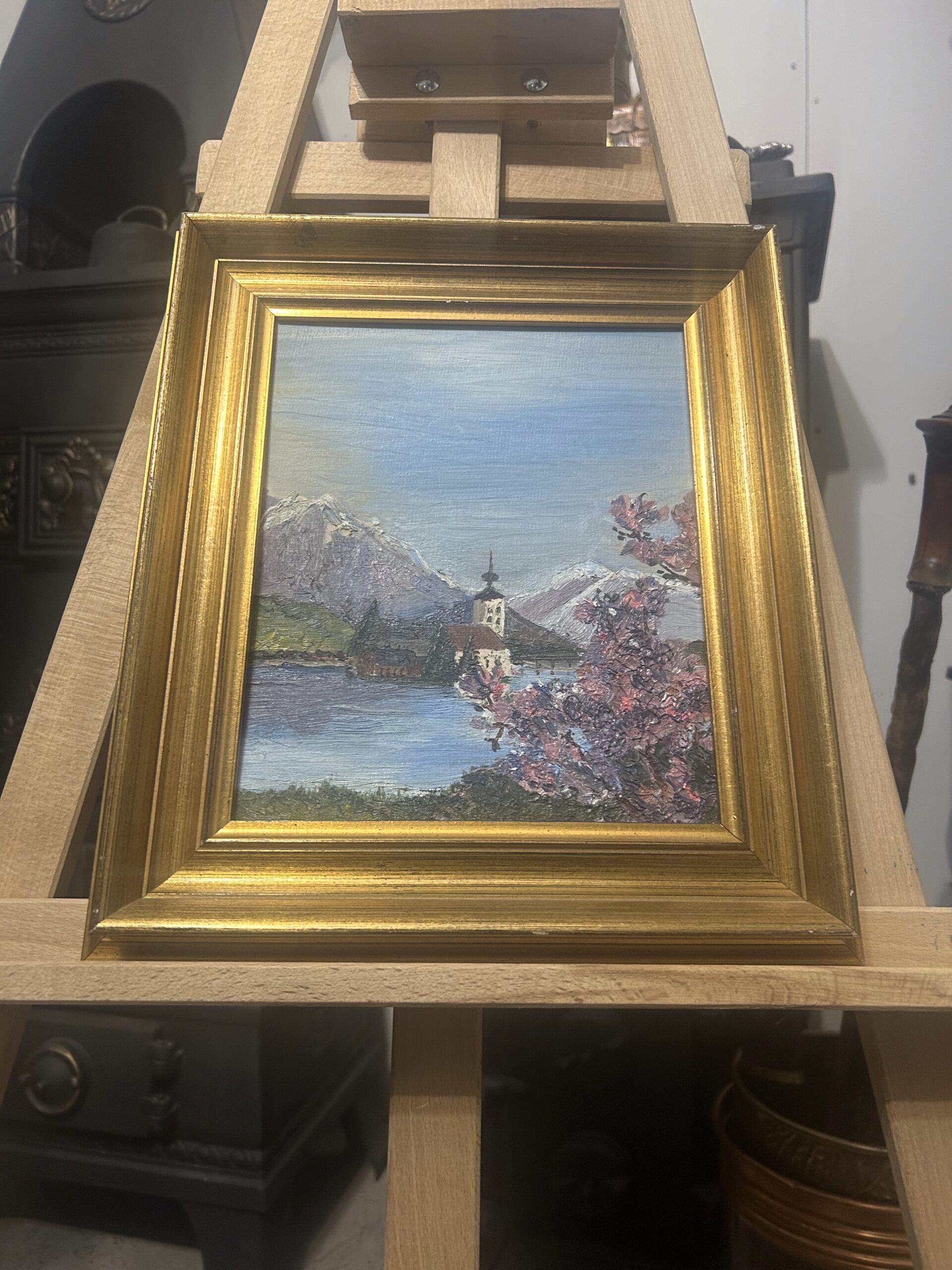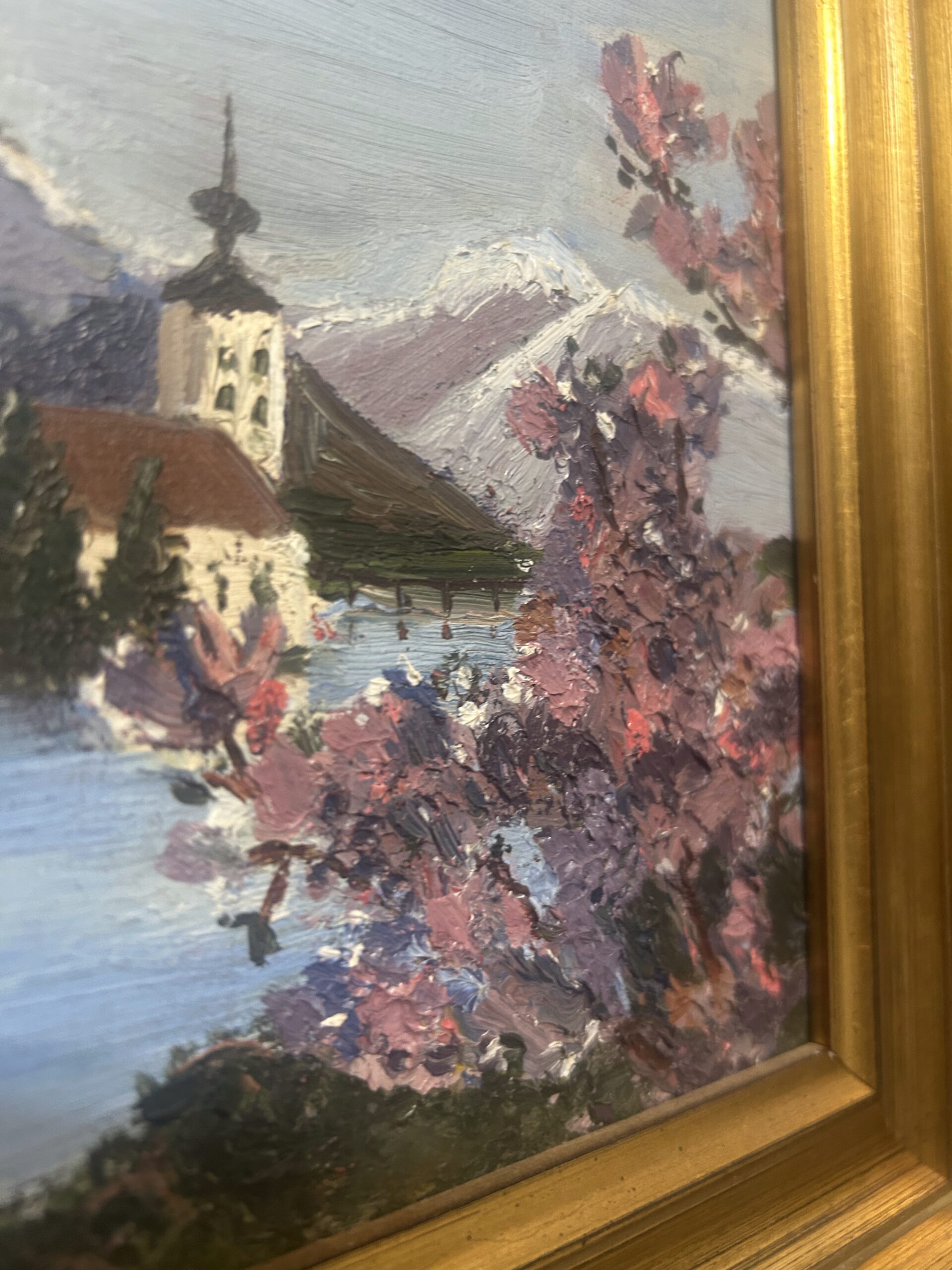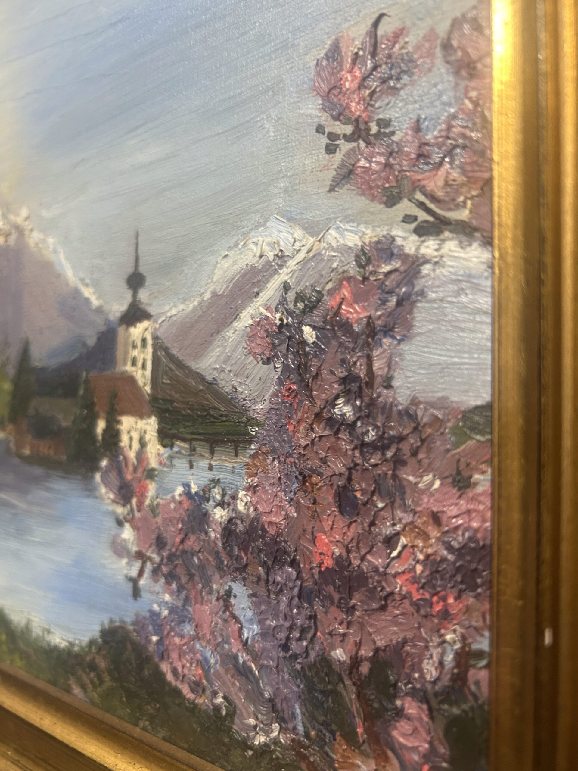 Nastrojowy obraz wykonany techniką oleju na desce, przedstawiający malowniczy kościół otoczony górską scenerią i spokojnym jeziorem. Wiosenne kolory kwitnących drzew wprowadzają do kompozycji harmonię i świeżość, podkreślając idylliczny charakter krajobrazu.