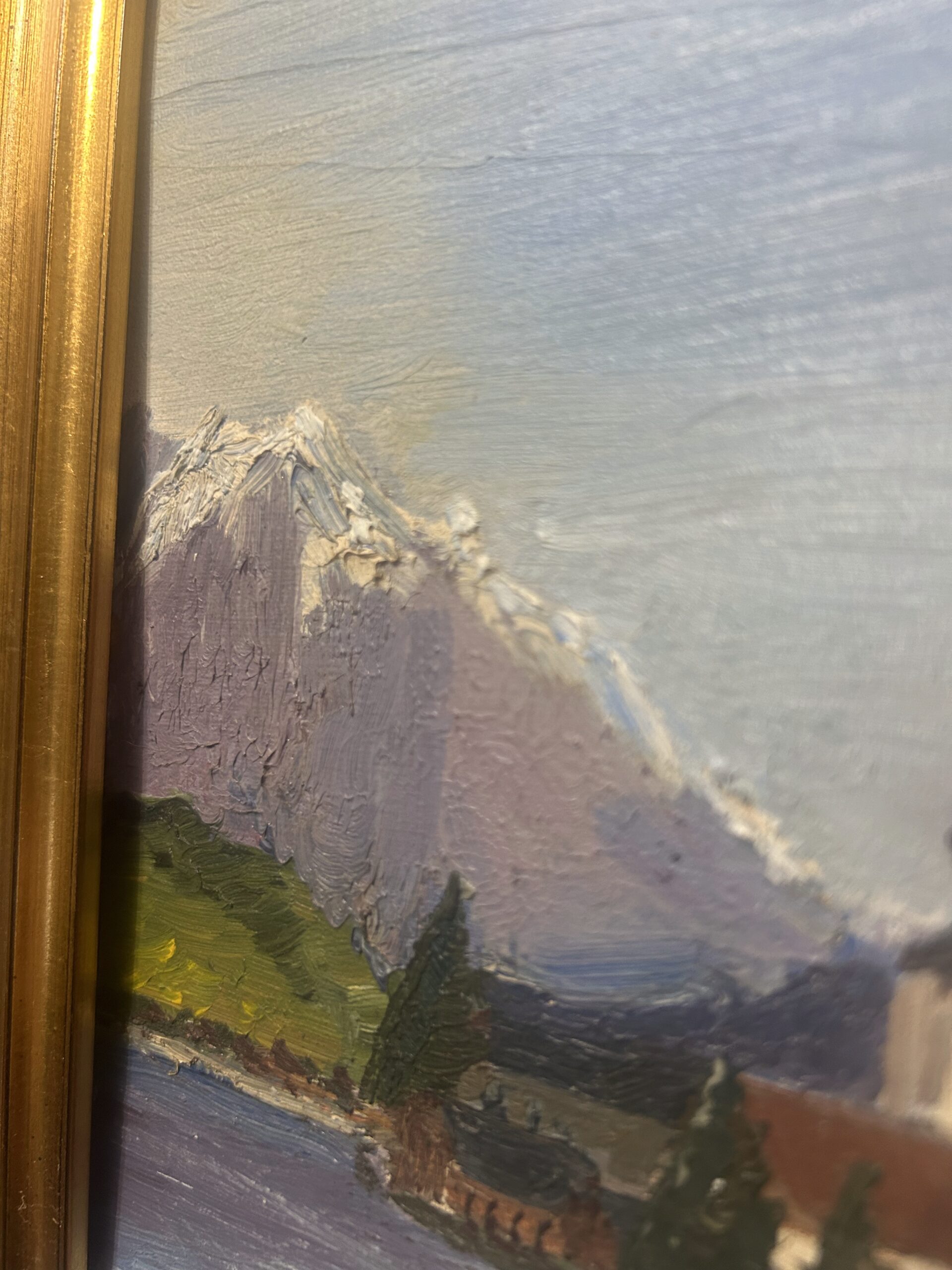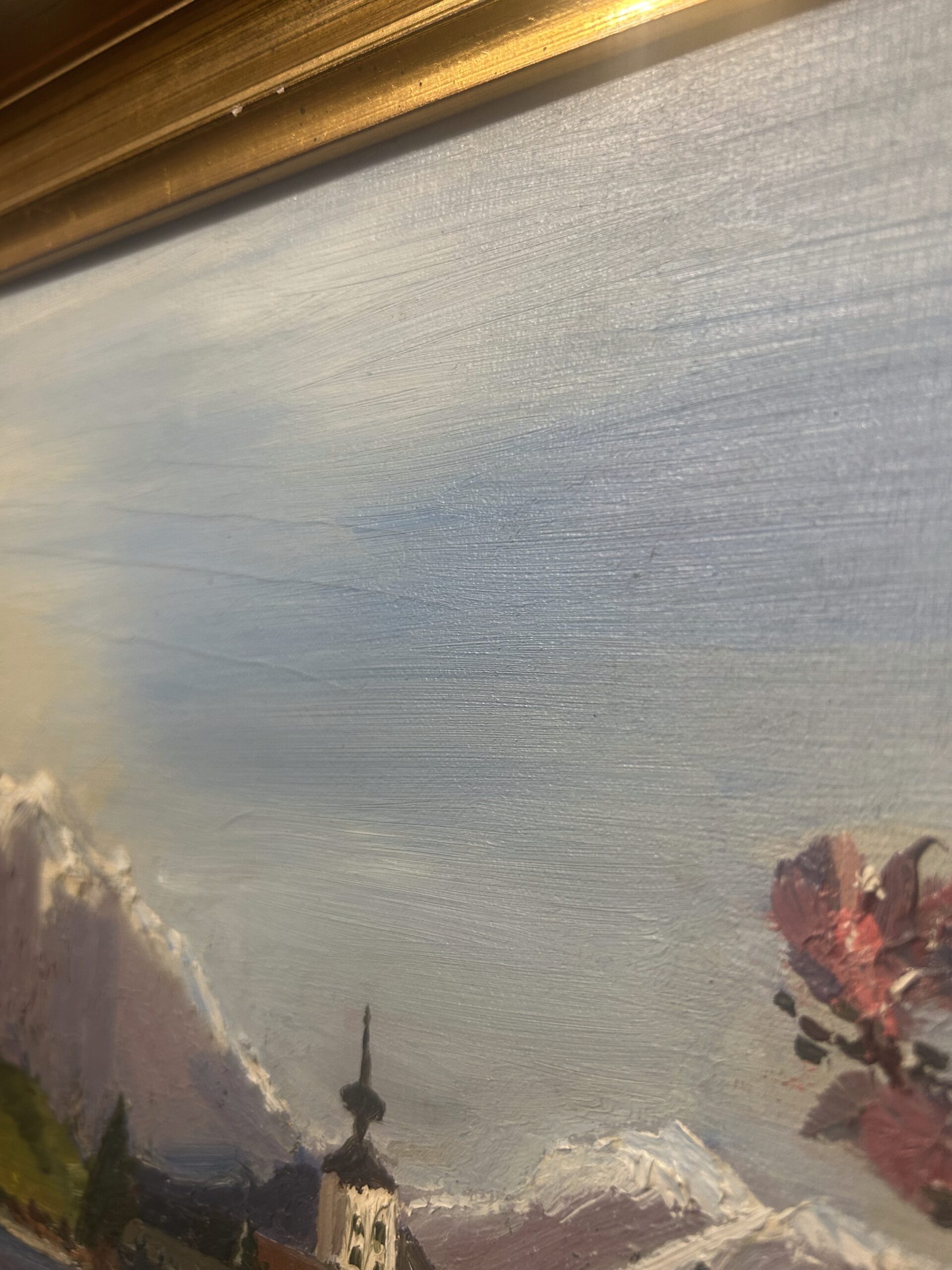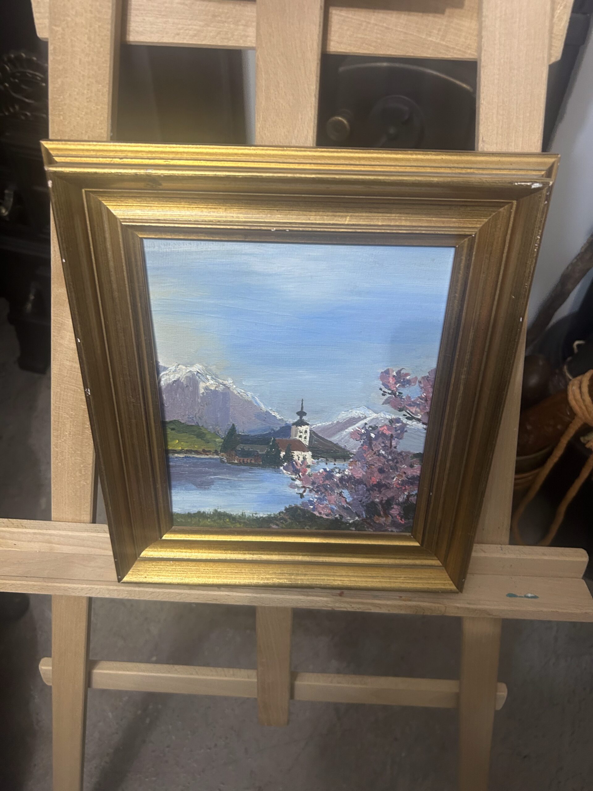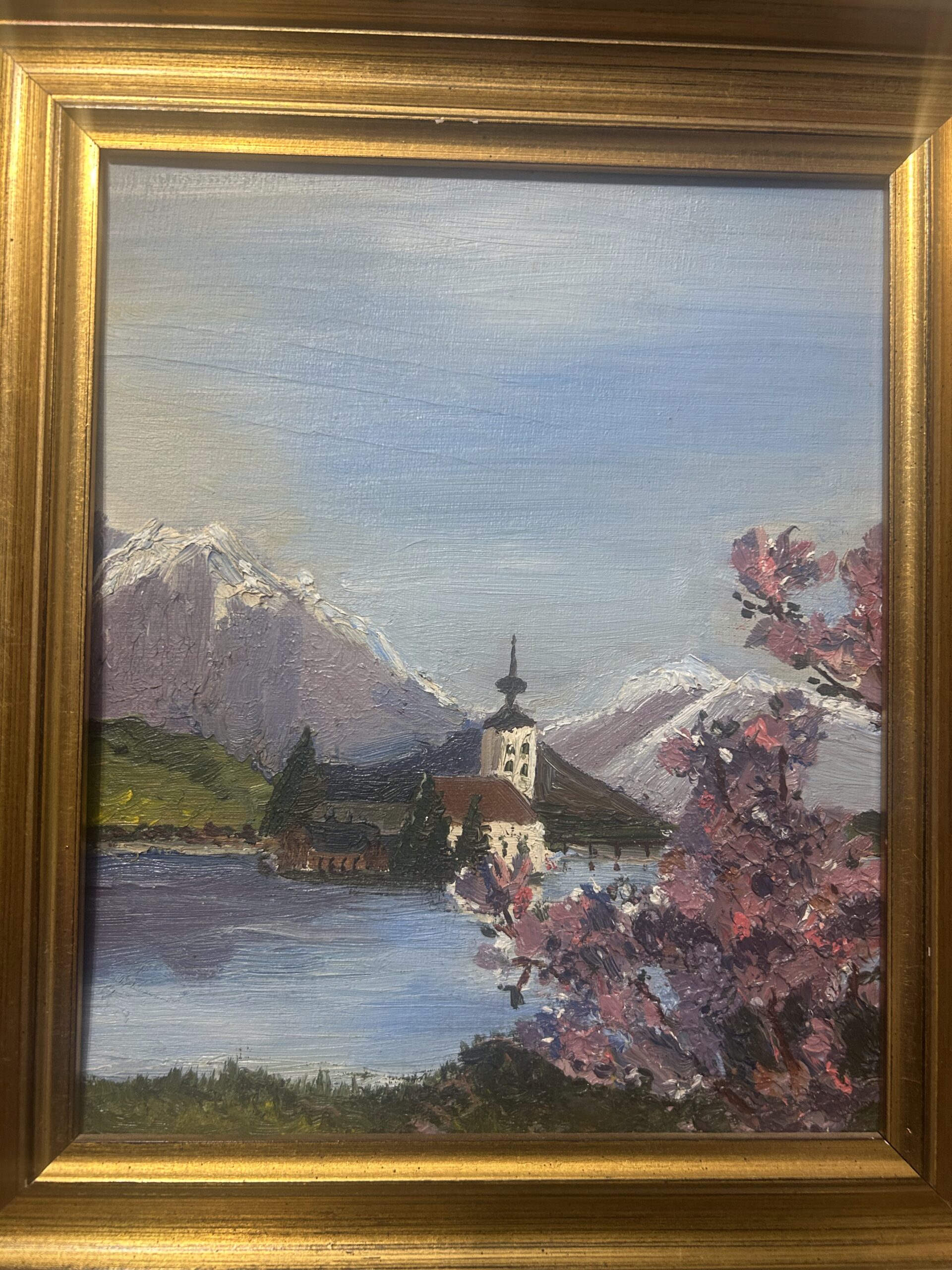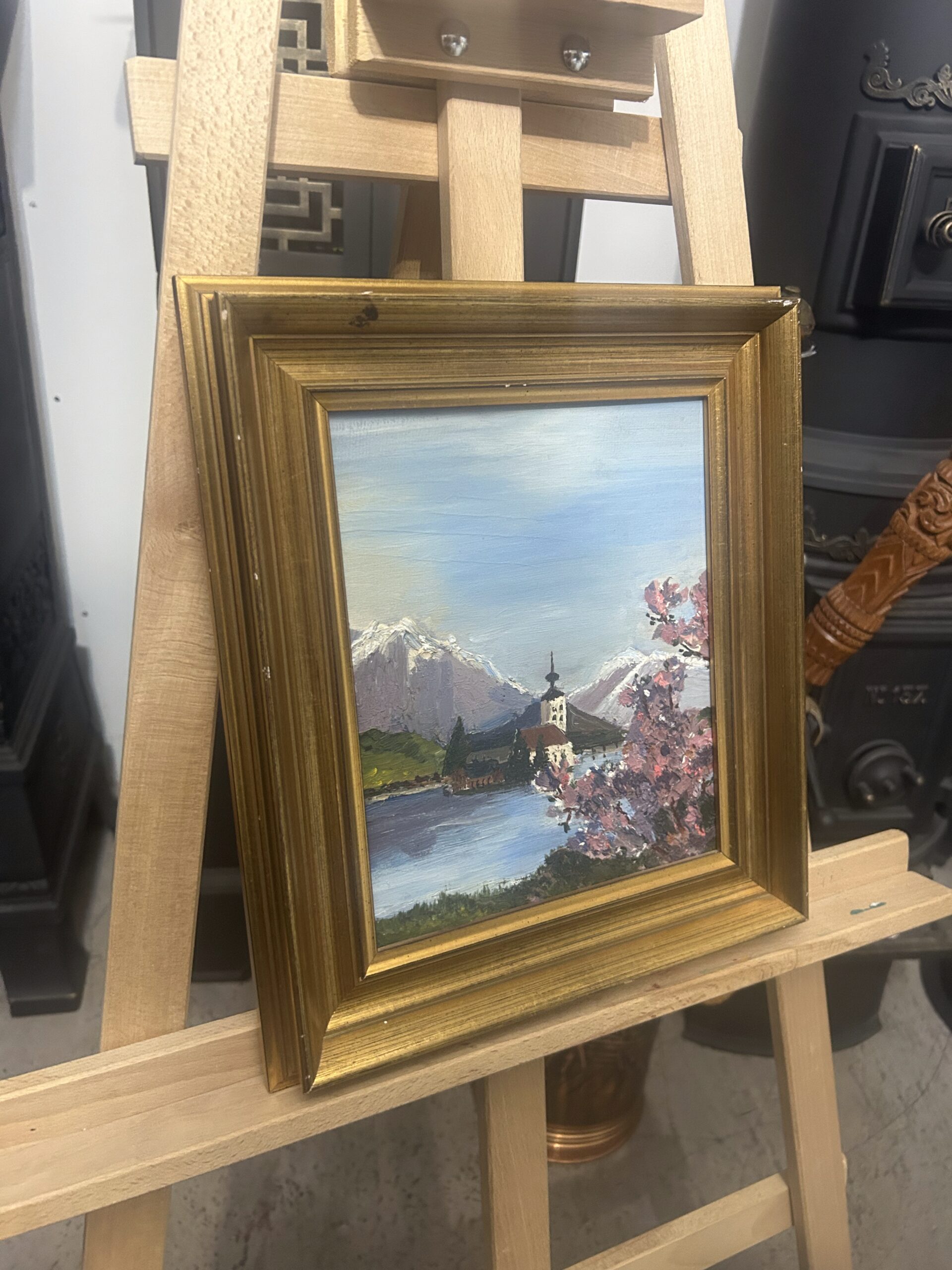 Nastrojowy obraz wykonany techniką oleju na desce, przedstawiający malowniczy kościół otoczony górską scenerią i spokojnym jeziorem. Wiosenne kolory kwitnących drzew wprowadzają do kompozycji harmonię i świeżość, podkreślając idylliczny charakter krajobrazu.