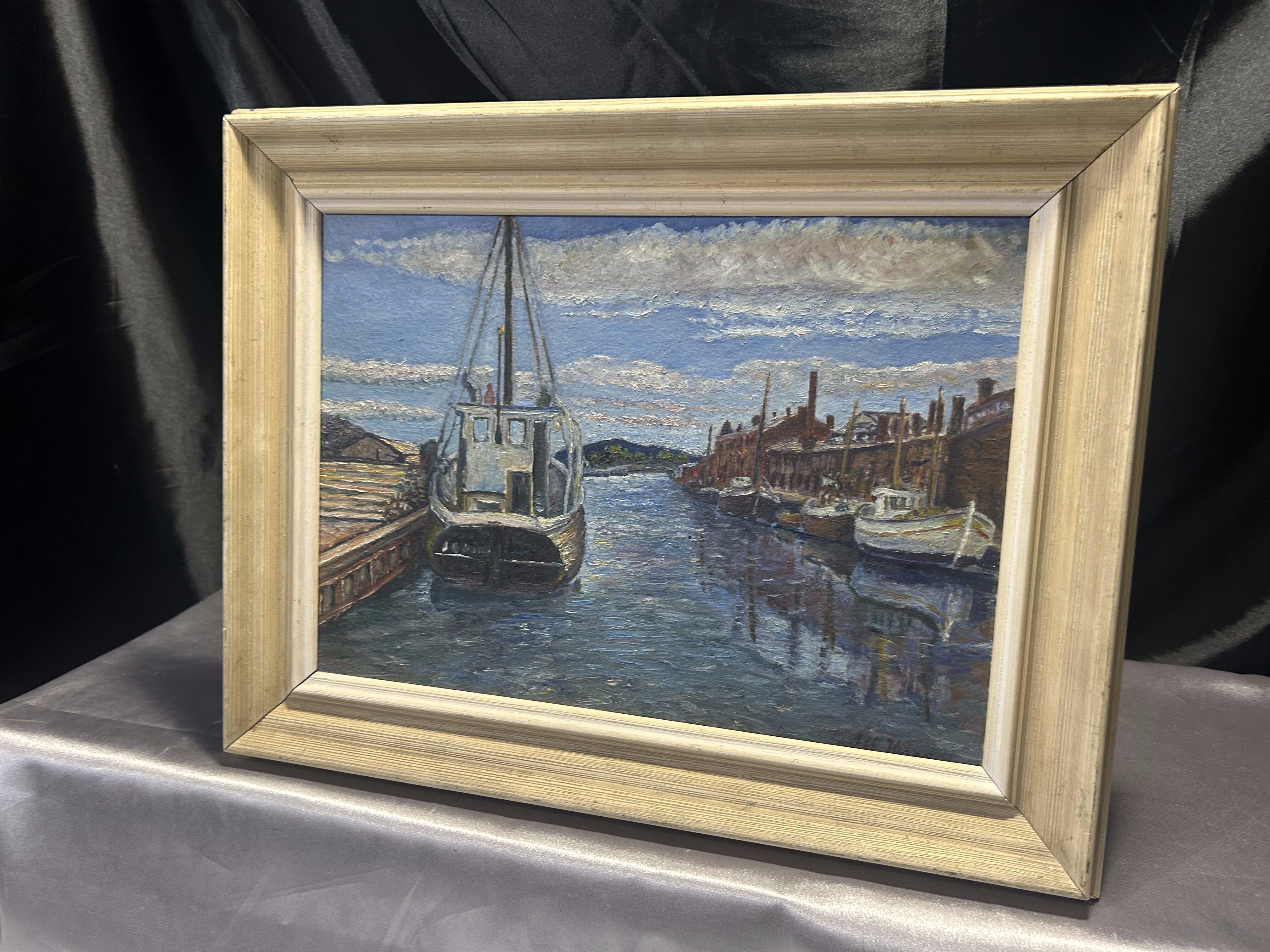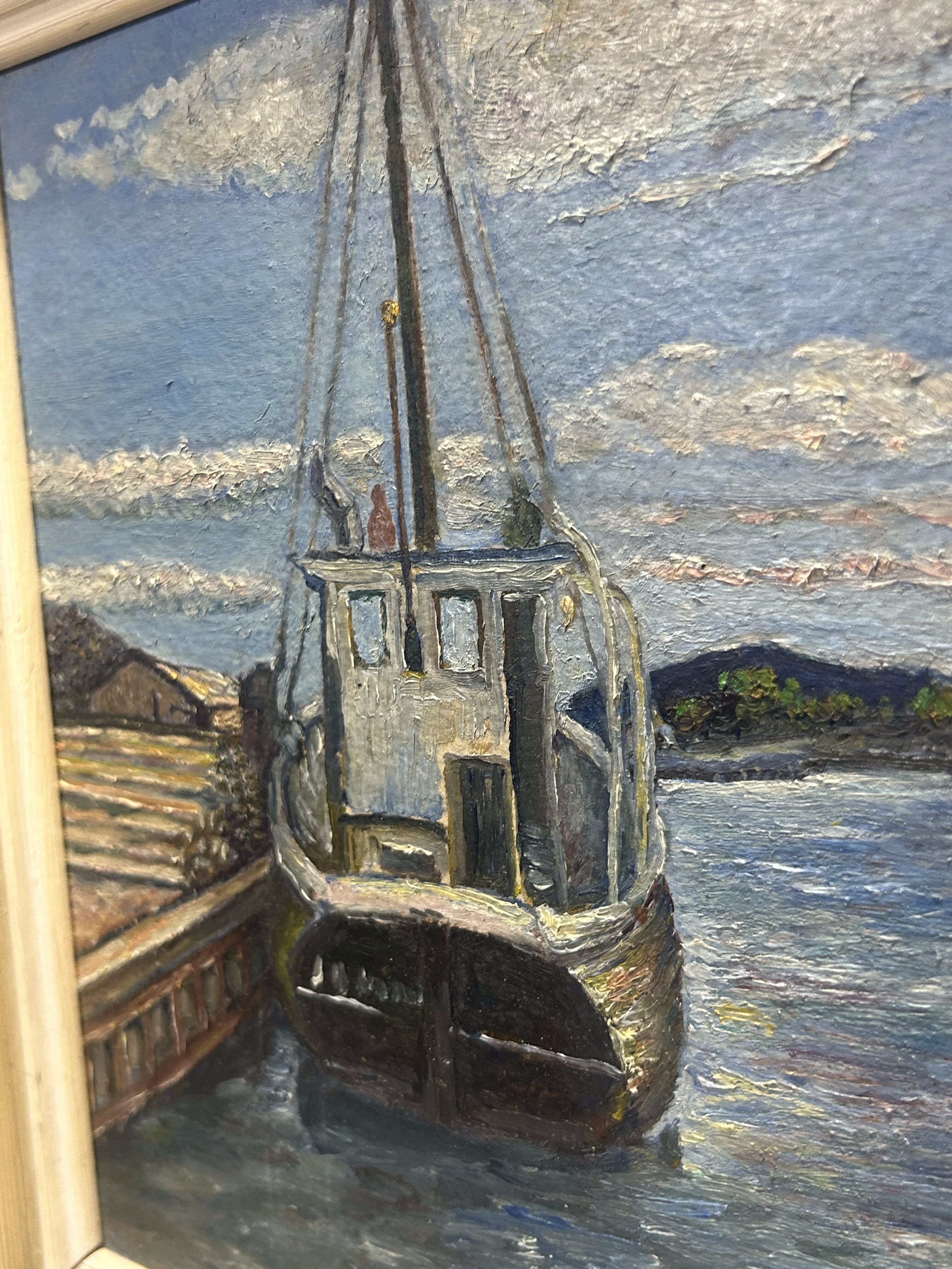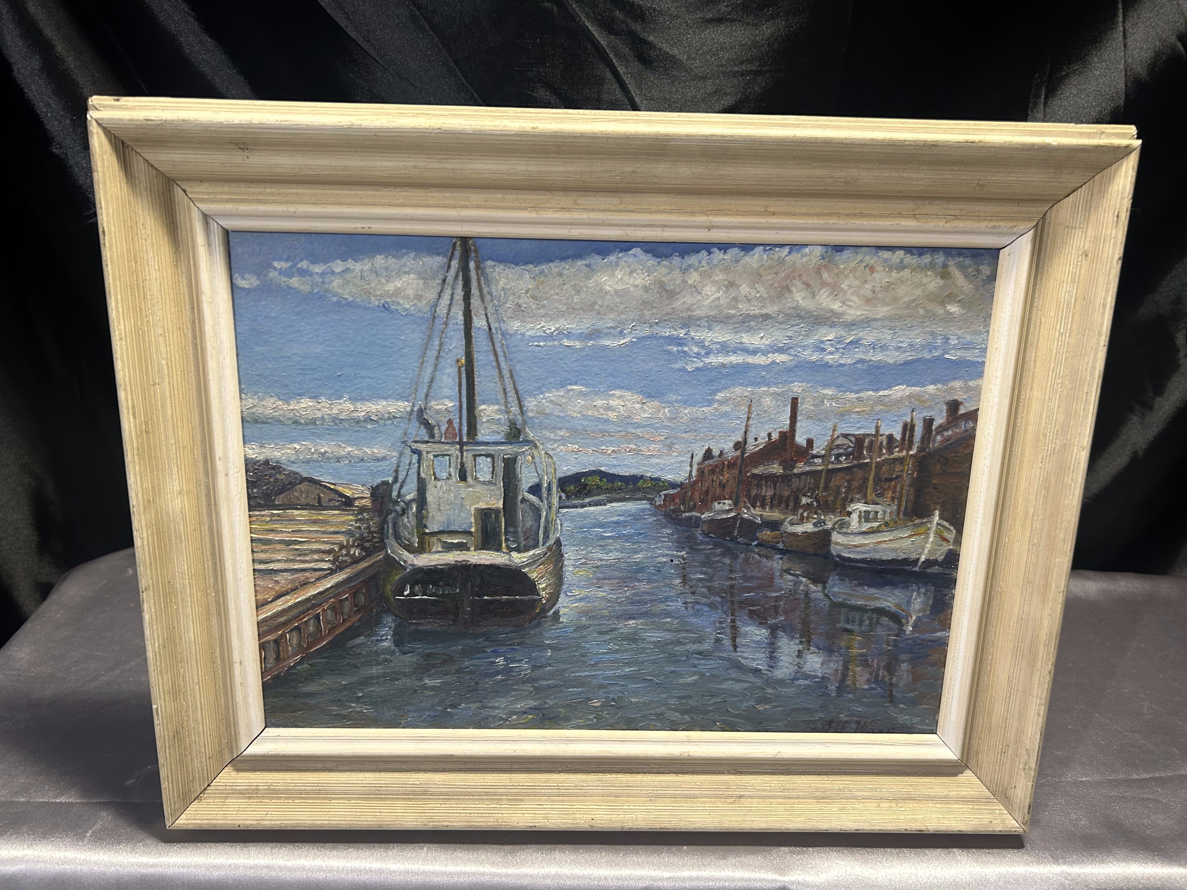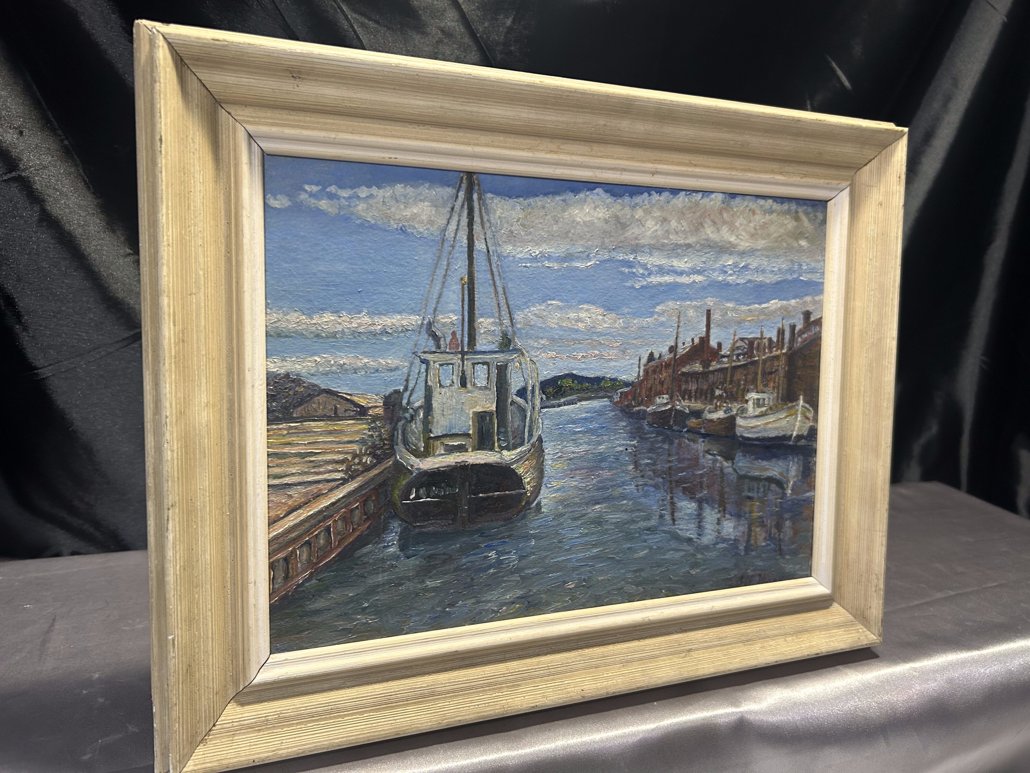 Nastrojowy obraz malowany farbami olejnymi na desce, przedstawiający zacumowaną łódź w spokojnym porcie. W tle widoczne są zabudowania i inne jednostki pływające, co nadaje kompozycji głębi i charakteru. Praca utrzymana w realistycznej stylistyce z pięknie oddanym światłem i odbiciami na wodzie. Całość oprawiona w stylową, drewnianą ramę w jasnym odcieniu.