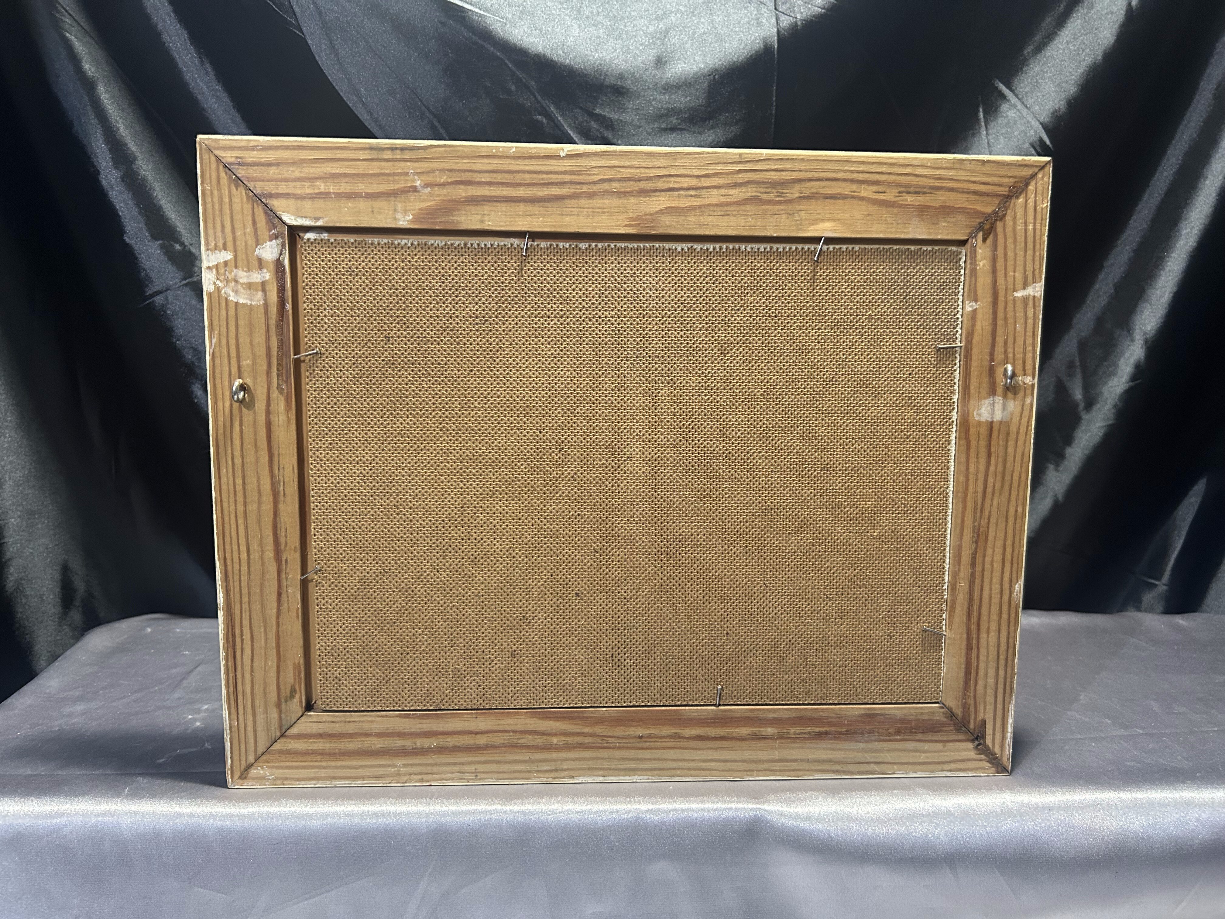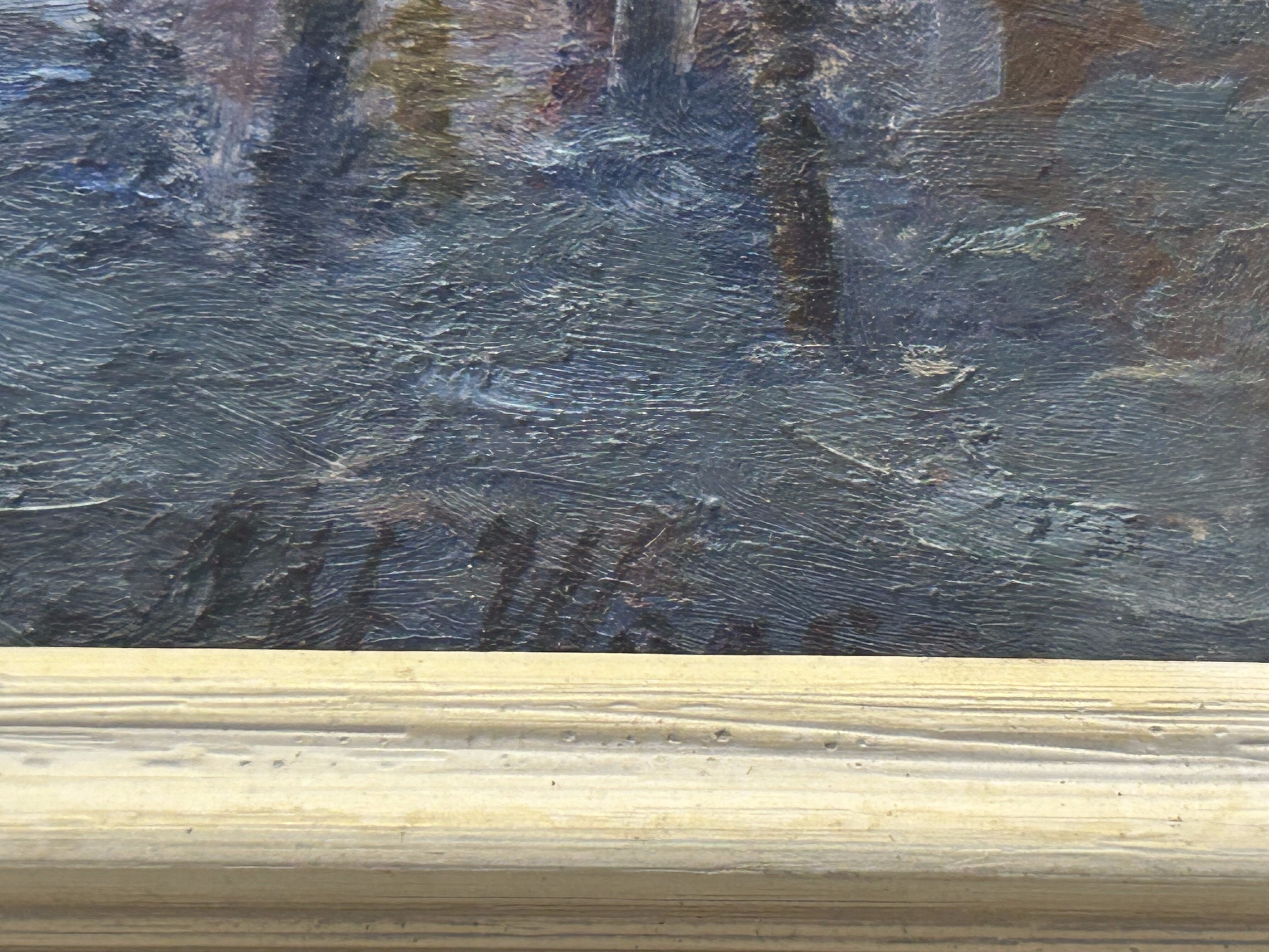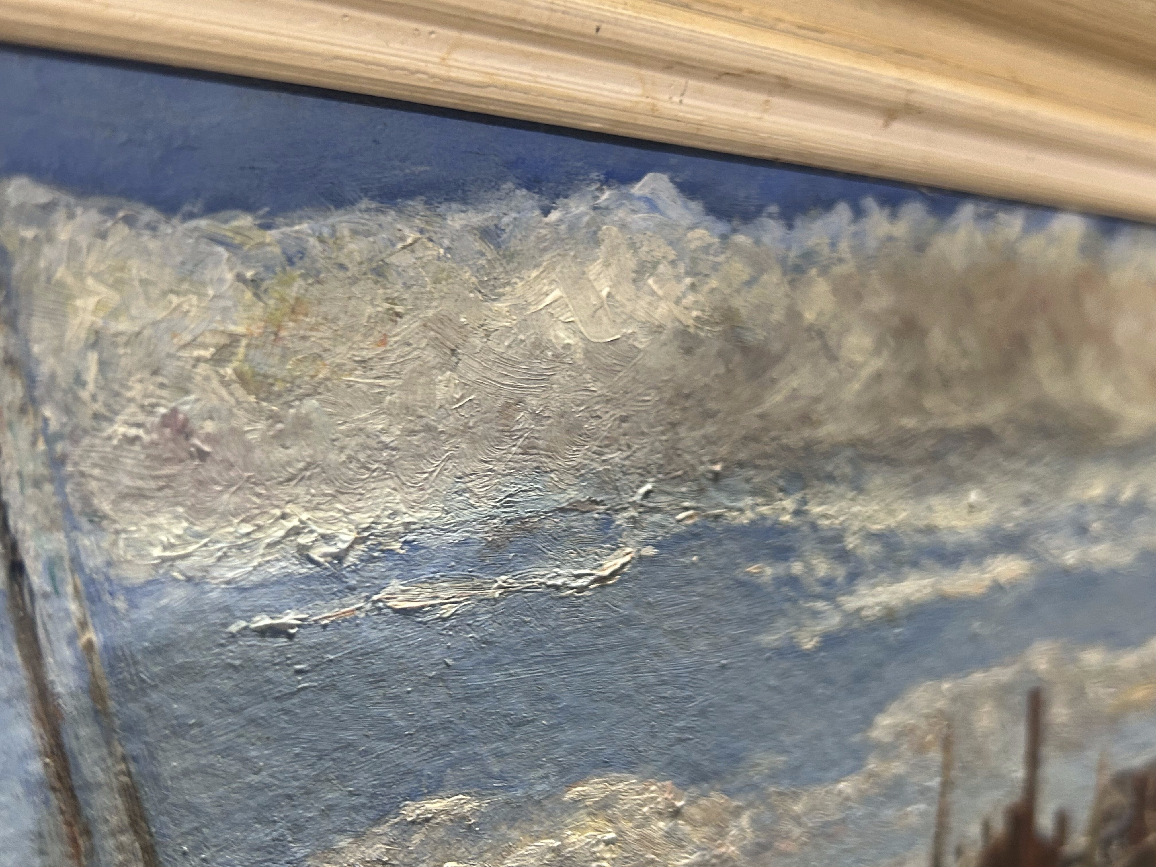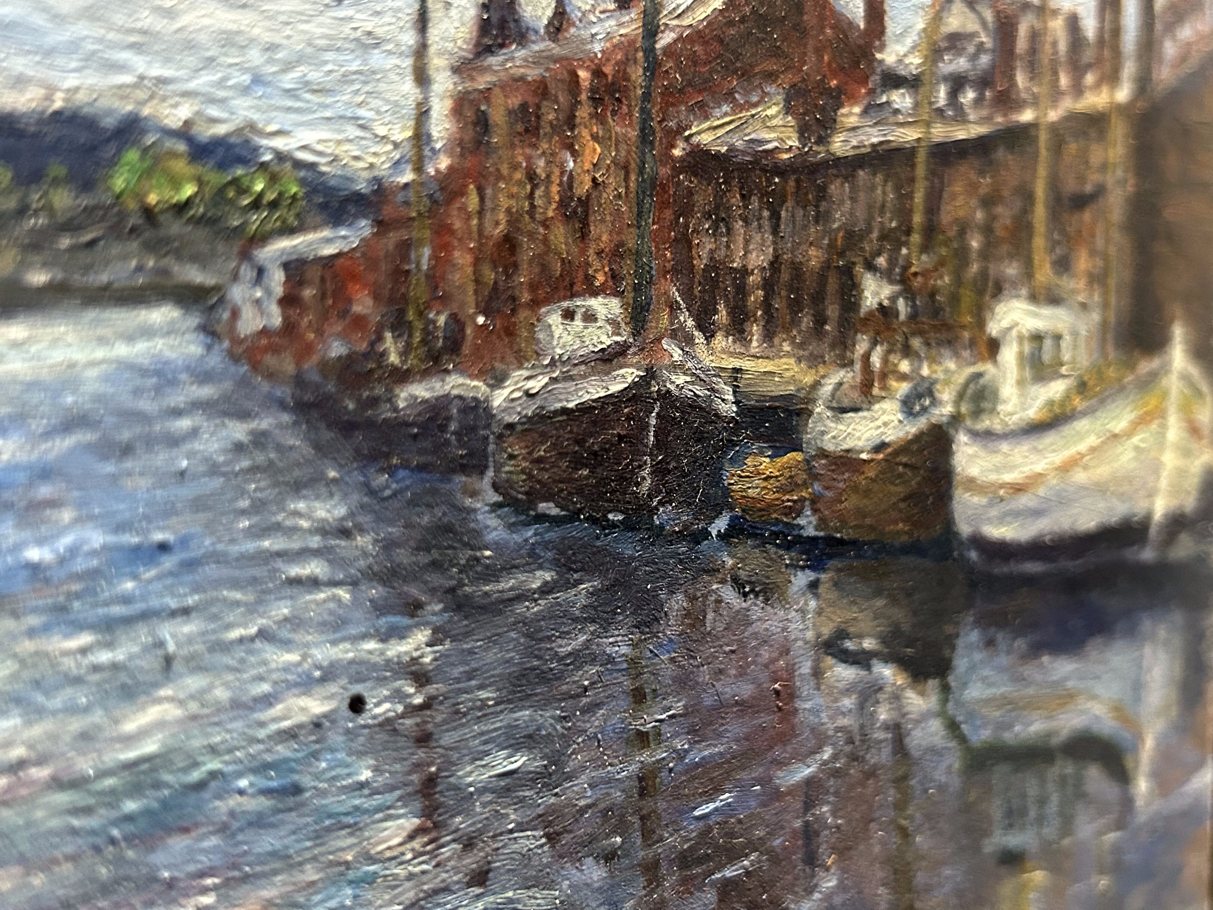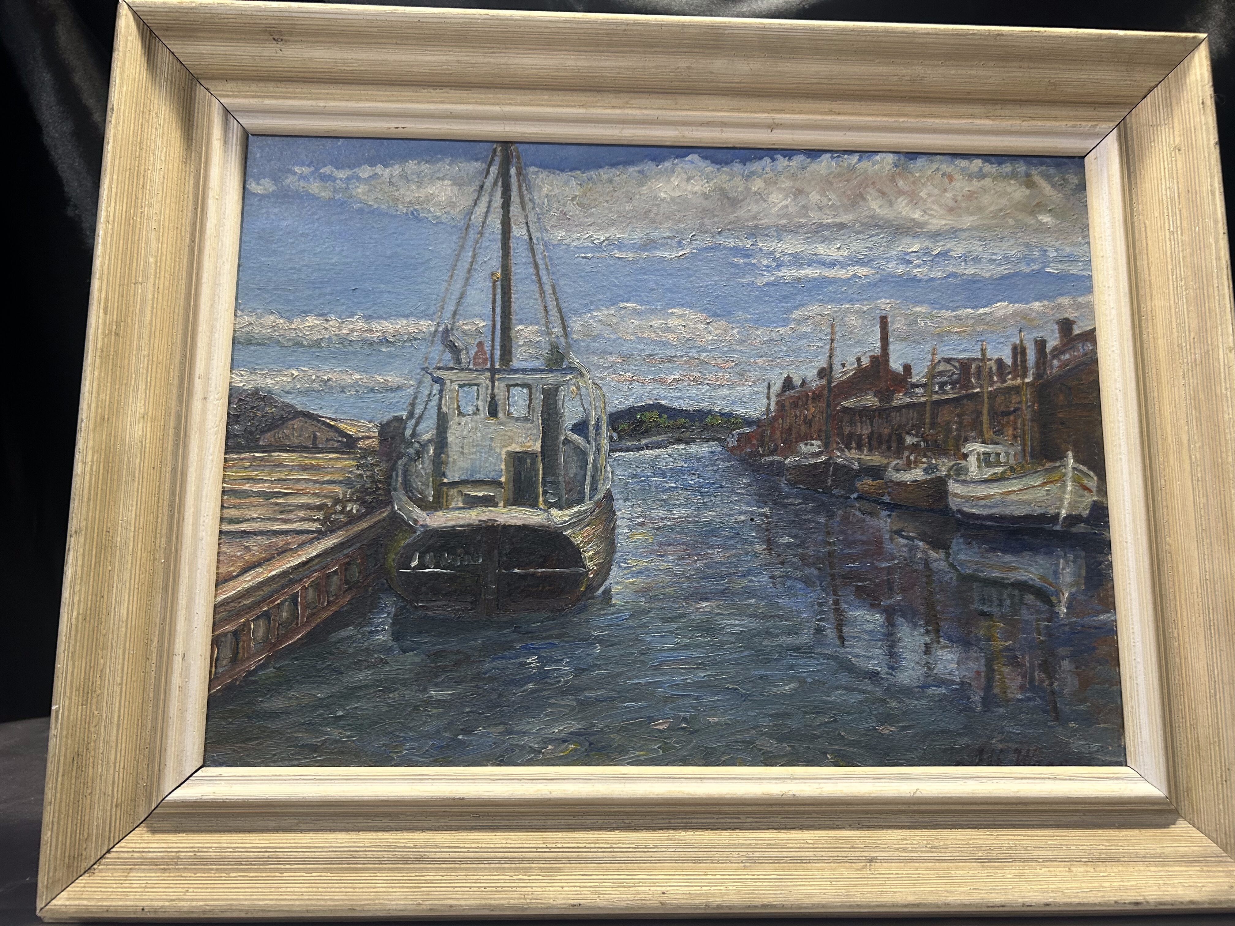 Nastrojowy obraz malowany farbami olejnymi na desce, przedstawiający zacumowaną łódź w spokojnym porcie. W tle widoczne są zabudowania i inne jednostki pływające, co nadaje kompozycji głębi i charakteru. Praca utrzymana w realistycznej stylistyce z pięknie oddanym światłem i odbiciami na wodzie. Całość oprawiona w stylową, drewnianą ramę w jasnym odcieniu.