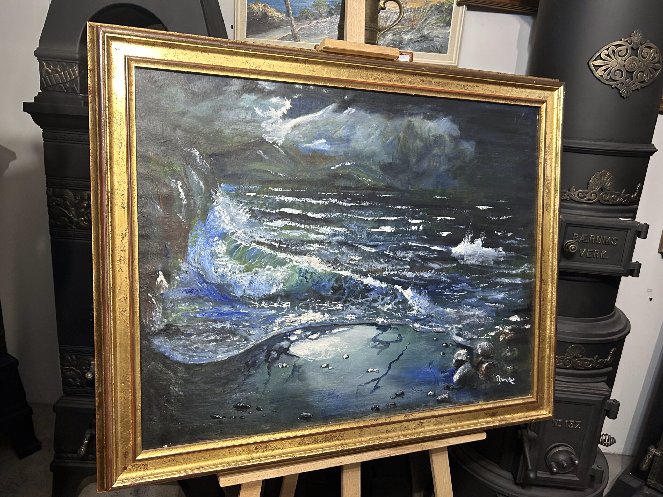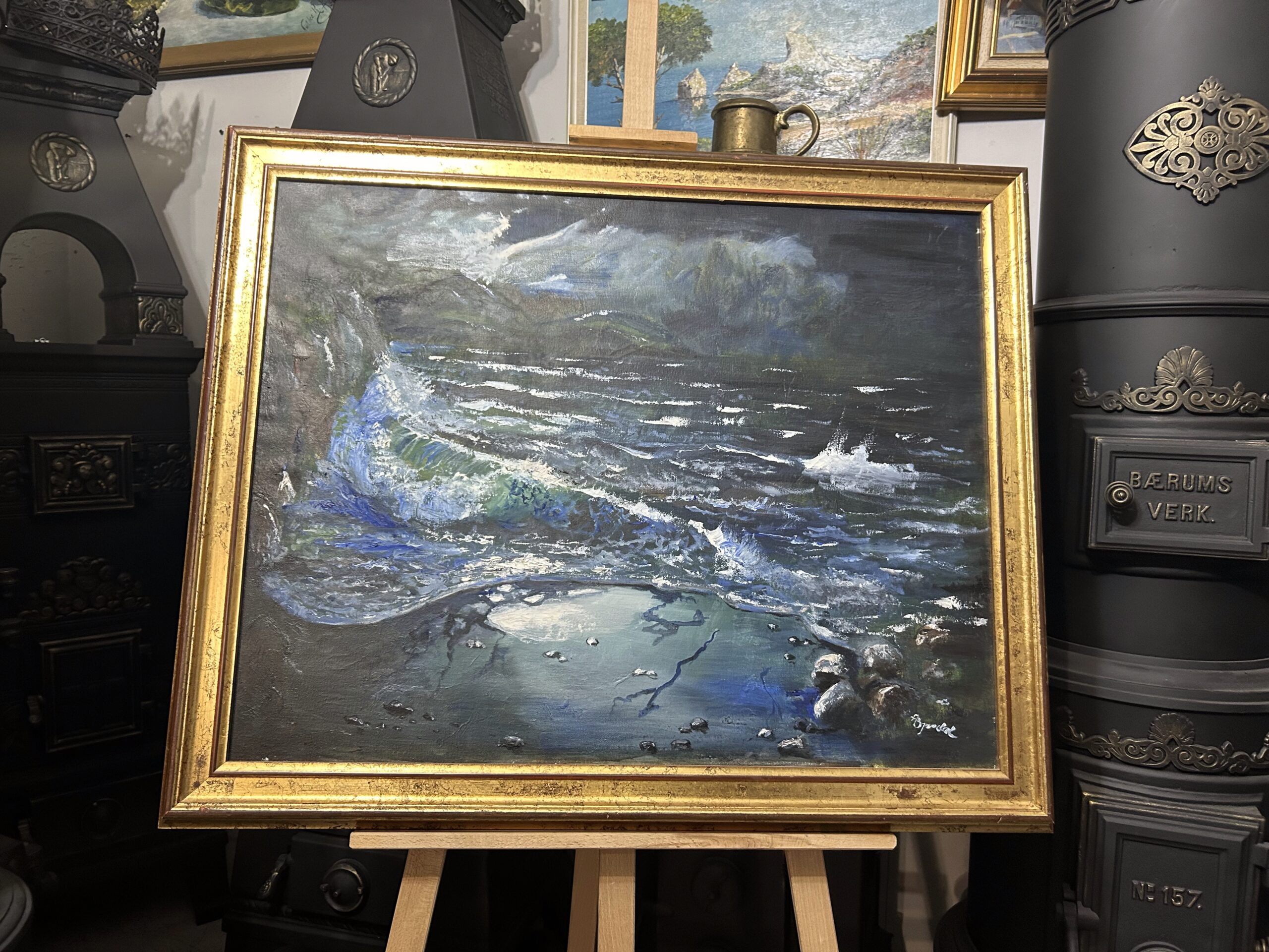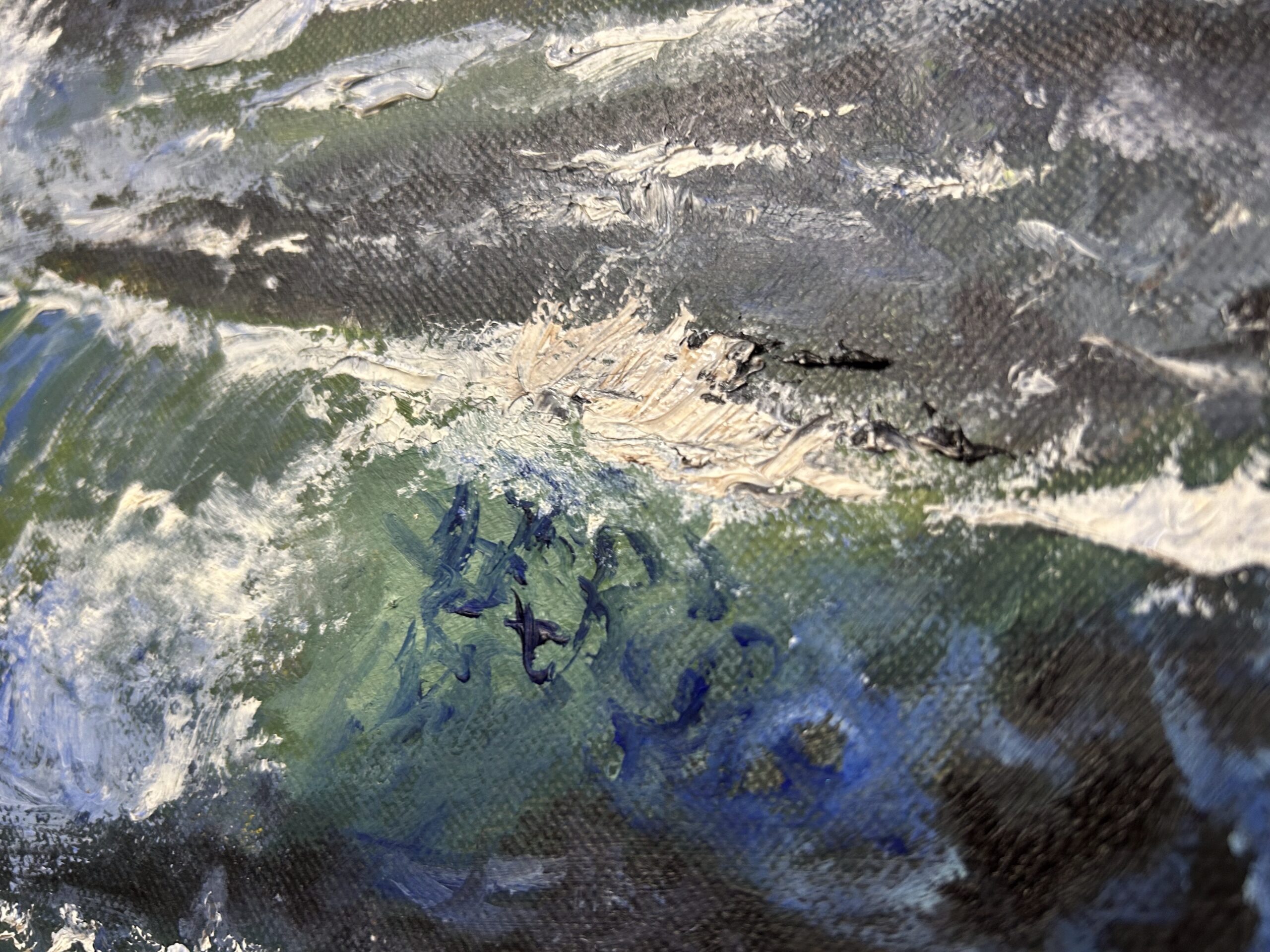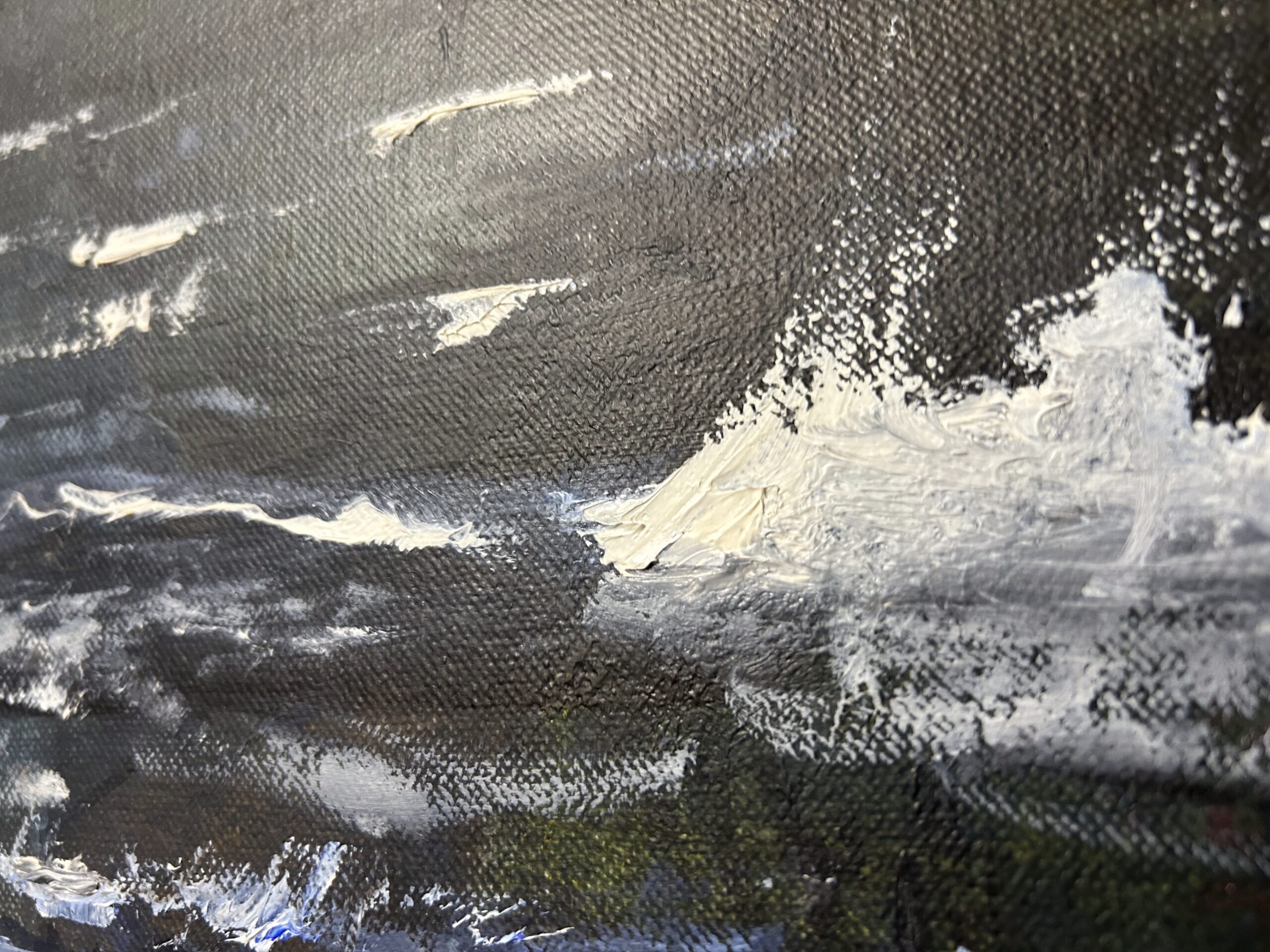 Nastrojowy obraz wykonany techniką oleju na płótnie, przedstawiający mroczną plażę. Ciemne, stonowane barwy nadają scenie tajemniczości i głębi, oddając surowy charakter przyrody i wyciszoną atmosferę nadmorskiego krajobrazu. Kompozycja emanuje spokojem i melancholią, tworząc wyjątkowy klimat.