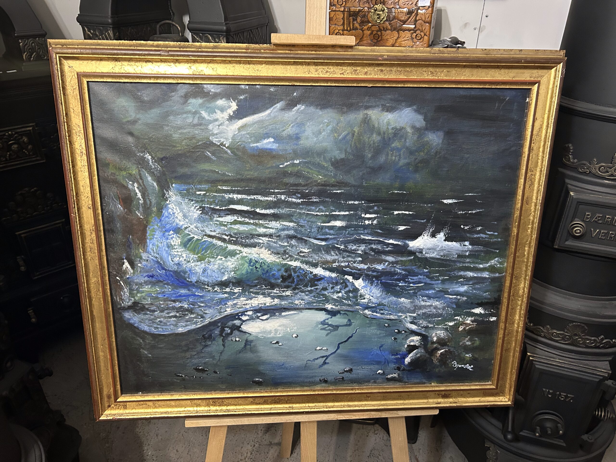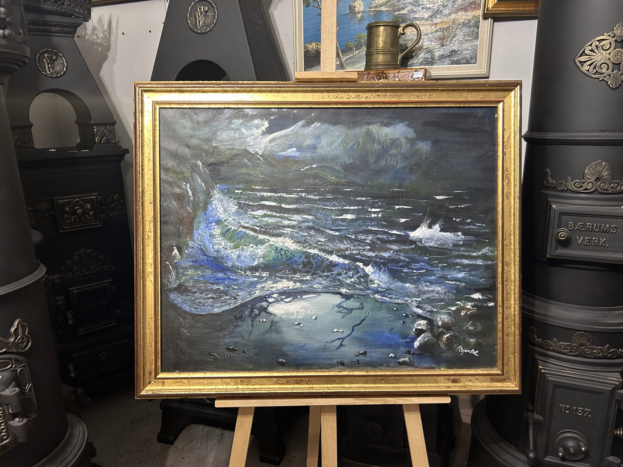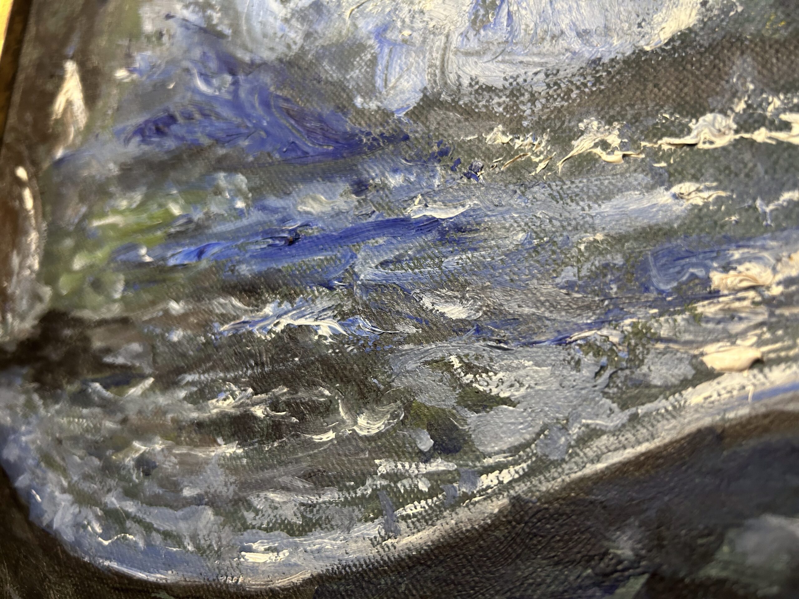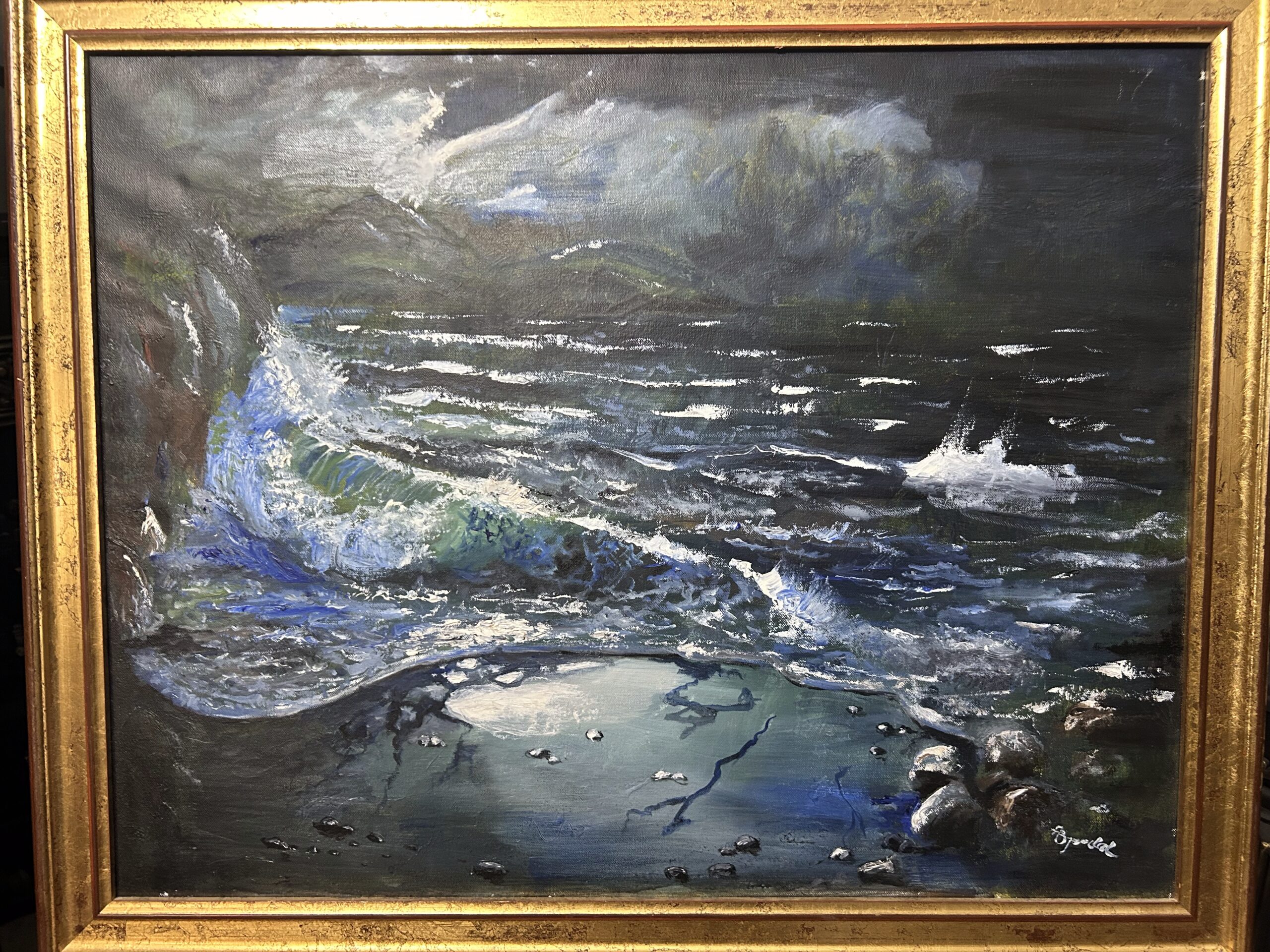 Nastrojowy obraz wykonany techniką oleju na płótnie, przedstawiający mroczną plażę. Ciemne, stonowane barwy nadają scenie tajemniczości i głębi, oddając surowy charakter przyrody i wyciszoną atmosferę nadmorskiego krajobrazu. Kompozycja emanuje spokojem i melancholią, tworząc wyjątkowy klimat.
