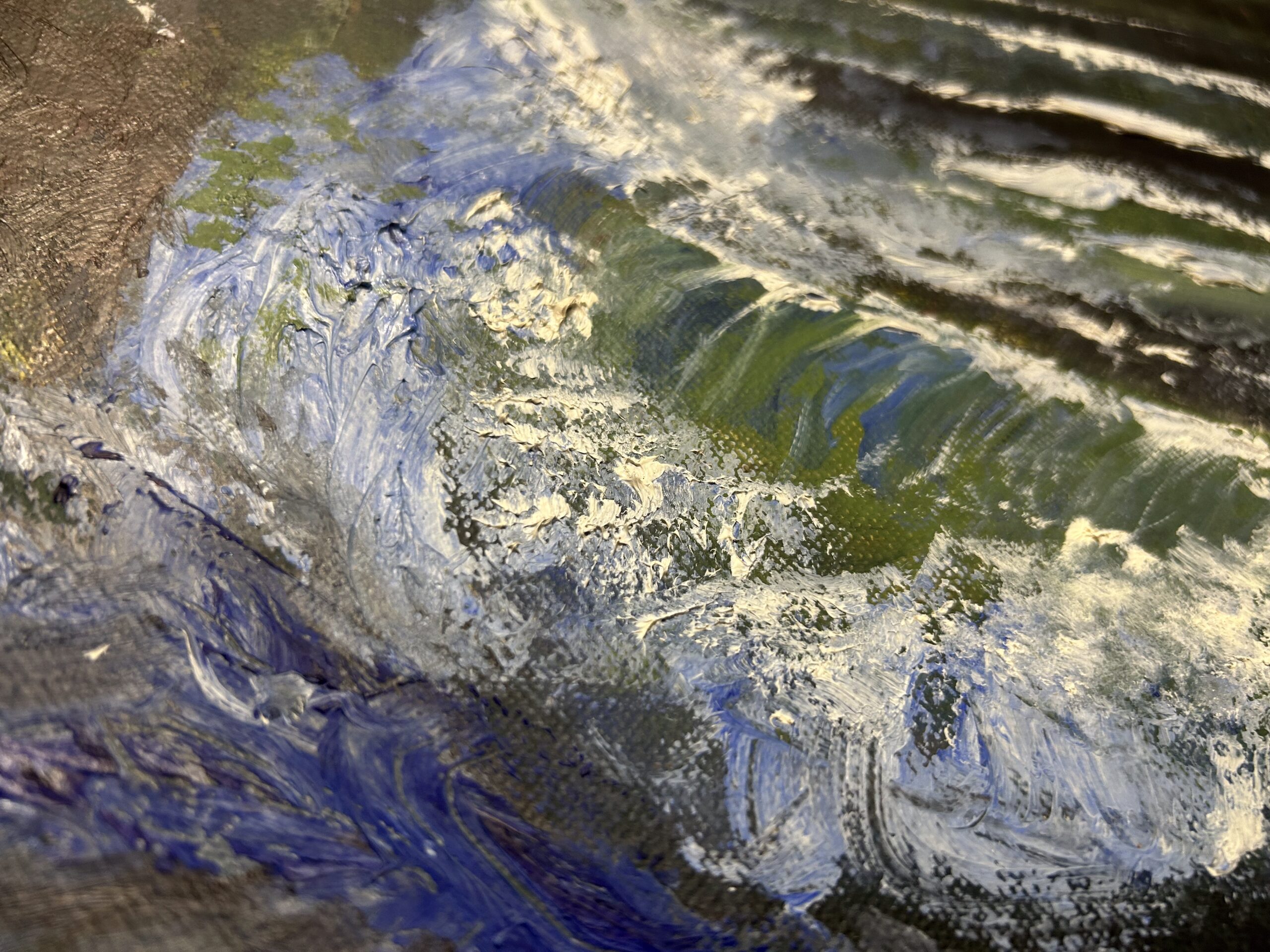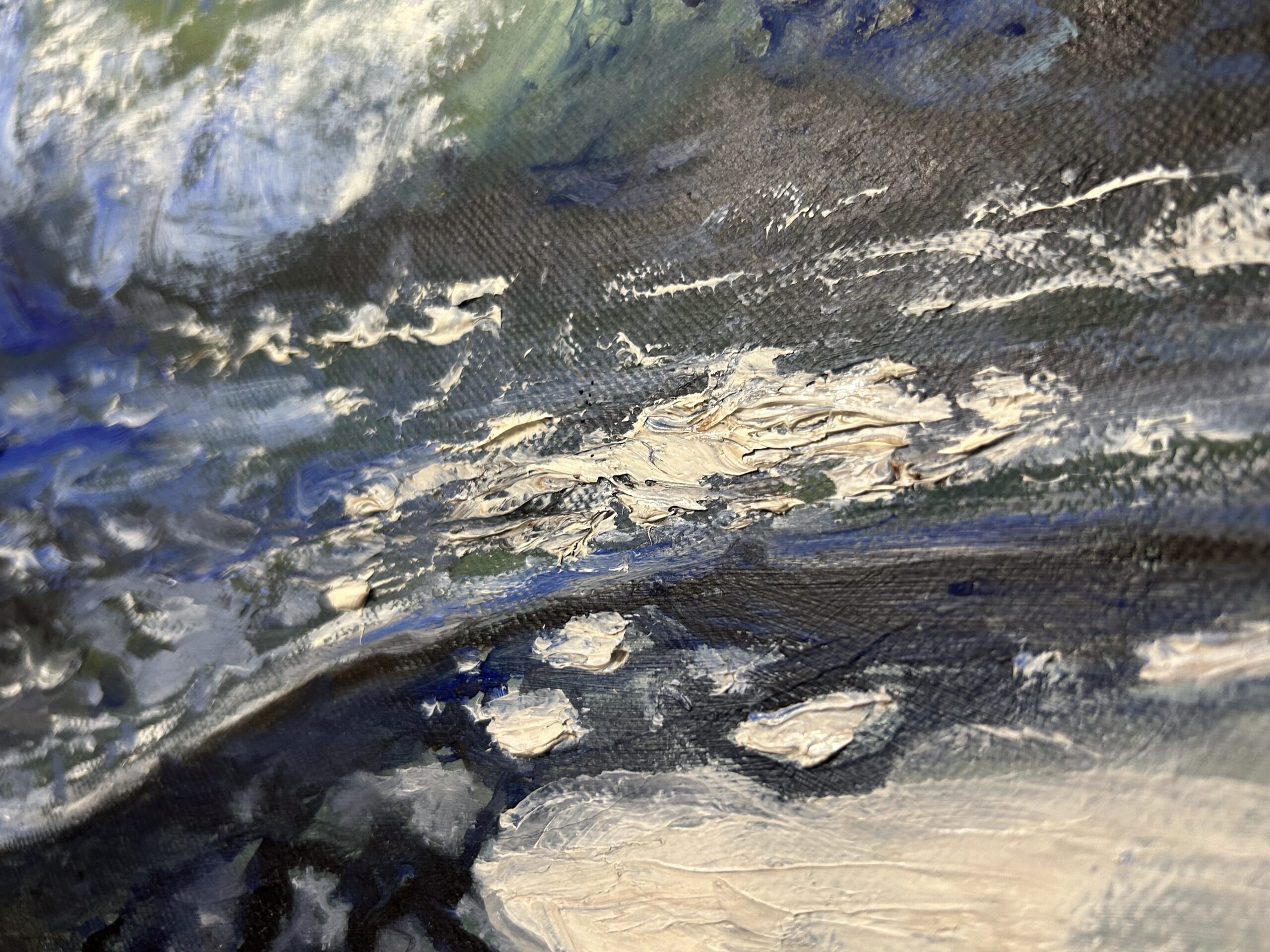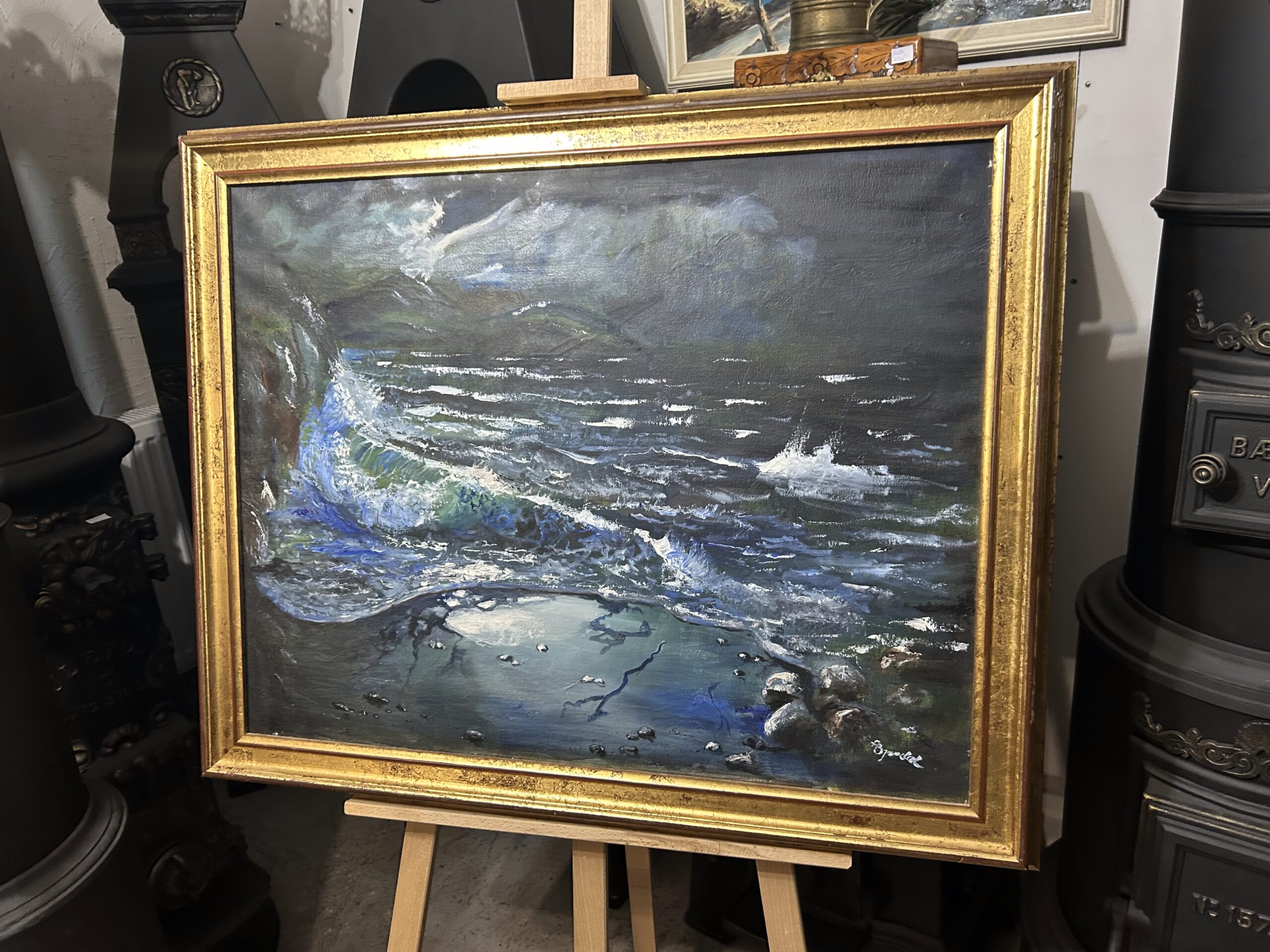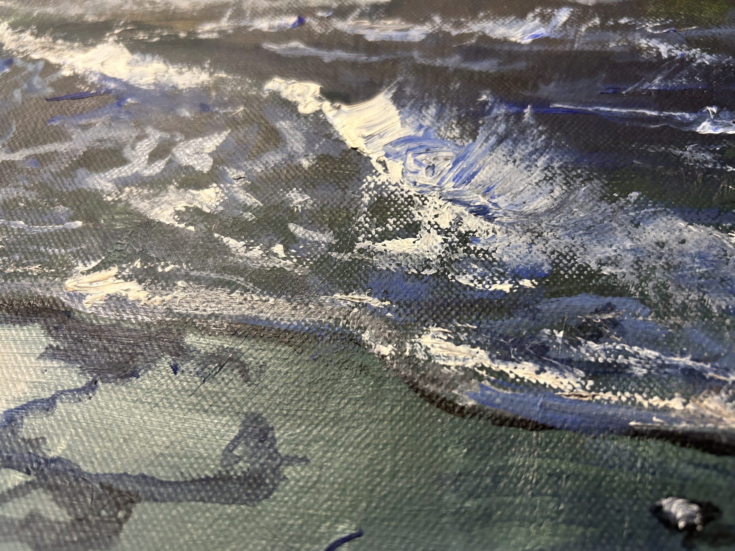 Nastrojowy obraz wykonany techniką oleju na płótnie, przedstawiający mroczną plażę. Ciemne, stonowane barwy nadają scenie tajemniczości i głębi, oddając surowy charakter przyrody i wyciszoną atmosferę nadmorskiego krajobrazu. Kompozycja emanuje spokojem i melancholią, tworząc wyjątkowy klimat.