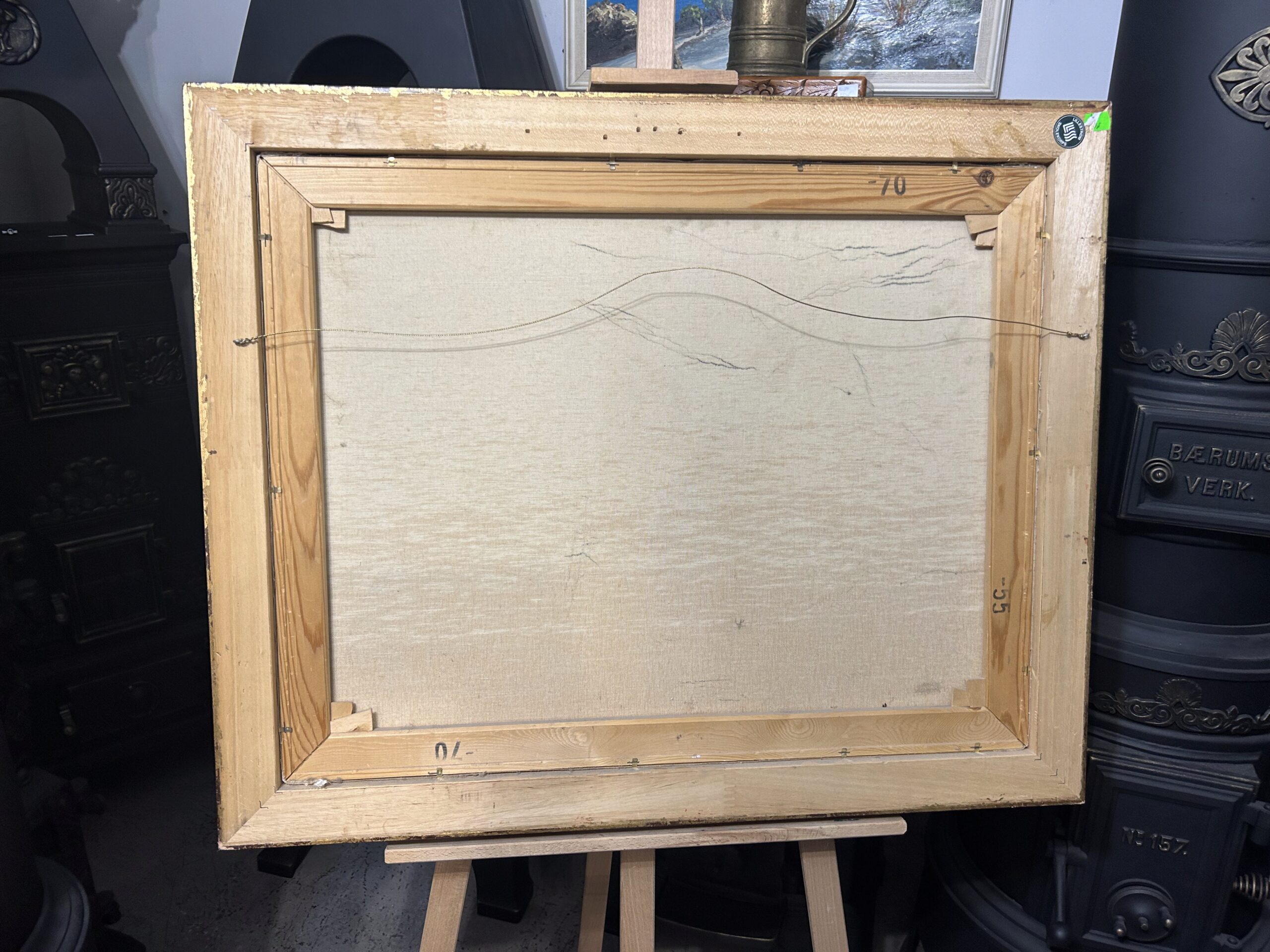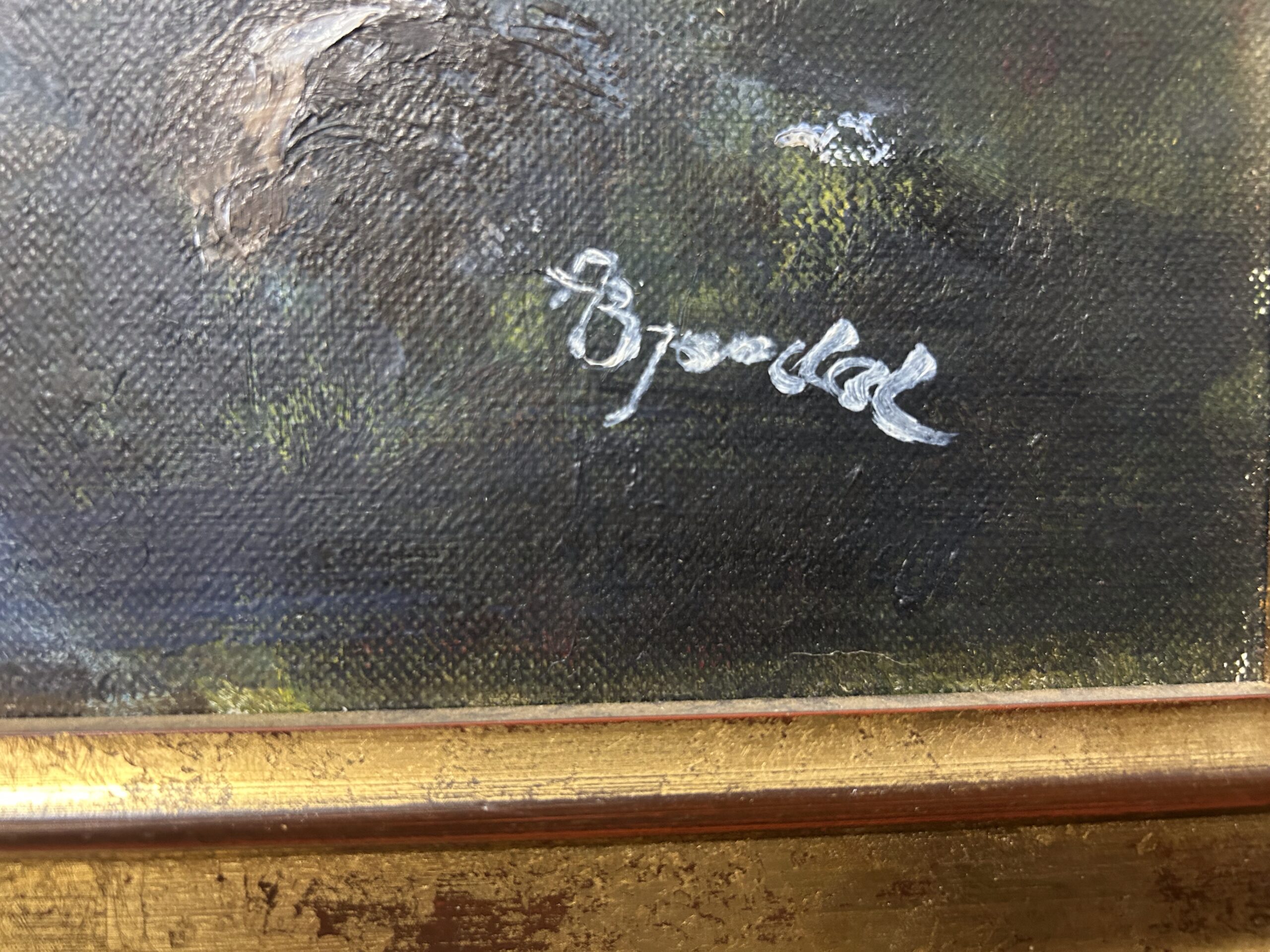Obraz oprawiony jest w złotą, zdobioną ramę wykonaną z drewna, która podkreśla elegancję dzieła i jego artystyczną wartość. Dzieło jest sygnowane przez autora Bjoodel.