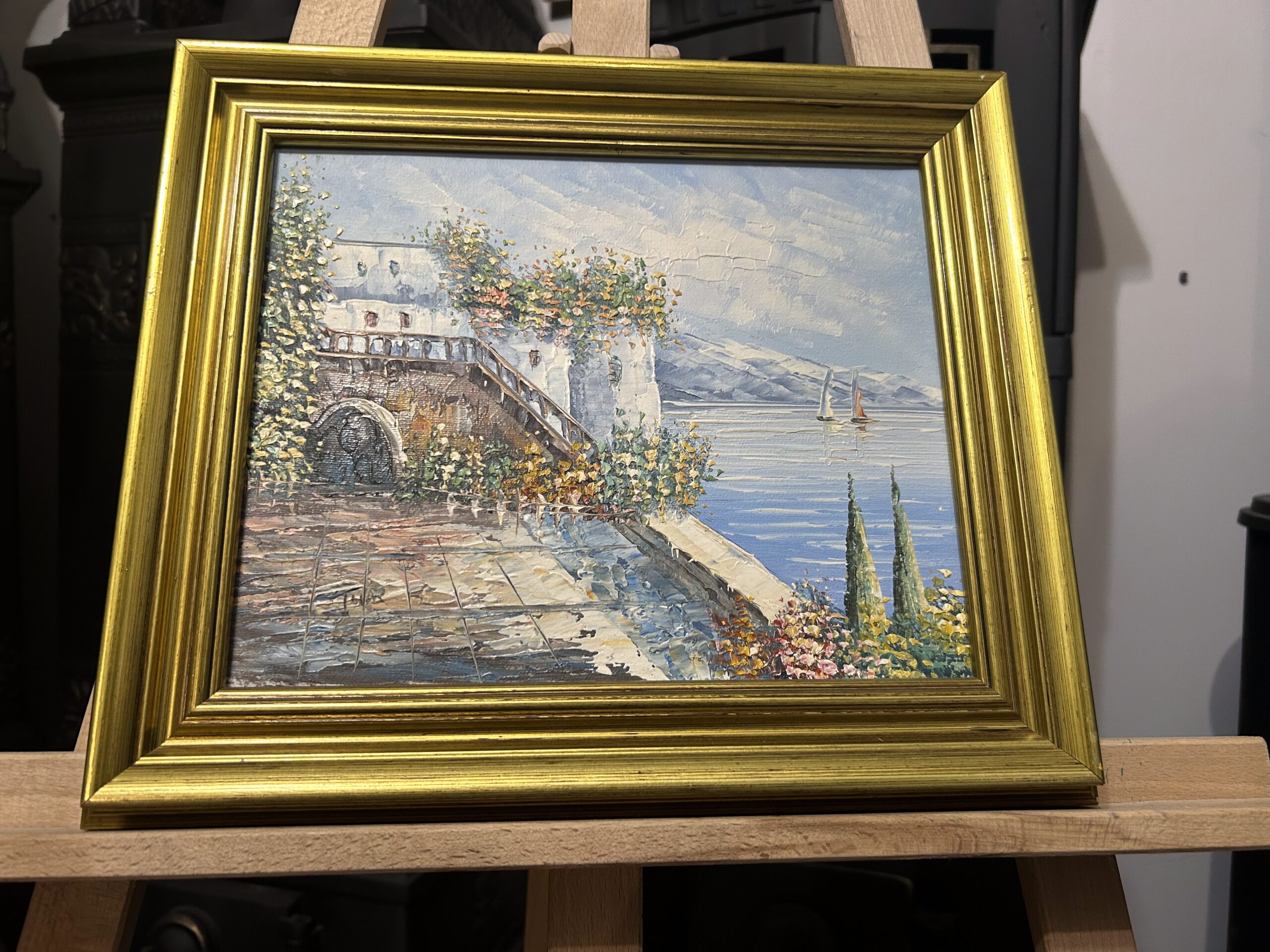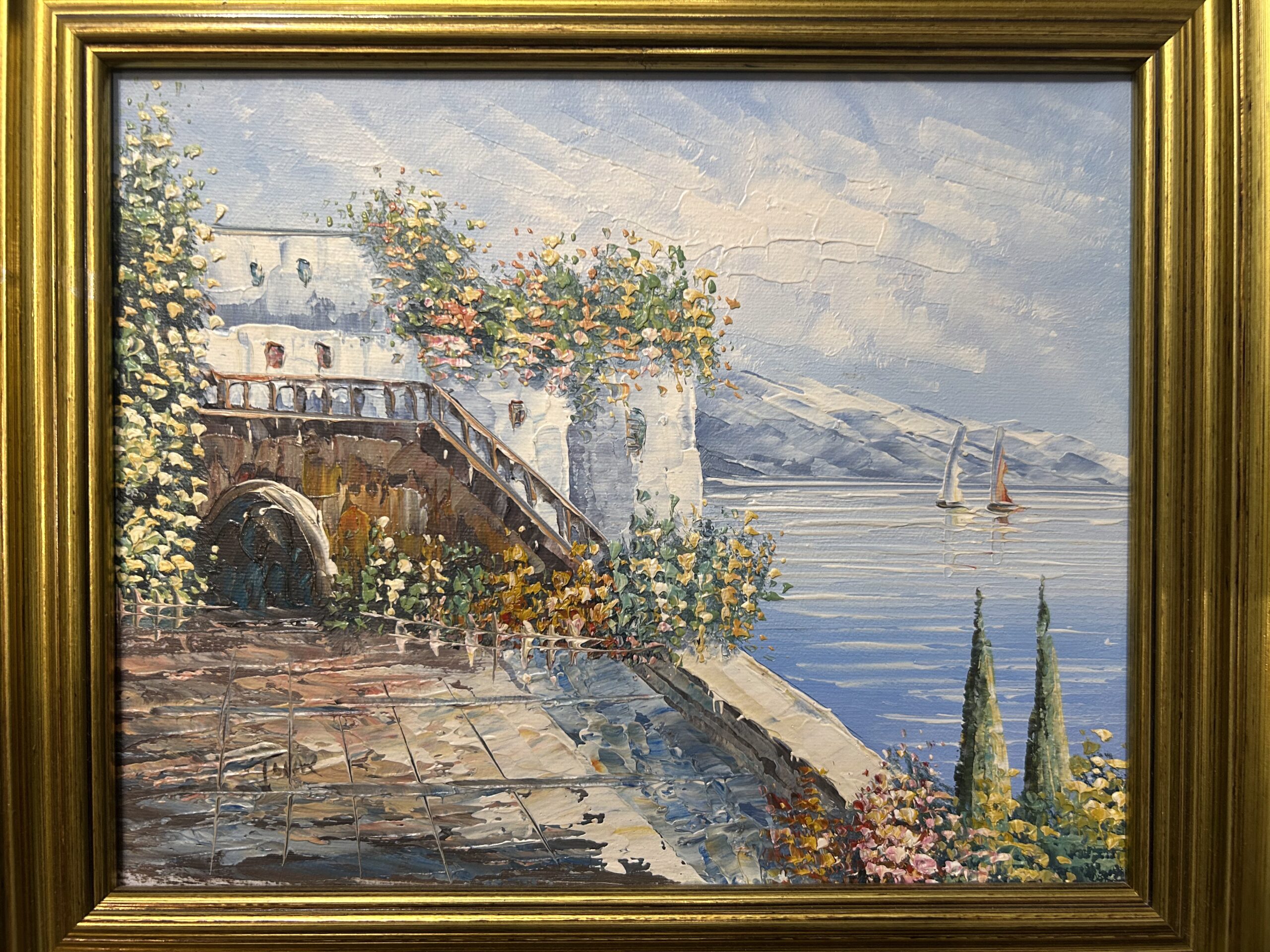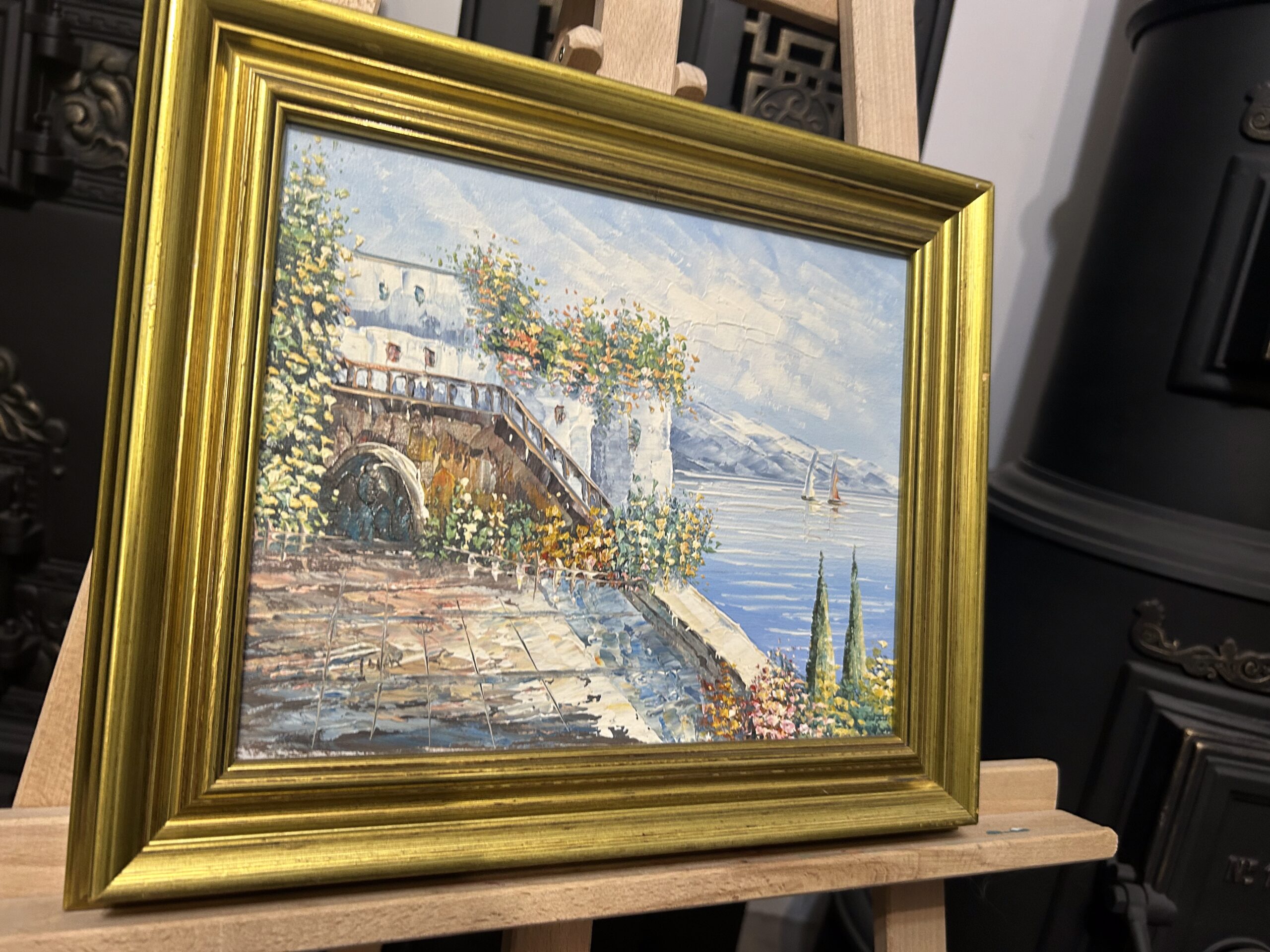 Pełen uroku obraz wykonany techniką oleju na płótnie z wykorzystaniem szpatułki, co nadaje mu wyrazistą fakturę i wyjątkową głębię. Przedstawia malowniczą nadmorską promenadę z uroczymi domkami, które tworzą spokojną, harmonijną kompozycję. Subtelna kolorystyka w połączeniu z techniką wykonania podkreśla delikatność i artystyczną wizję autora.