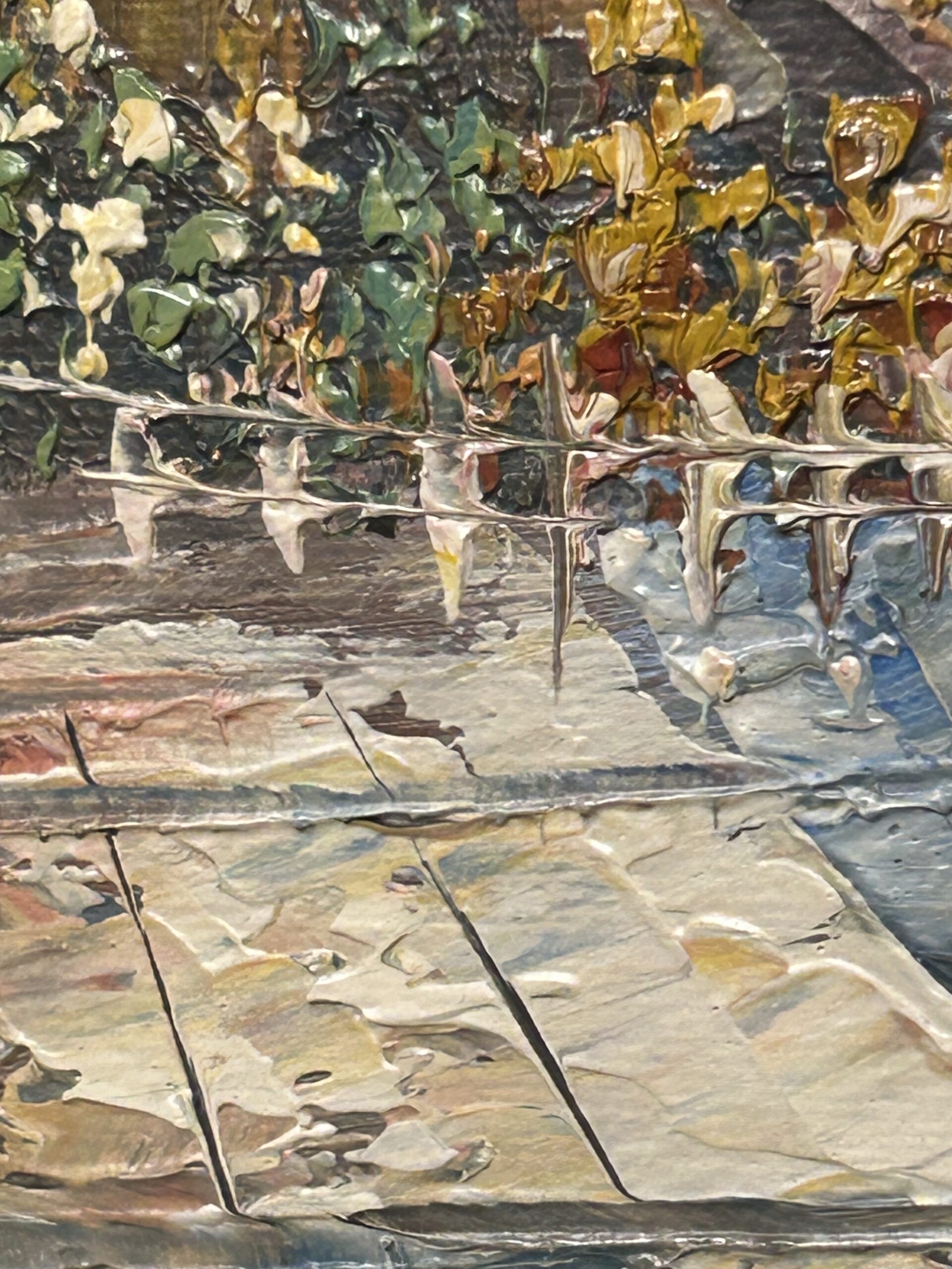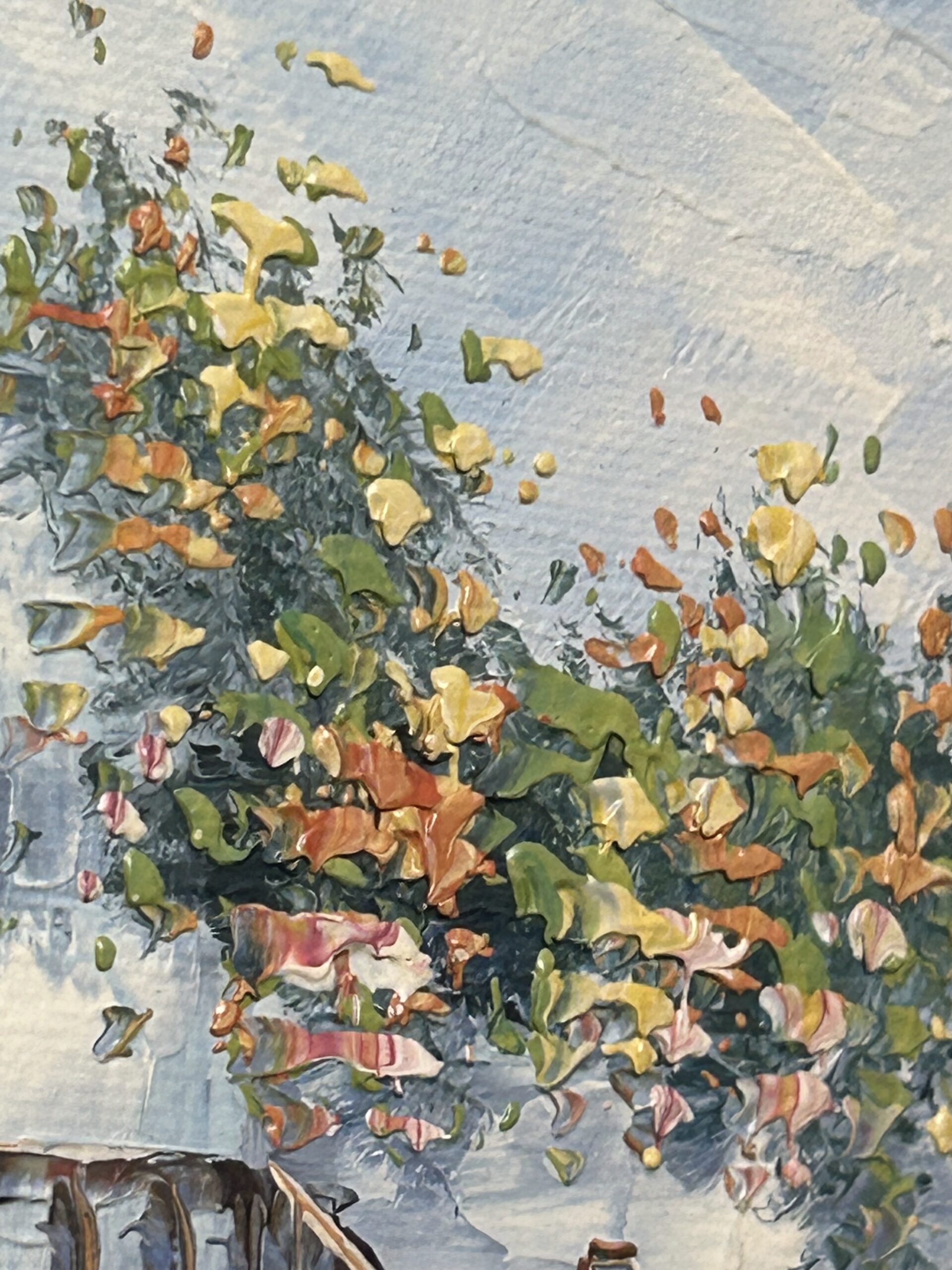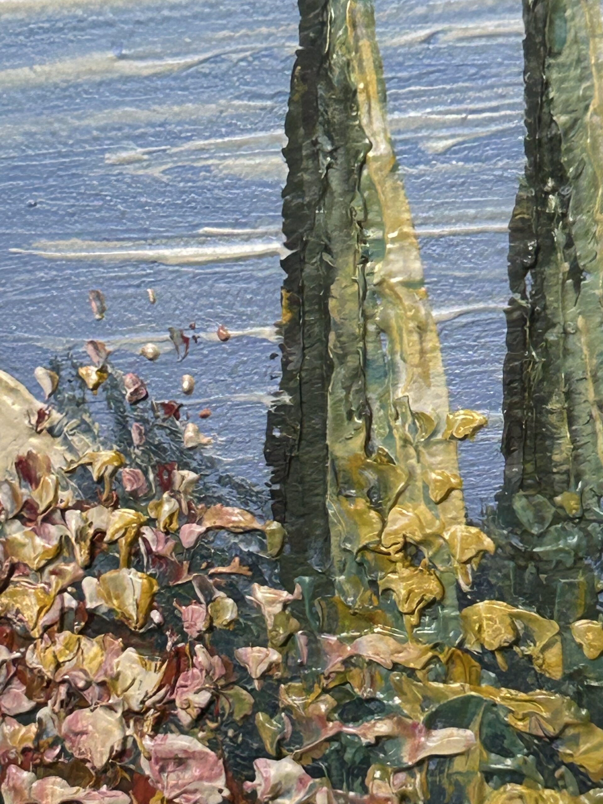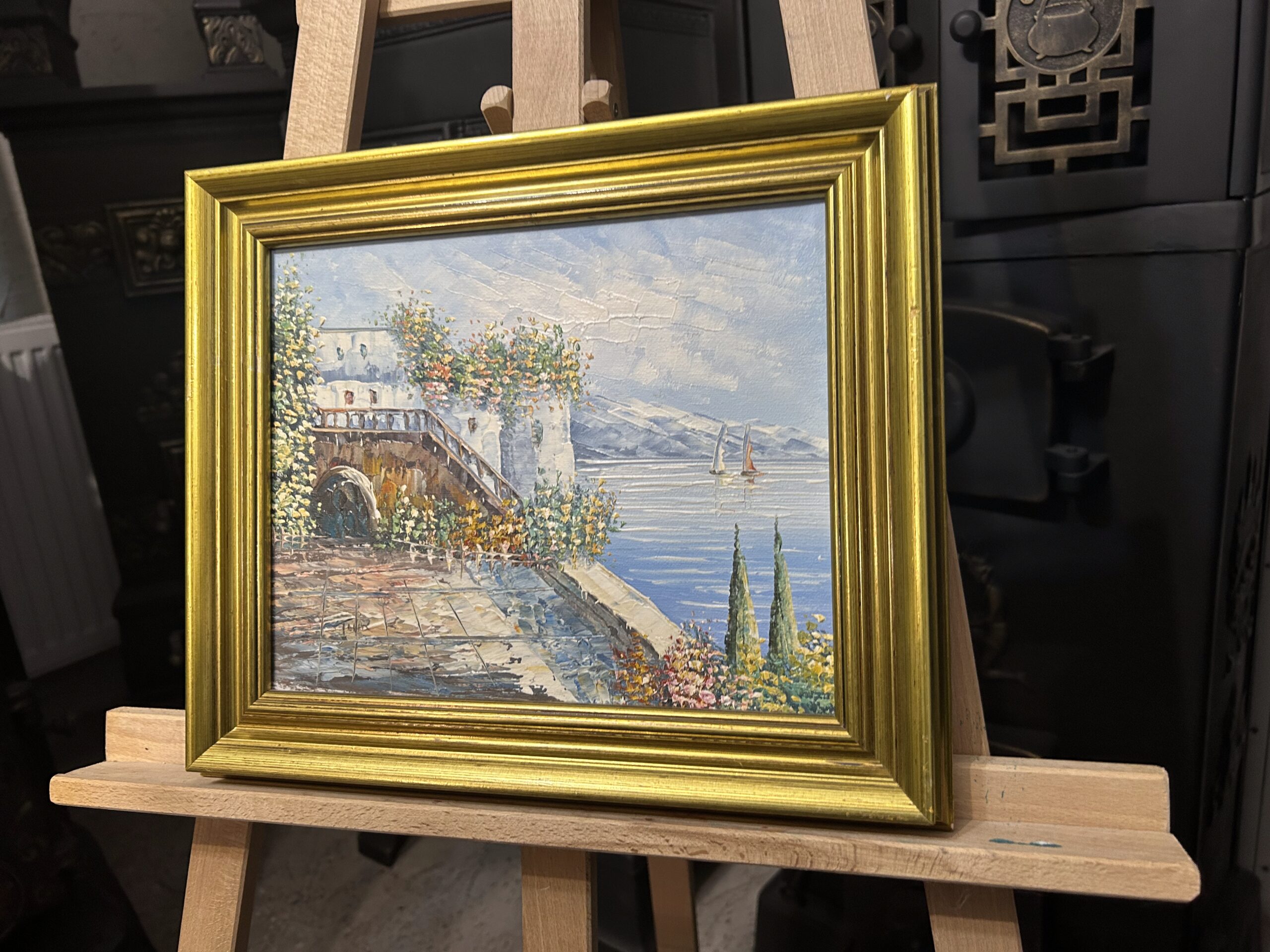 Pełen uroku obraz wykonany techniką oleju na płótnie z wykorzystaniem szpatułki, co nadaje mu wyrazistą fakturę i wyjątkową głębię. Przedstawia malowniczą nadmorską promenadę z uroczymi domkami, które tworzą spokojną, harmonijną kompozycję. Subtelna kolorystyka w połączeniu z techniką wykonania podkreśla delikatność i artystyczną wizję autora.