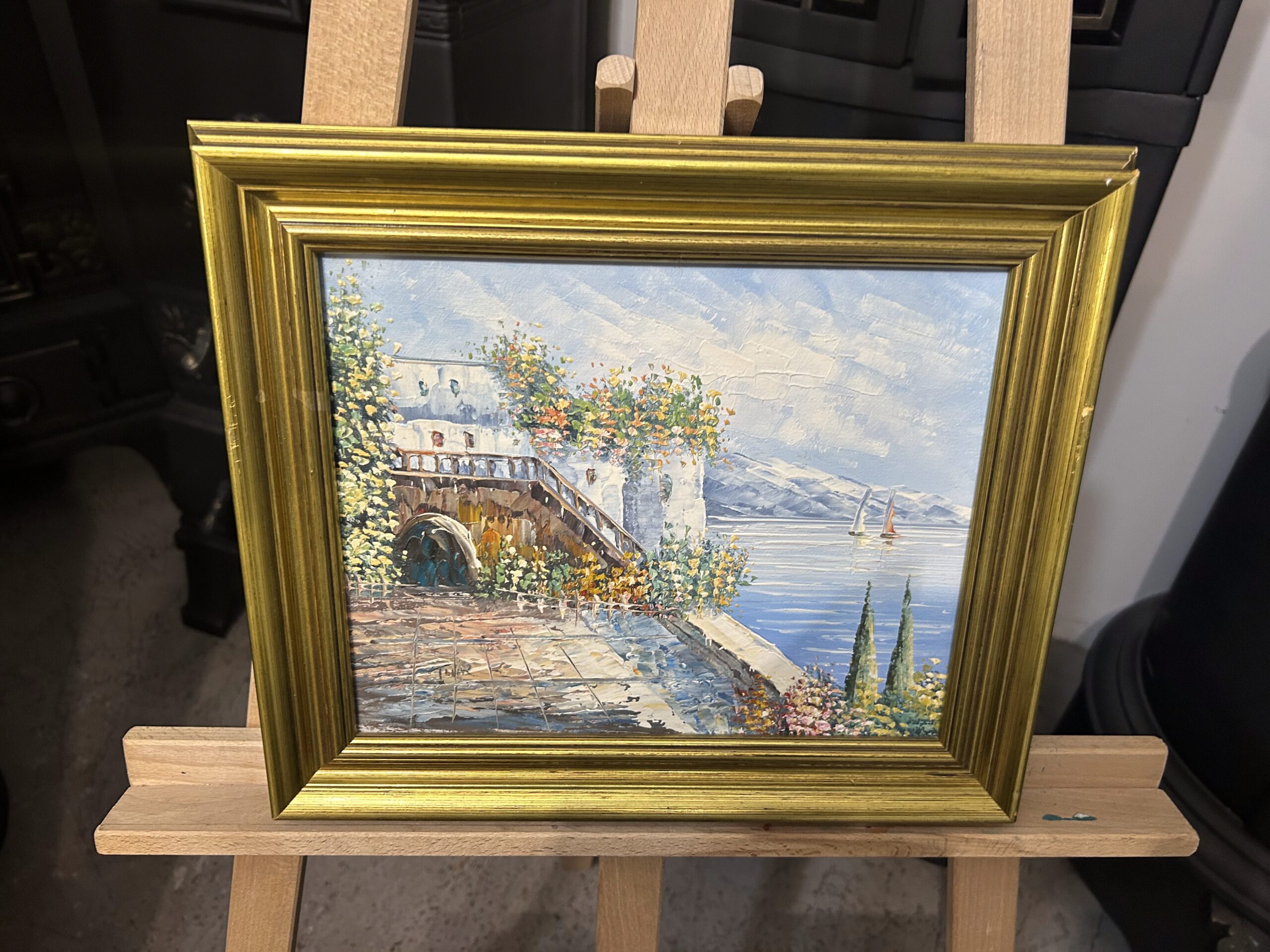 Obraz oprawiony jest w klasyczną, złotą drewnianą ramę, która nadaje mu elegancji i ekskluzywności. Dzieło sygnowane przez autora Tovar.