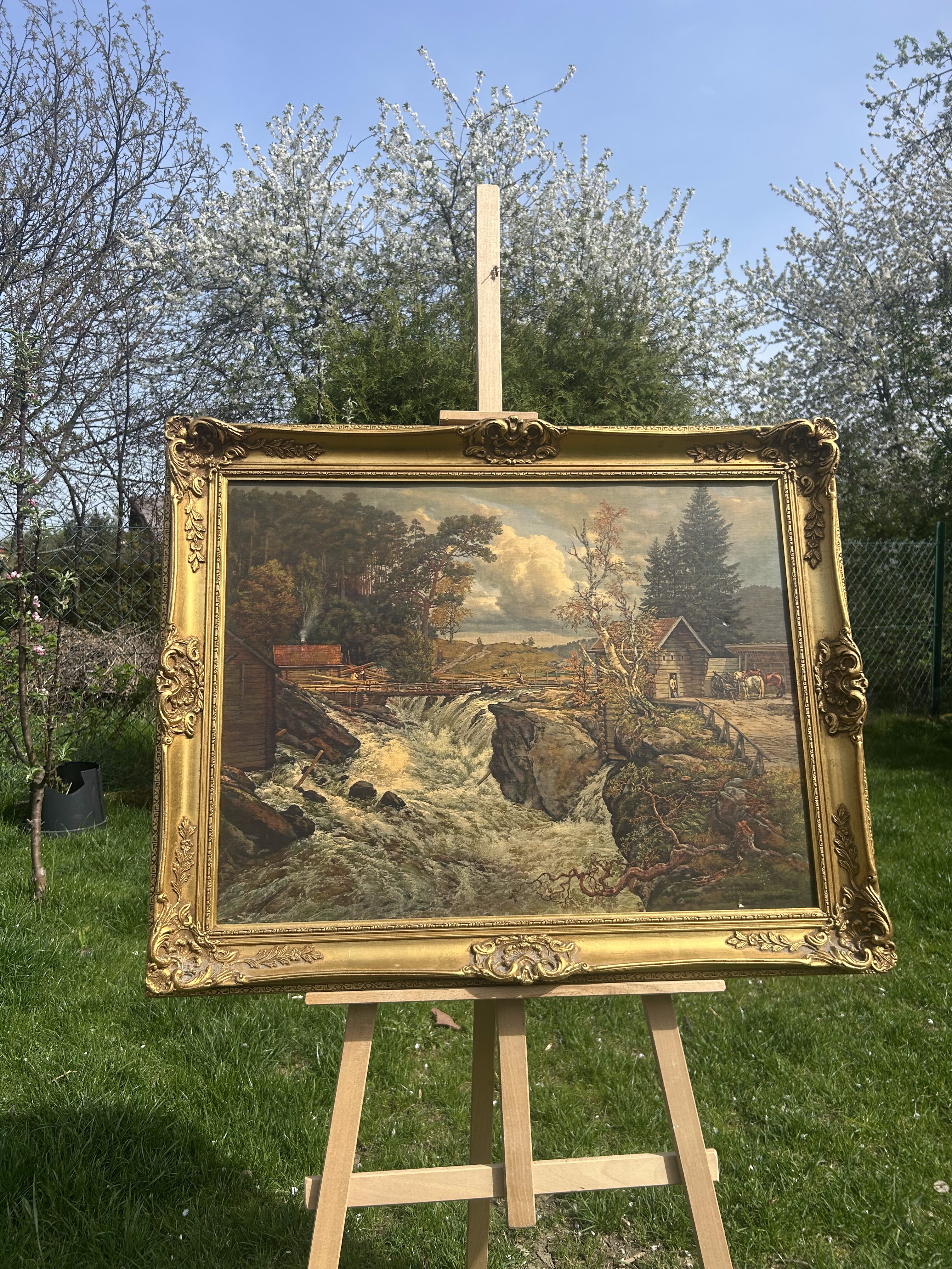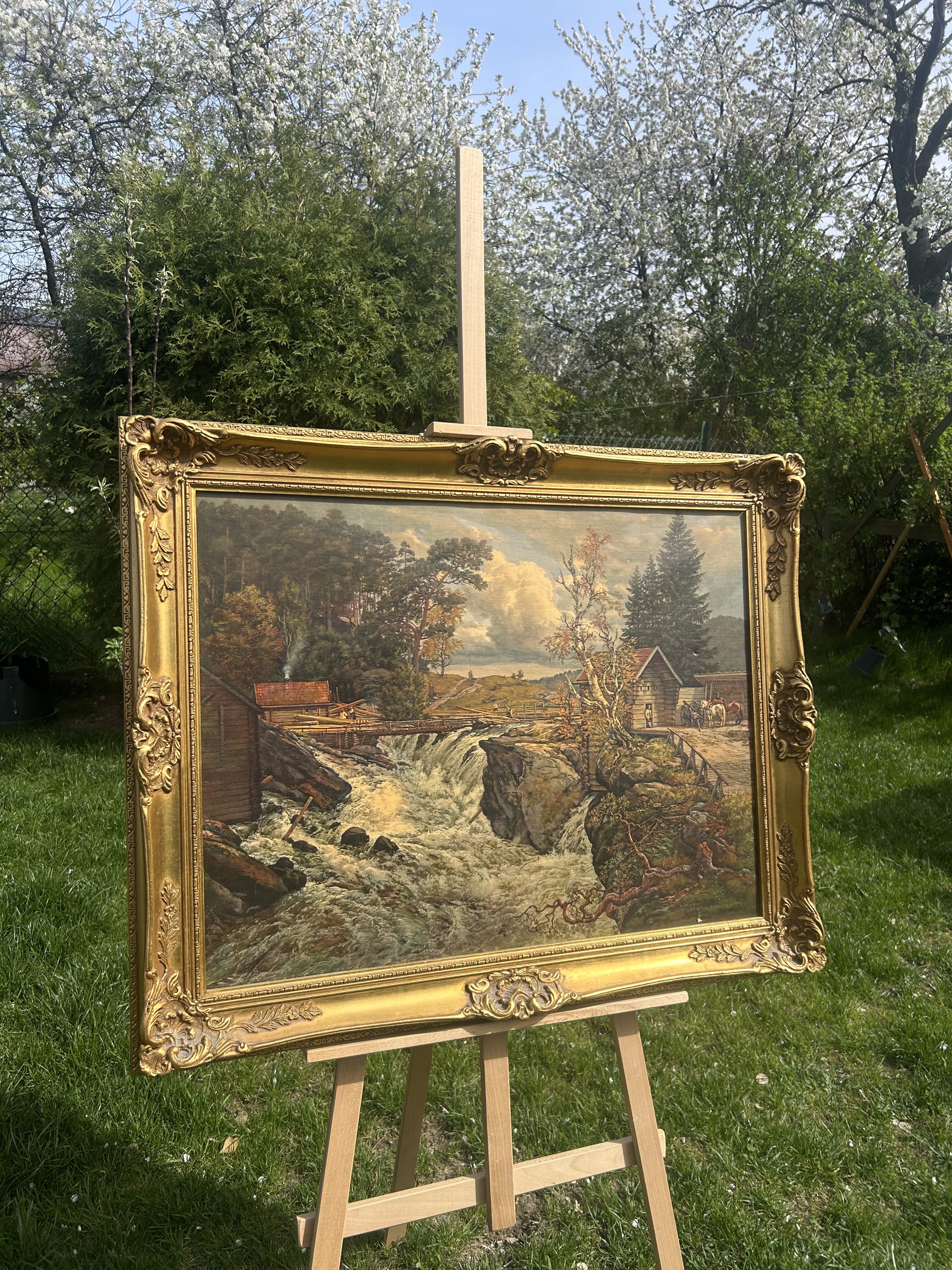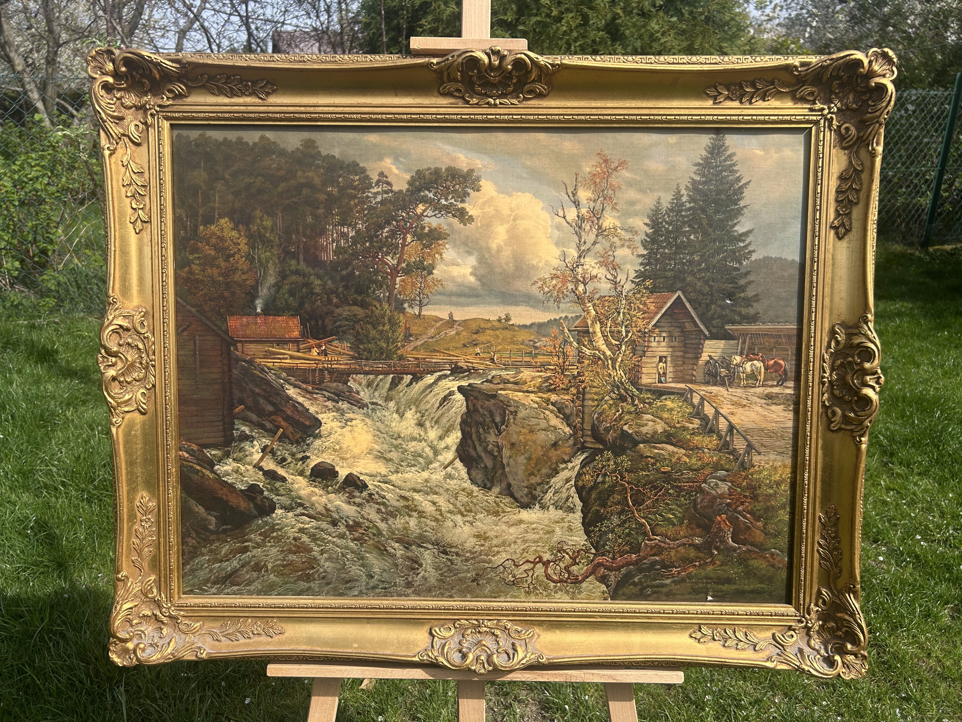 Dekoracyjny obraz w formie nadruku na płótnie, przedstawiający malowniczą scenę wiejskiego młyna nad potokiem. Całość oprawiona jest w okazałą, rzeźbioną ramę drewnianą w kolorze starego złota, która przyciąga uwagę bogatymi zdobieniami.