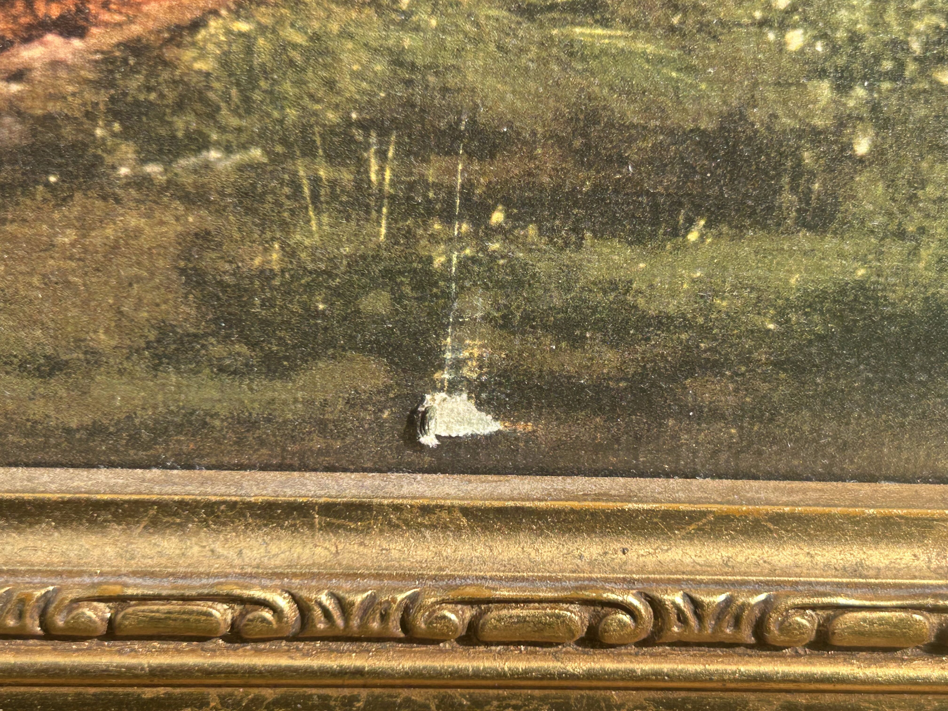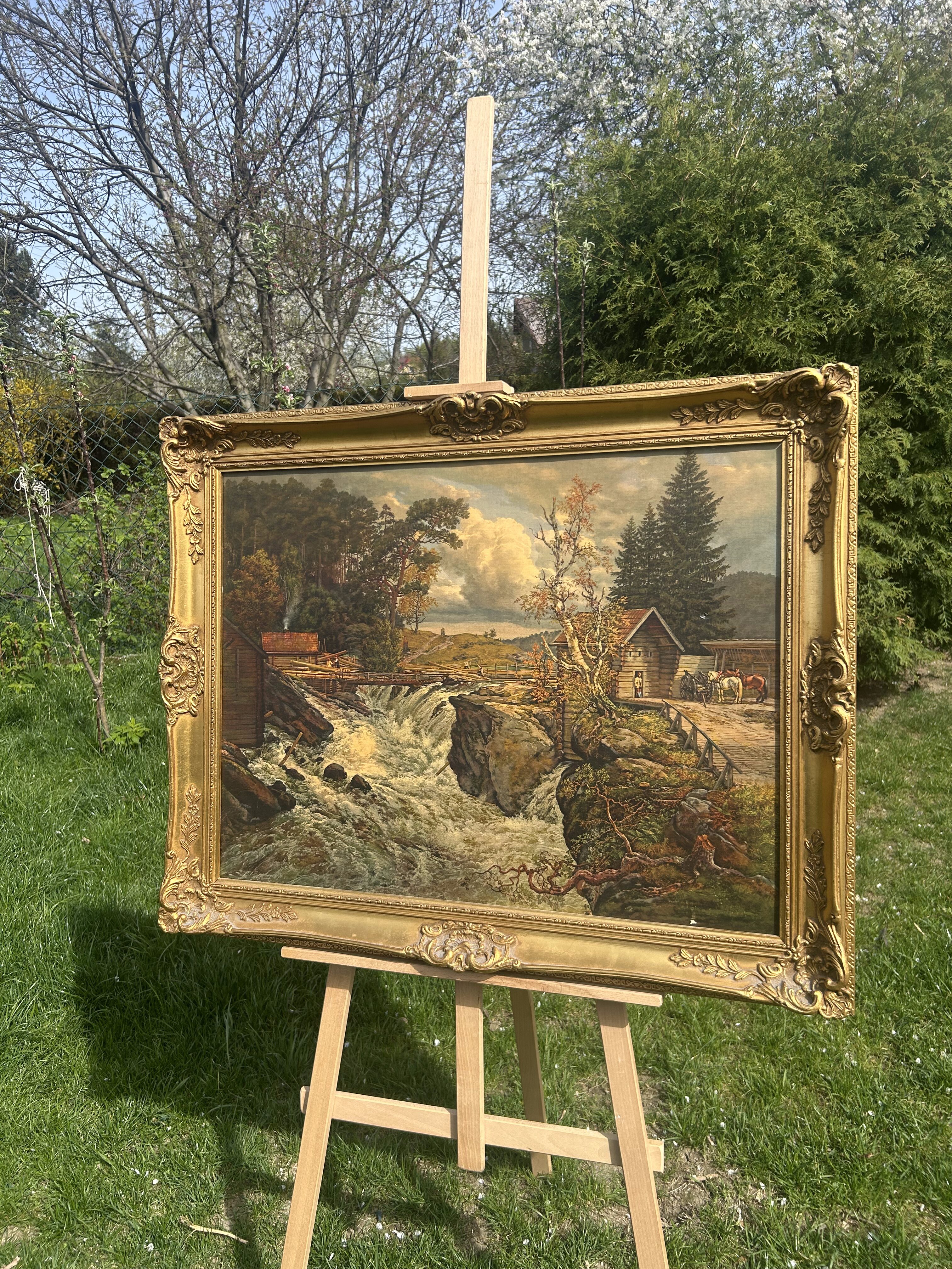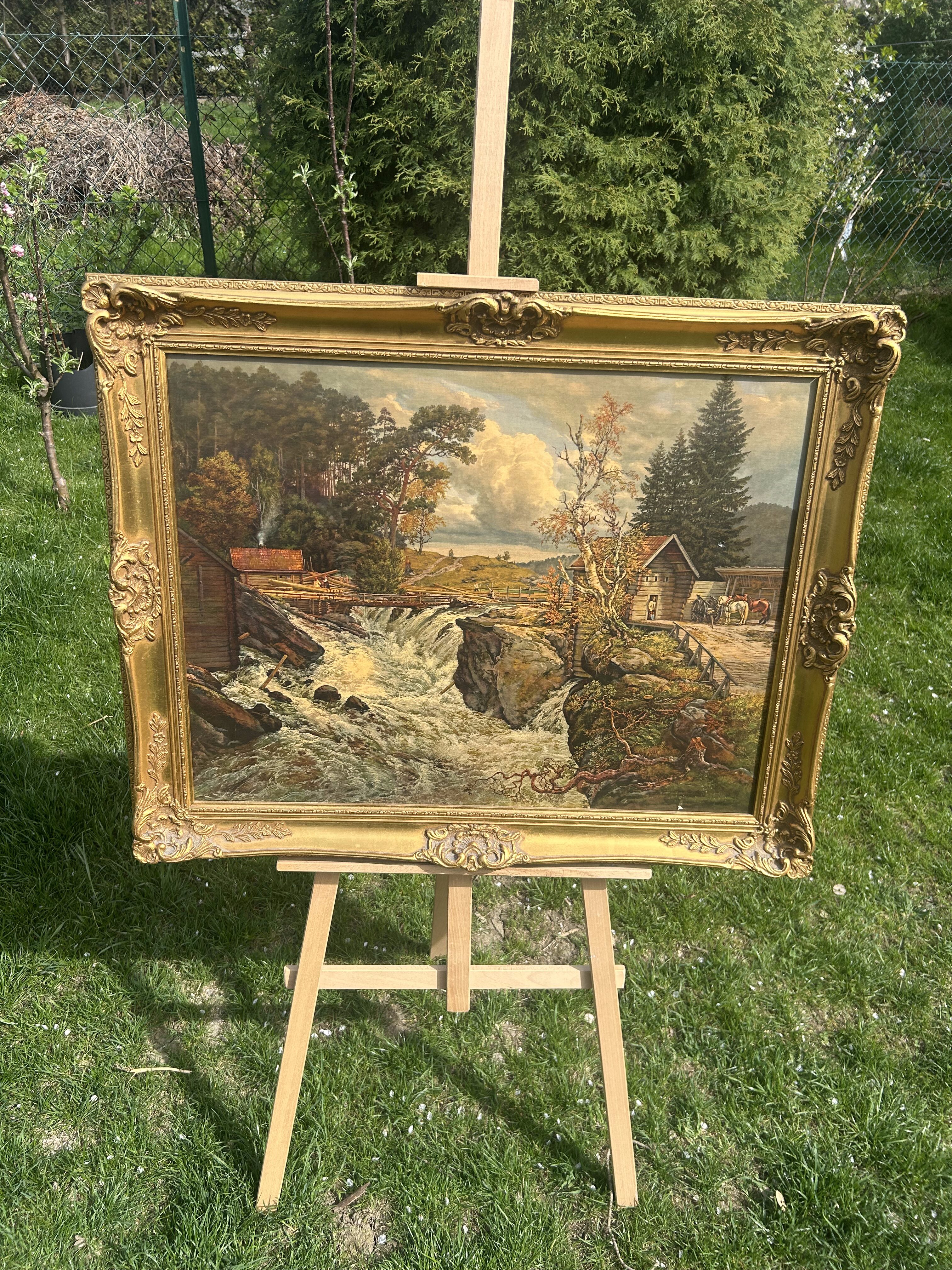 Dekoracyjny obraz w formie nadruku na płótnie, przedstawiający malowniczą scenę wiejskiego młyna nad potokiem. Całość oprawiona jest w okazałą, rzeźbioną ramę drewnianą w kolorze starego złota, która przyciąga uwagę bogatymi zdobieniami.