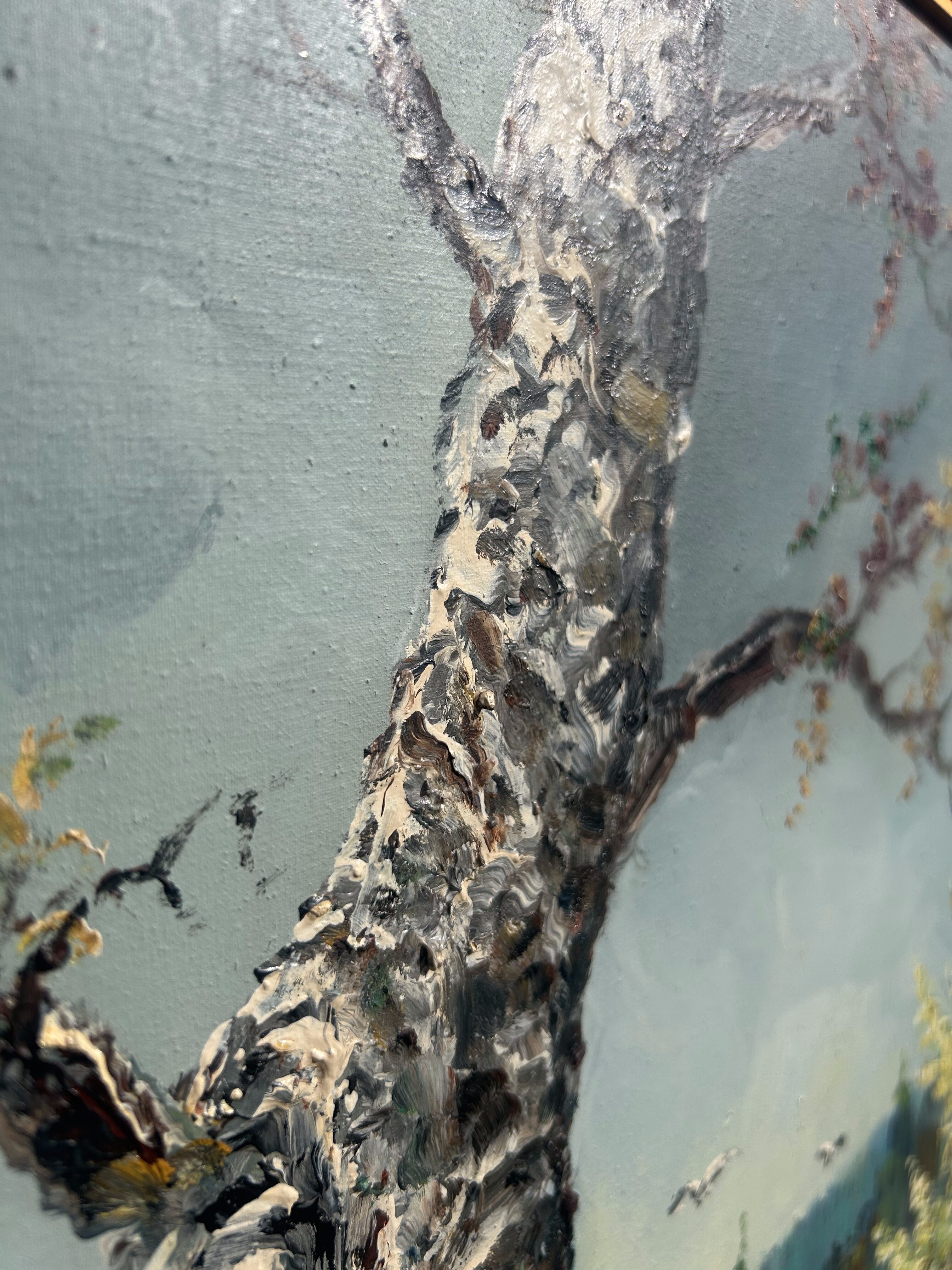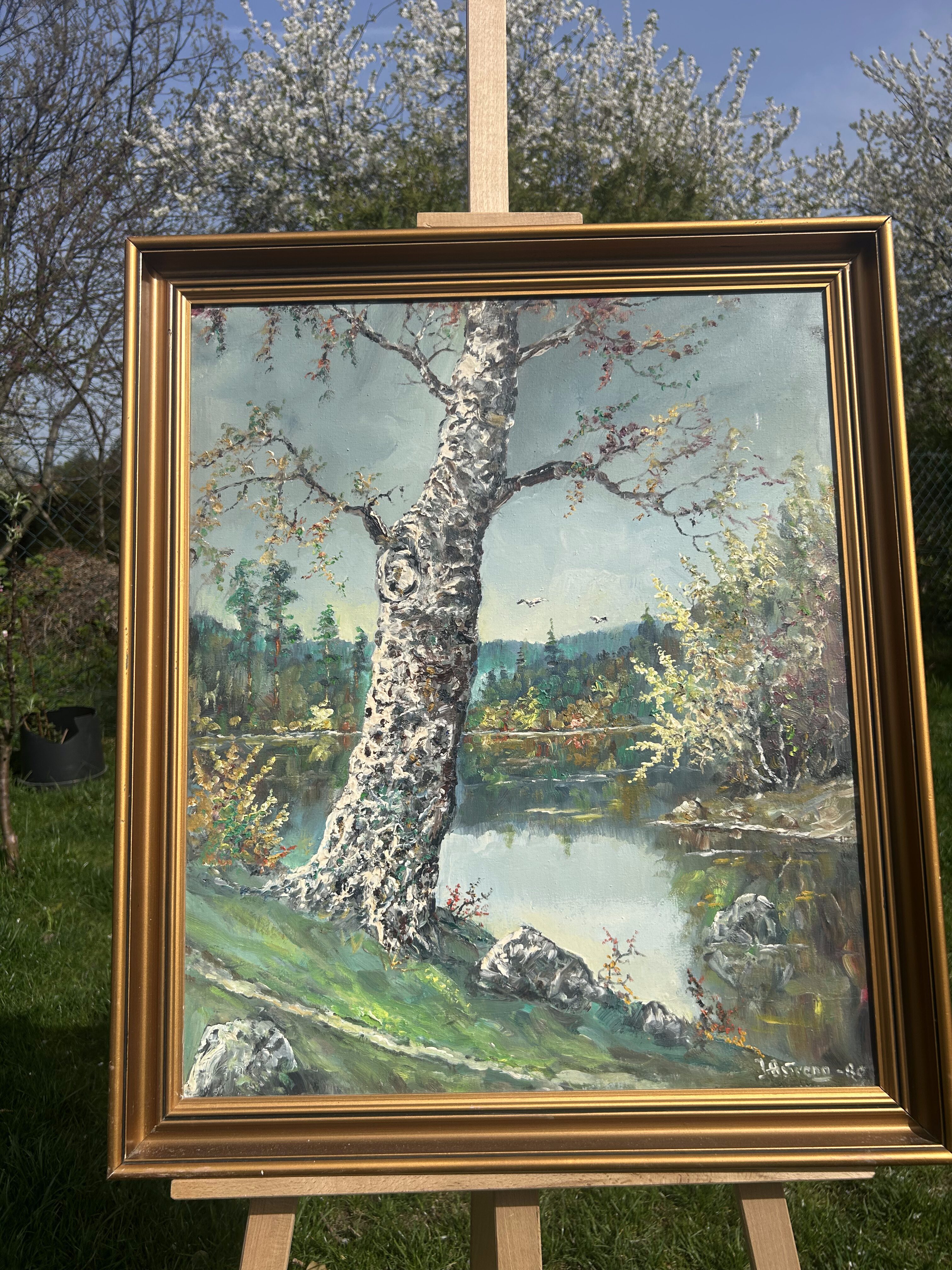 Pejzażowy obraz olejny na płótnie, przedstawiający brzozę rosnącą nad spokojnym brzegiem jeziora lub rzeki. Kompozycja tchnie świeżością i spokojem – jasne kolory, żywa zieleń i subtelne światło tworzą wyjątkową atmosferę wiosennej lub letniej scenerii.