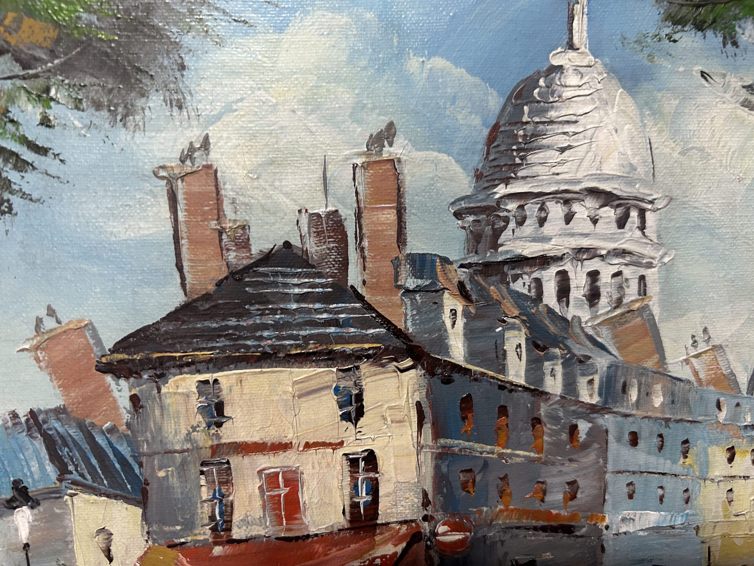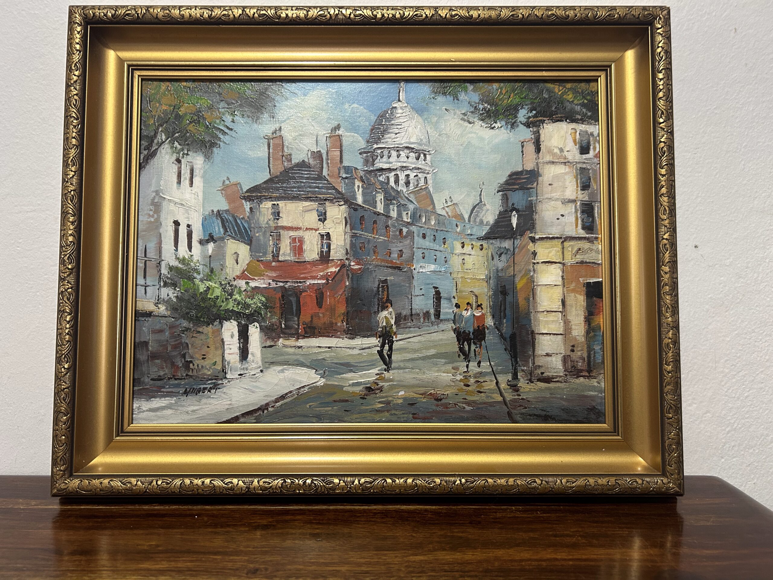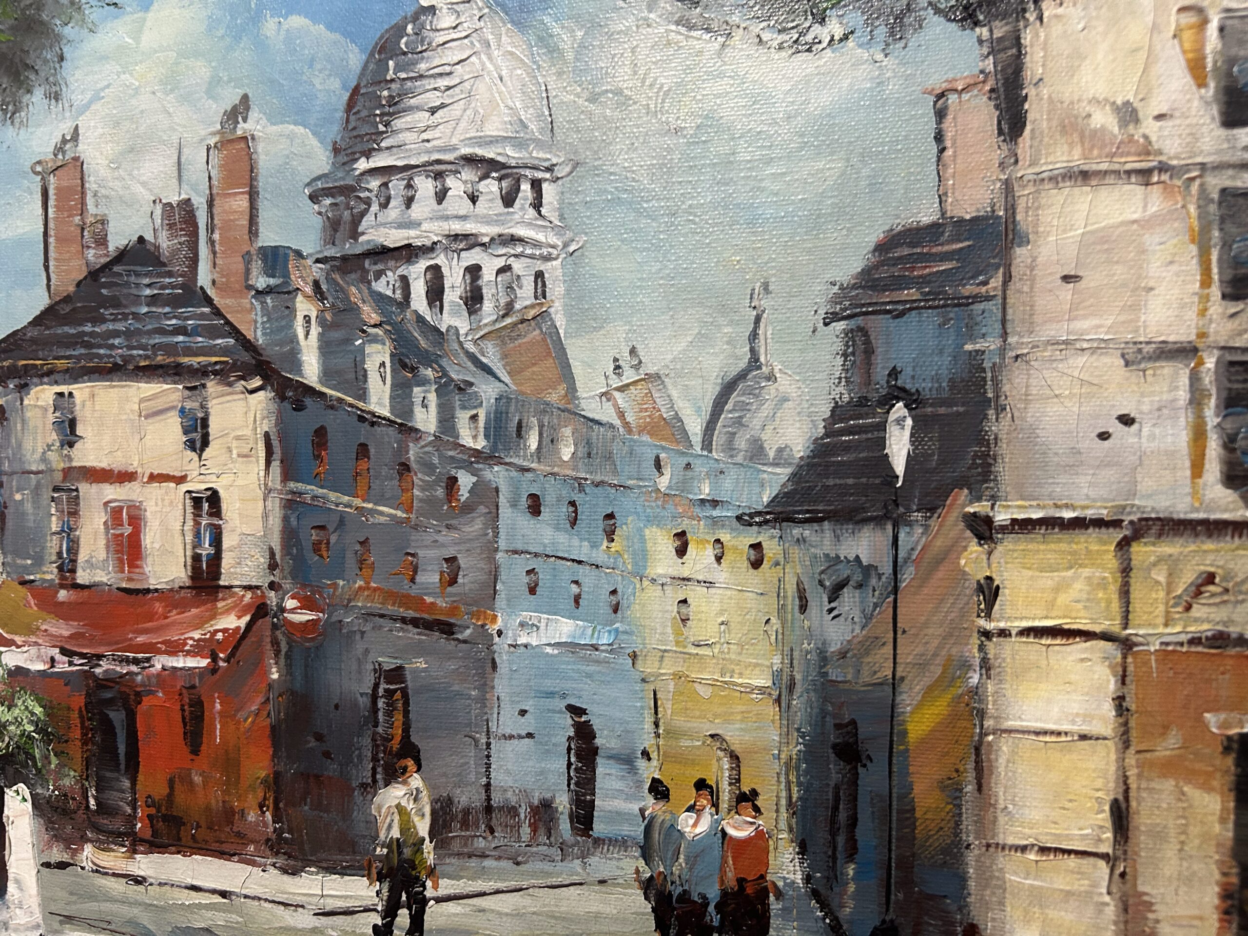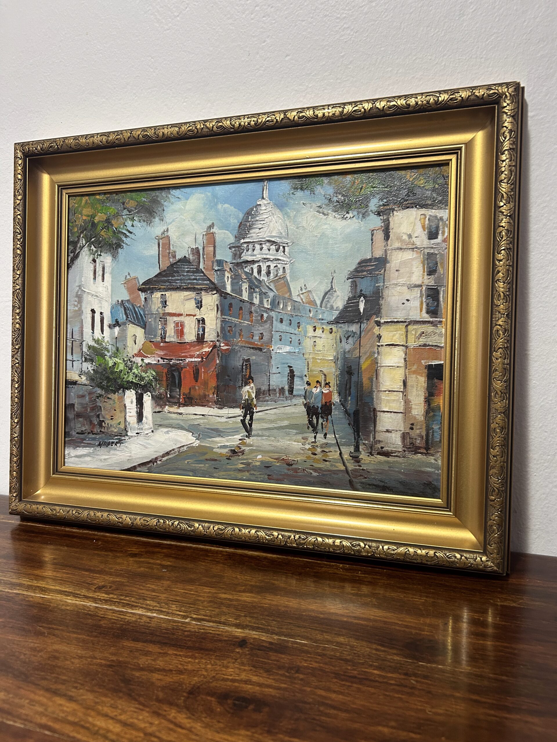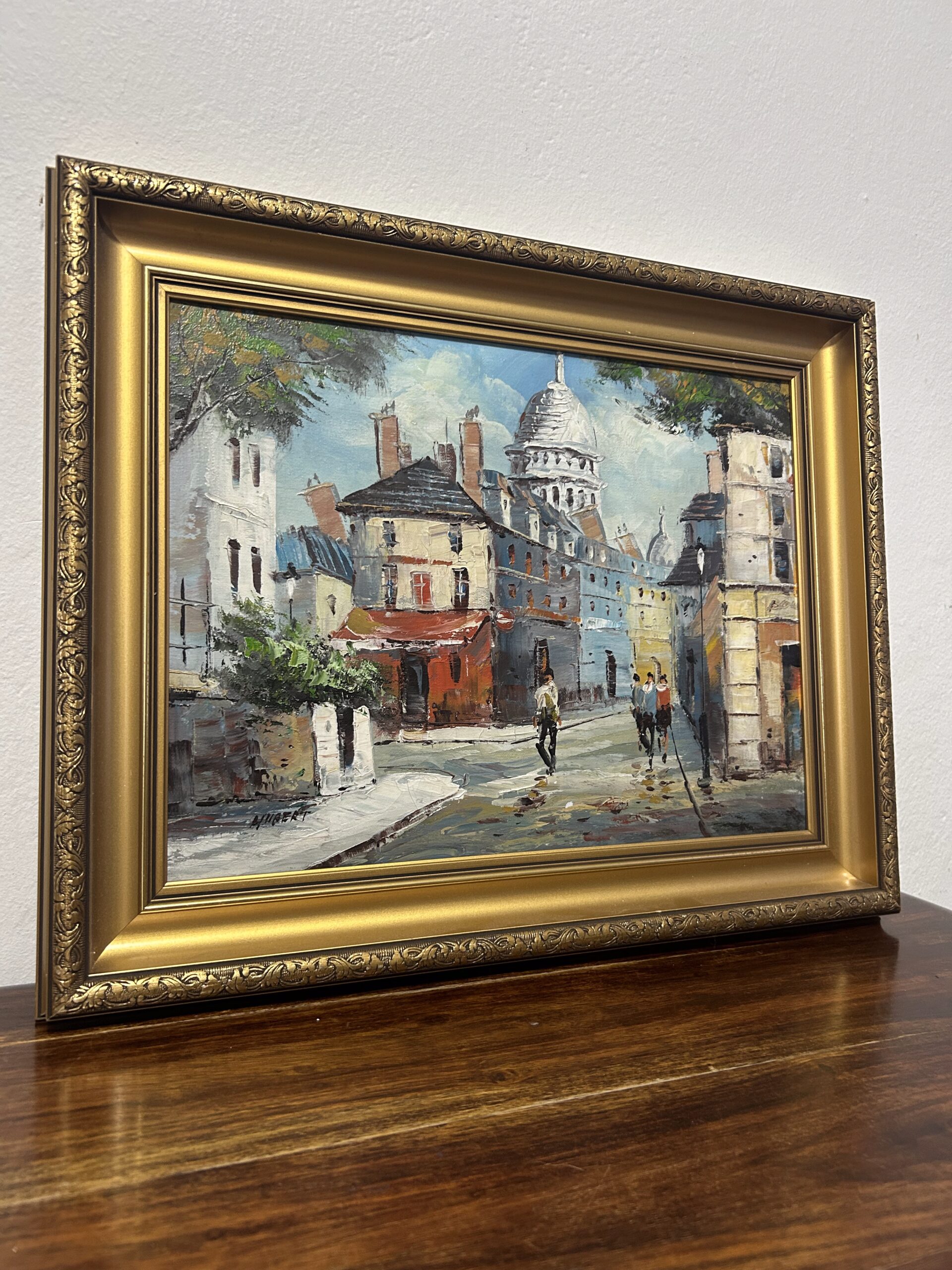 Pełen życia obraz olejny na płótnie, przedstawiający kolorowe uliczki malowniczego miasteczka. Wyraziste barwy, architektura i delikatna gra światła nadają dziełu radosnego i harmonijnego charakteru. Złota, bogato zdobiona rama dodatkowo podkreśla klasyczny styl obrazu.