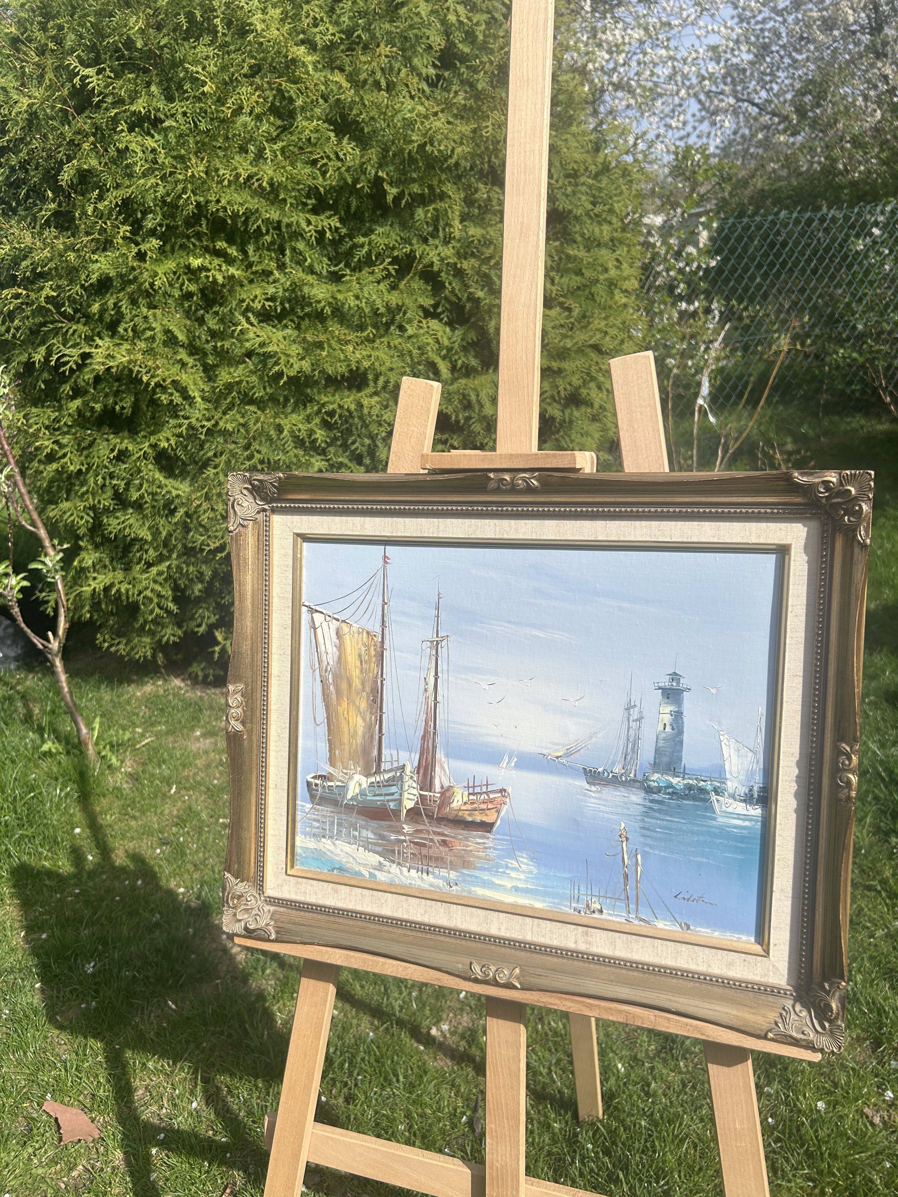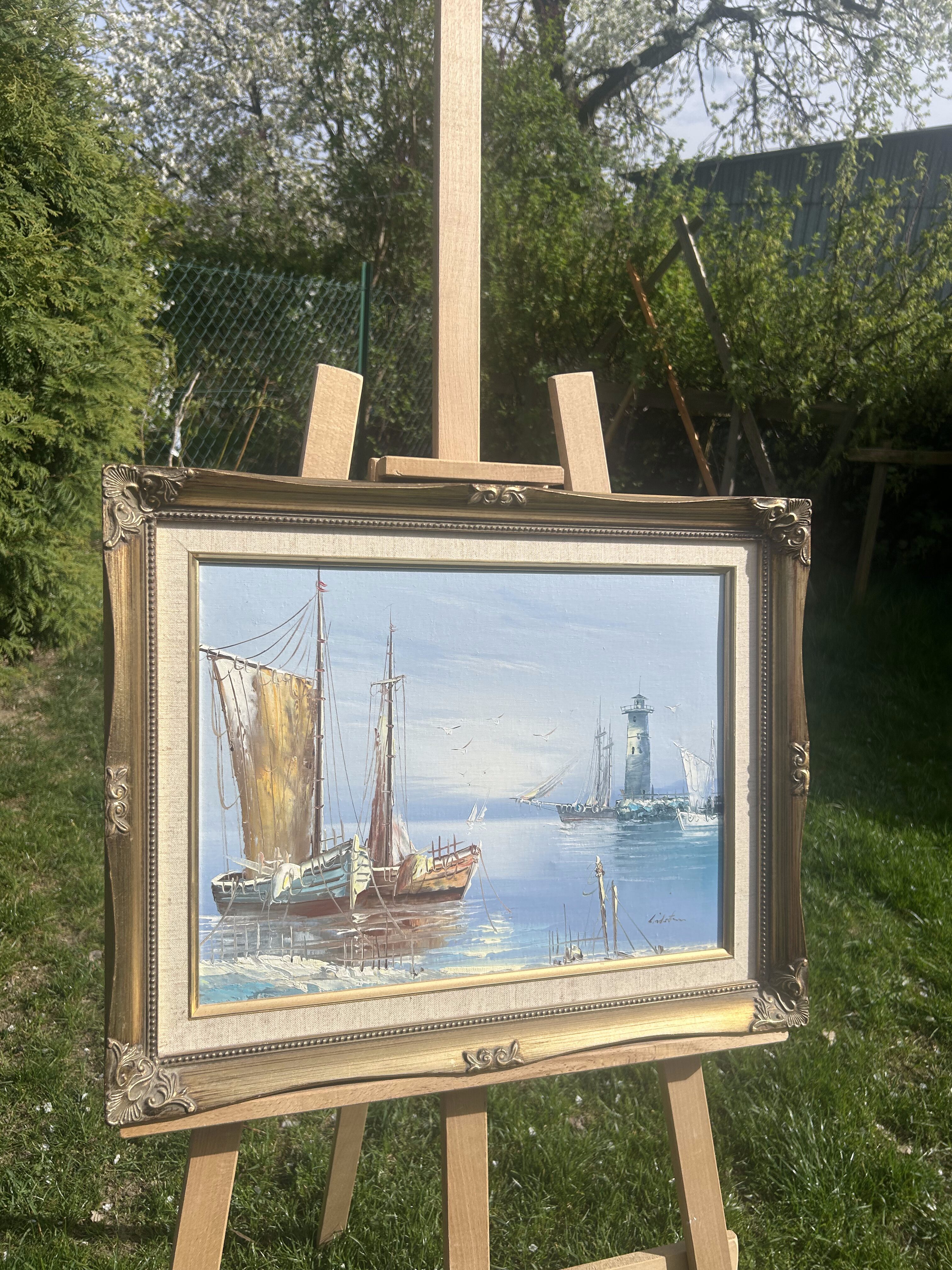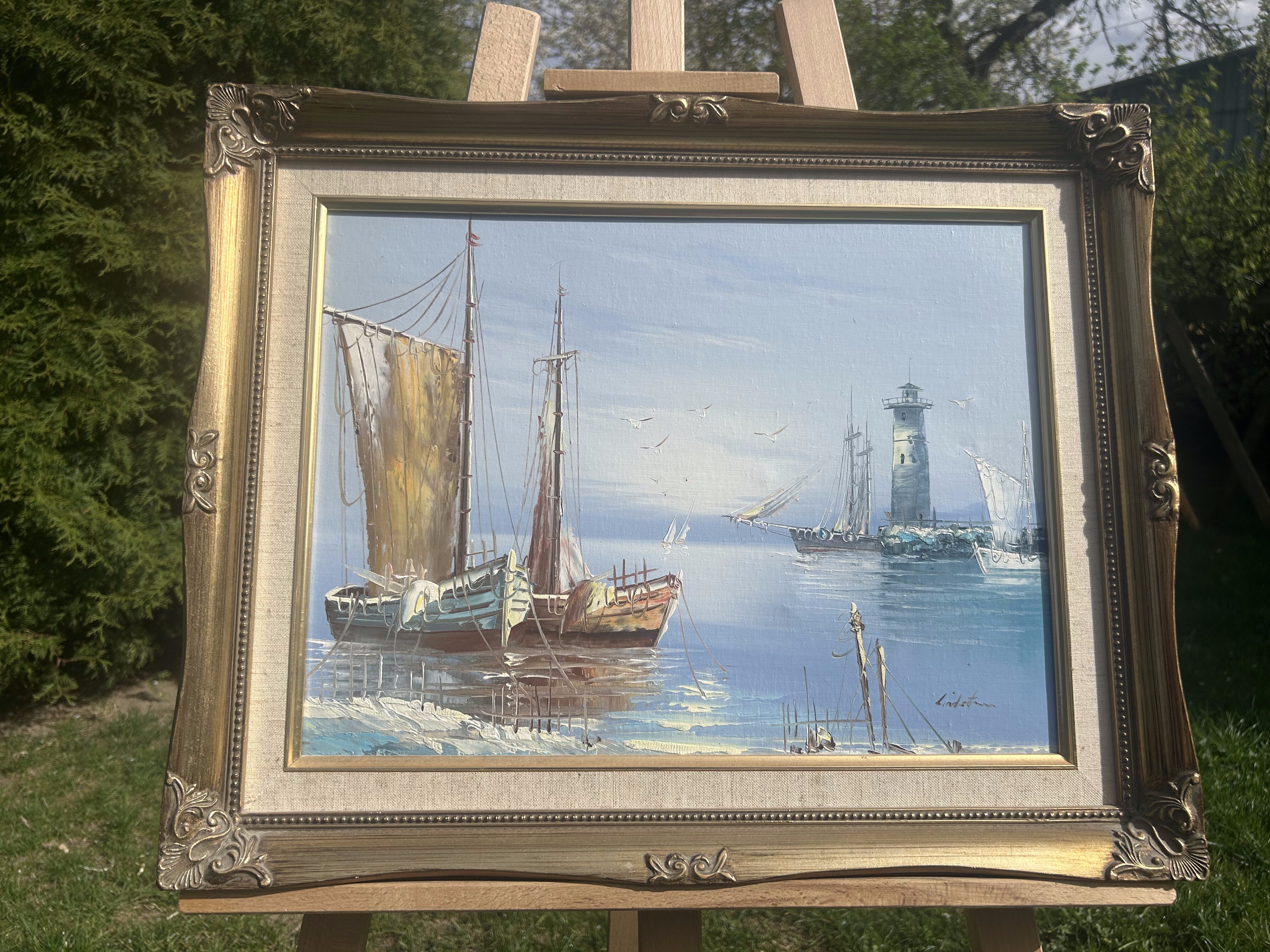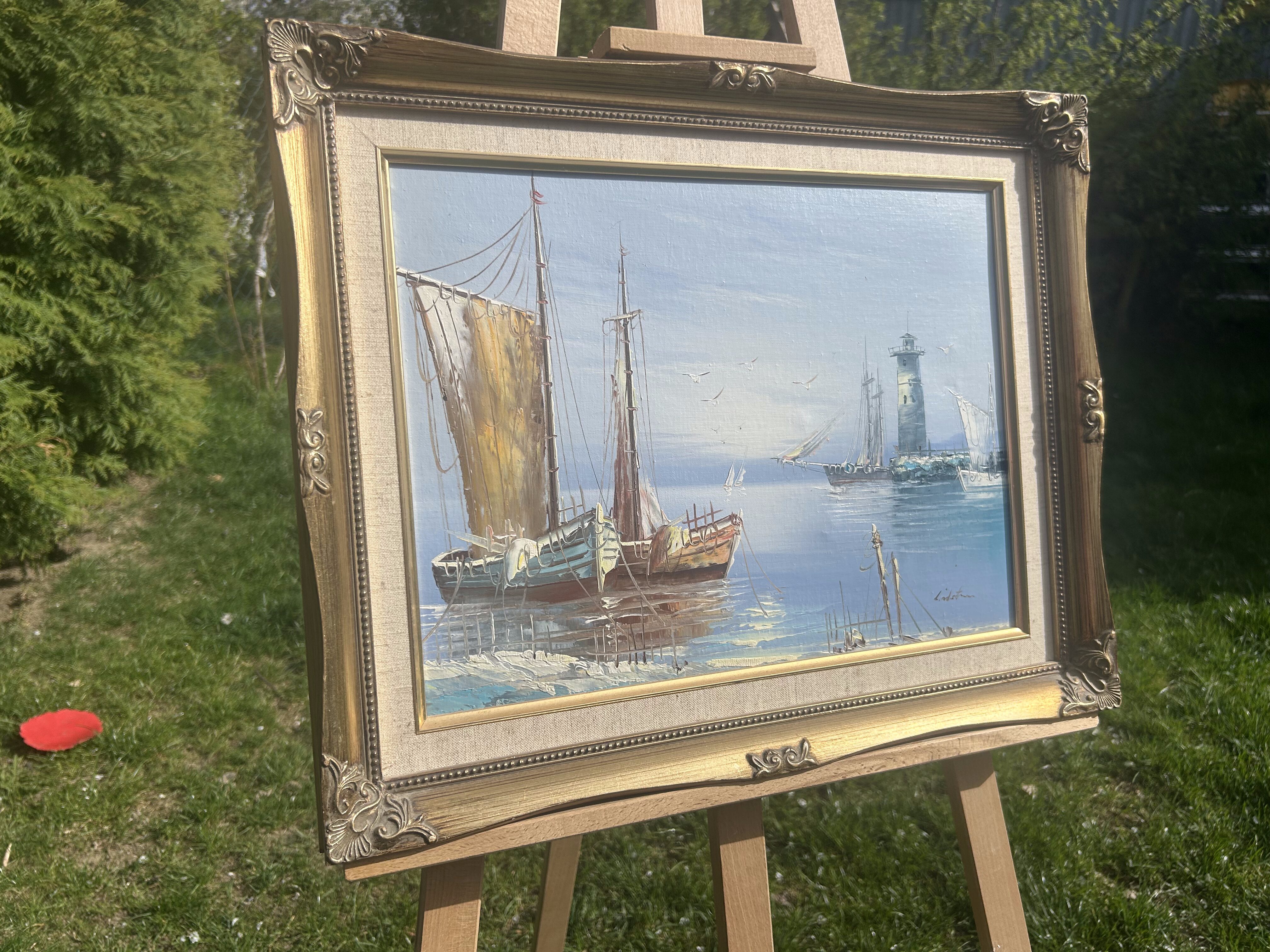 Obraz olejny – Łodzie w porcie – Lasse Lindstrom – Olej na płótnie – Rzeźbiona rama