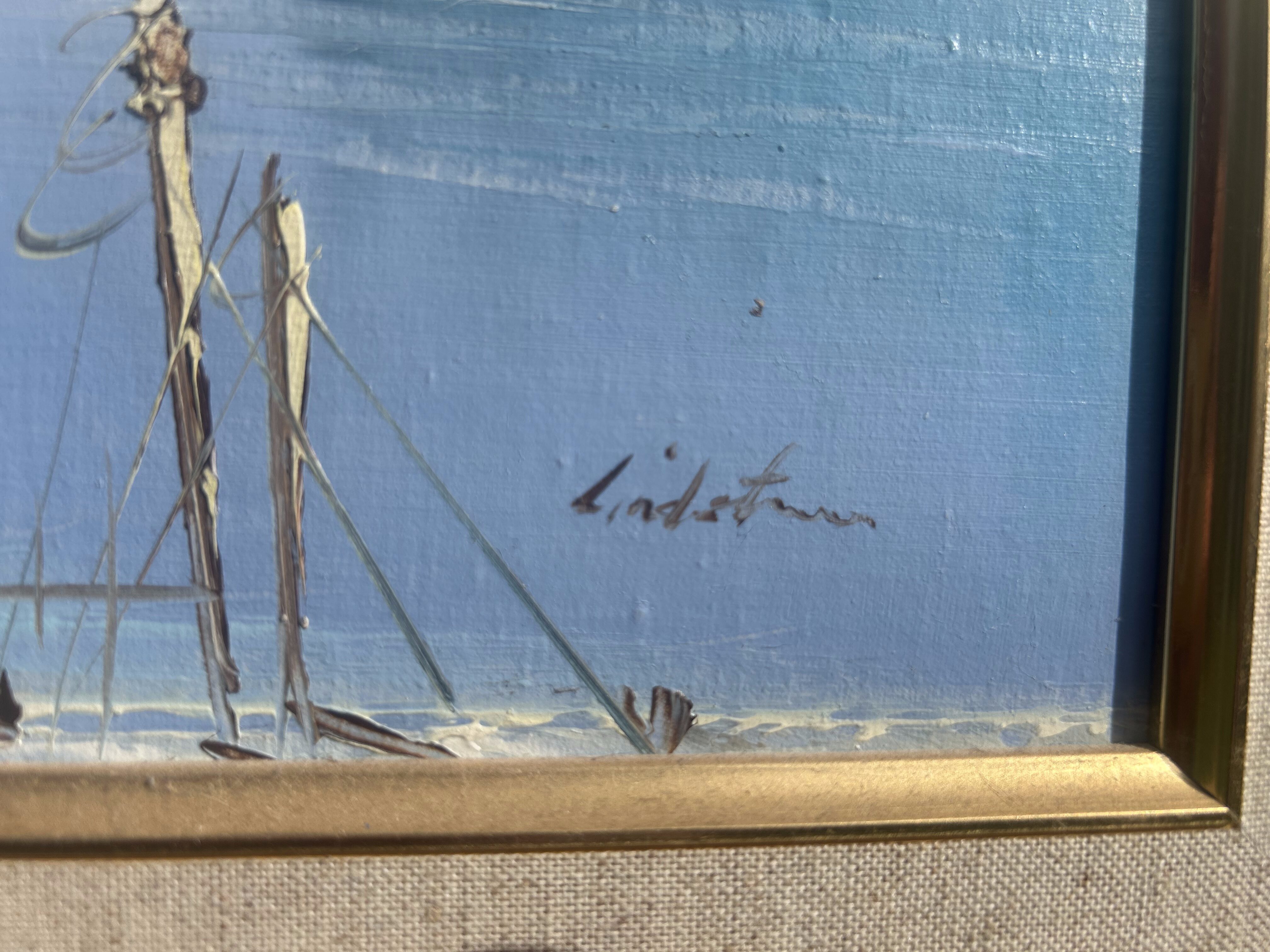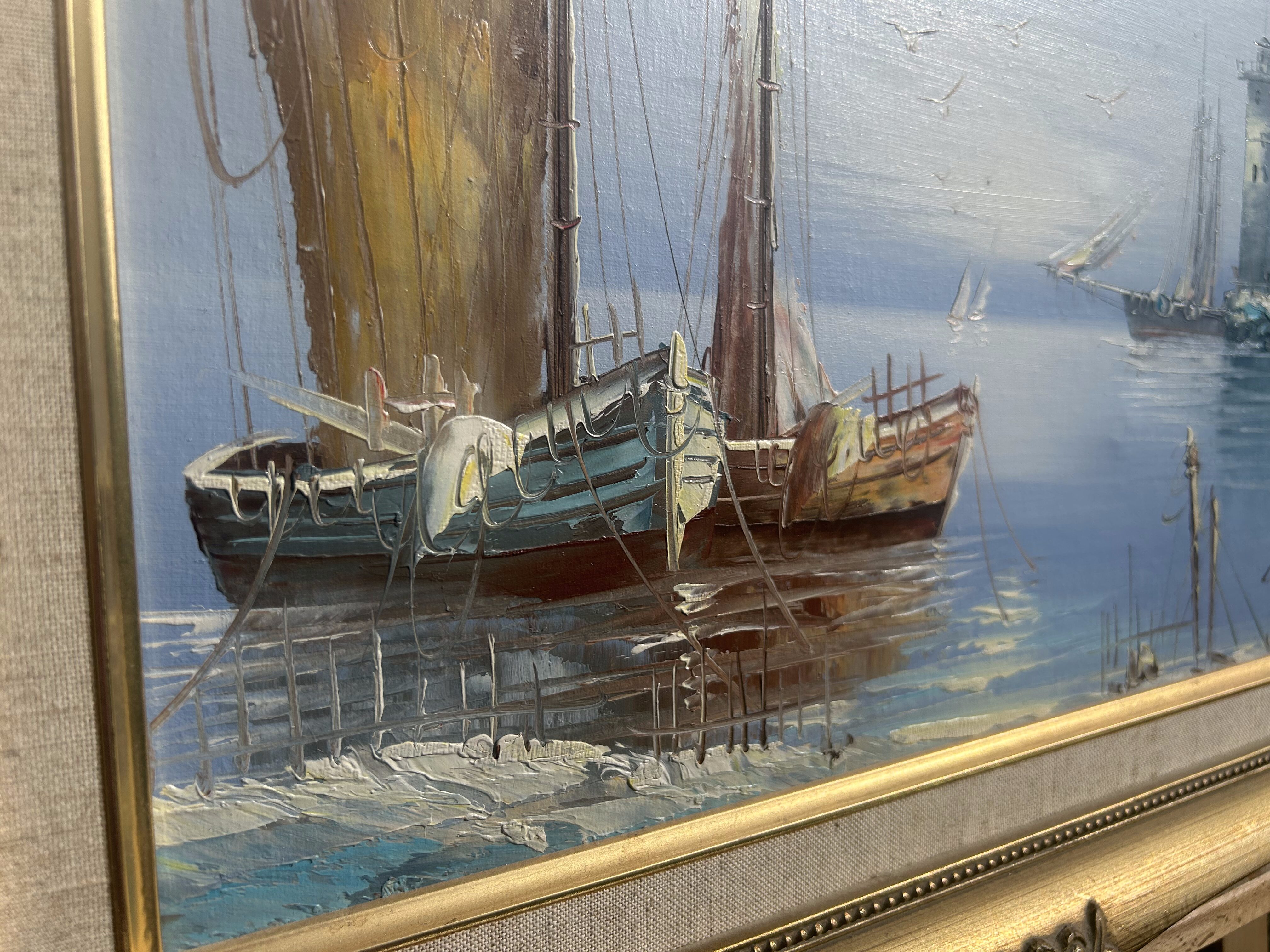 - Obraz olejny – Łodzie w porcie – Lasse Lindstrom – Olej na płótnie – Rzeźbiona rama