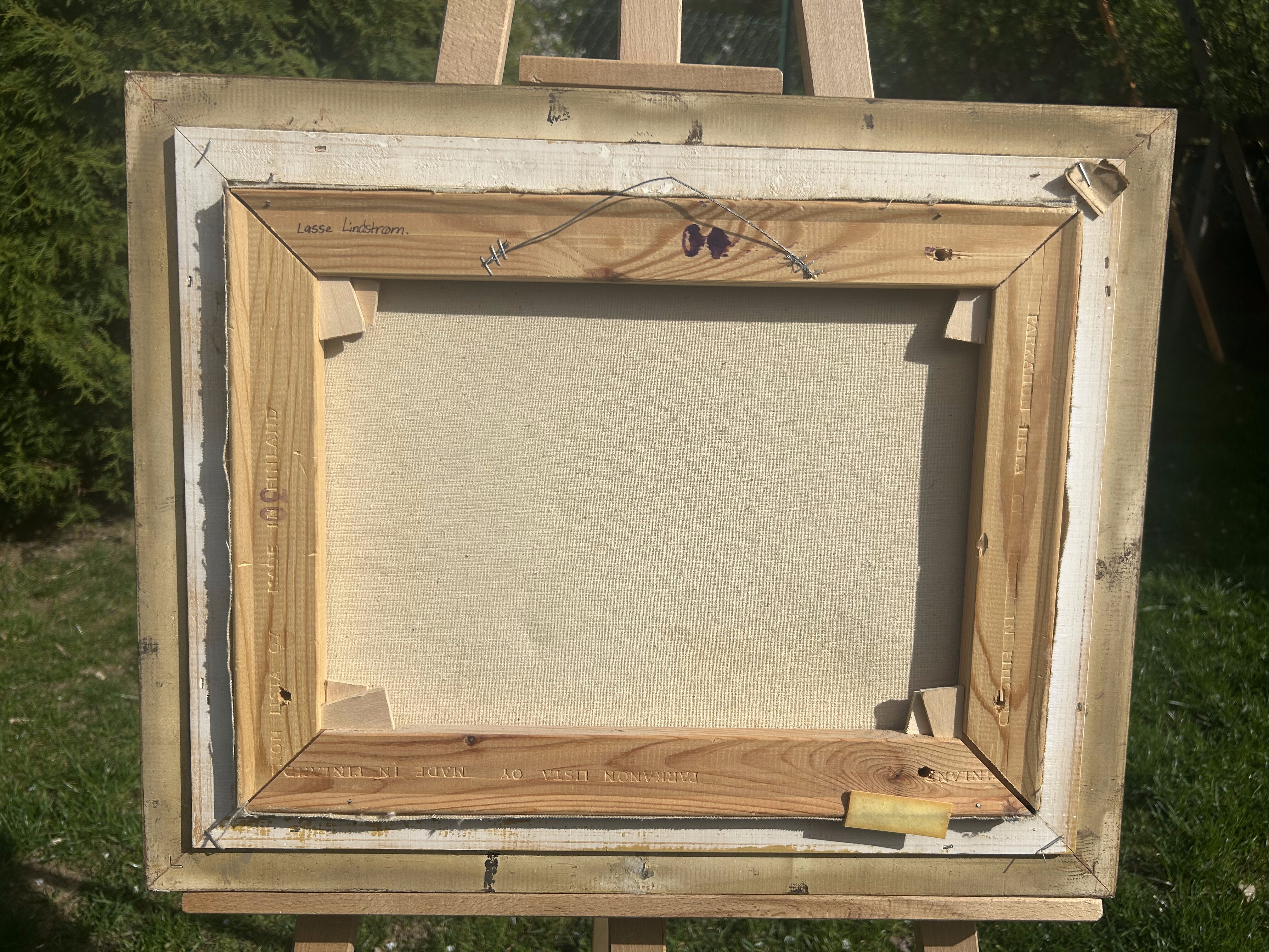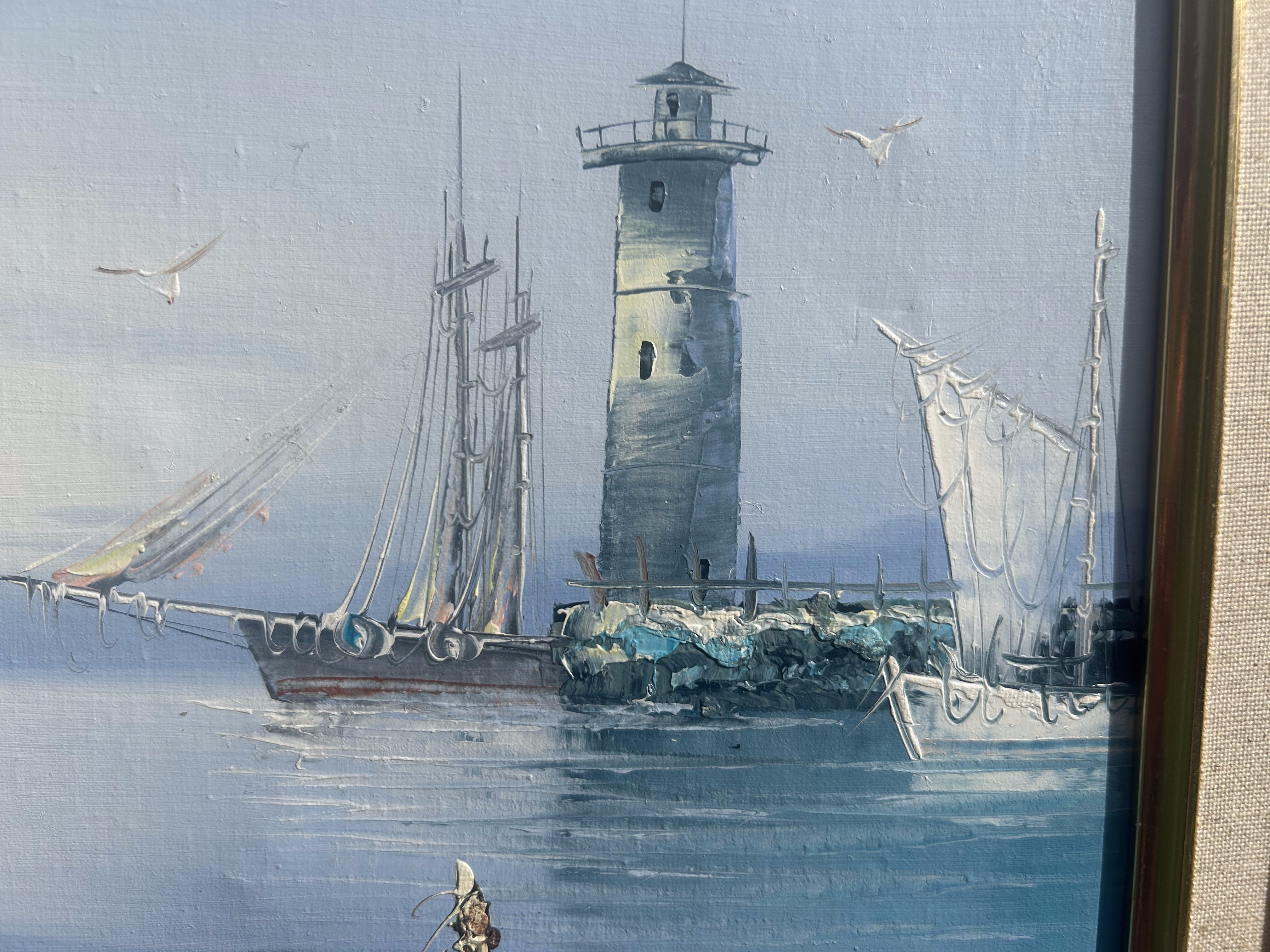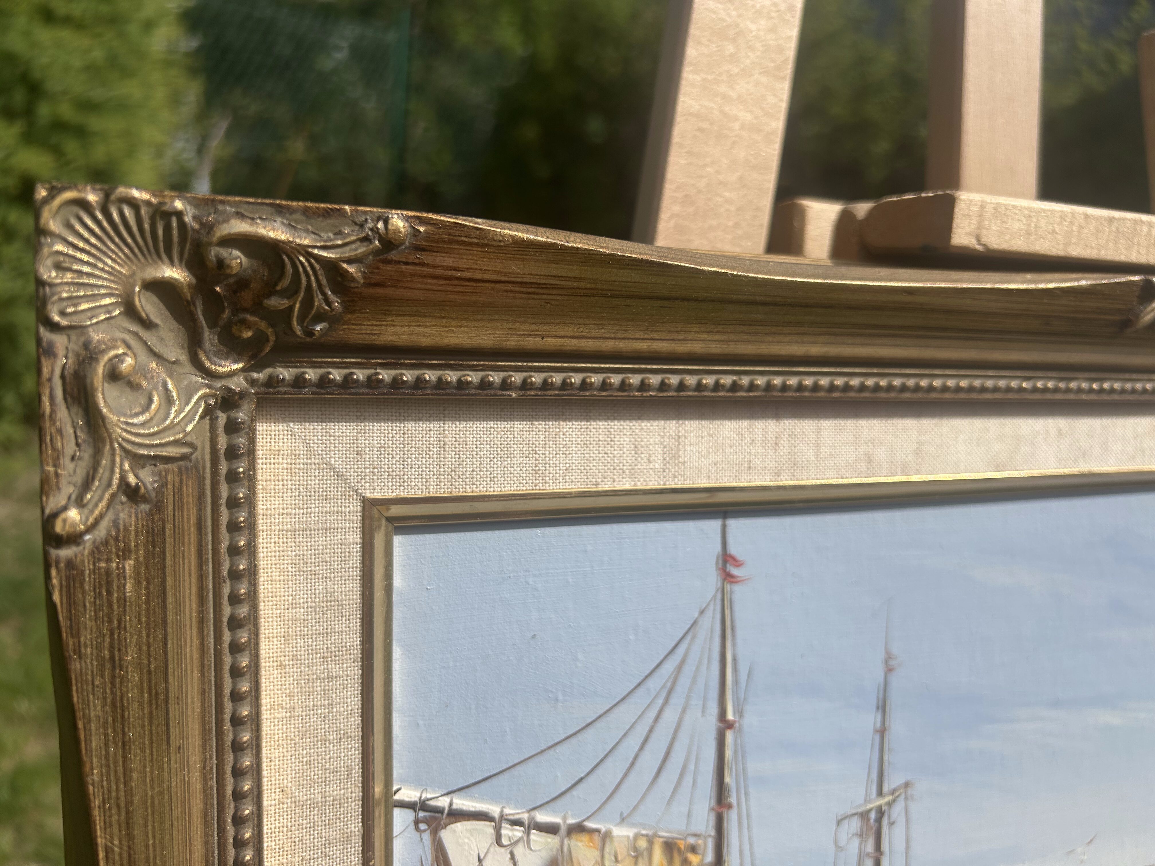 Dzieło sygnowane przez autora – Lasse Lindstrom, znanego z marynistycznych motywów. Całość oprawiona w elegancką, drewnianą rzeźbioną ramę w odcieniach beżu i starego złota, która dodaje pracy szlachetnego wykończenia.