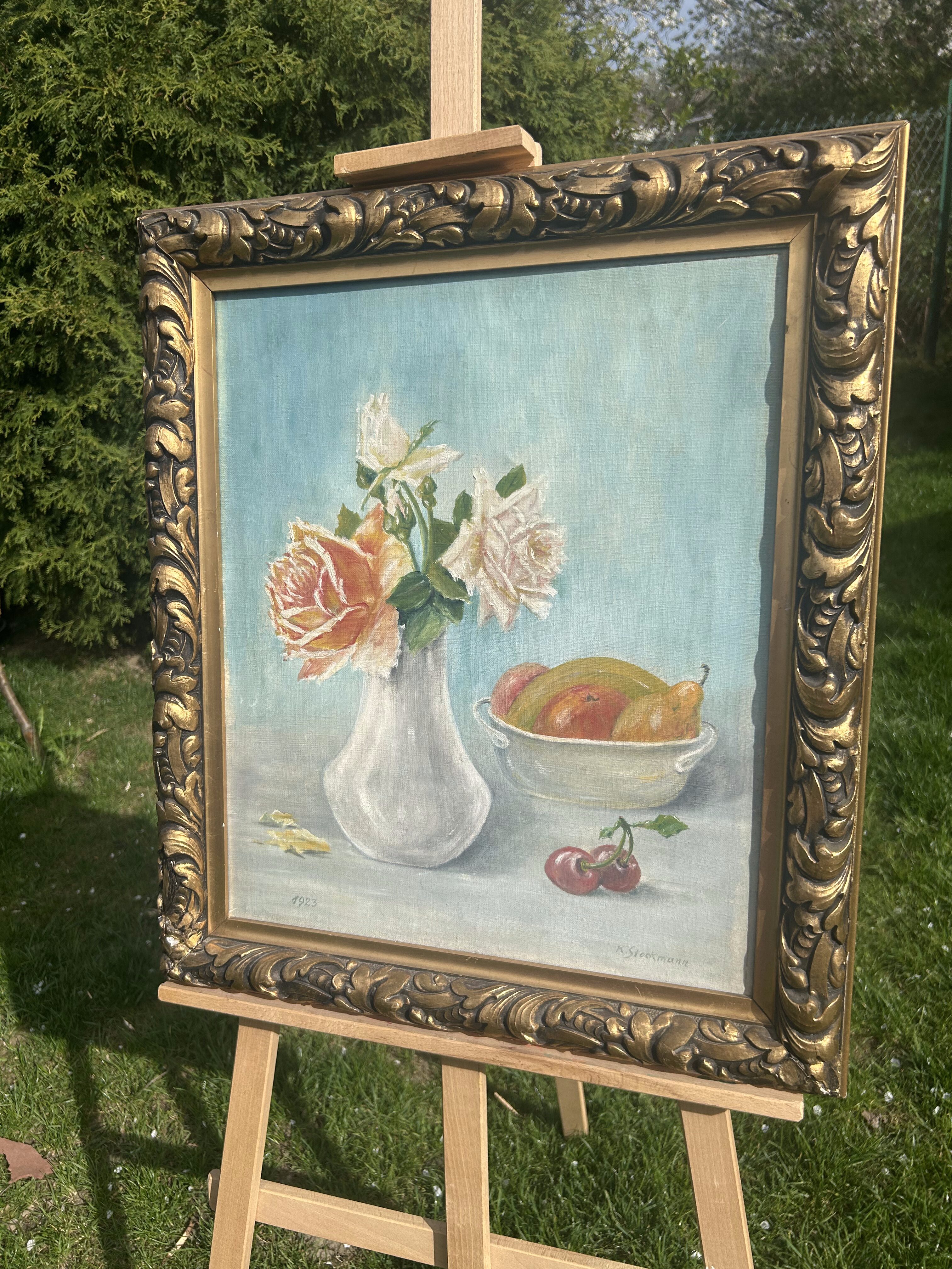 Obraz olejny – Martwa natura z kwiatami i owocami – 1923 – K. Stookmann – Olej na płótnie