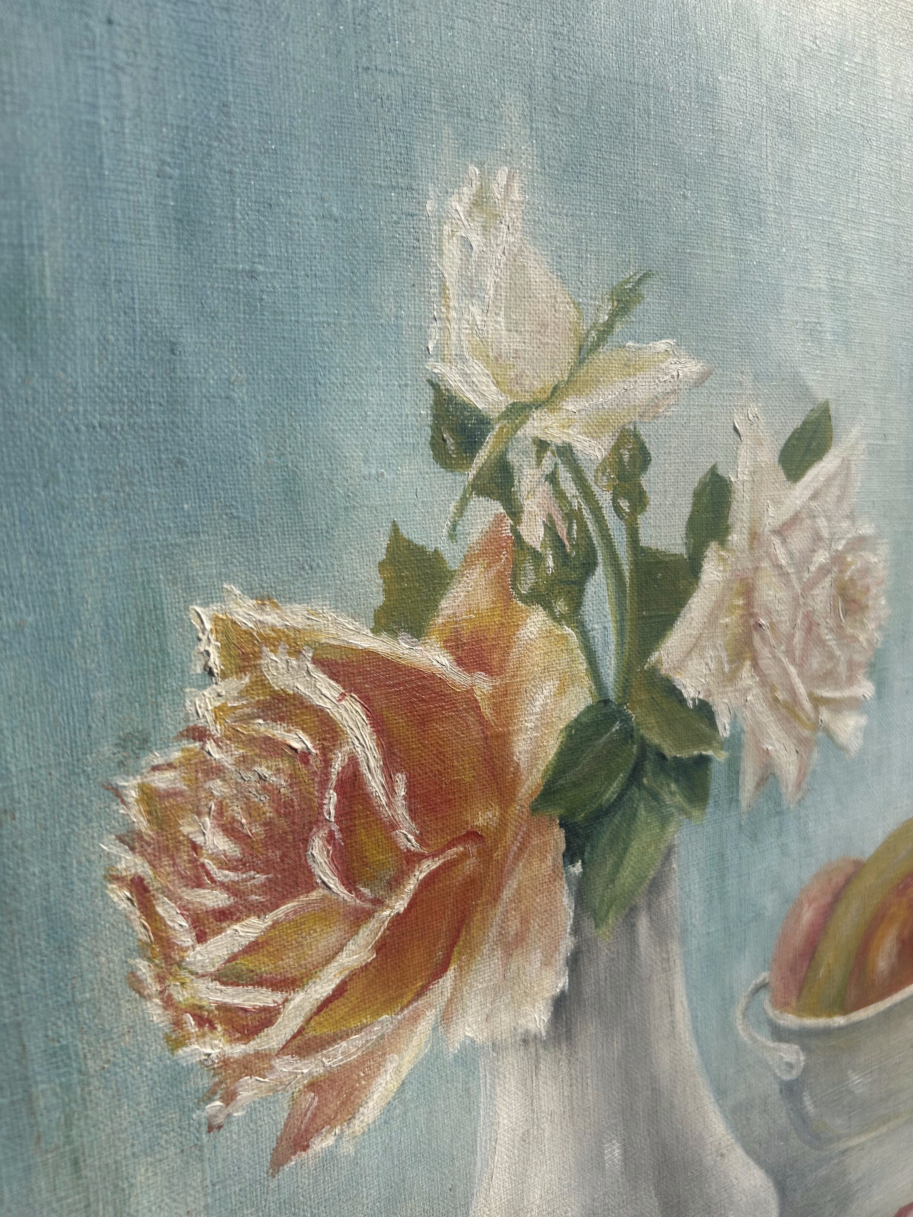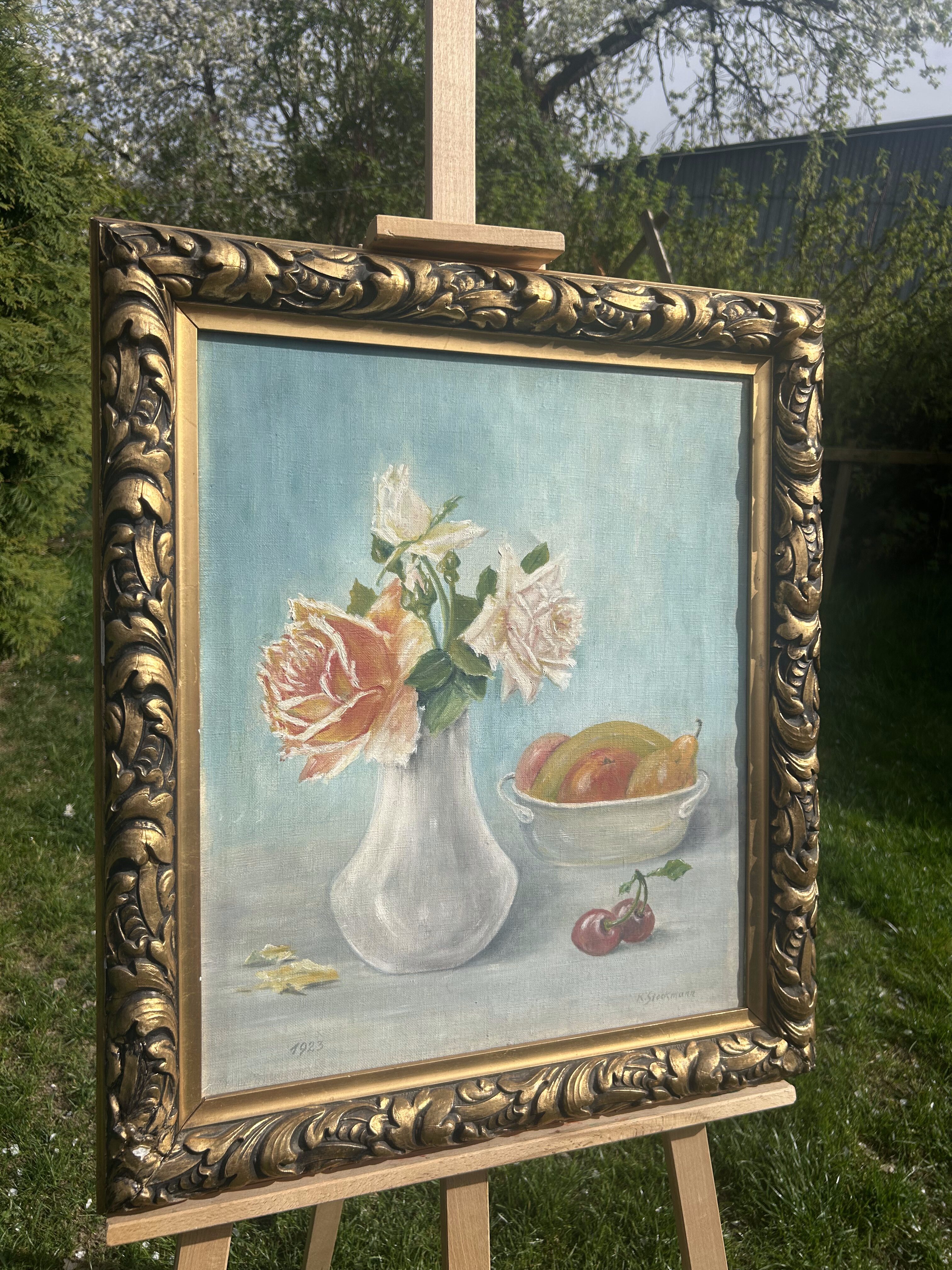 Elegancki, historyczny obraz olejny na płótnie z 1923 roku, autorstwa K. Stookmanna, przedstawiający klasyczną martwą naturę: białą wazę z różami oraz misę pełną owoców, ustawione na tle jasnego stołu. Kompozycja zachwyca delikatnością detalu, subtelnym światłocieniem i spokojną kolorystyką, która wprowadza do wnętrza harmonię i przytulność.