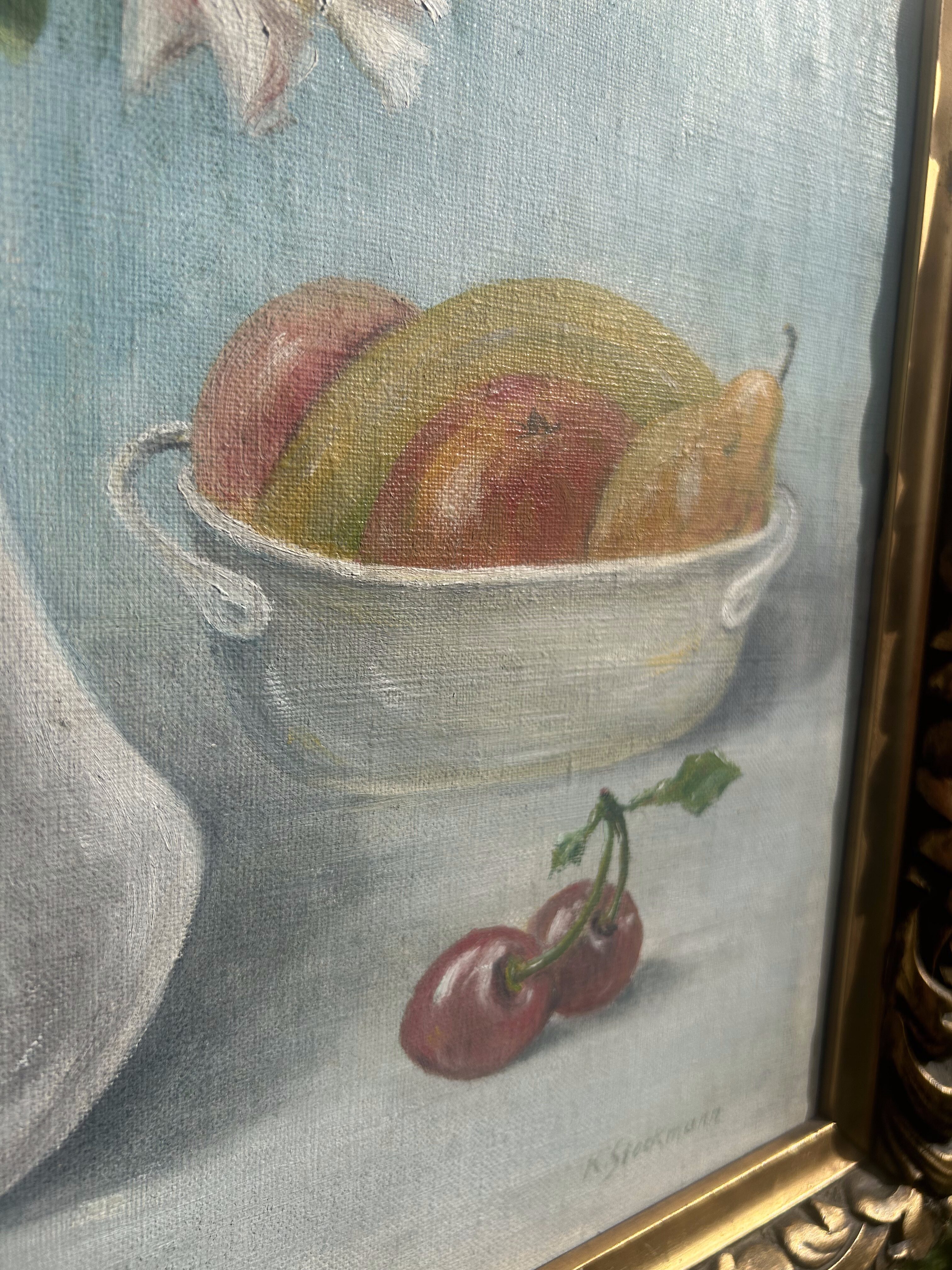 - Obraz olejny – Martwa natura z kwiatami i owocami – 1923 – K. Stookmann – Olej na płótnie