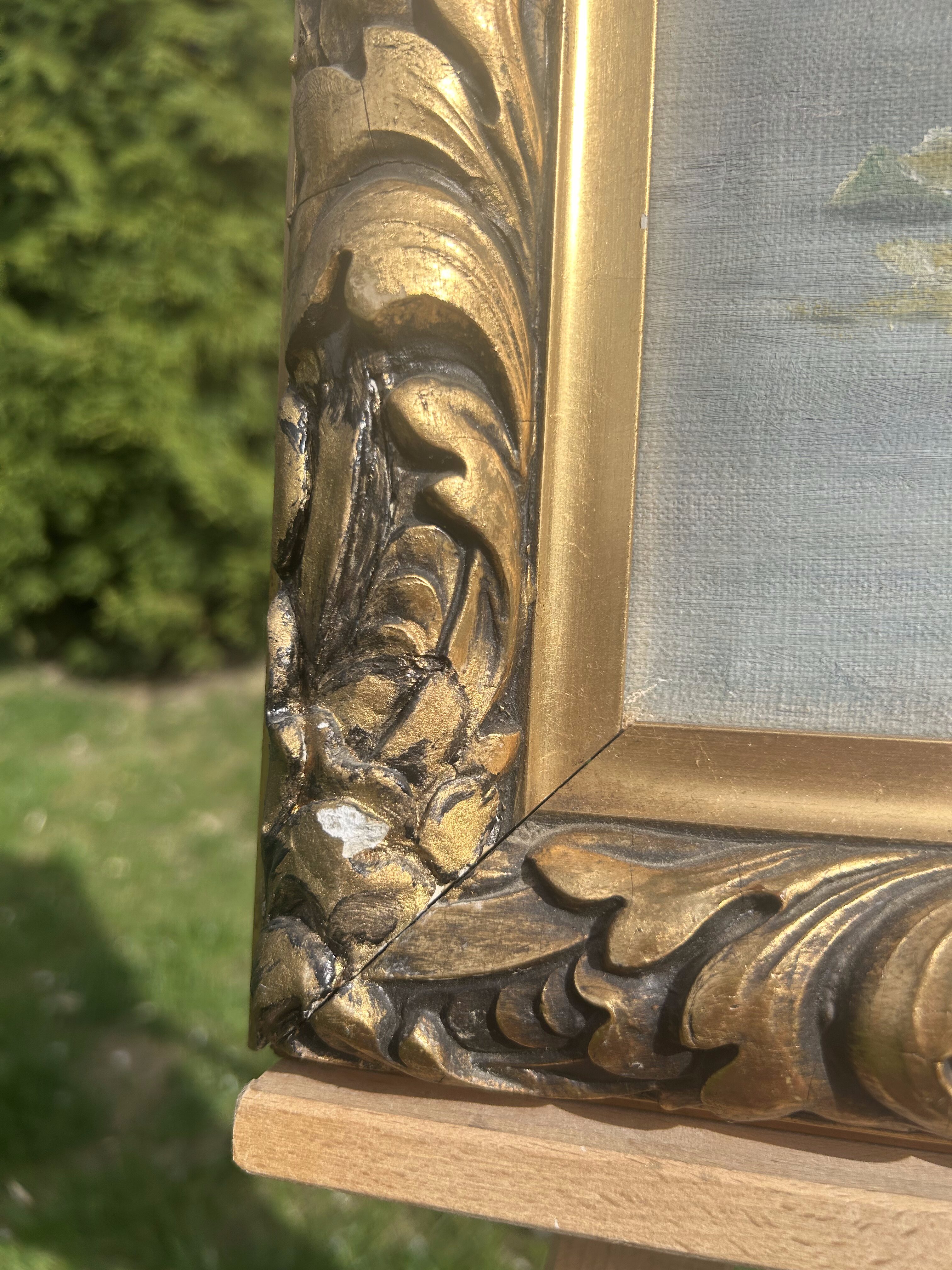 Obraz oprawiony w efektowną, rzeźbioną drewnianą ramę z motywem liści, która pięknie podkreśla charakter dzieła.
