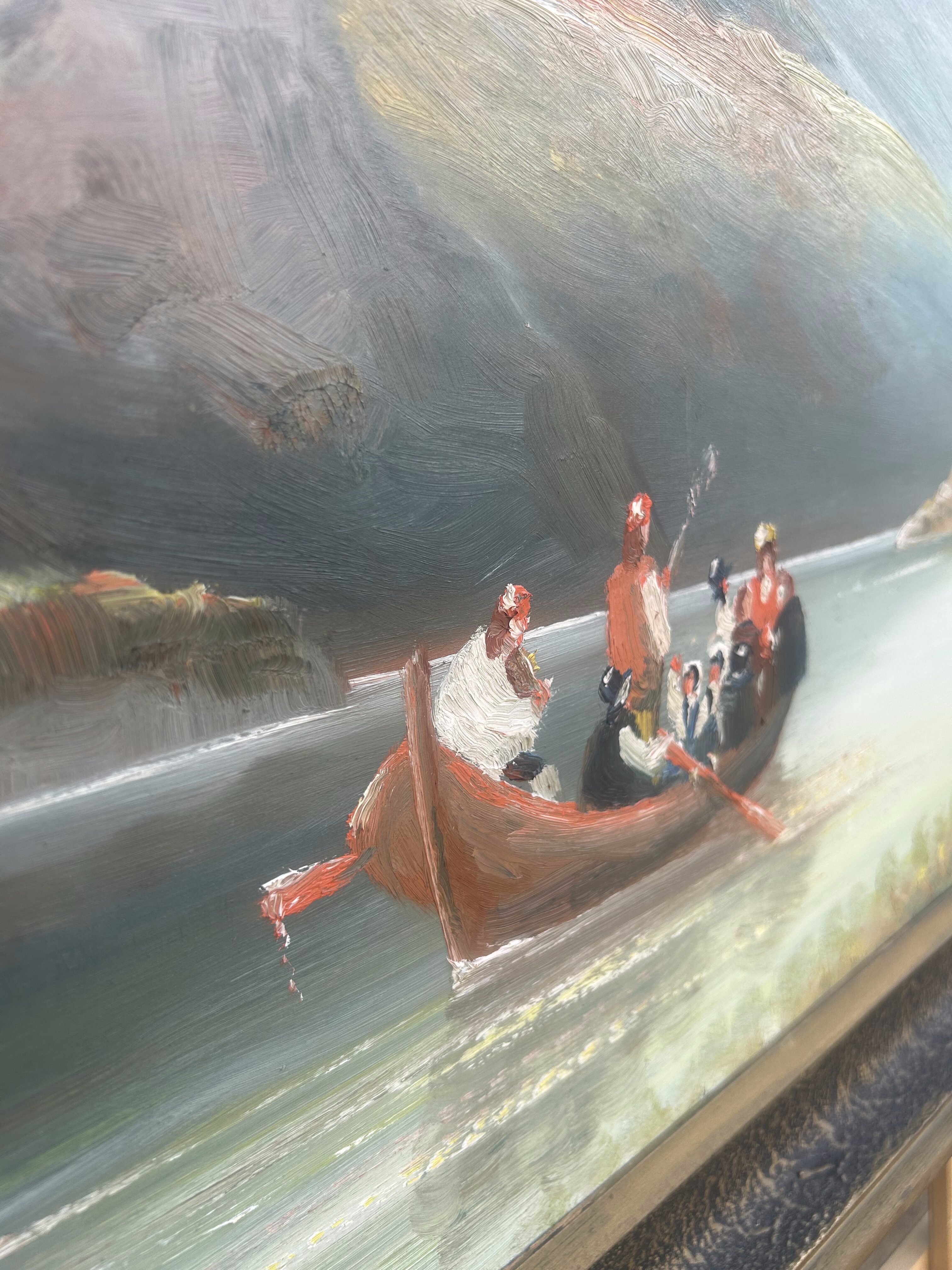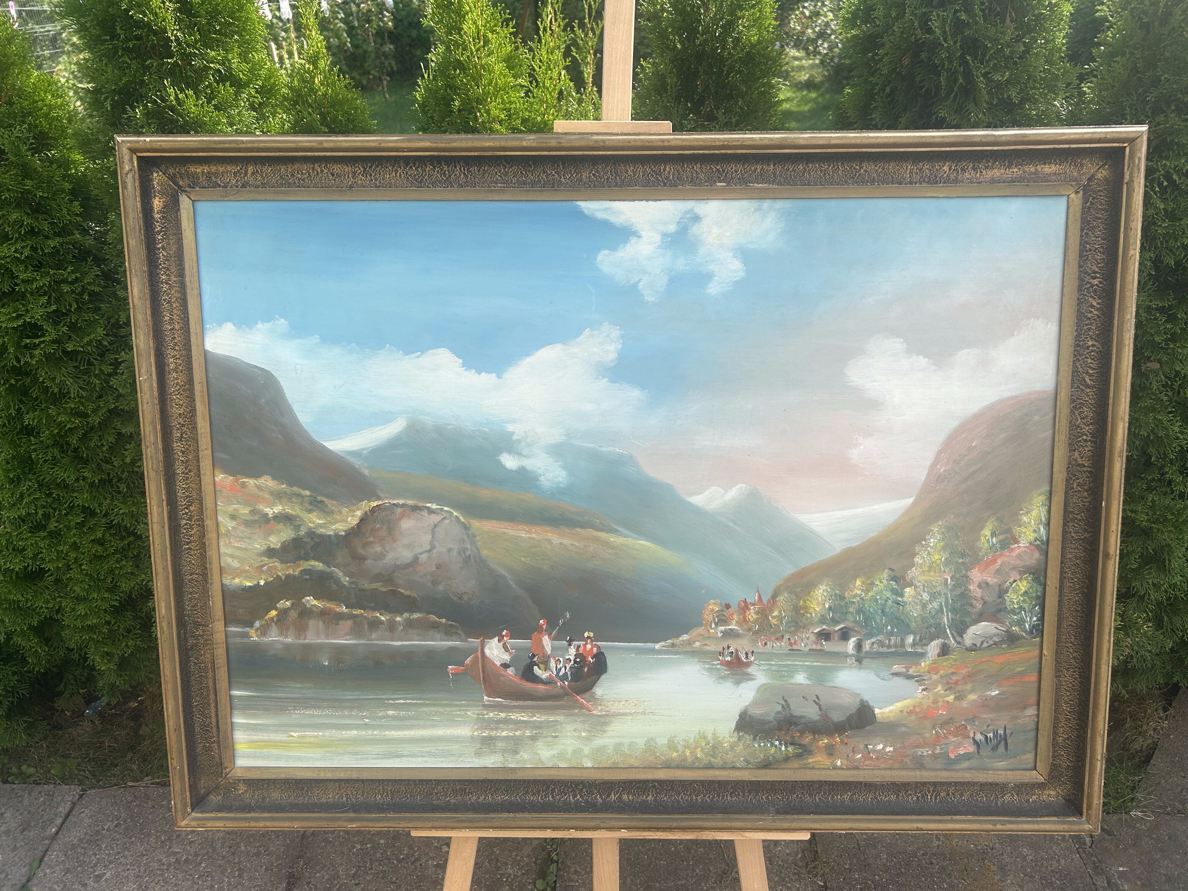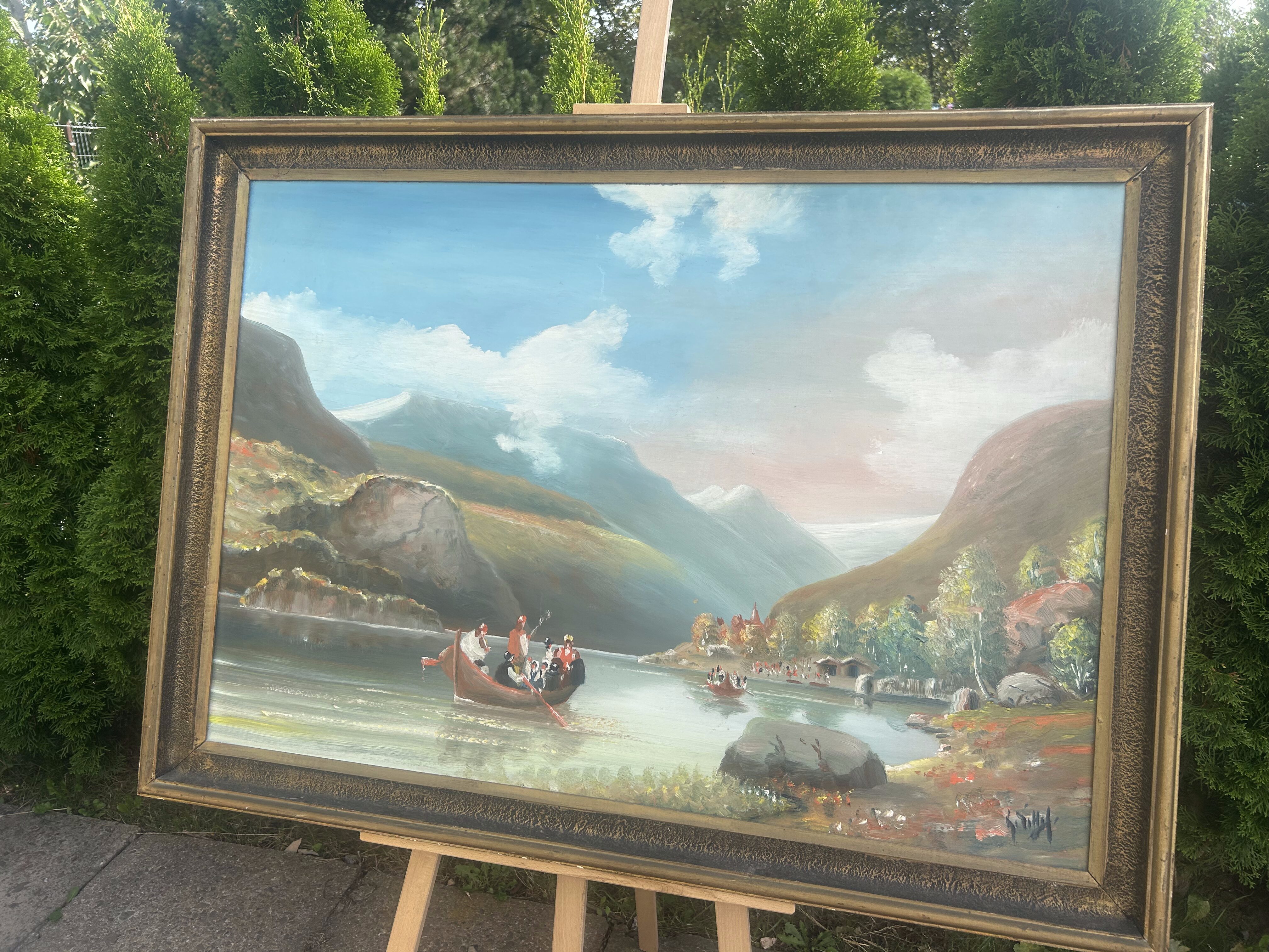 Wyjątkowy, monumentalny obraz olejny malowany na desce, przedstawiający pełen uroku pejzaż górski z krystalicznym jeziorem. Na tafli wody unoszą się łodzie wypełnione ludźmi, co dodaje scenie życia i dynamiki, a tło stanowią majestatyczne góry oświetlone miękkim światłem nieba. Dzieło urzeka rozmachem, detalami oraz harmonią barw, które tworzą niezwykle malowniczą kompozycję. Obraz sygnowany jest nieczytelnym podpisem autora. Solidna rama w stylu klasycznym dopełnia całości, czyniąc go gotowym do ekspozycji. Idealny wybór dla miłośników sztuki pejzażowej i kolekcjonerów unikalnych prac.