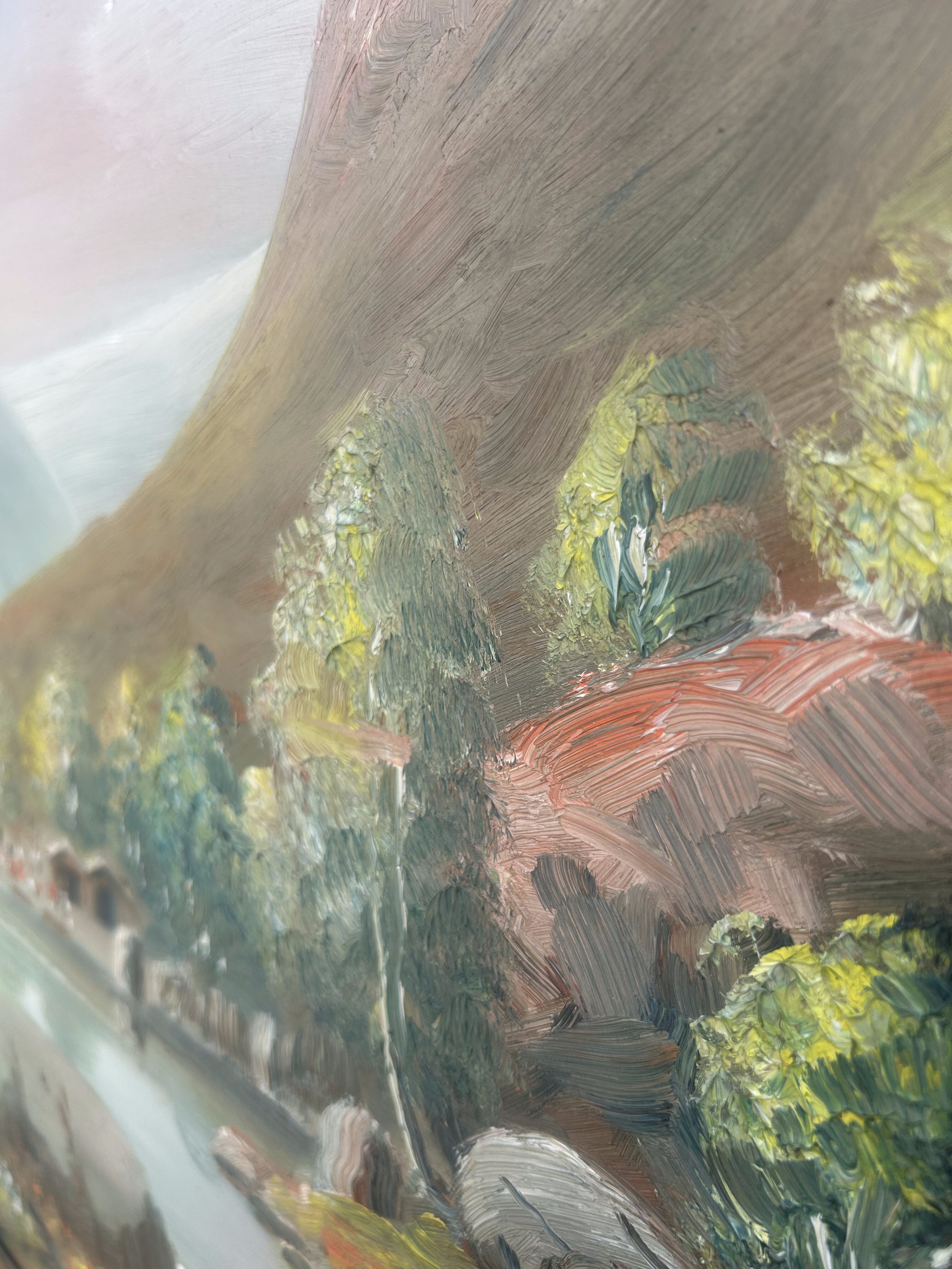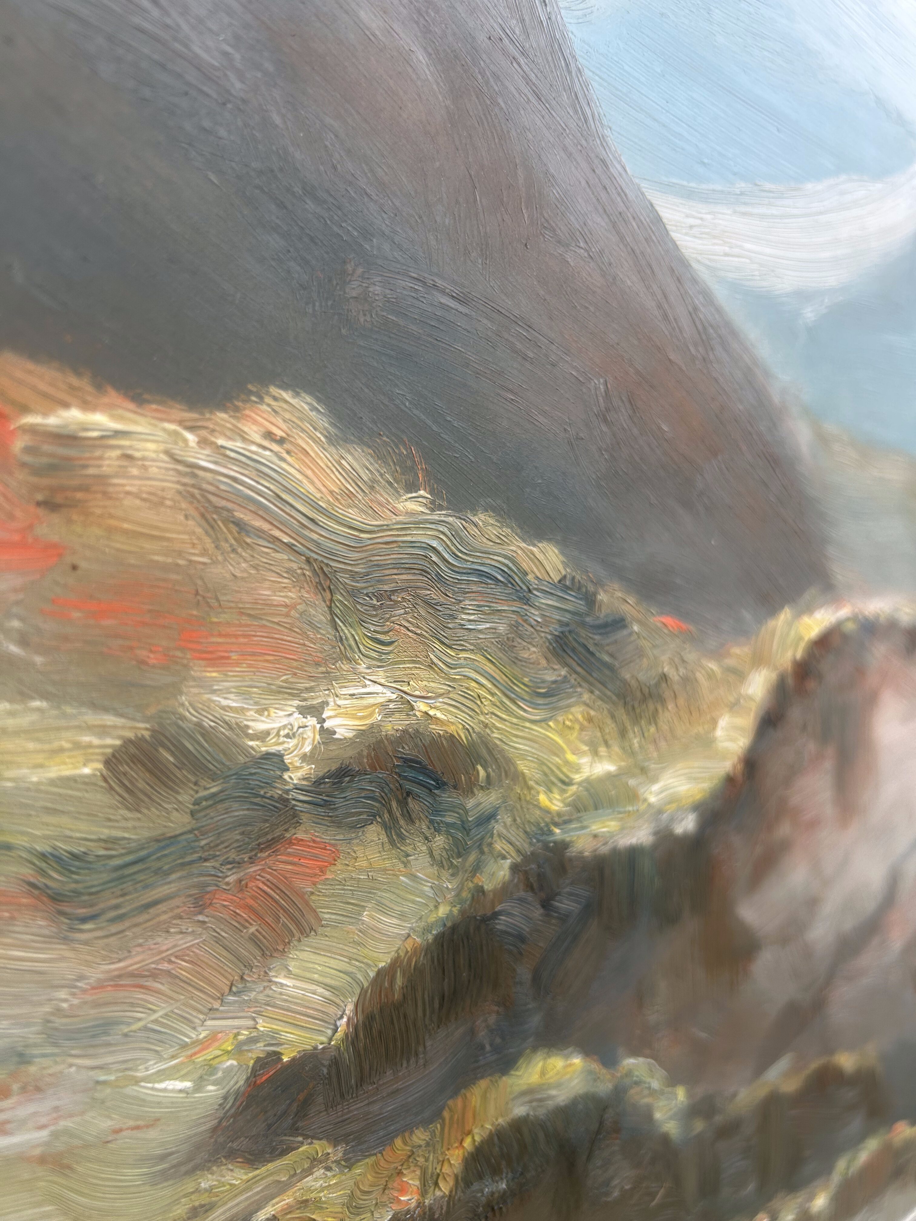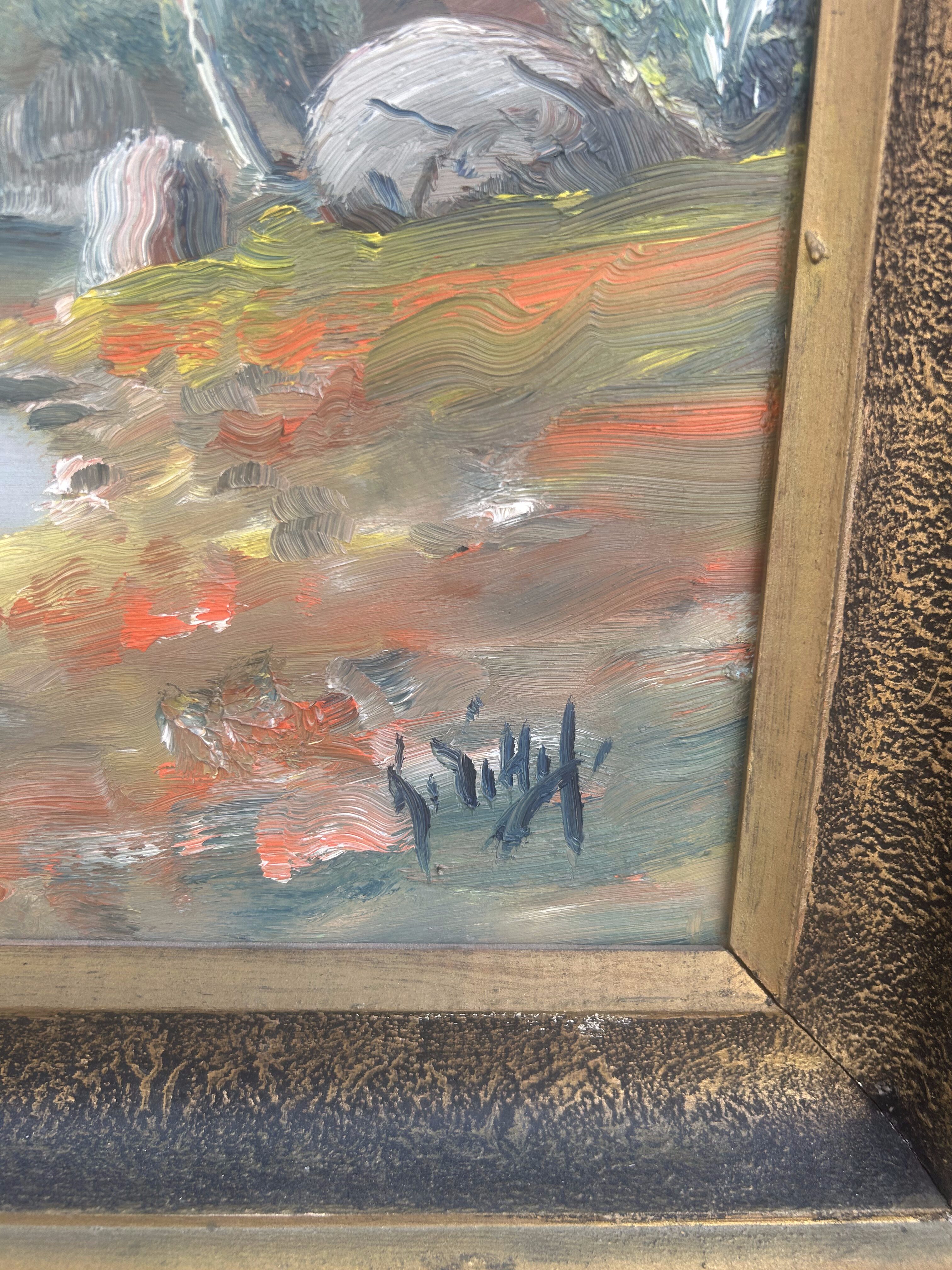 Wyjątkowy, monumentalny obraz olejny malowany na desce, przedstawiający pełen uroku pejzaż górski z krystalicznym jeziorem. Na tafli wody unoszą się łodzie wypełnione ludźmi, co dodaje scenie życia i dynamiki, a tło stanowią majestatyczne góry oświetlone miękkim światłem nieba. Dzieło urzeka rozmachem, detalami oraz harmonią barw, które tworzą niezwykle malowniczą kompozycję. Obraz sygnowany jest nieczytelnym podpisem autora. Solidna rama w stylu klasycznym dopełnia całości, czyniąc go gotowym do ekspozycji. Idealny wybór dla miłośników sztuki pejzażowej i kolekcjonerów unikalnych prac.