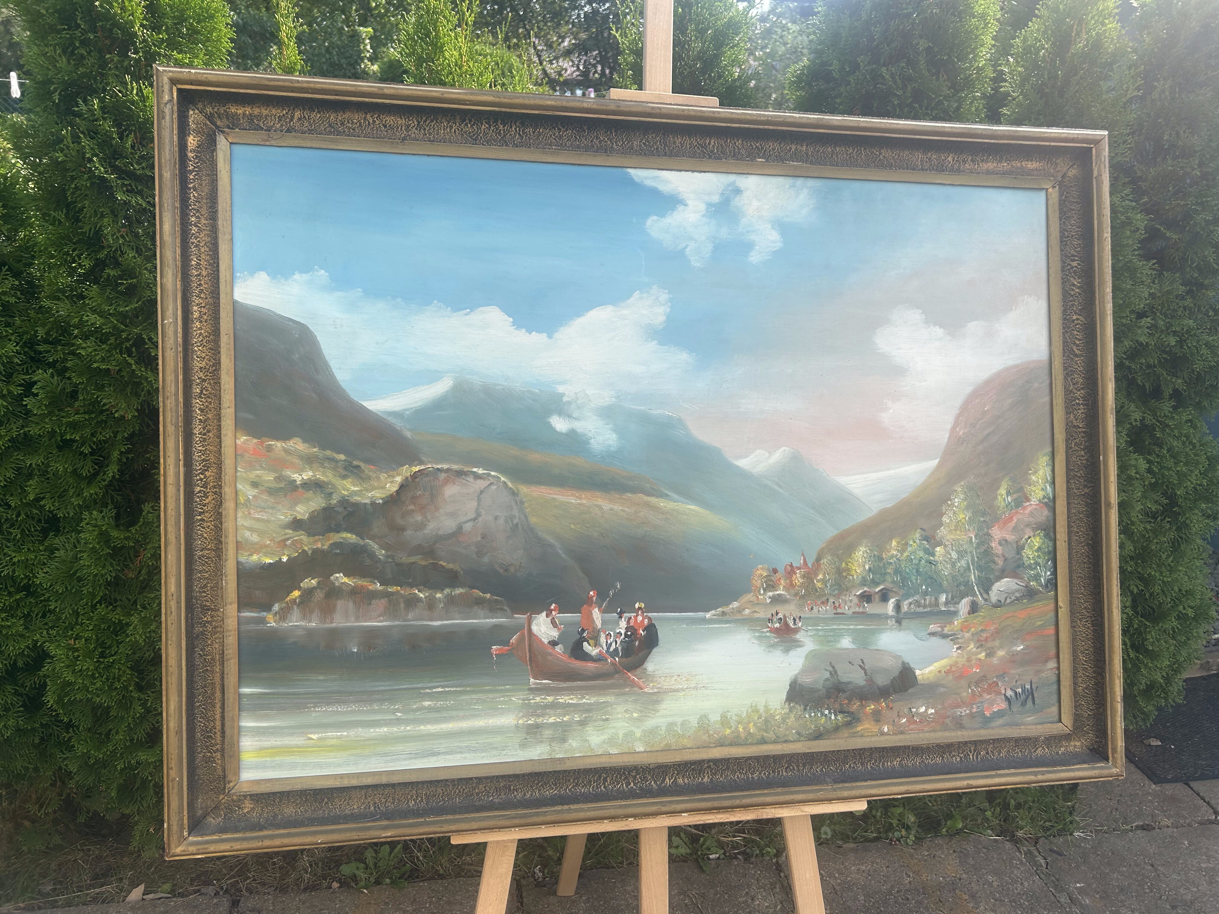- Obraz olejny na desce – Majestatyczny pejzaż górski z łodziami – 81 x 111,5 cm