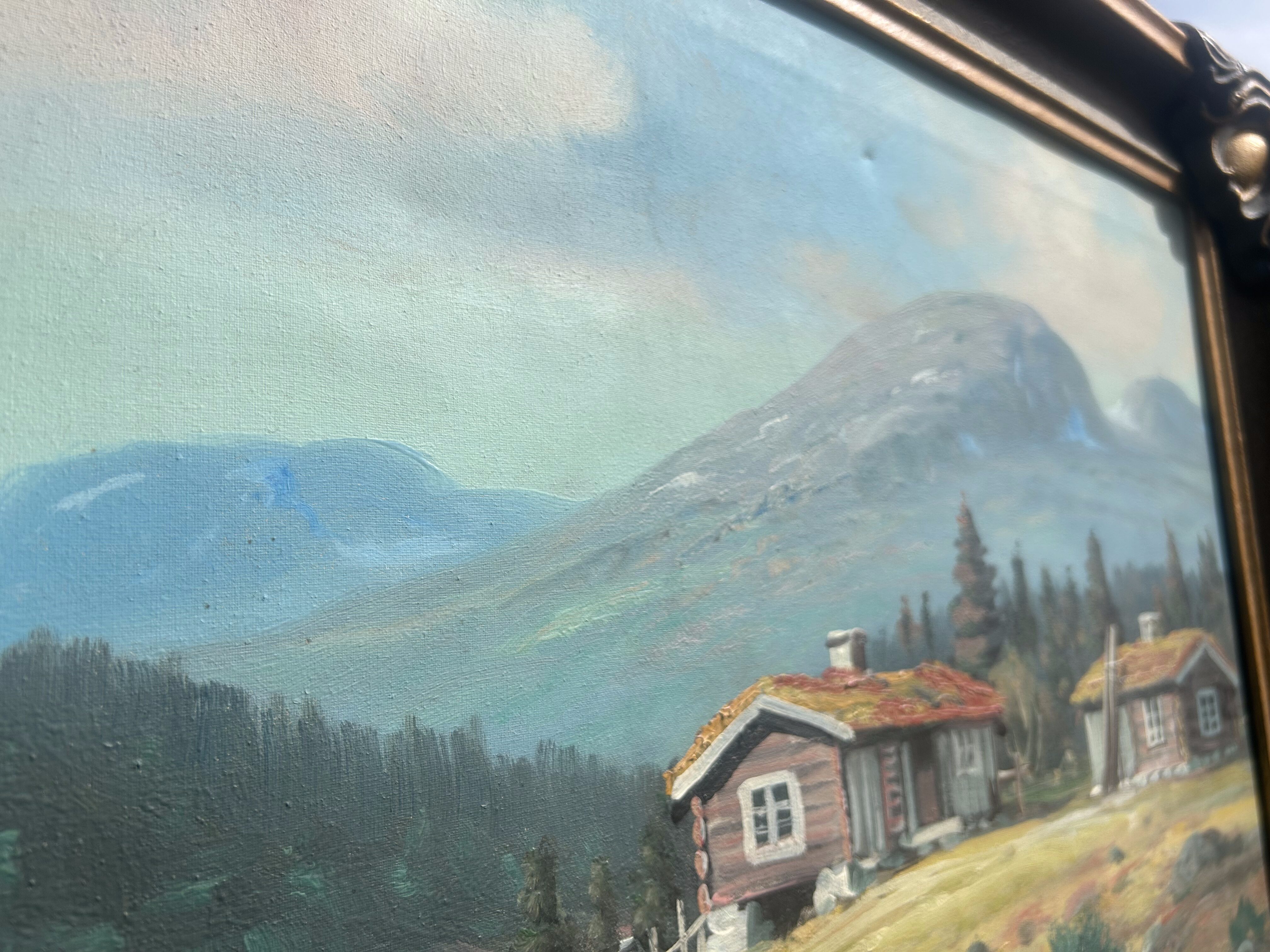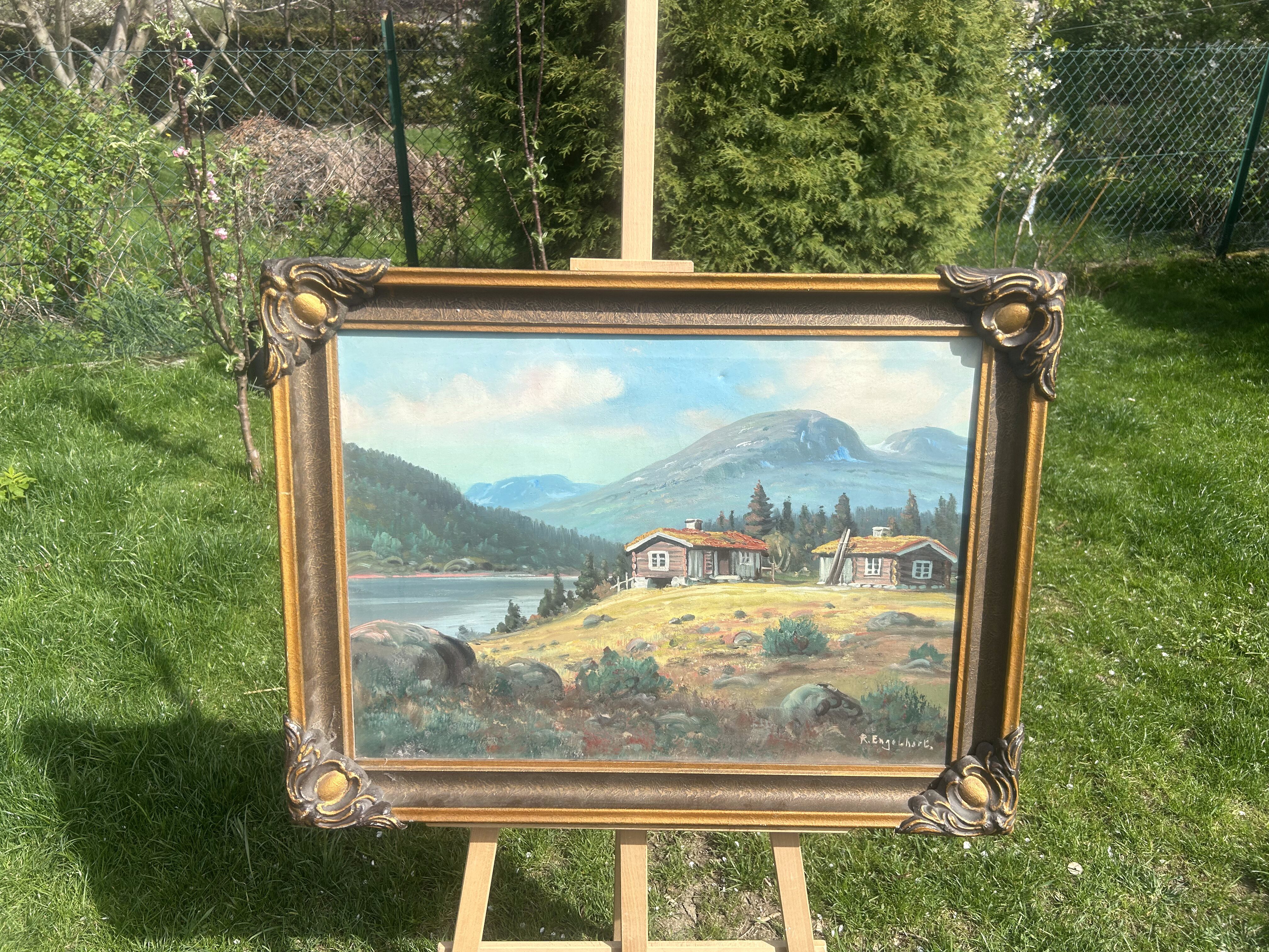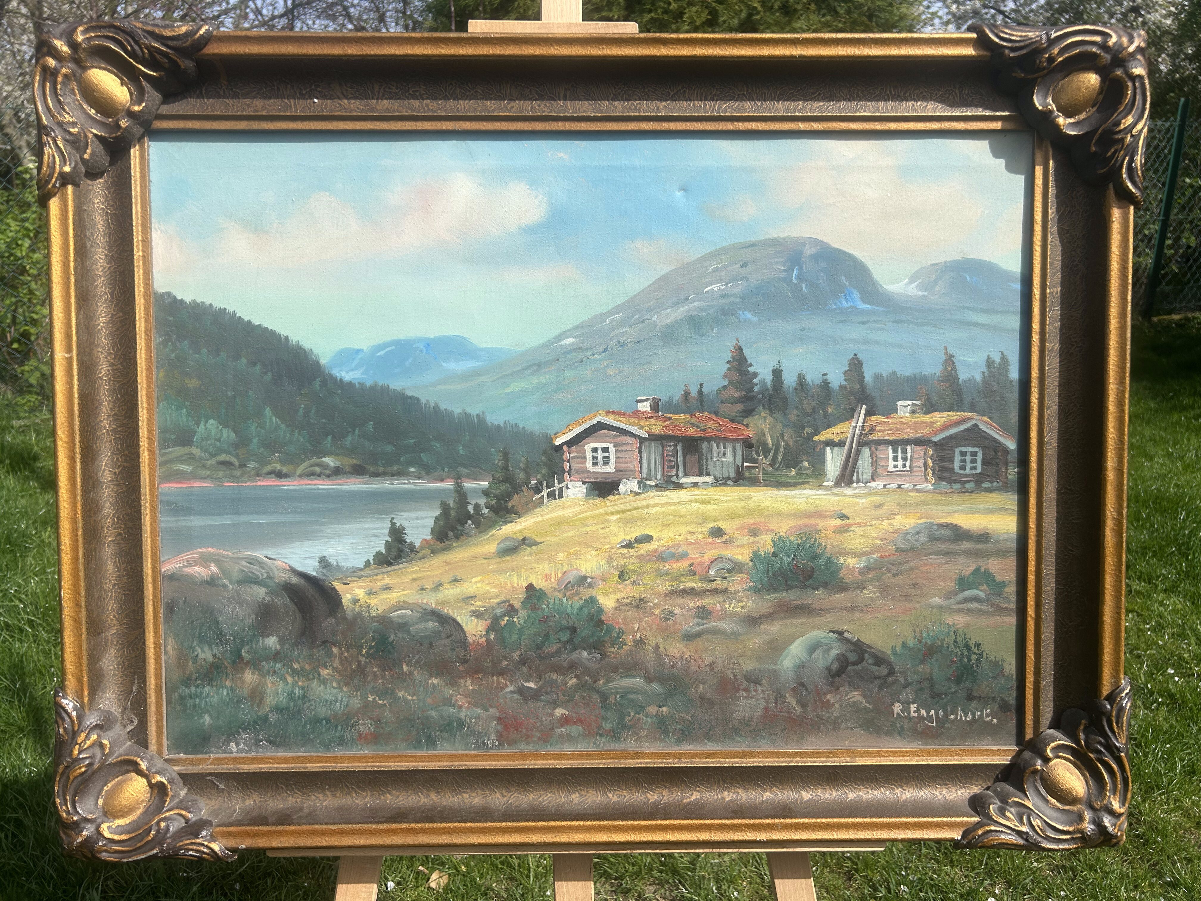 Malowniczy obraz olejny na płótnie, przedstawiający norweskie domki nad fiordem, z górami w tle. Sygnowany przez autora R. Engelhart. Obraz został osadzony w rzeźbionej, drewnianej ramie o dekoracyjnych narożnikach. Charakterystyczną cechą jest stare mocowanie płótna przybijanego gwoździami, co podkreśla jego wiek i autentyczność.