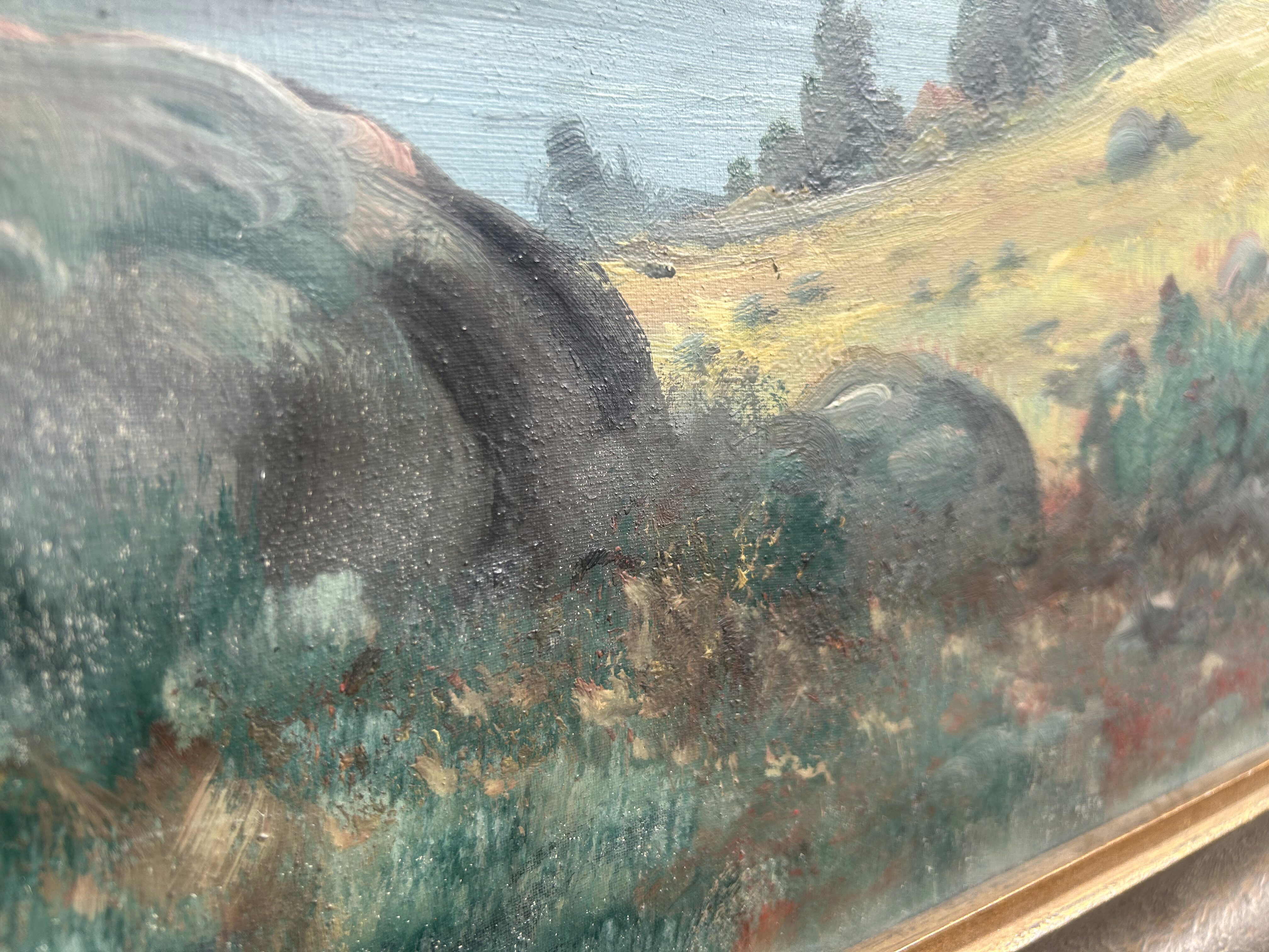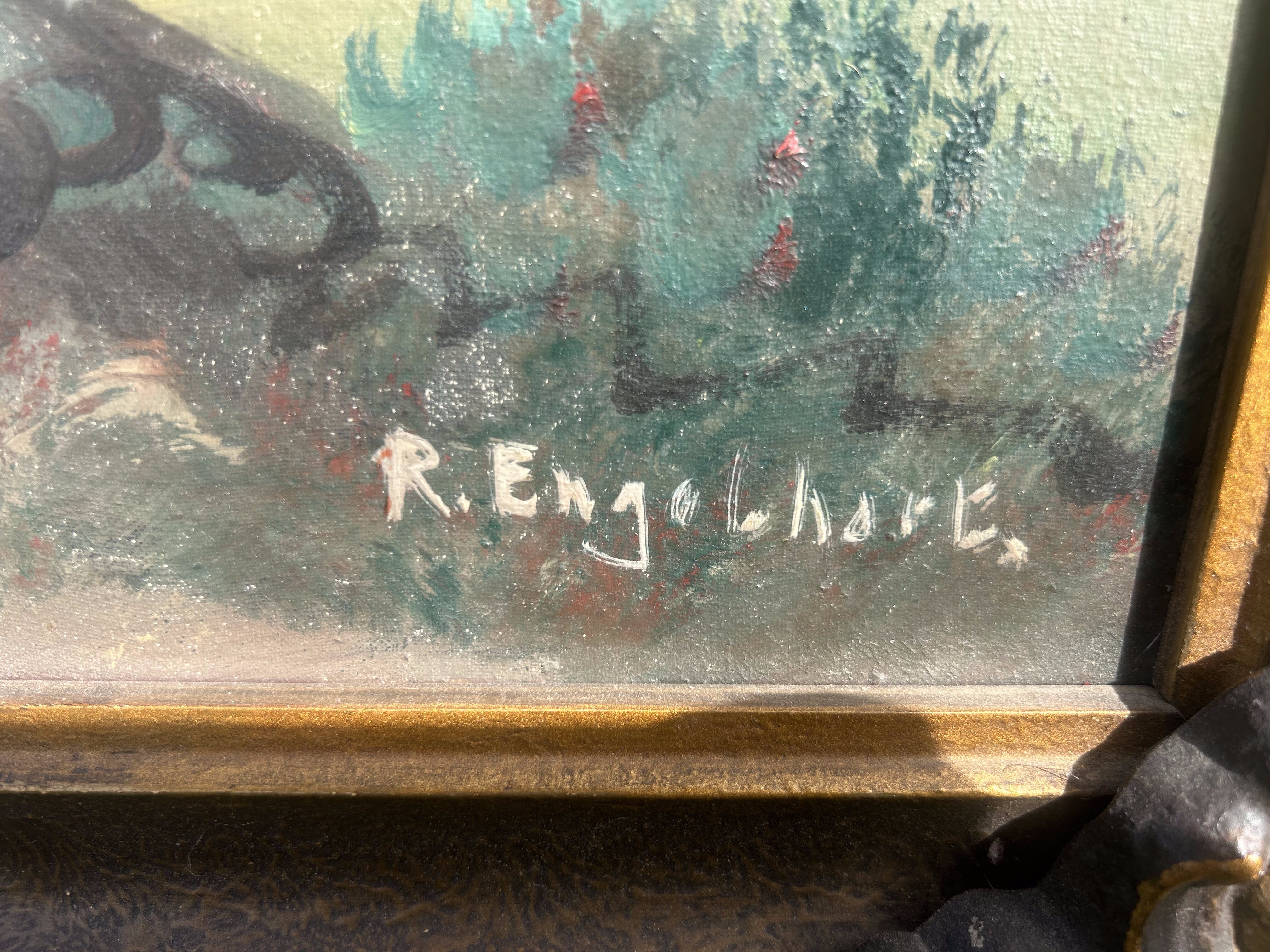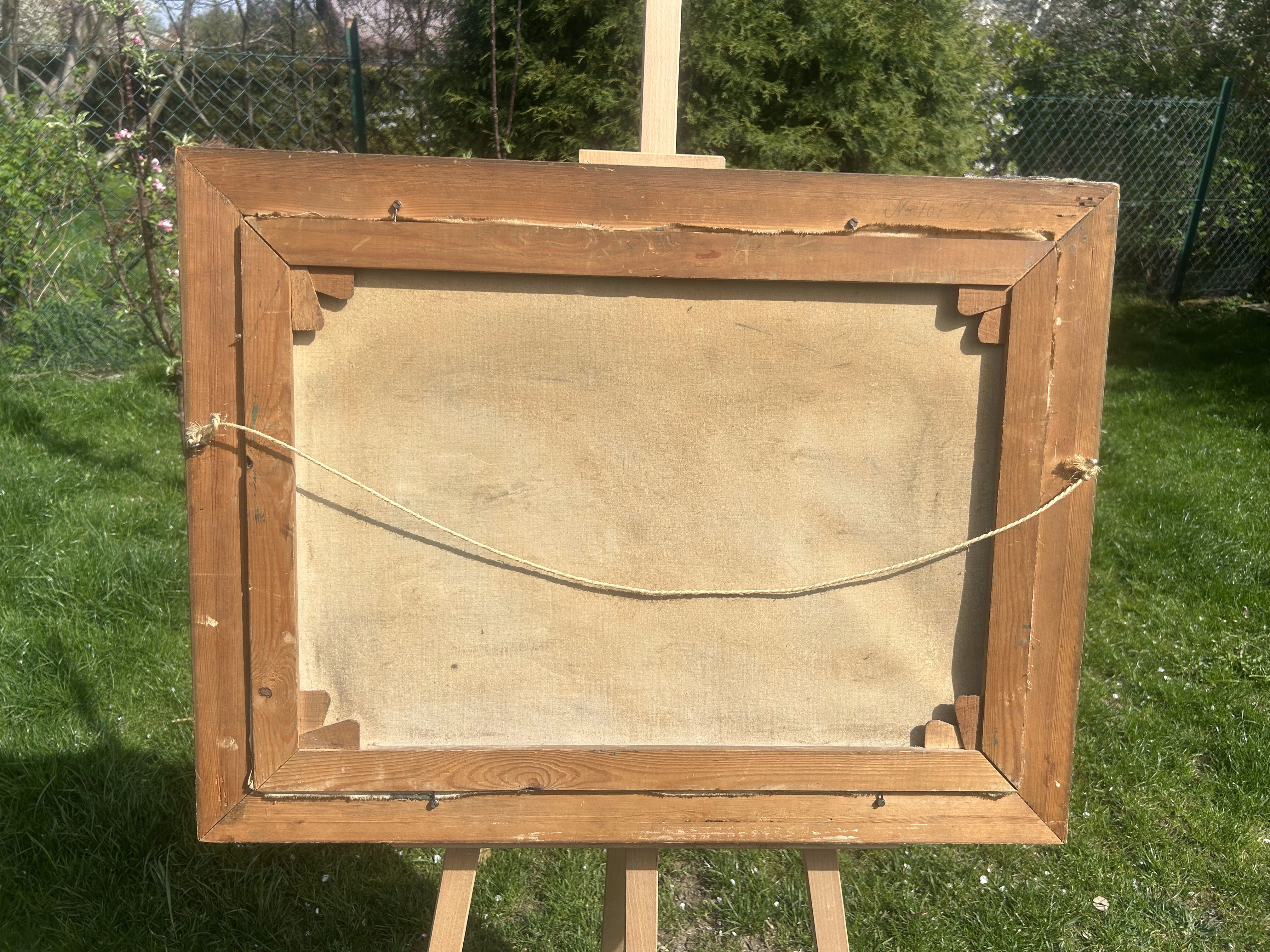 Malowniczy obraz olejny na płótnie, przedstawiający norweskie domki nad fiordem, z górami w tle. Sygnowany przez autora R. Engelhart. Obraz został osadzony w rzeźbionej, drewnianej ramie o dekoracyjnych narożnikach. Charakterystyczną cechą jest stare mocowanie płótna przybijanego gwoździami, co podkreśla jego wiek i autentyczność.
