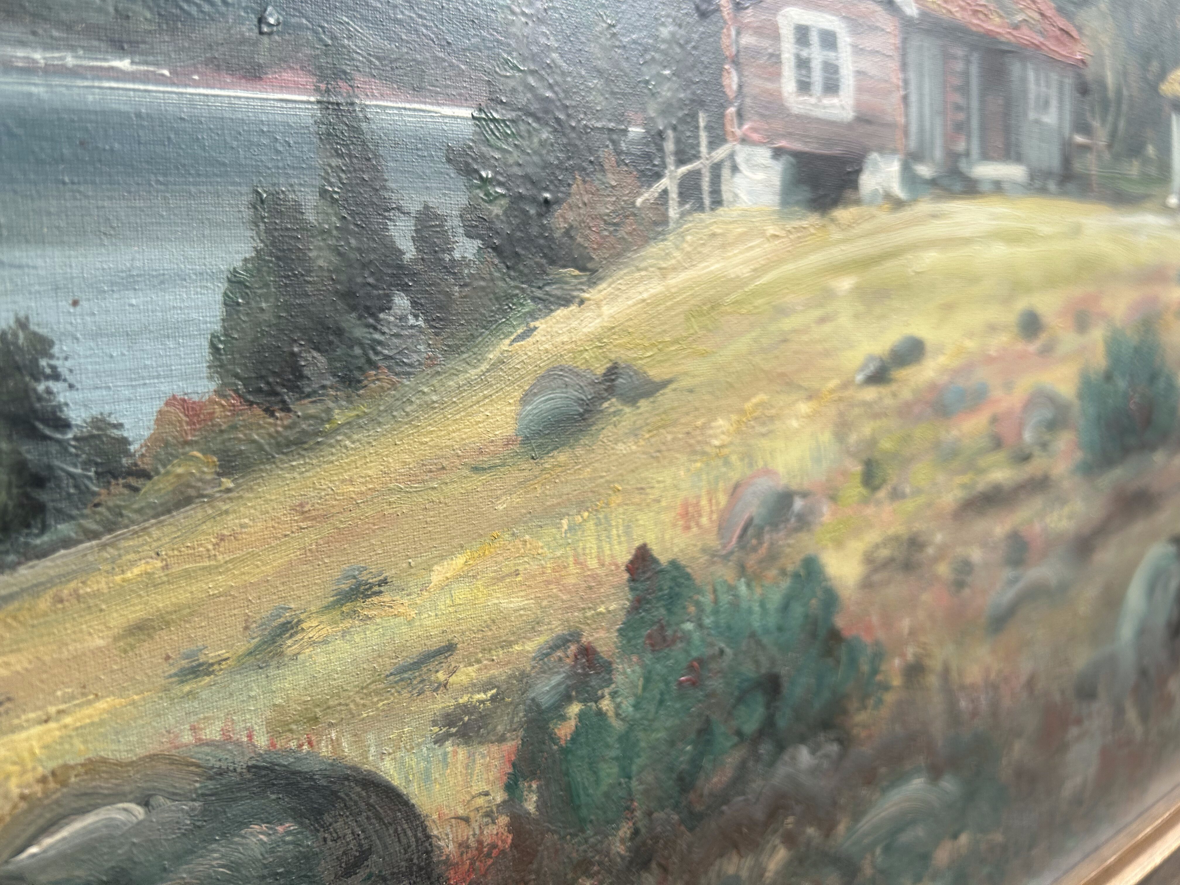 - Obraz olejny na płótnie – Domki nad fiordem – R. Engelhart – Rzeźbiona rama