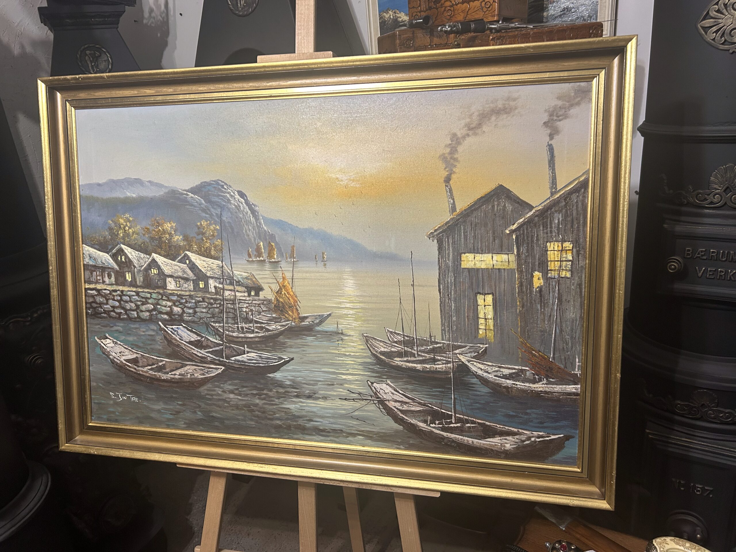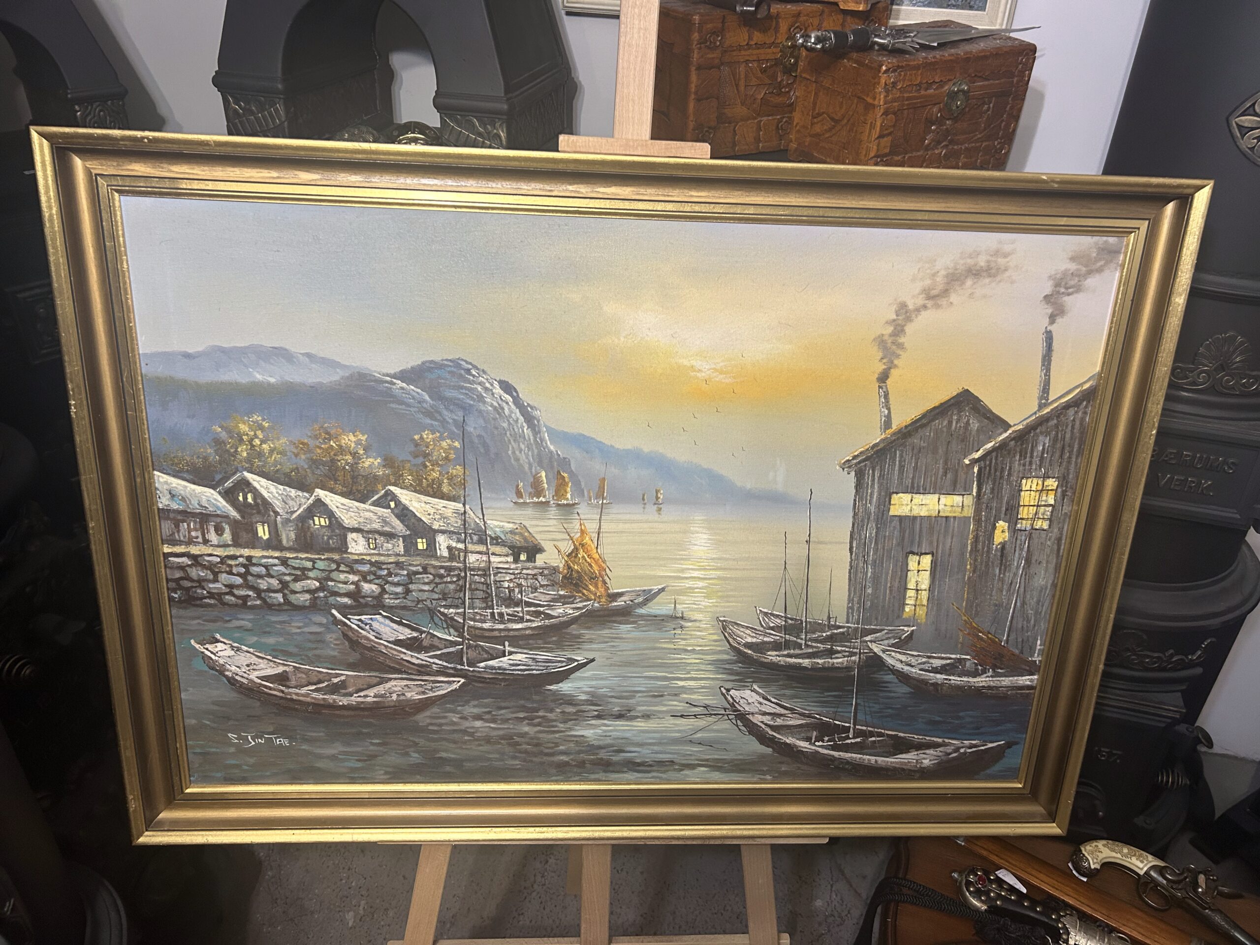- Obraz olejny „Statki w porcie przy zachodzie słońca” – Suh Jin Tae