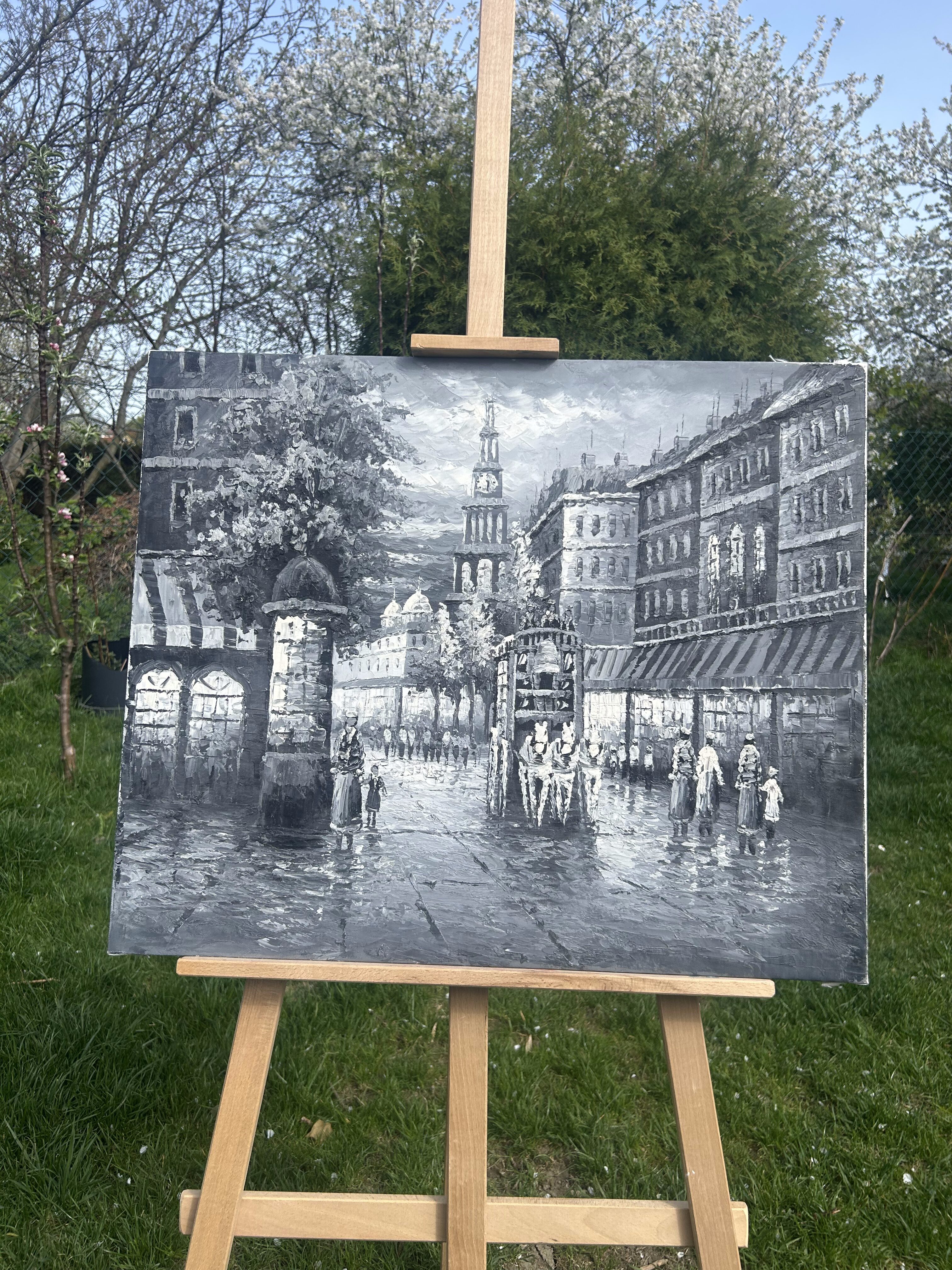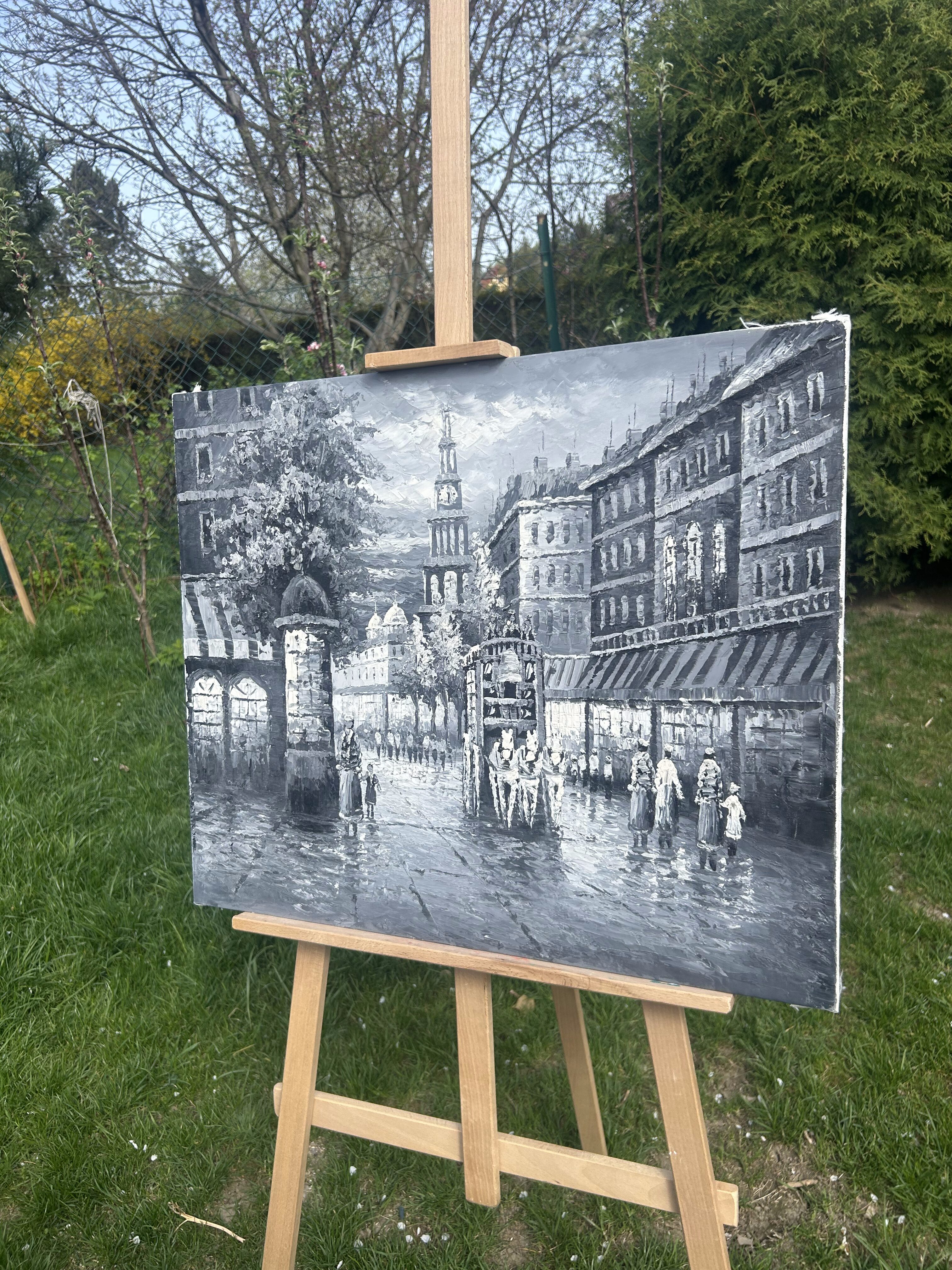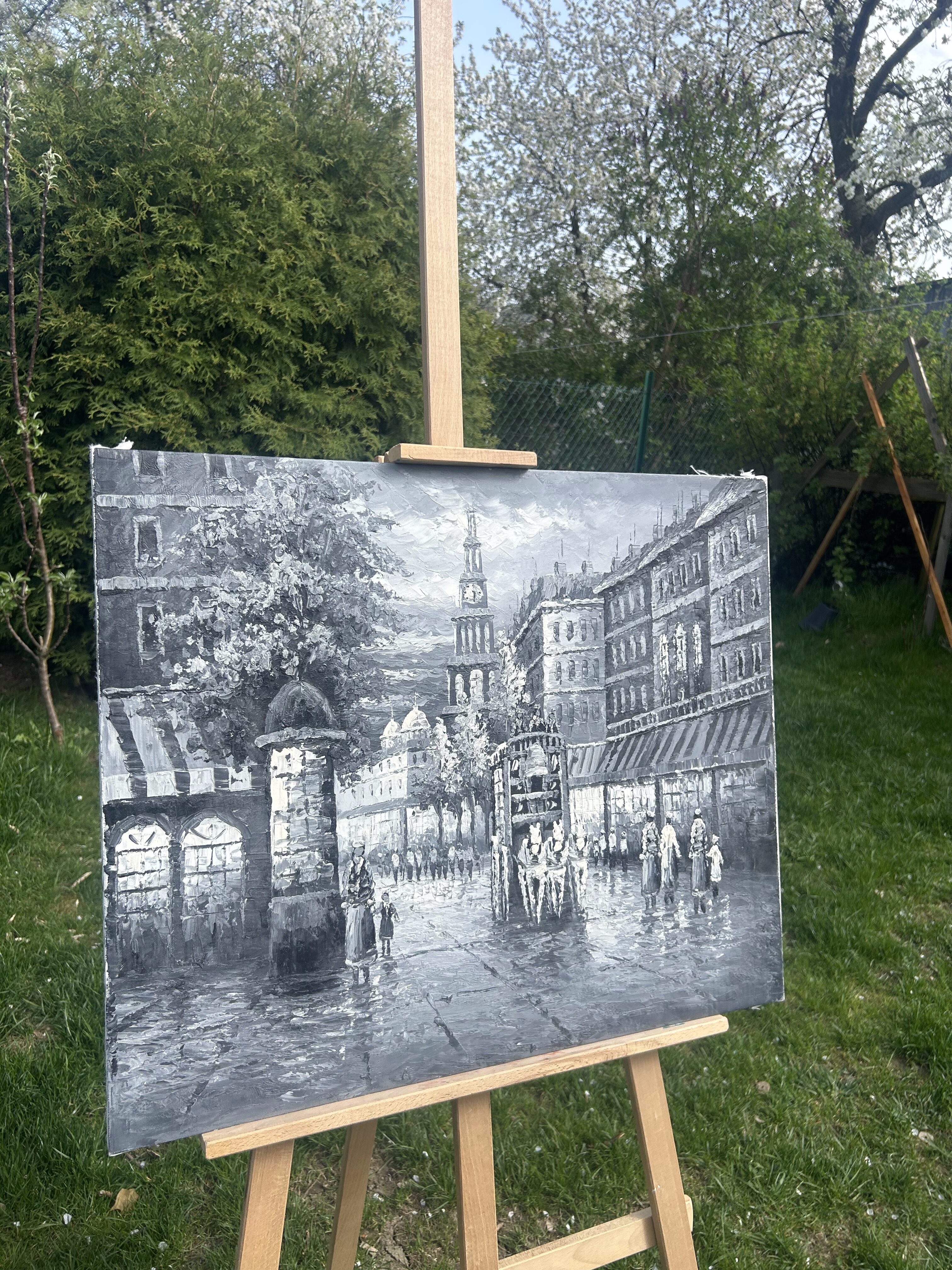 Obraz olejny – Uliczka z lat 20-tych – Czarno-biały – Malowany szpatułką