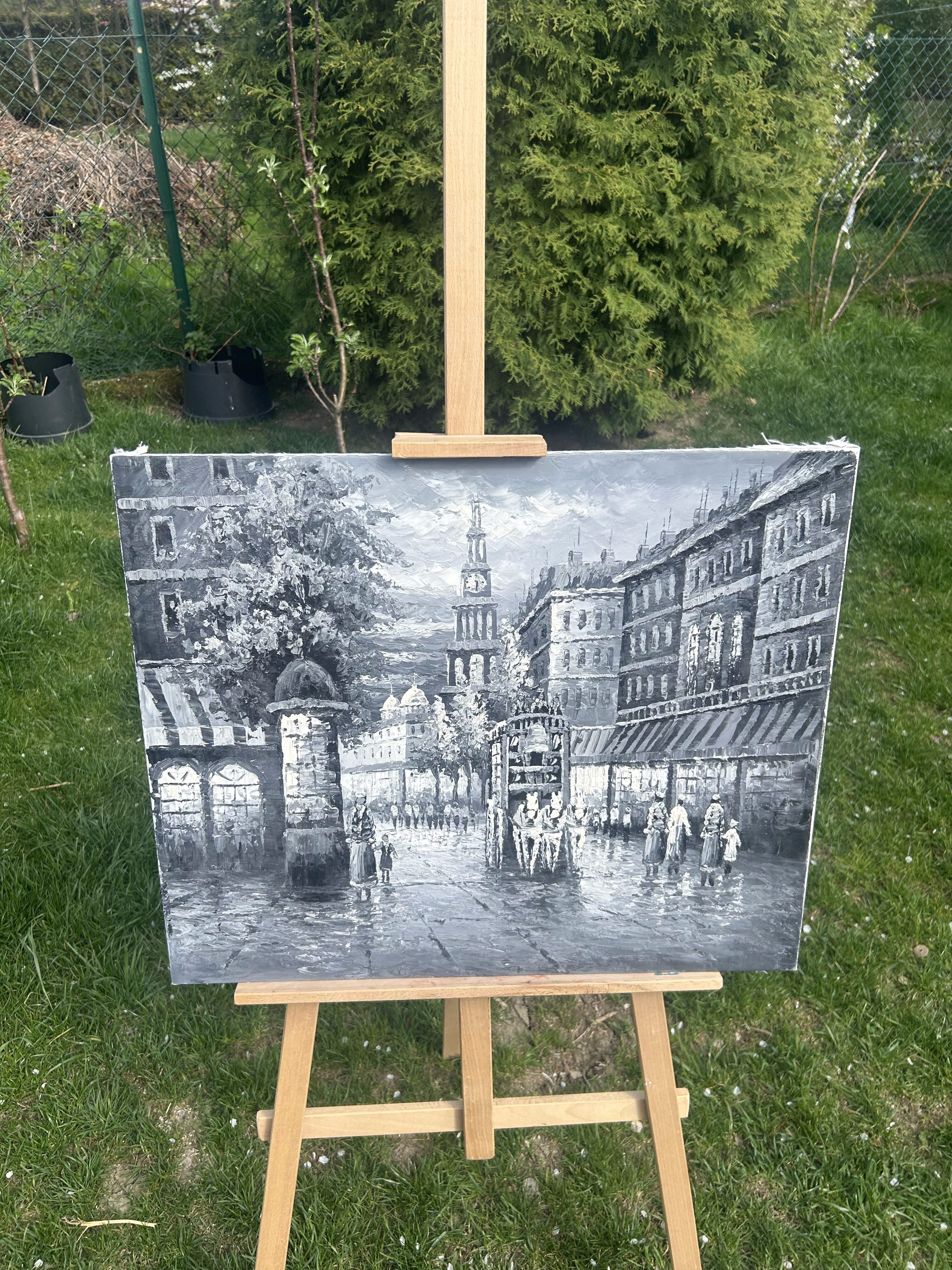- Obraz olejny – Uliczka z lat 20-tych – Czarno-biały – Malowany szpatułką