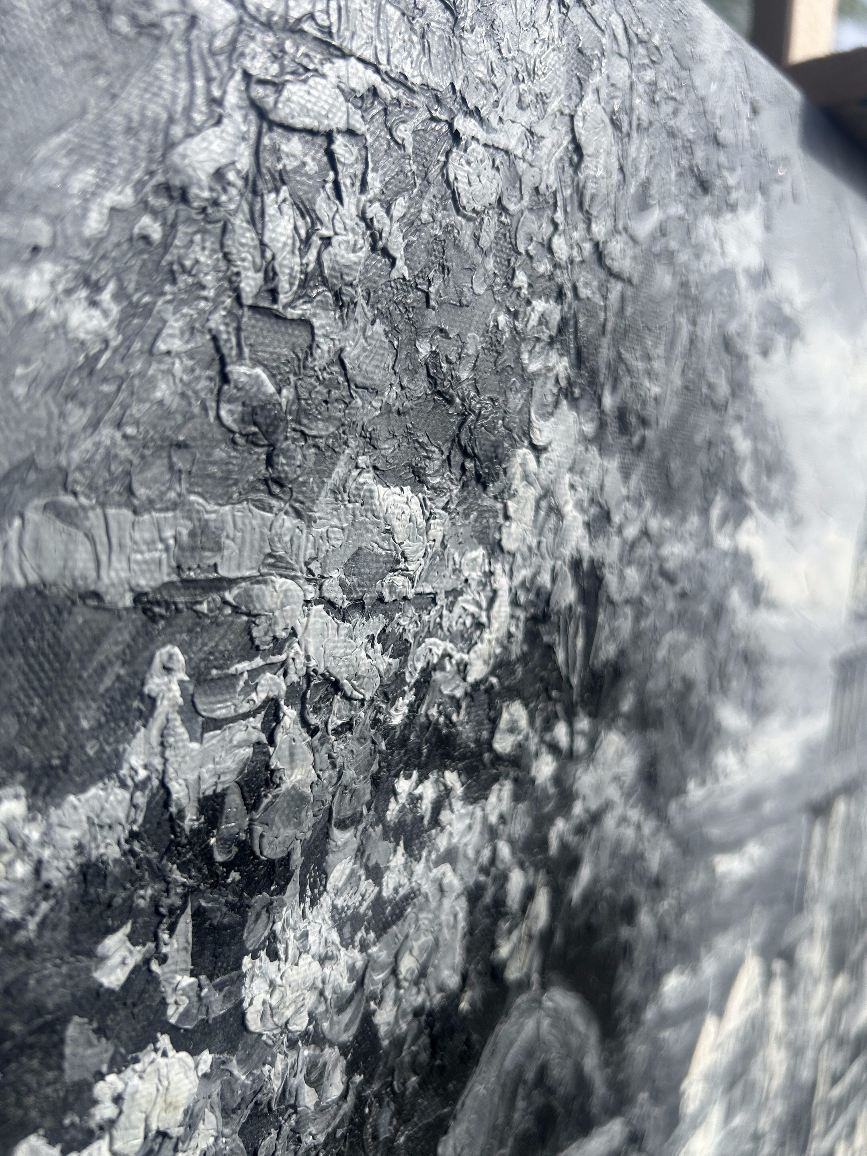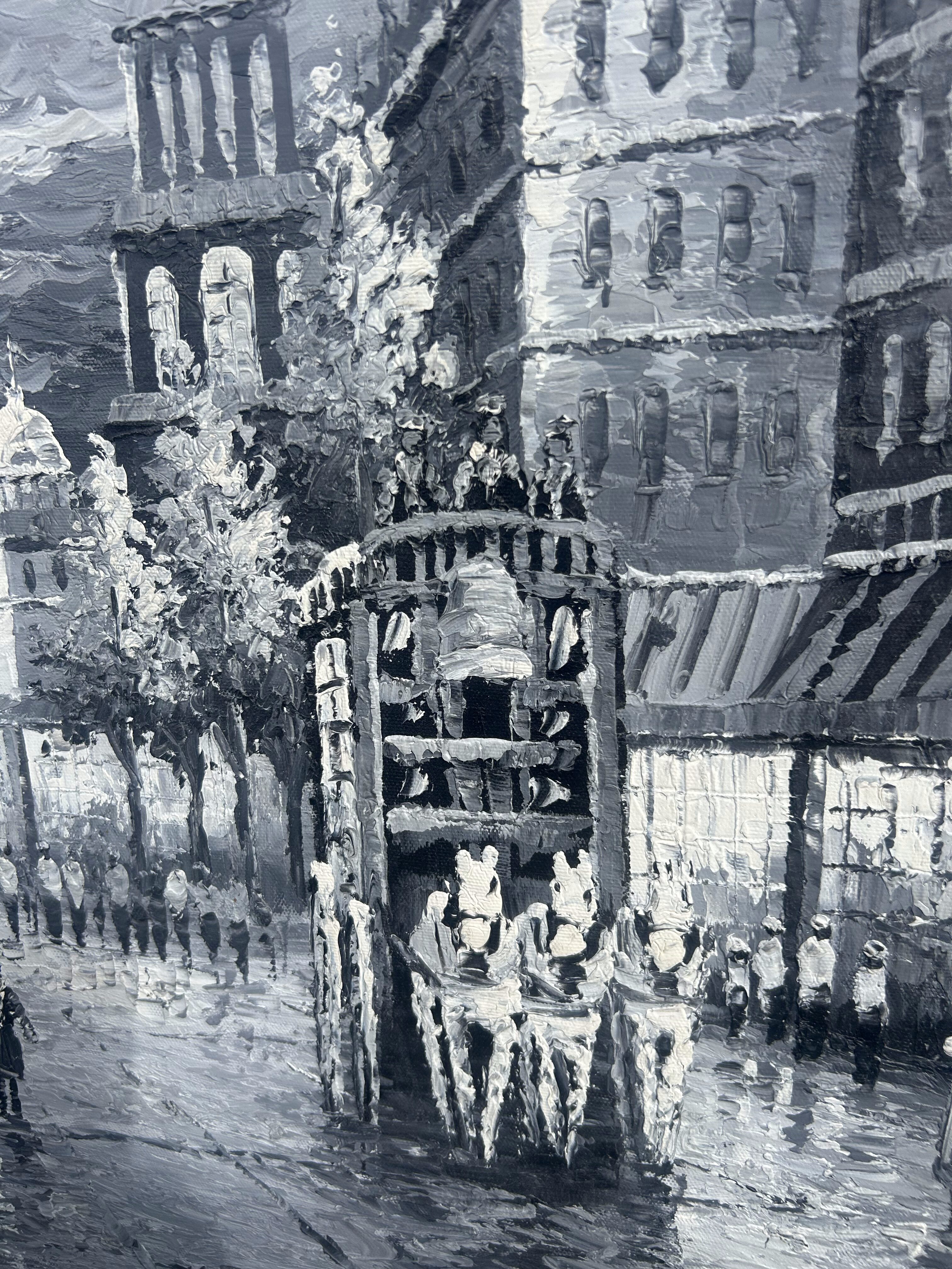 Imponujący obraz olejny malowany techniką szpatułkową, przedstawiający klimatyczną scenę miejską z lat 20-tych XX wieku. Kompozycja utrzymana w eleganckiej tonacji czerni, bieli i szarości, co nadaje jej wyjątkowy charakter retro i sprawia, że idealnie wpisuje się w nowoczesne oraz klasyczne wnętrza.