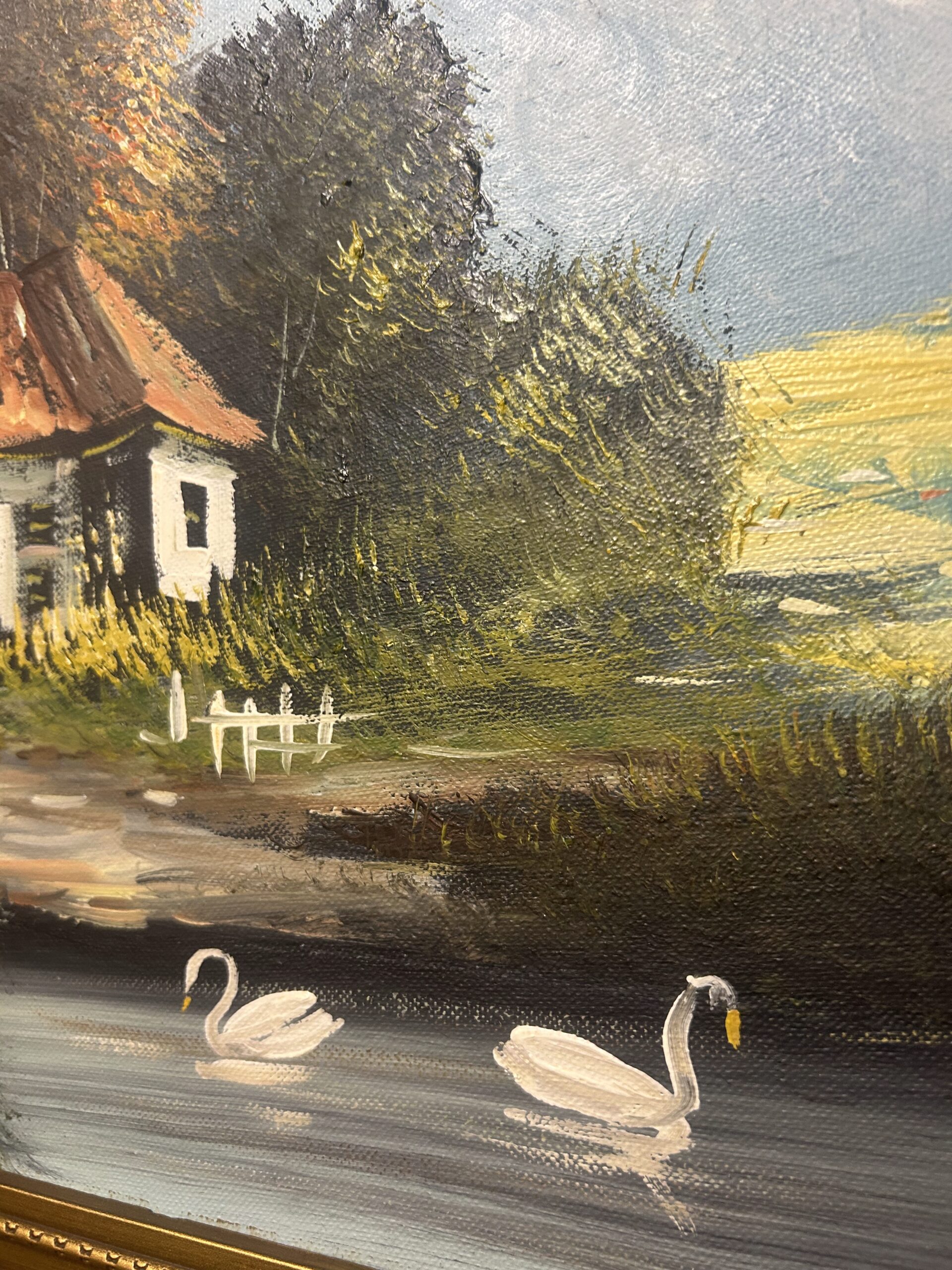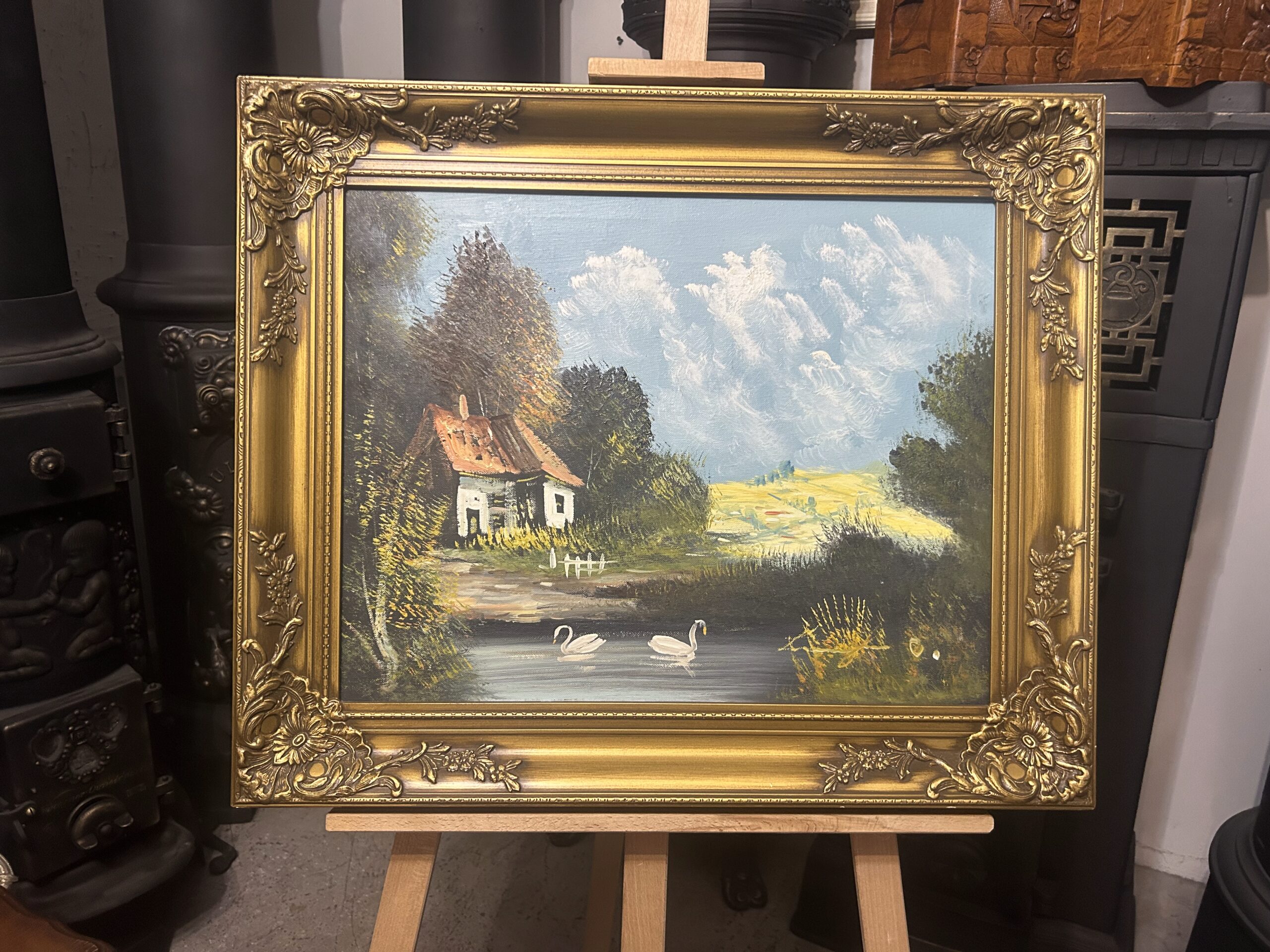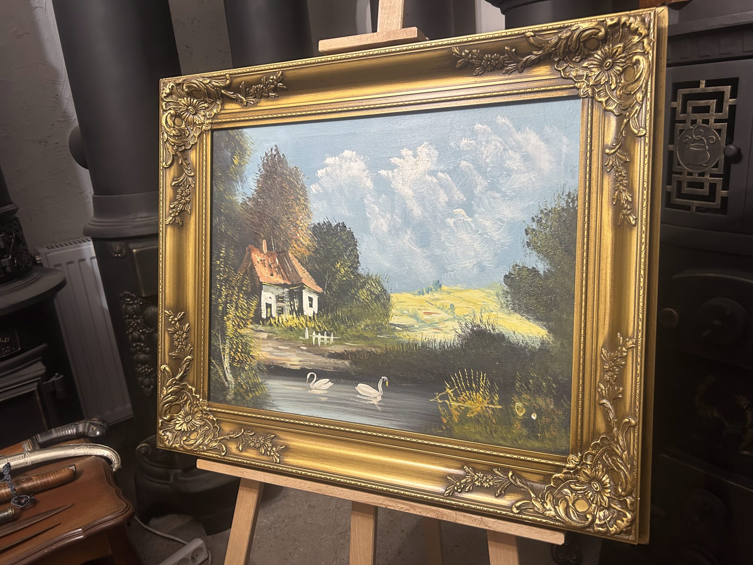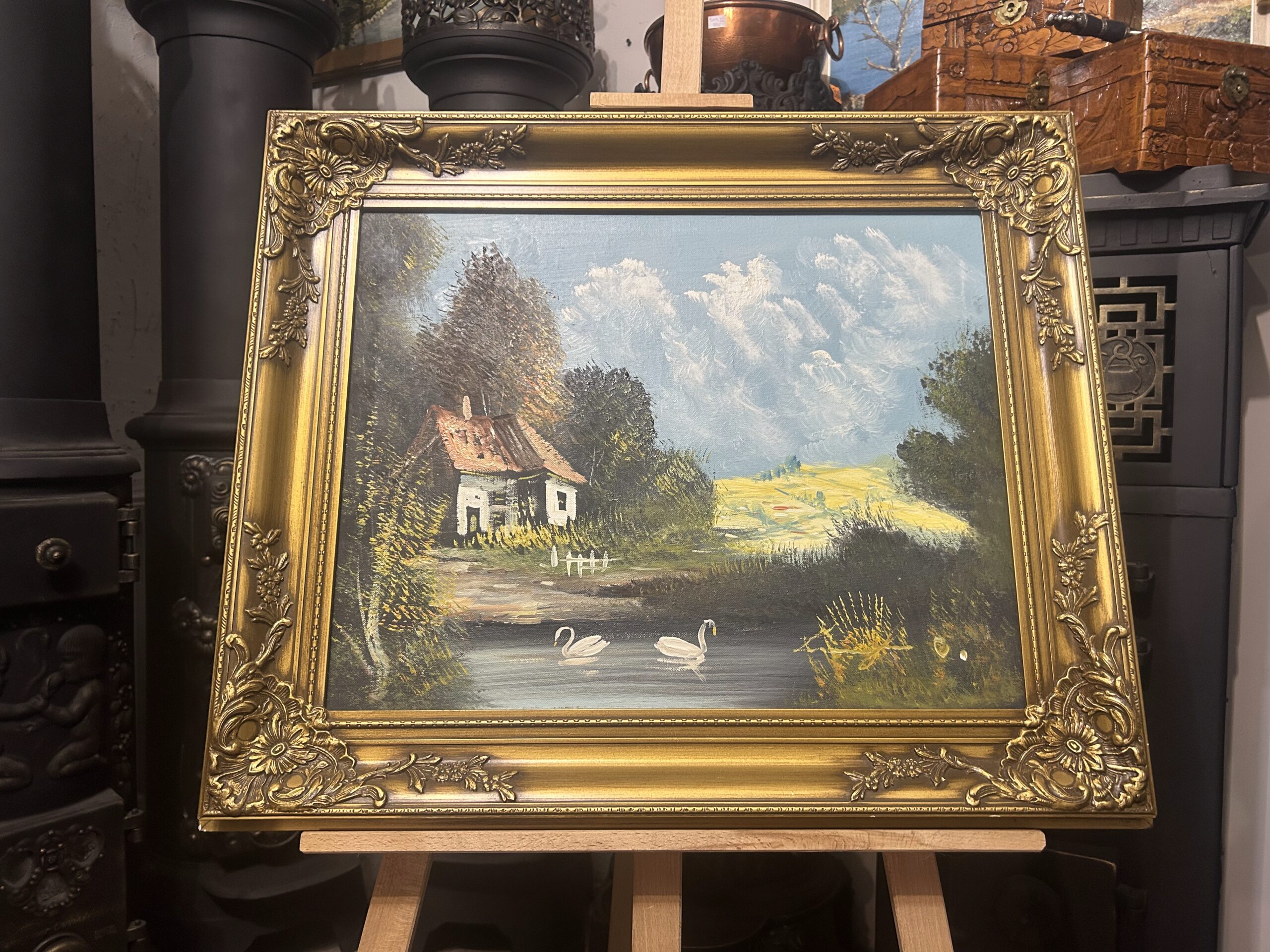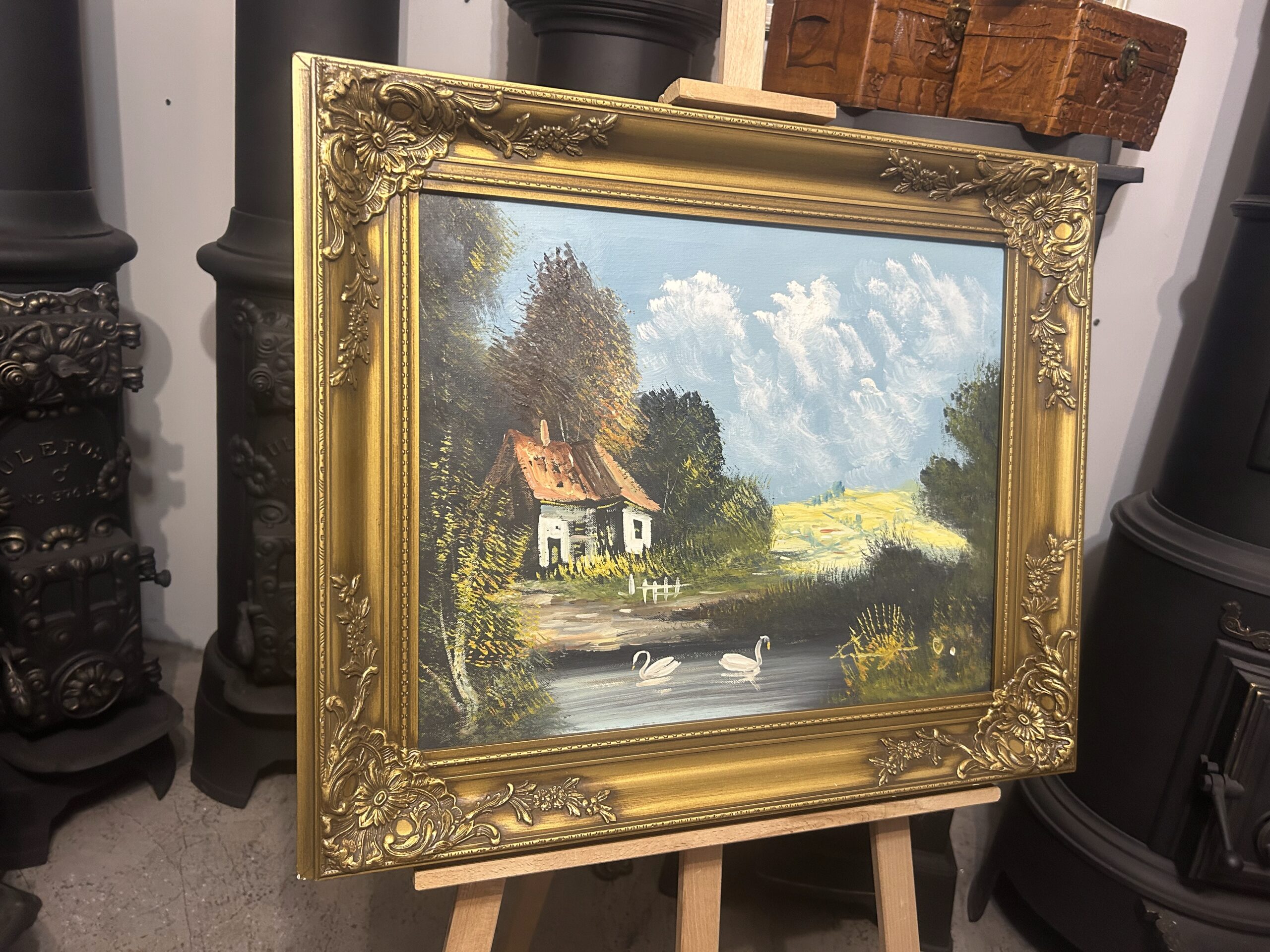 Urokliwy obraz olejny przedstawiający idylliczną scenę wiejskiego życia – biały domek z czerwonym dachem usytuowany nad stawem, na którym spokojnie pływają dwa łabędzie. Otoczony soczystą zielenią, dzieło oddaje atmosferę sielanki i spokoju. Całość oprawiona w bogato zdobioną, złotą ramę, która podkreśla jego klasyczny charakter.