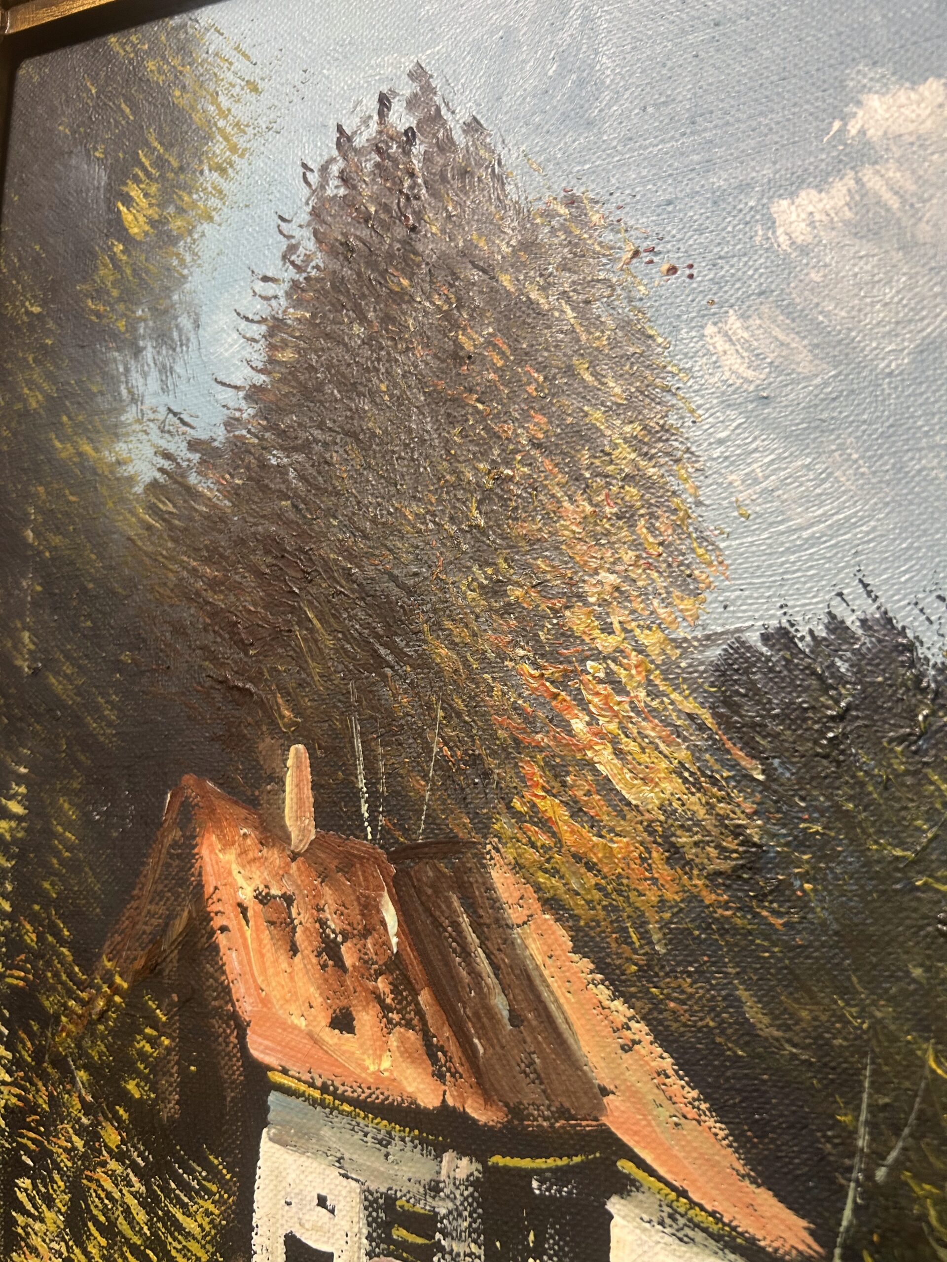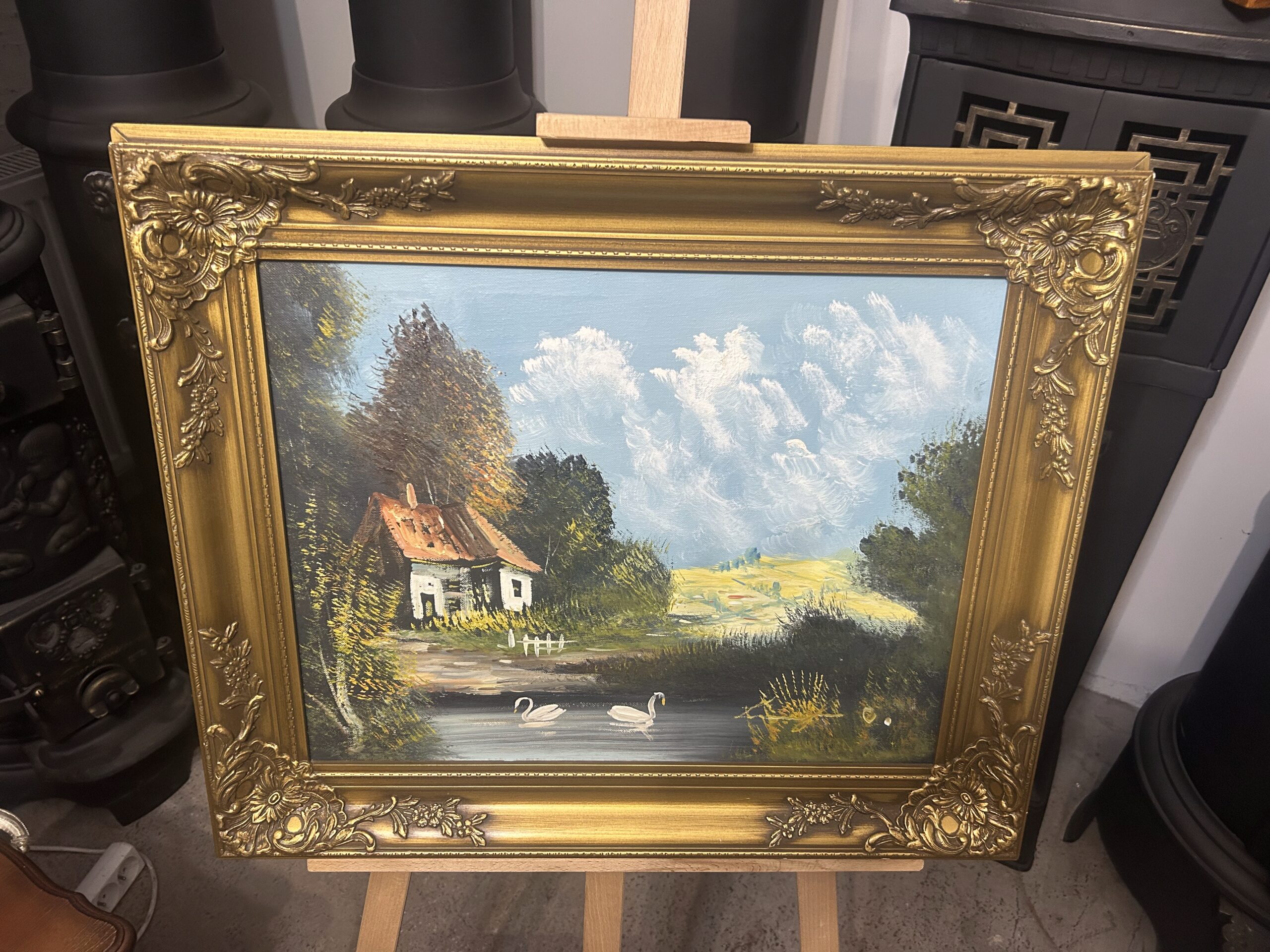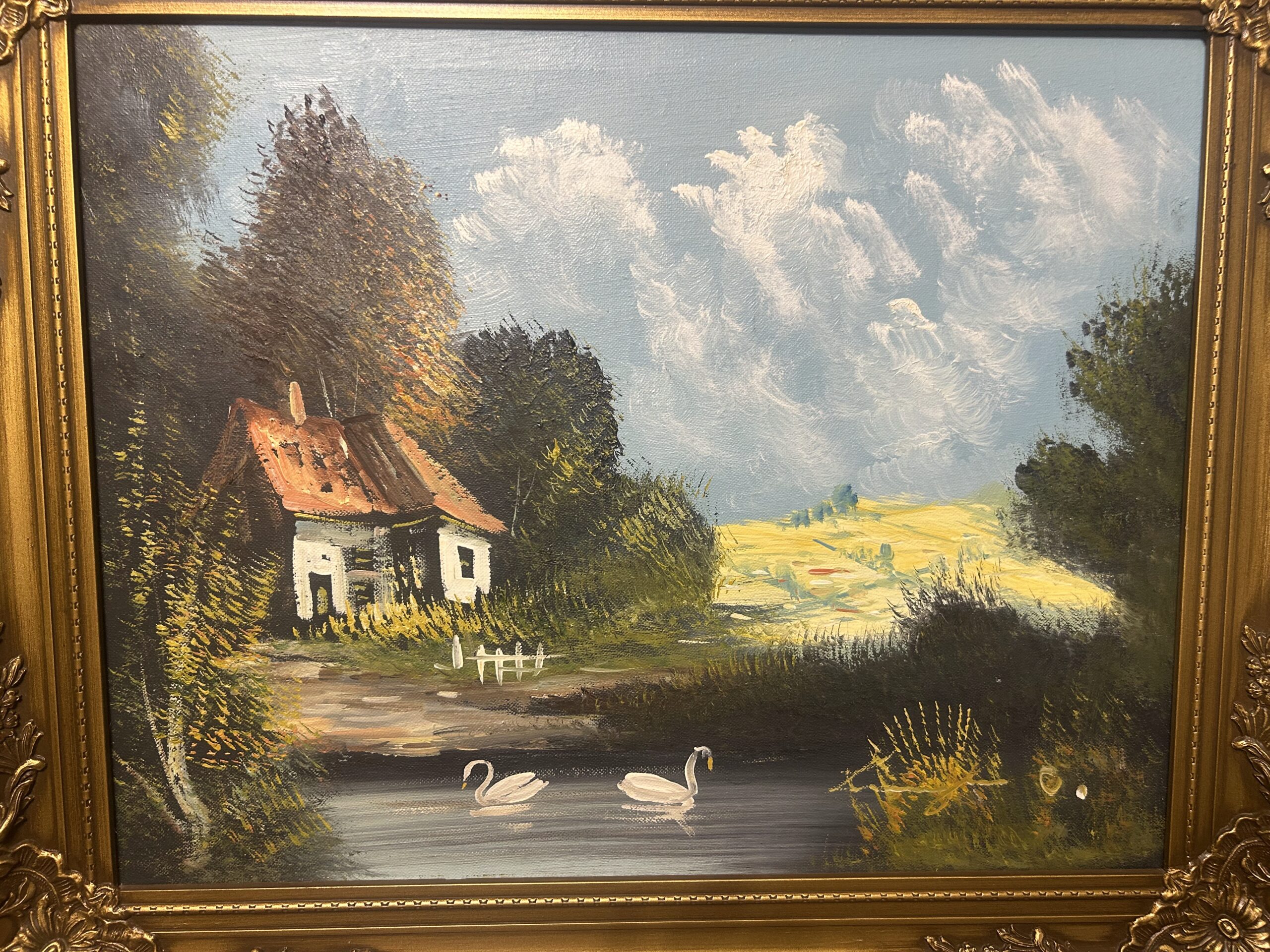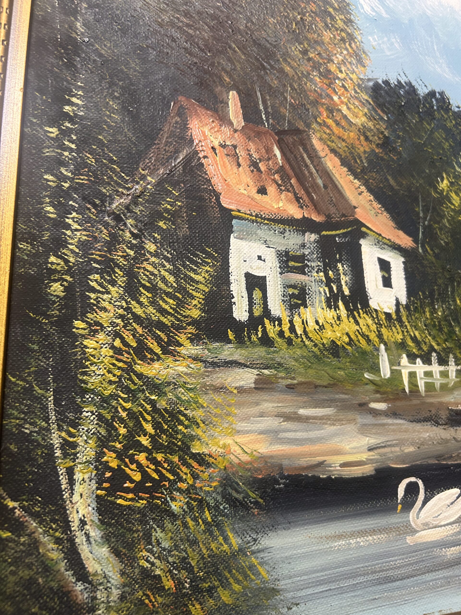 Urokliwy obraz olejny przedstawiający idylliczną scenę wiejskiego życia – biały domek z czerwonym dachem usytuowany nad stawem, na którym spokojnie pływają dwa łabędzie. Otoczony soczystą zielenią, dzieło oddaje atmosferę sielanki i spokoju. Całość oprawiona w bogato zdobioną, złotą ramę, która podkreśla jego klasyczny charakter.