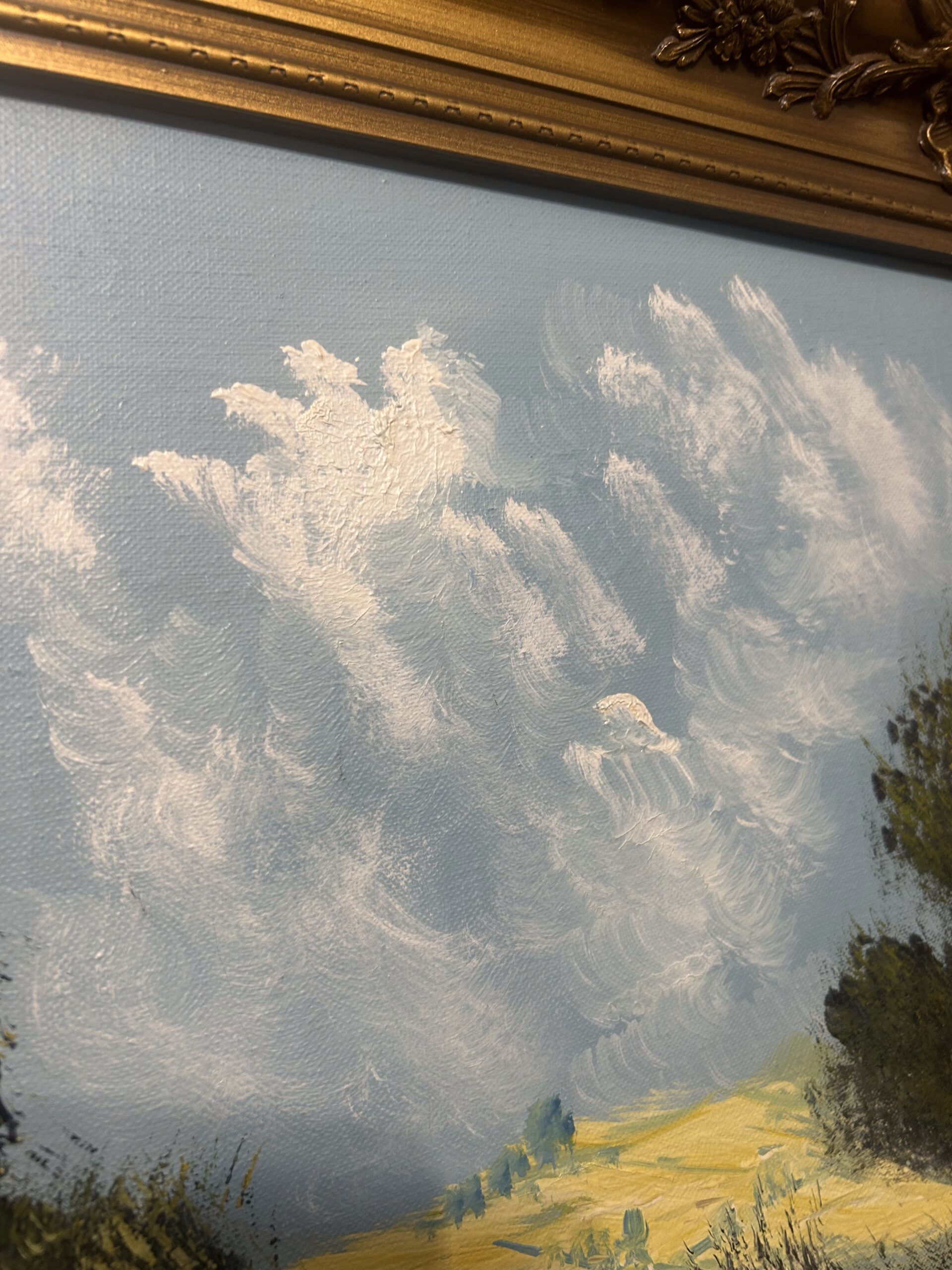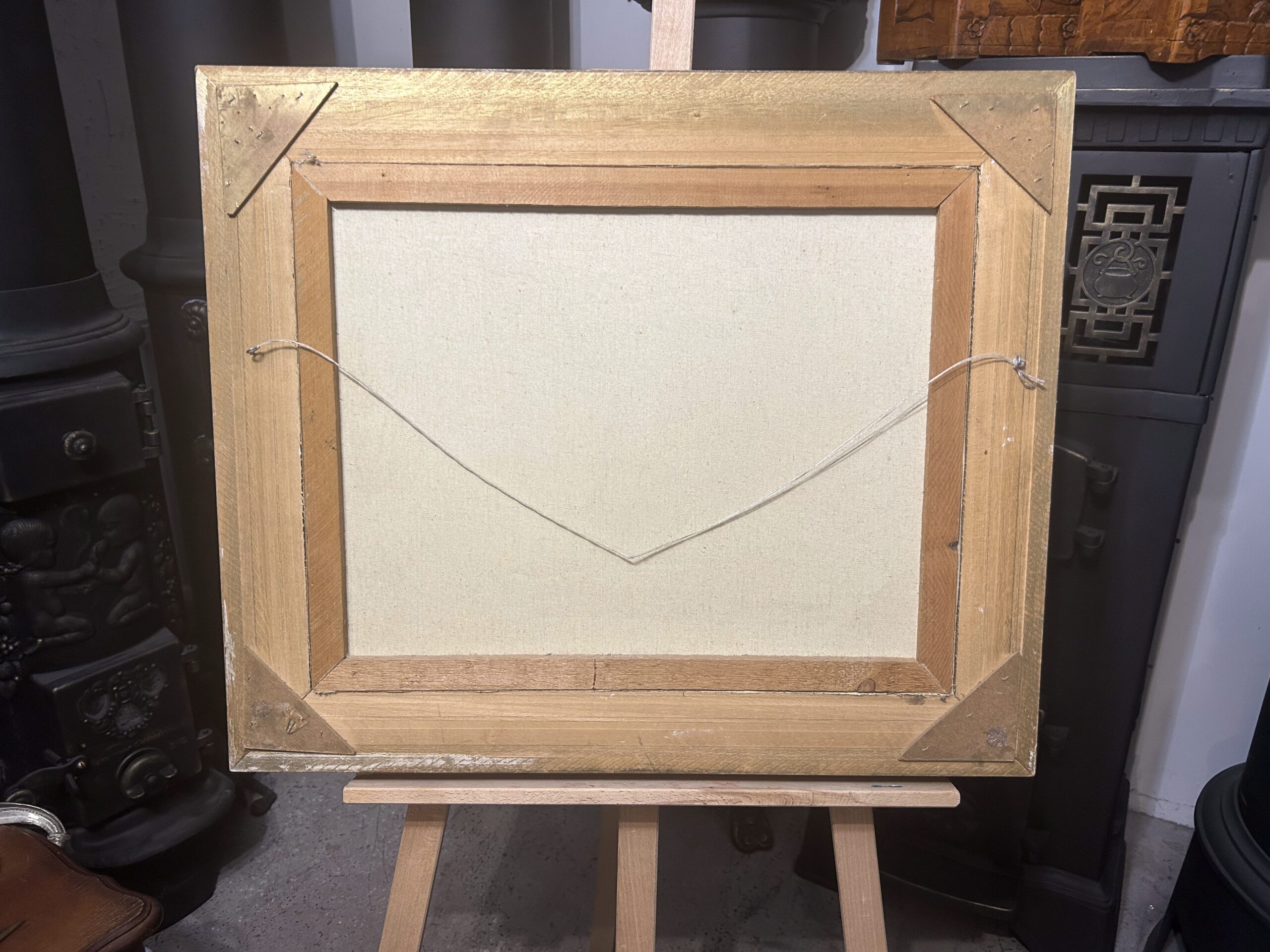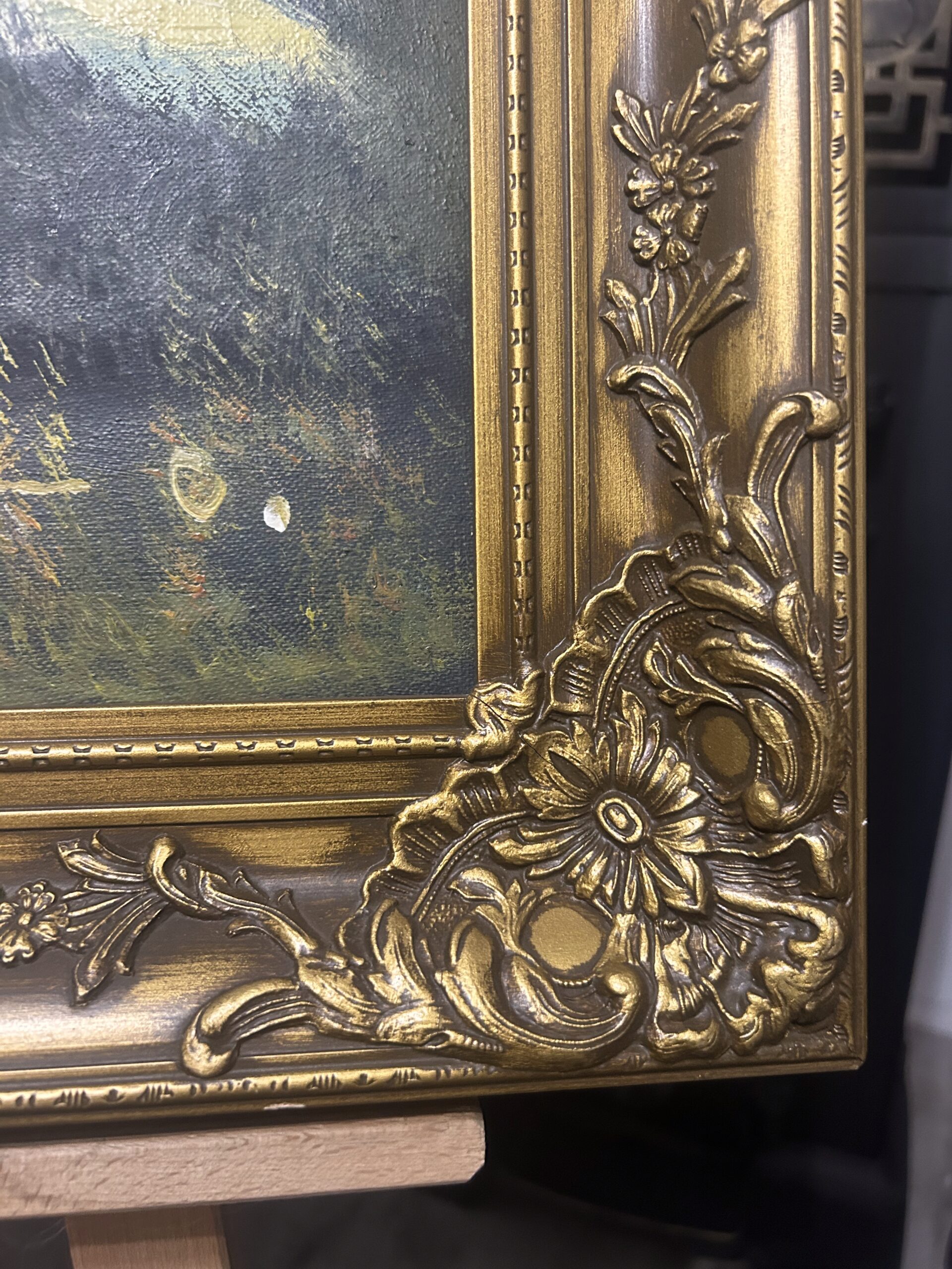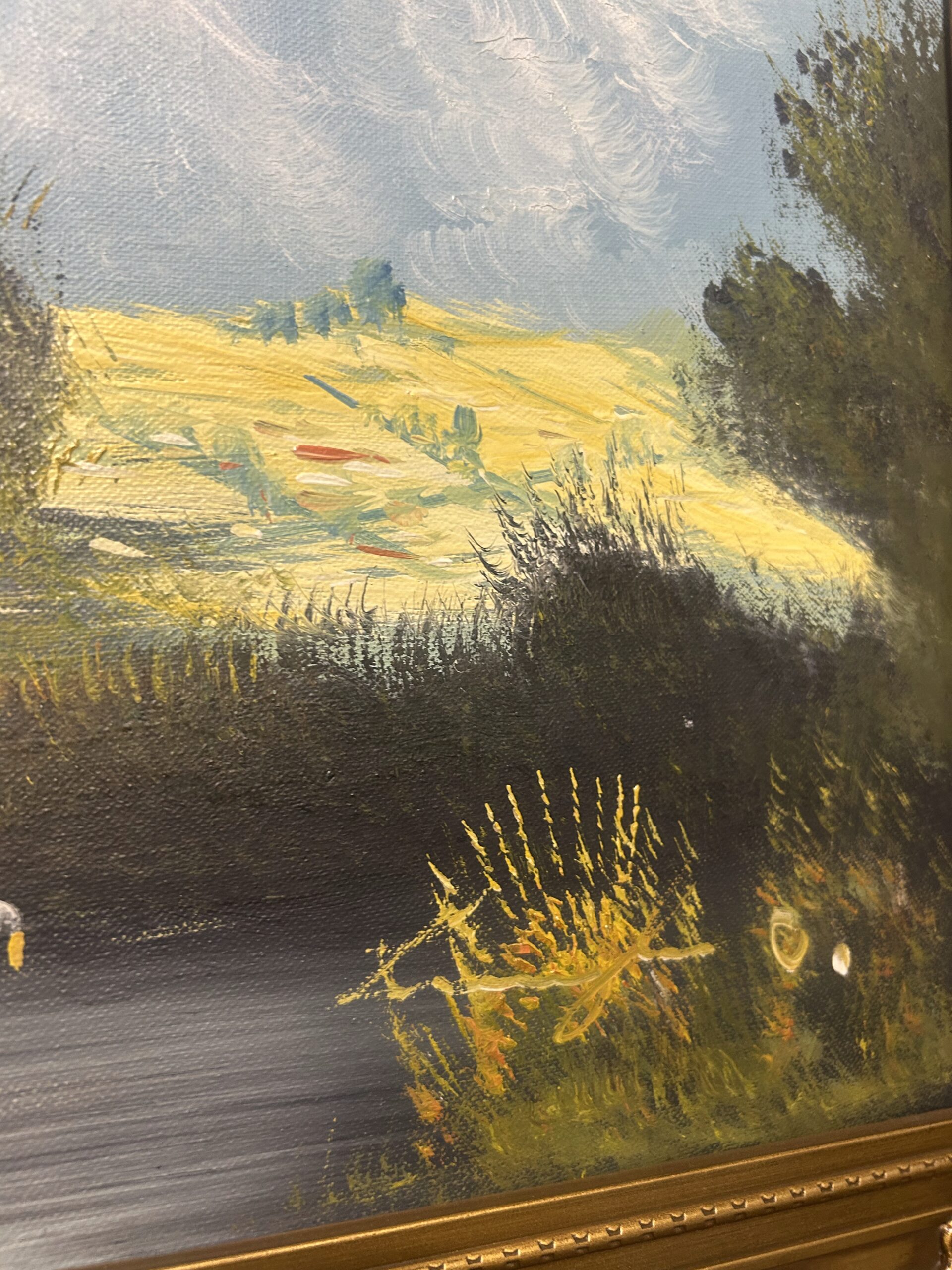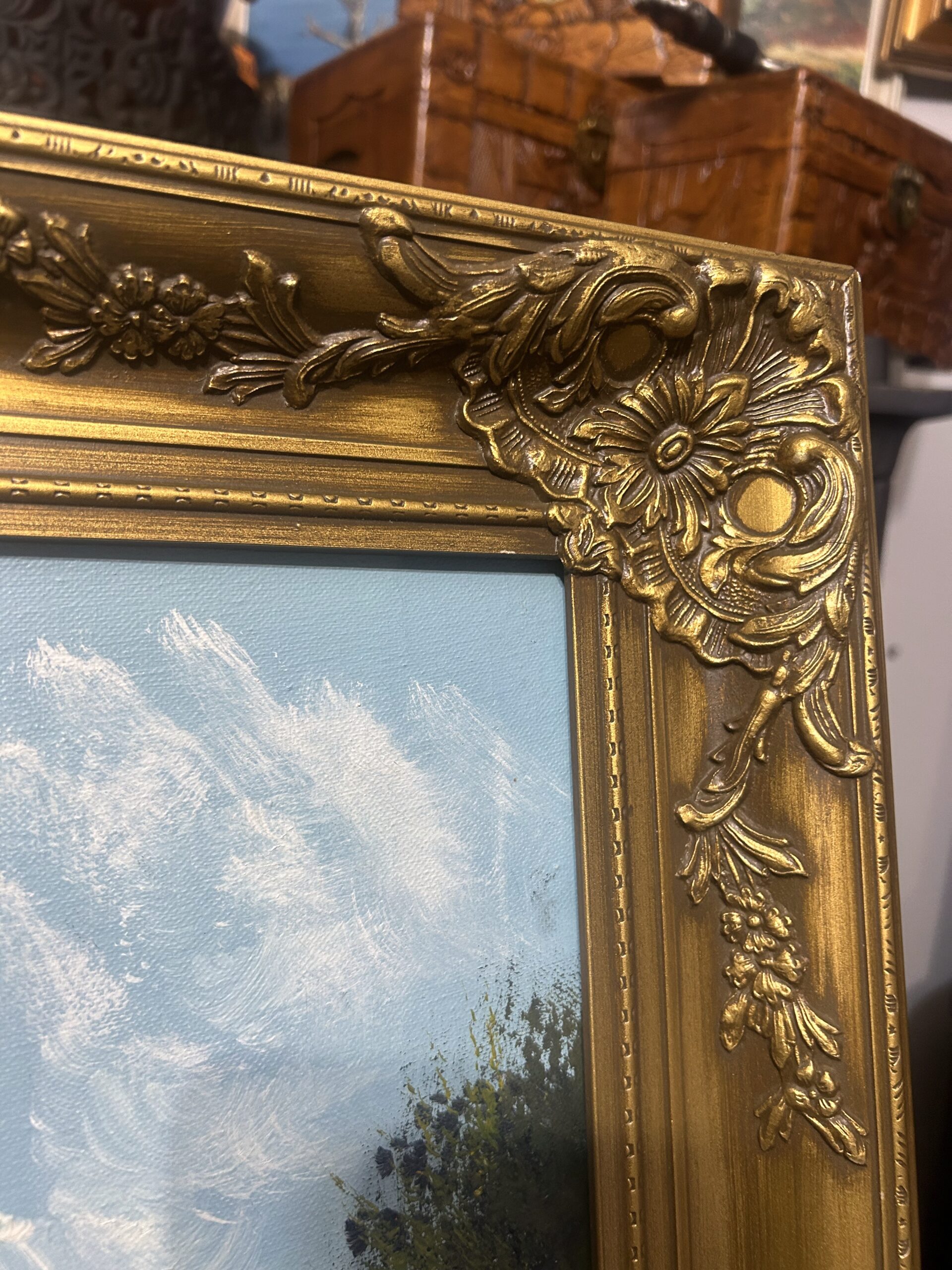 Urokliwy obraz olejny przedstawiający idylliczną scenę wiejskiego życia – biały domek z czerwonym dachem usytuowany nad stawem, na którym spokojnie pływają dwa łabędzie. Otoczony soczystą zielenią, dzieło oddaje atmosferę sielanki i spokoju. Całość oprawiona w bogato zdobioną, złotą ramę, która podkreśla jego klasyczny charakter.